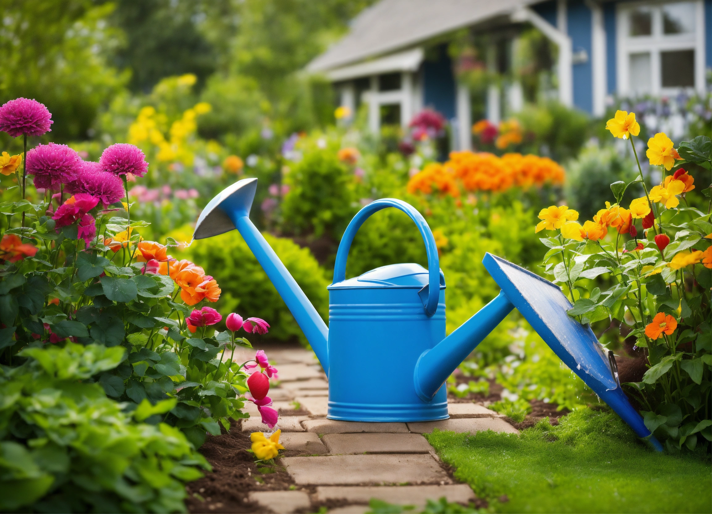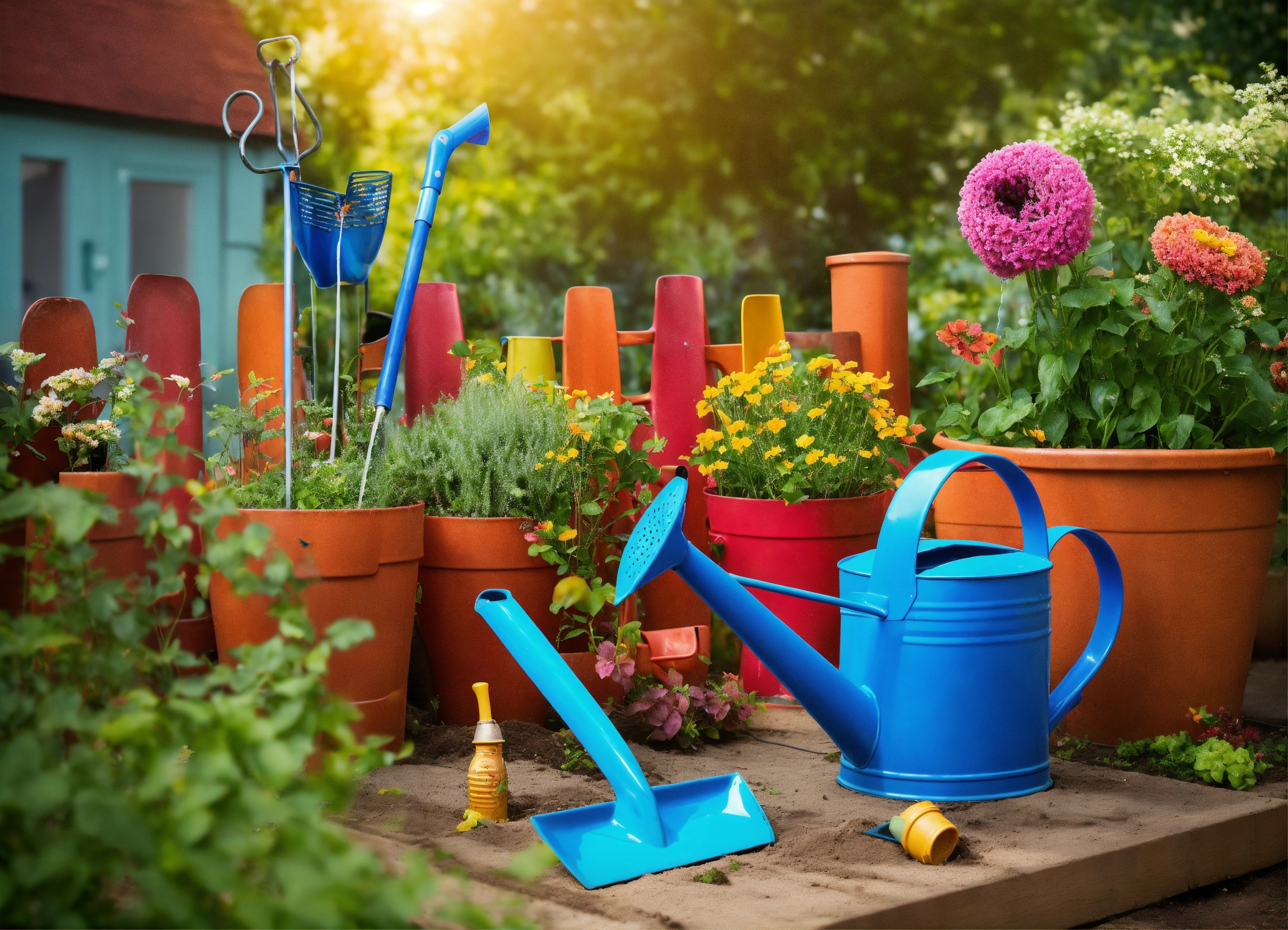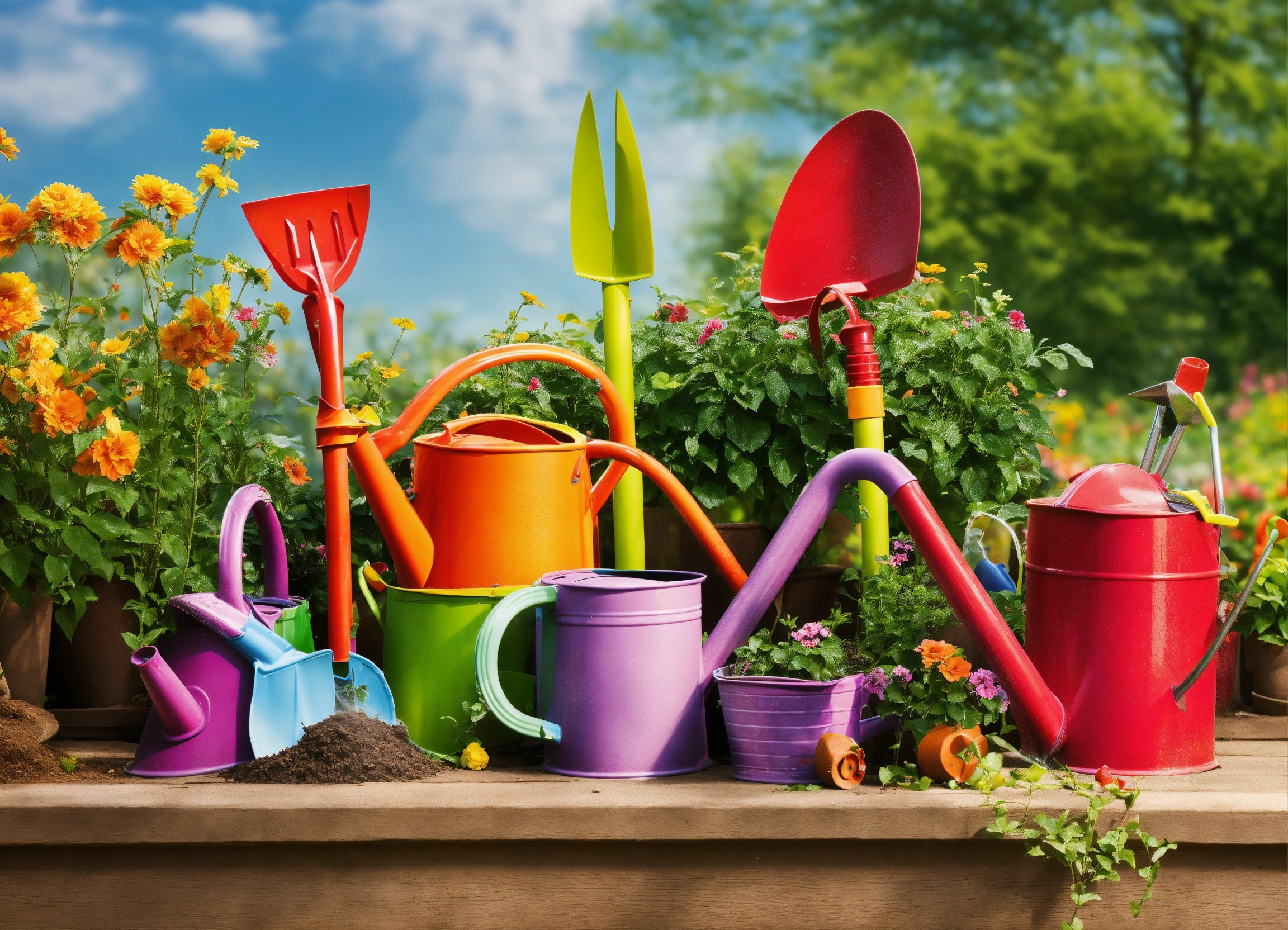 Create a funny image depicting garden tools such as a watering can, rake, and shovel playing pranks in a vibrant garden setting. they could be tying each other’s handles in knots or tripping each other, displaying playful and exaggerated expressions.