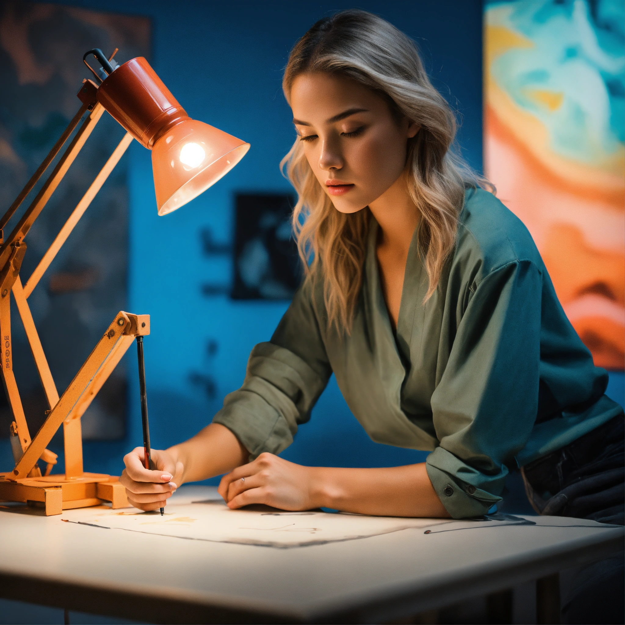 ((("capture dynamic splashes of art in a fashion photography" with canvas as the main subject, showcasing pencil, orange and cyan paint, blue heron, fabric, special model, easel, and intense lighting. utilize high-speed photography for photorealistic surrealism style, with a white background and trending clean minimalist backdrop. include charcoal, and art medium elements. create an ad posters with pro-grade color grading, studio lighting, rim lights, layered comps, and shot with an eos-1d x mark iii camera. publish on 500px, enhance, and consider concept art."), photorealistic images, high-speed photography, surrealism, white background, clean background, minimalist, table, smoke, ad posters, pro-grade color grading, studio lighting, layered comps, eos-1d x mark iii, 500px, concept art), photo