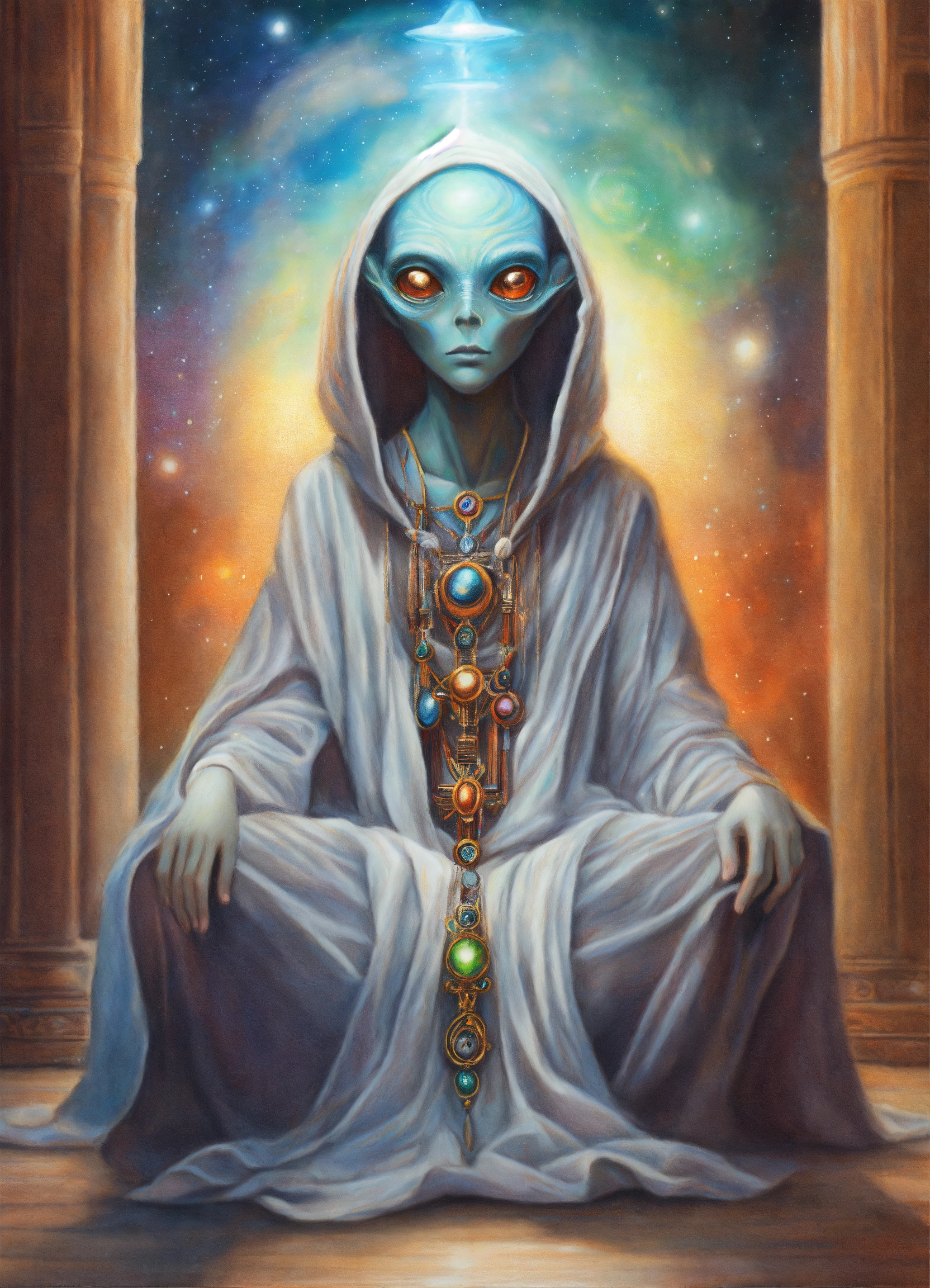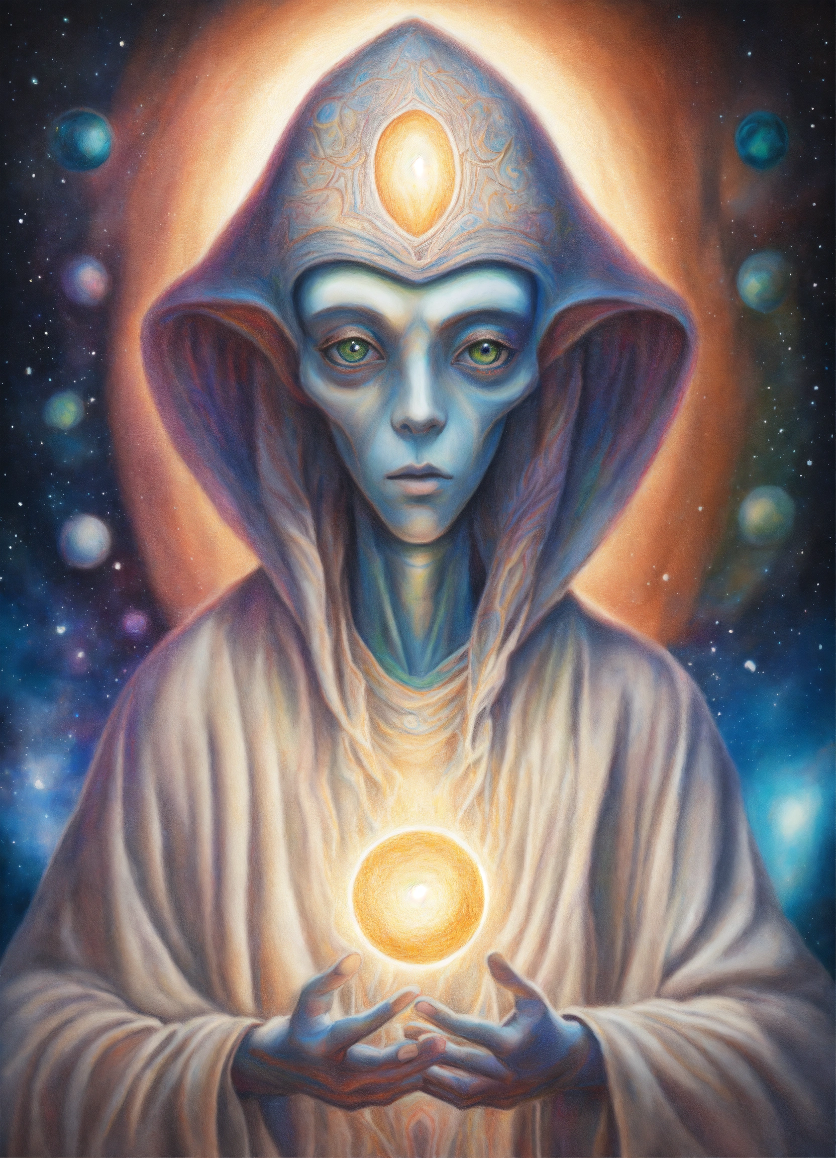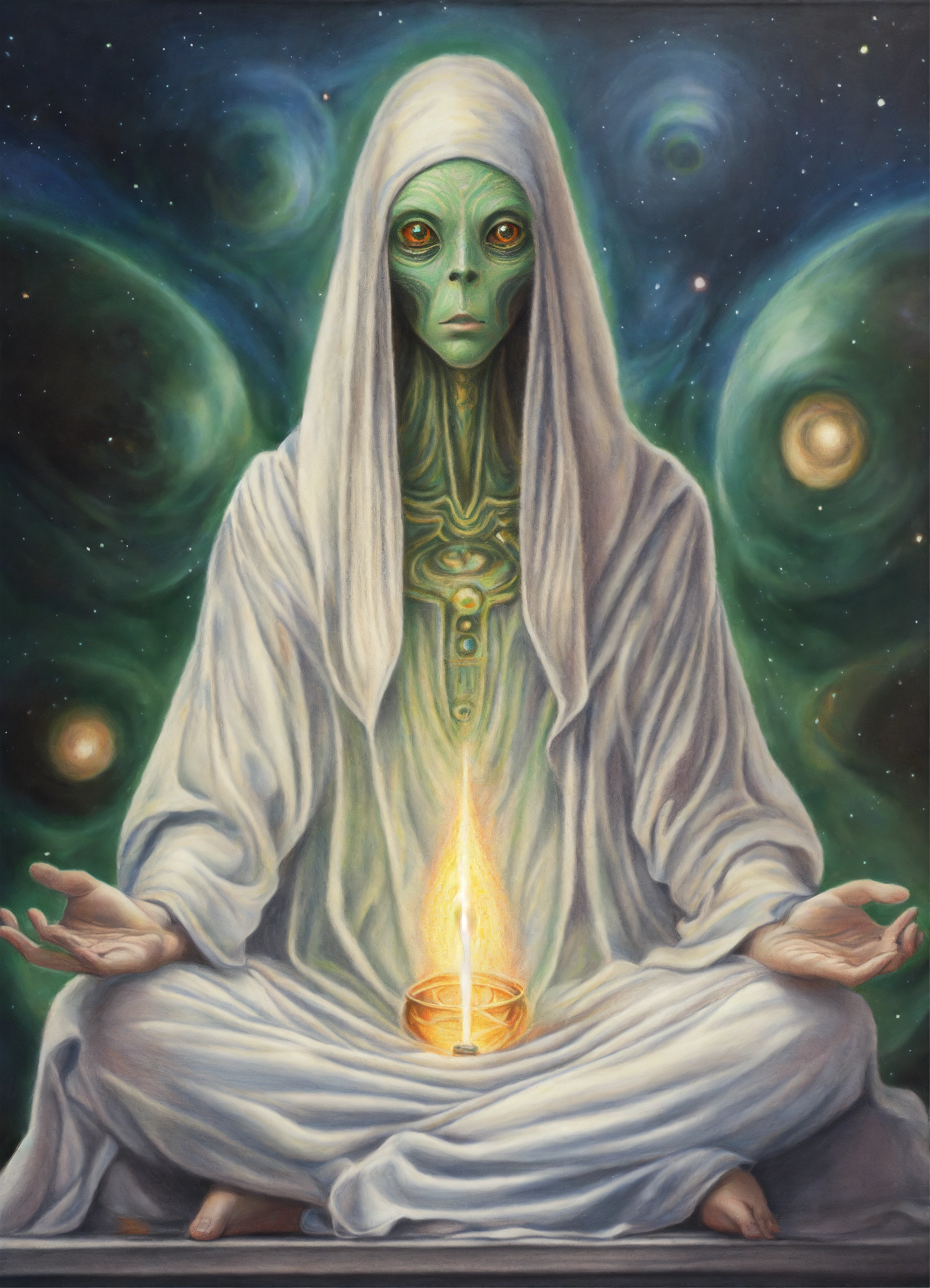 Realistic colored pencil drawing extraterrestrial wizard meditating, with white tunic and open arms. huge eyes. alien gray.