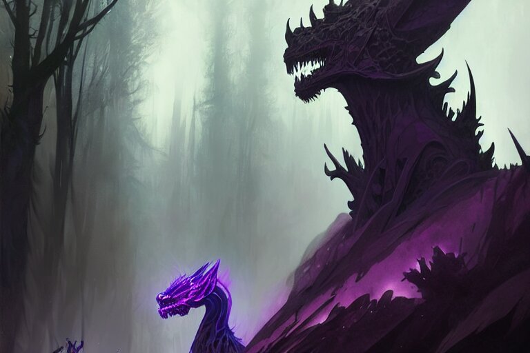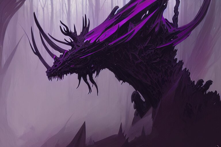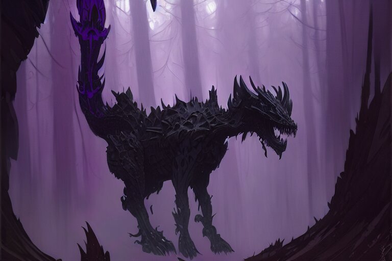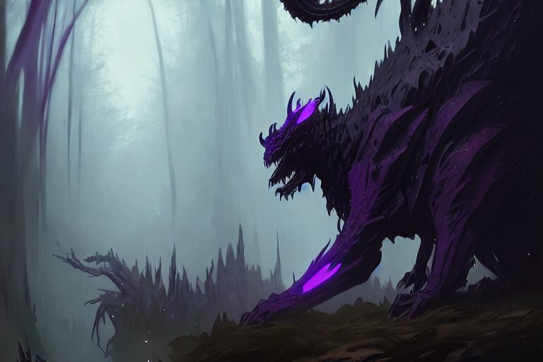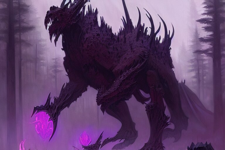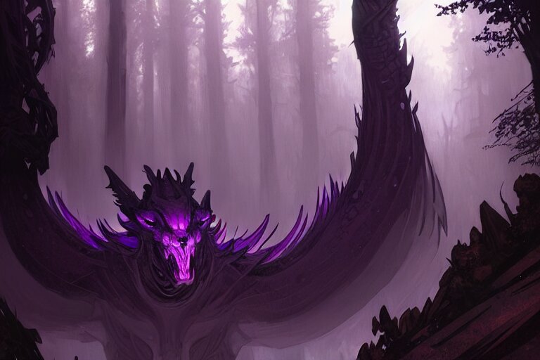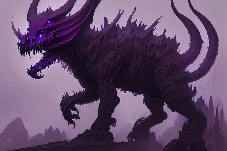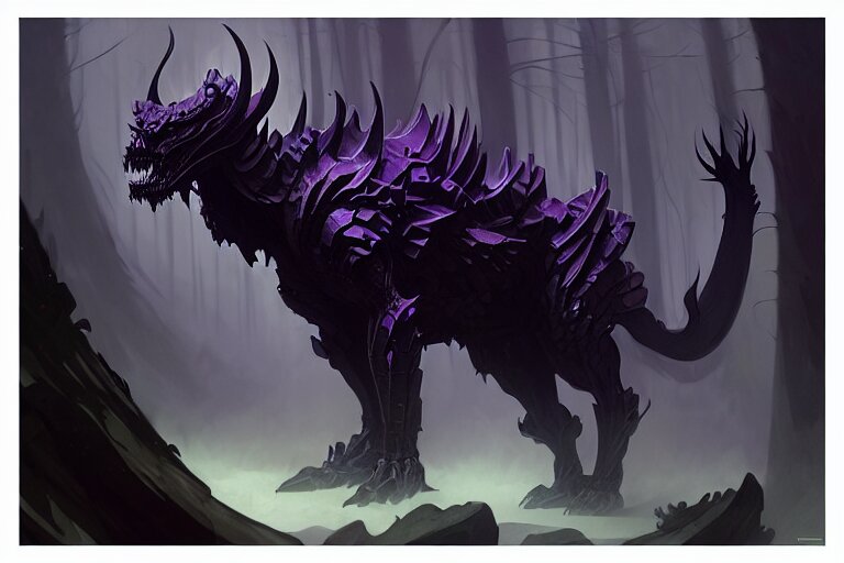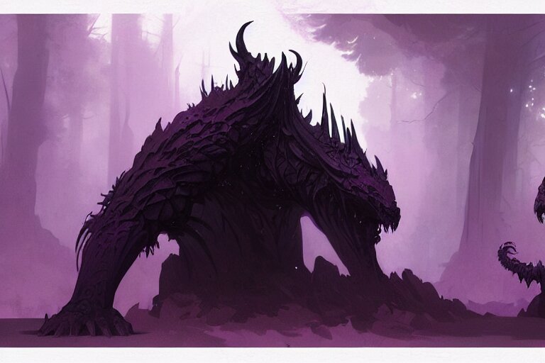 Concept art of a dispacer beast, d & d creature, by greg rutkowski and alphonse mucha, gradient black to purple, monoliths in a dark forest background, highly detailed, digital painting, artstation, concept art, smooth, sharp focus illustration, artstation hq