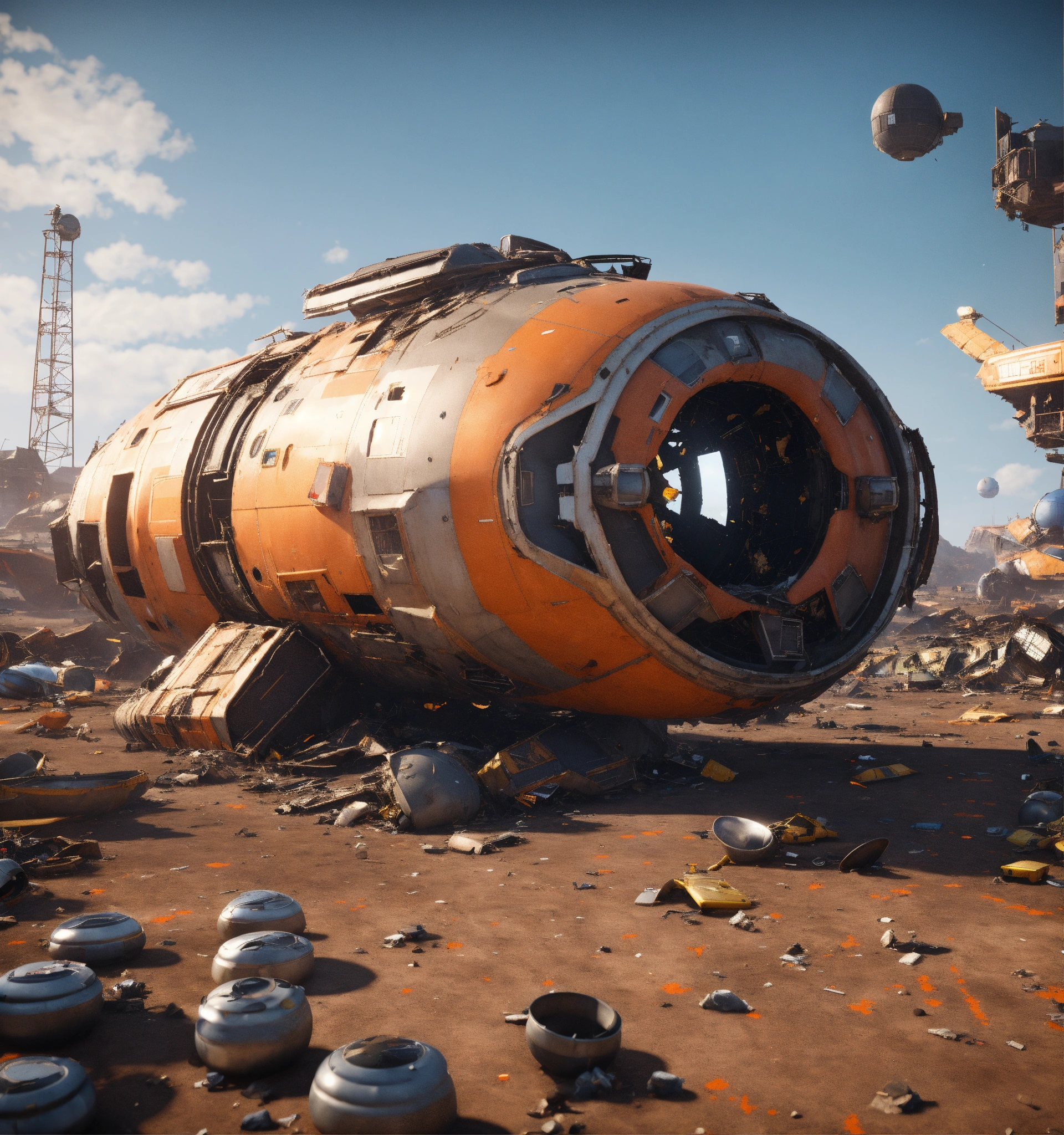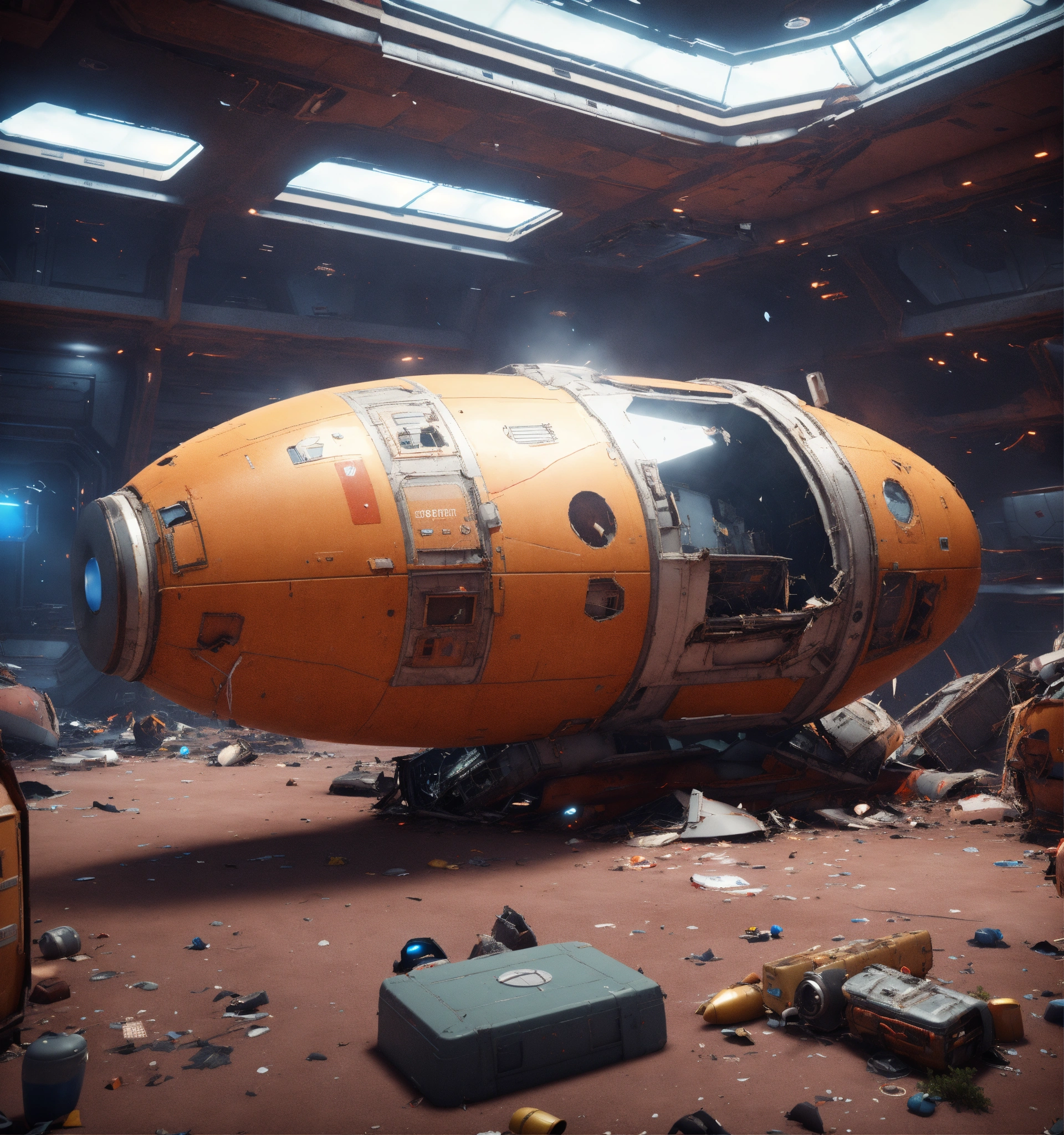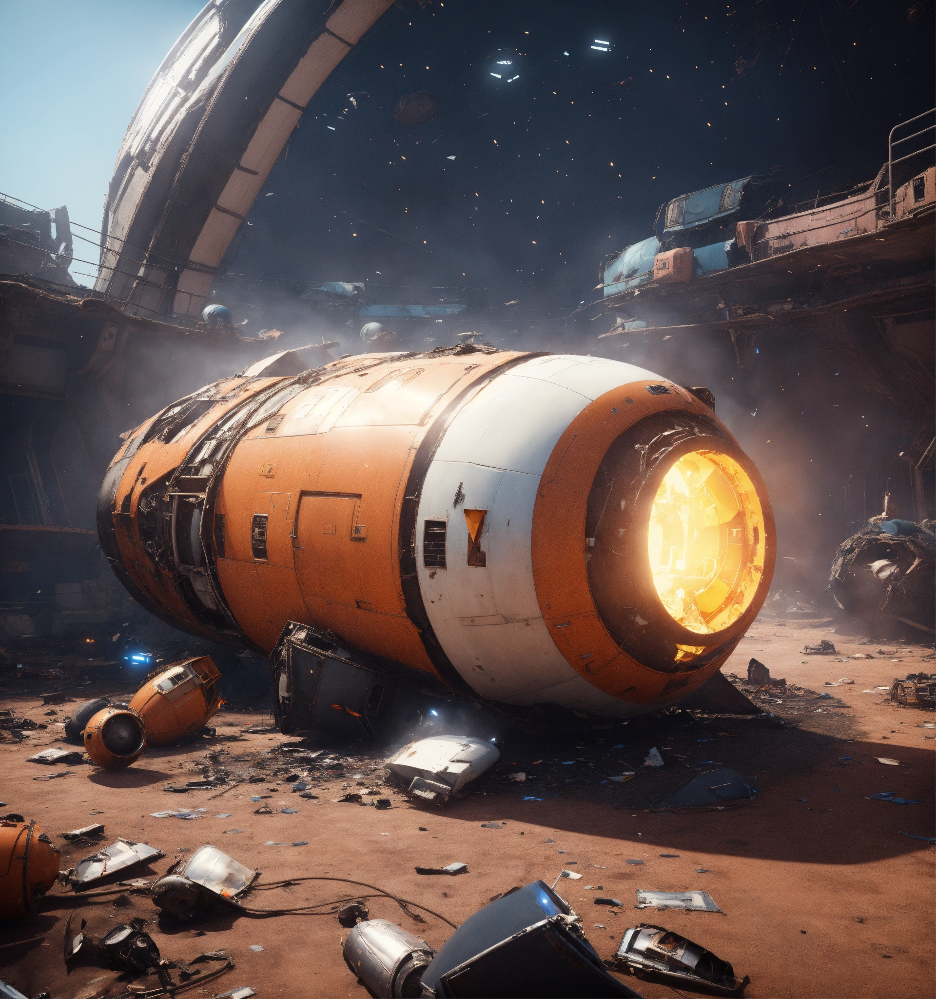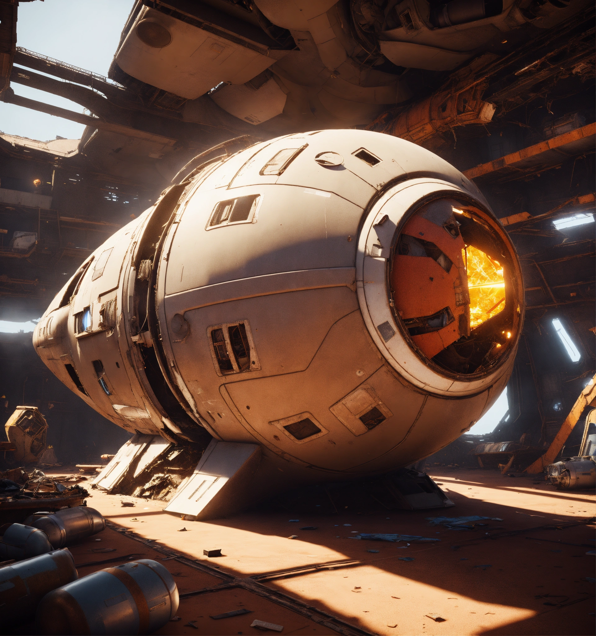 A small emergency escape capsule crashed in the middle of a starship junkyard, realistic, futuristic, sci-fi, 8k, unreal engine, pixar