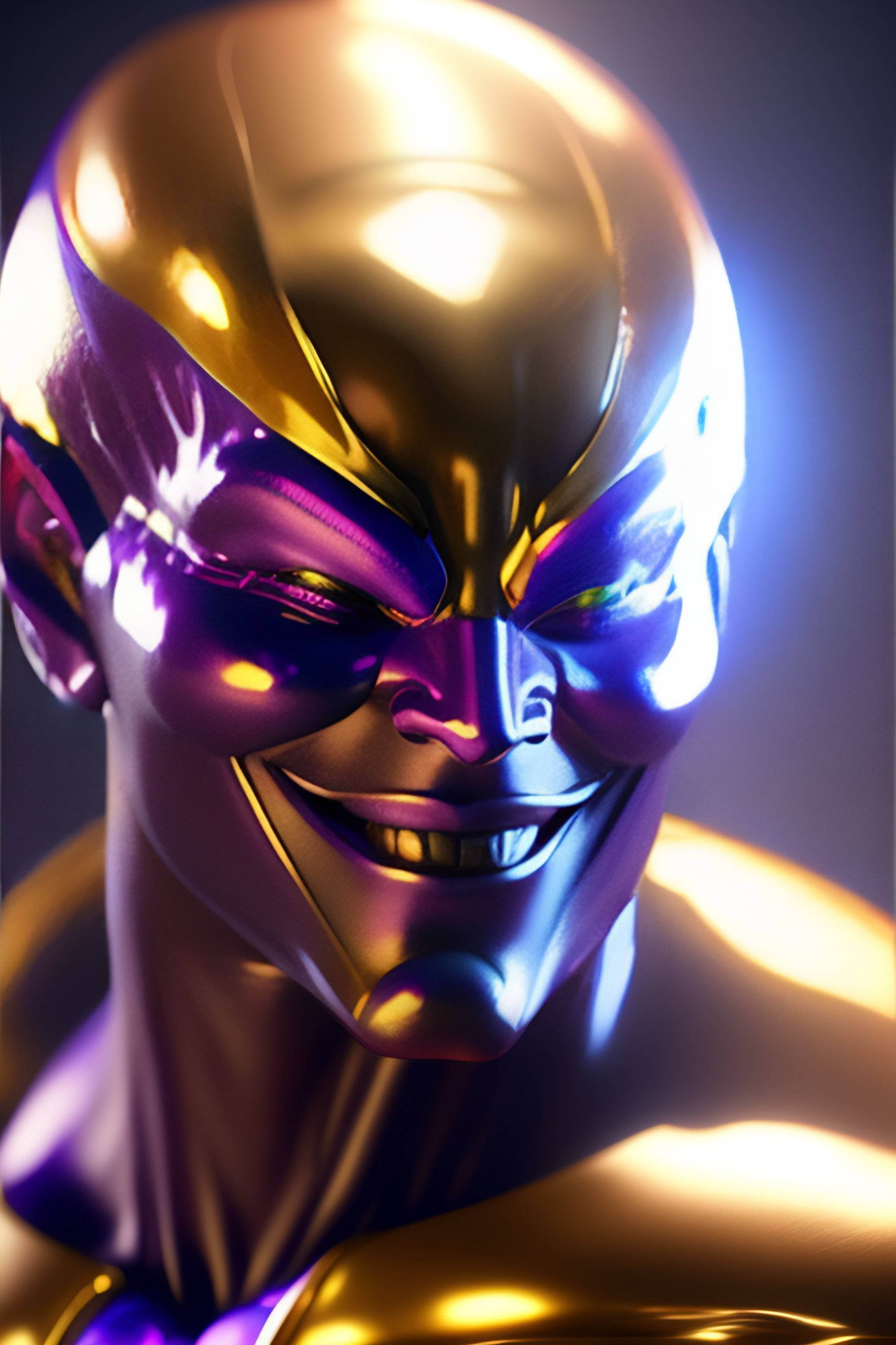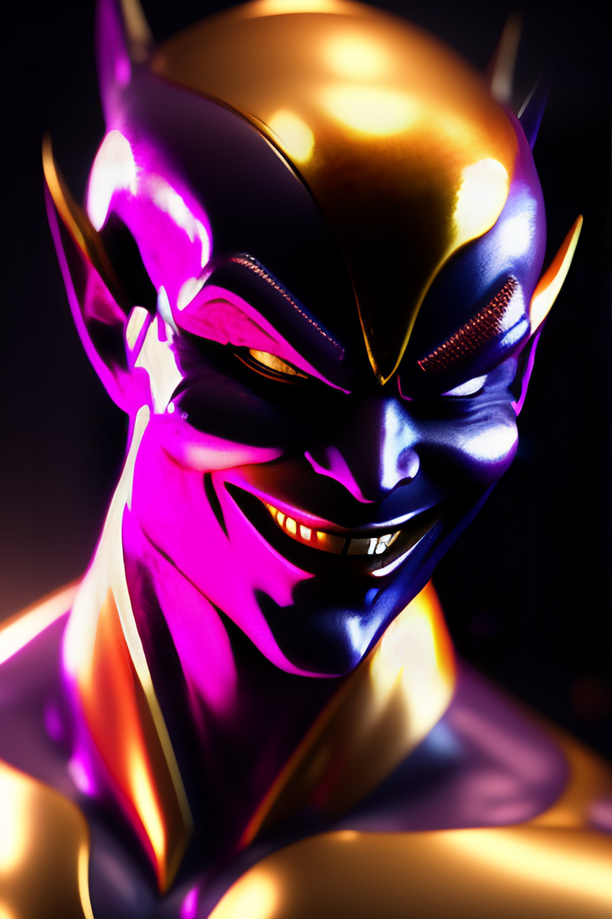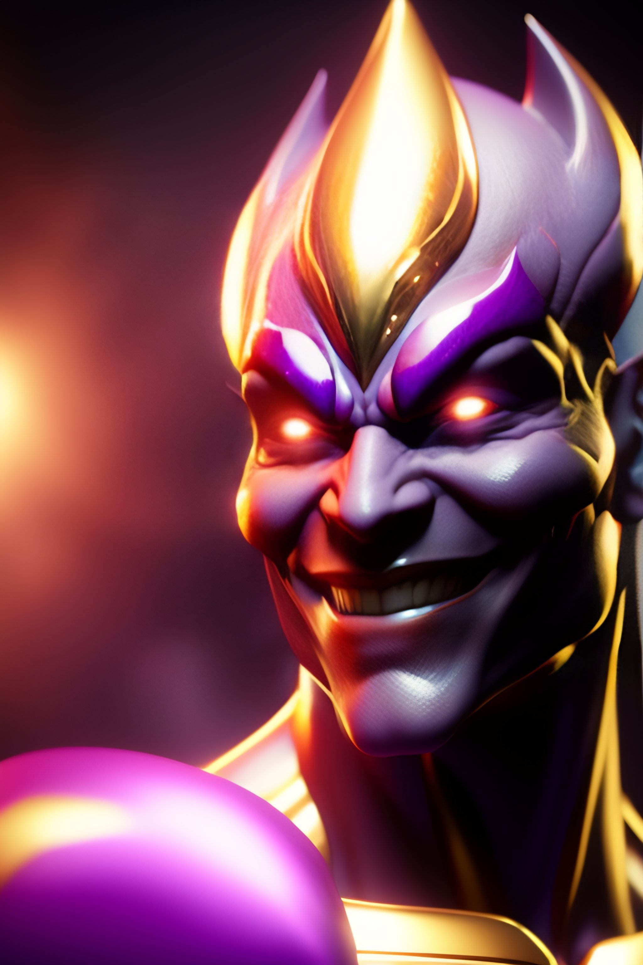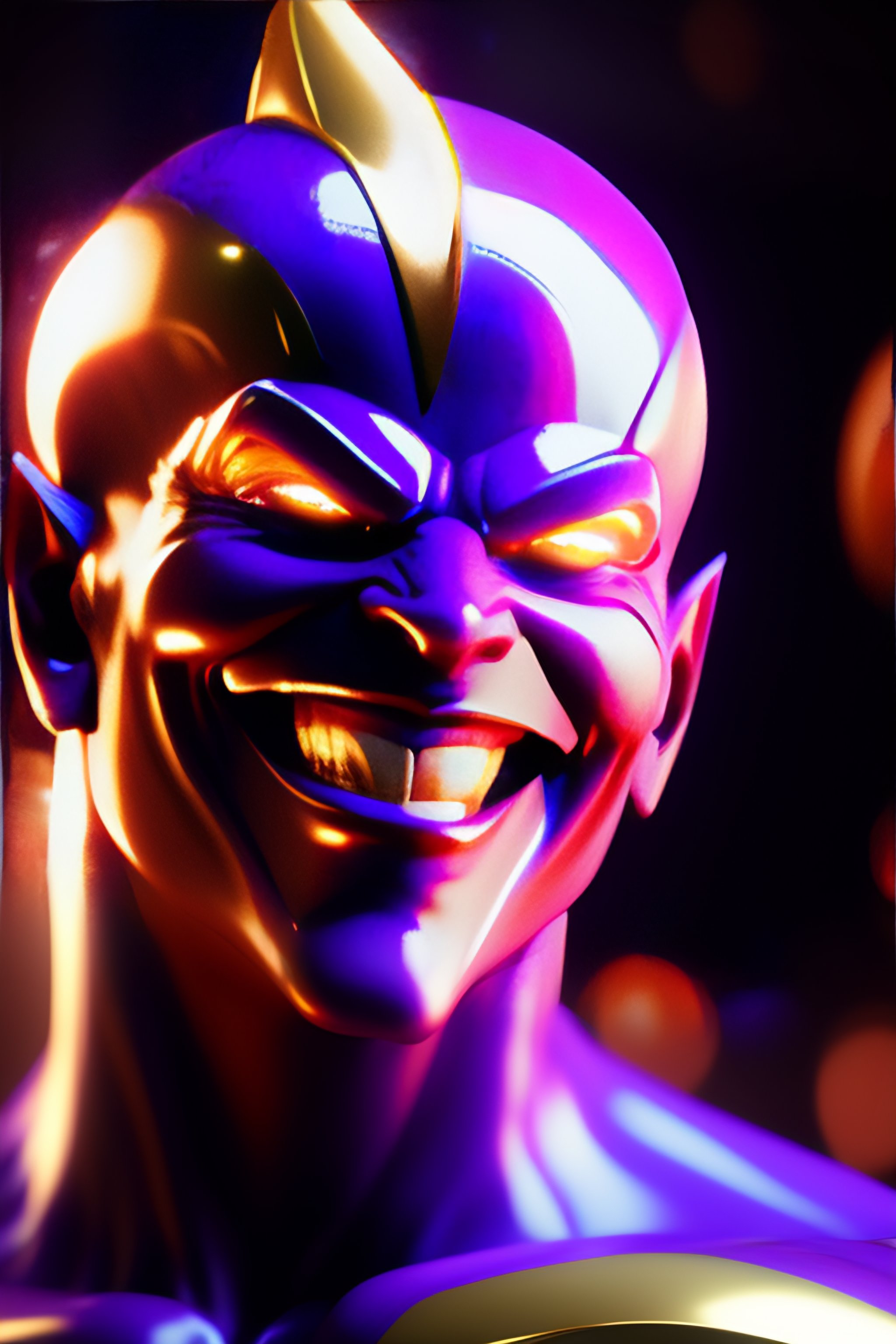 Realistic concept portrait of frieza smiling with big shiny eyes, cgi style, unreal engine 5, volumetric lighting and complimentary colors