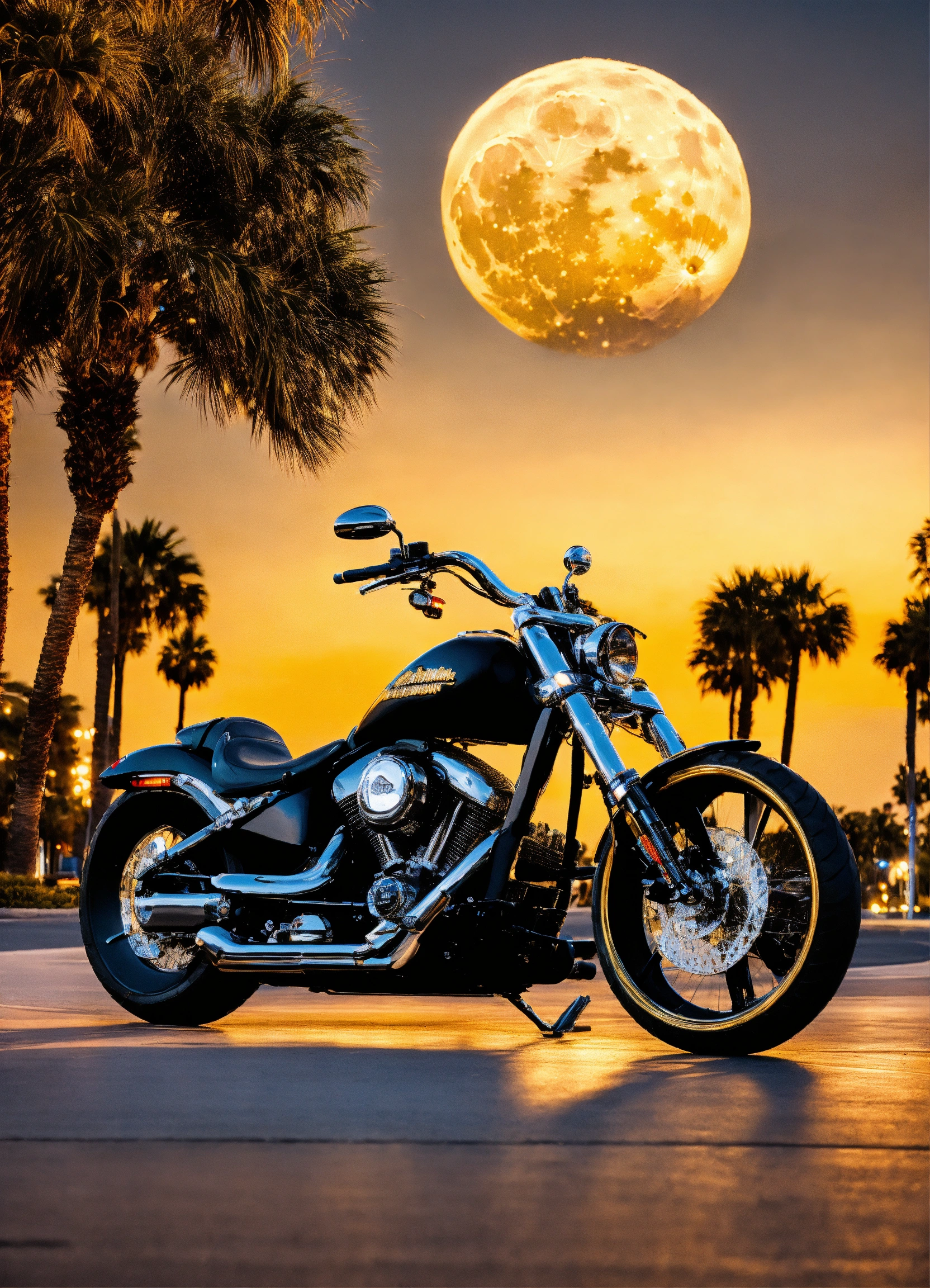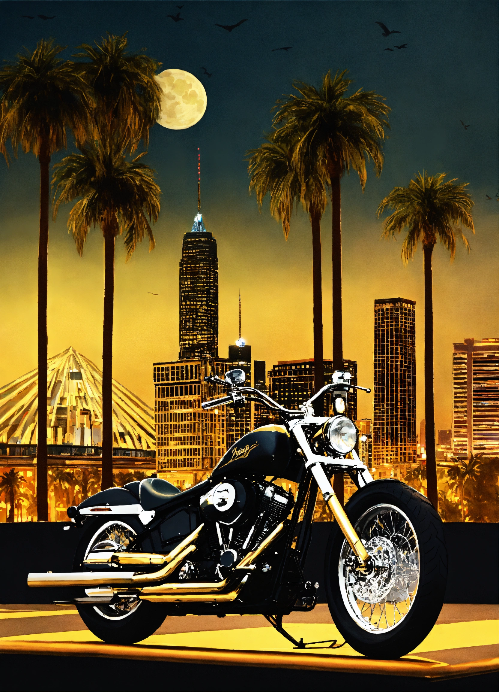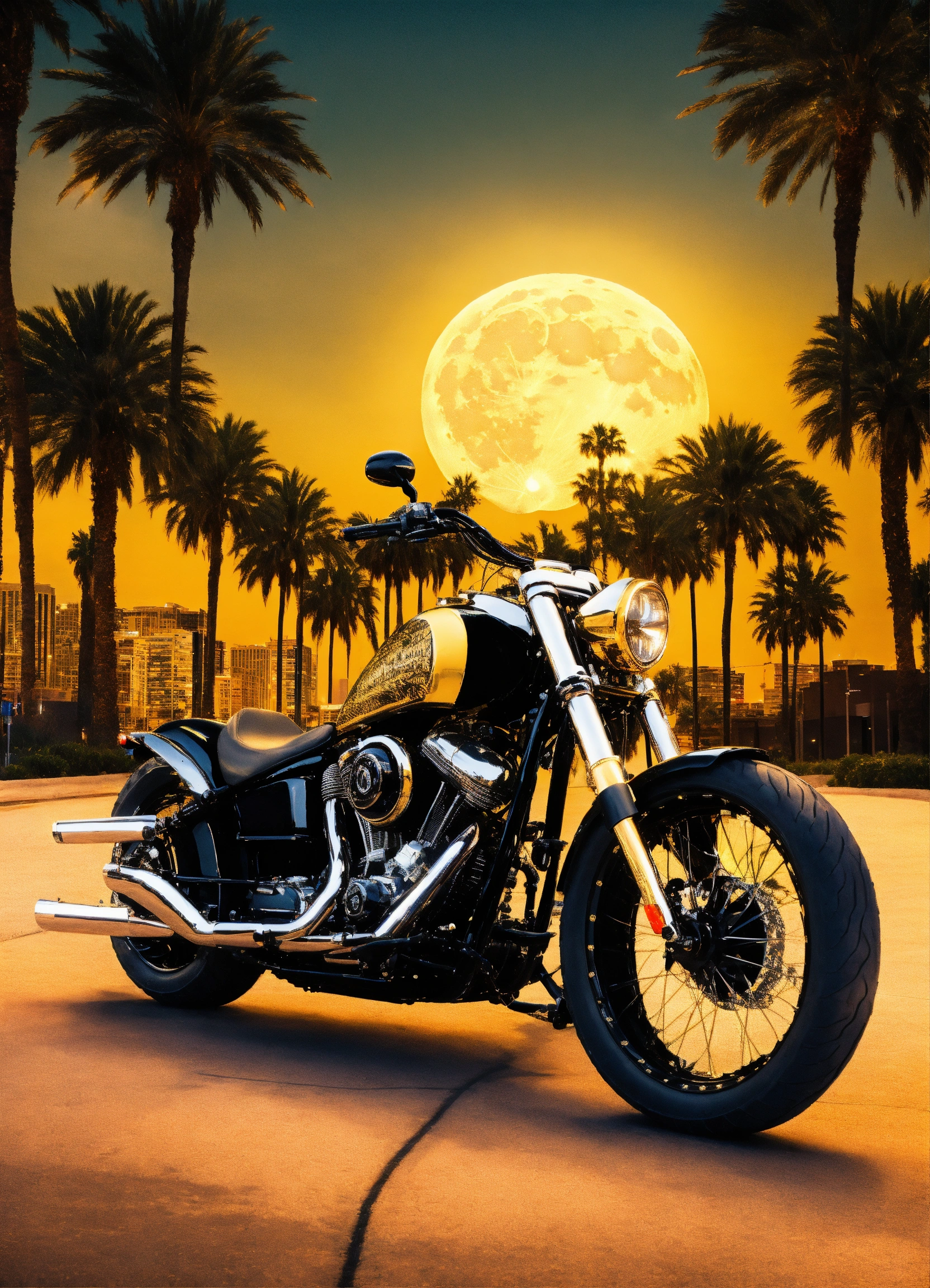 2023 arlington nuss choppers black and gold with downtown landscape and palm trees landscape and golden moonlight background