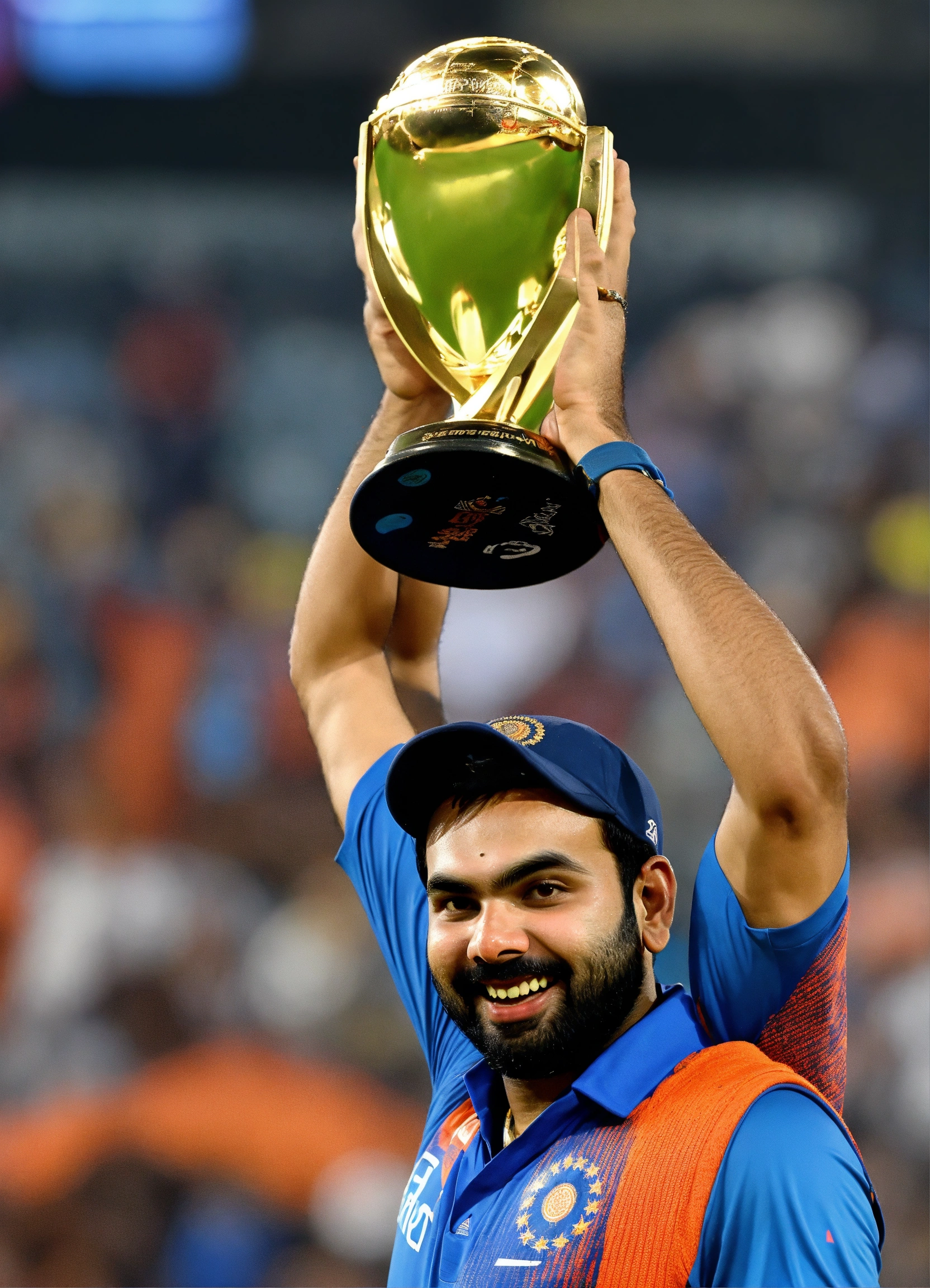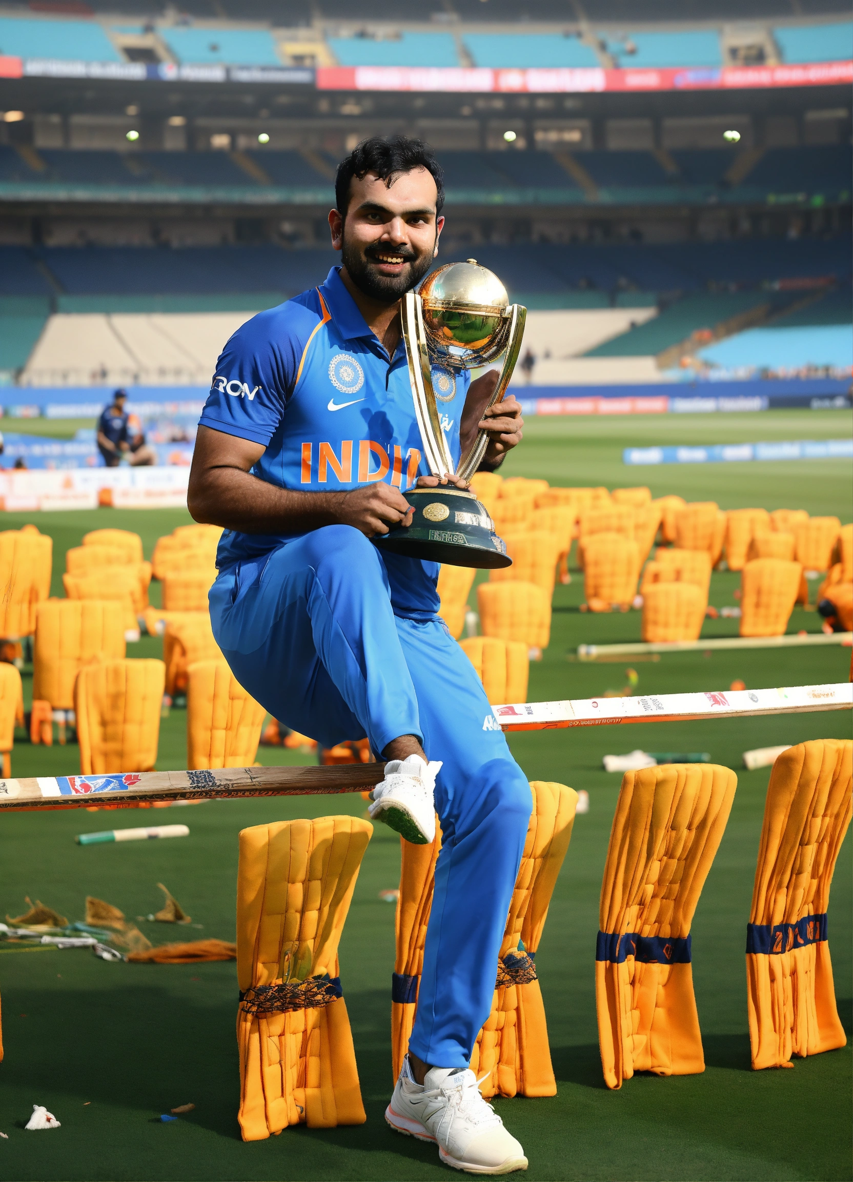 In 2023, rohit sharma made history at the narendra modi stadium in ahmedabad, lifting the icc cricket world cup. with unmatched determination and stellar teamwork, kohli's joyful moment, hoisting the trophy, resonated with fans across the globe, etching his name in cricketing history.