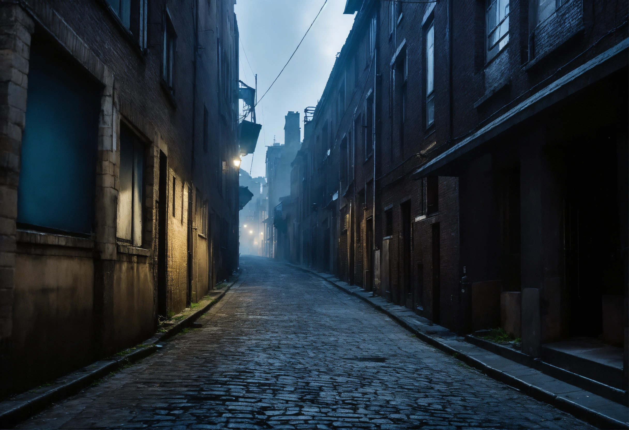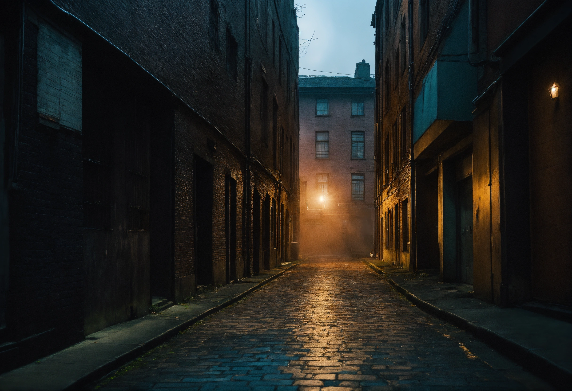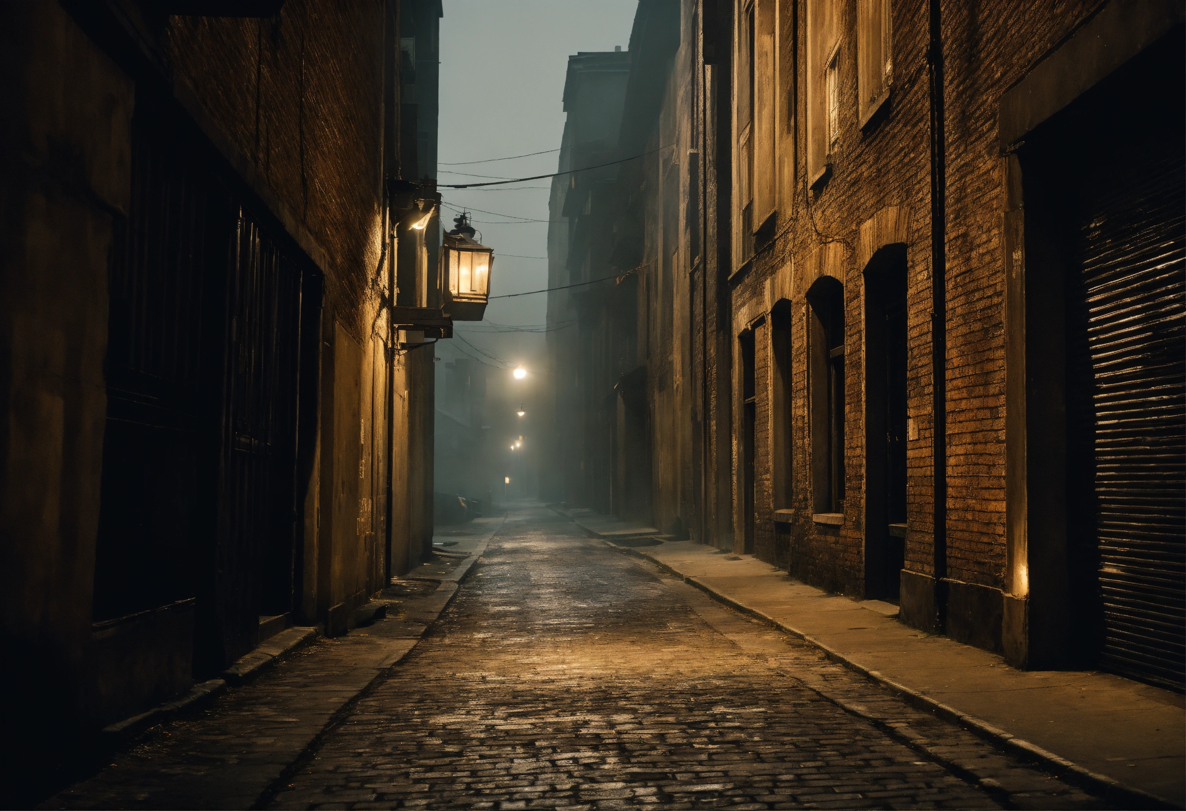 A dark alley with buildings on the side, view from alley entrance and dissolving into obscurity, street, dark city