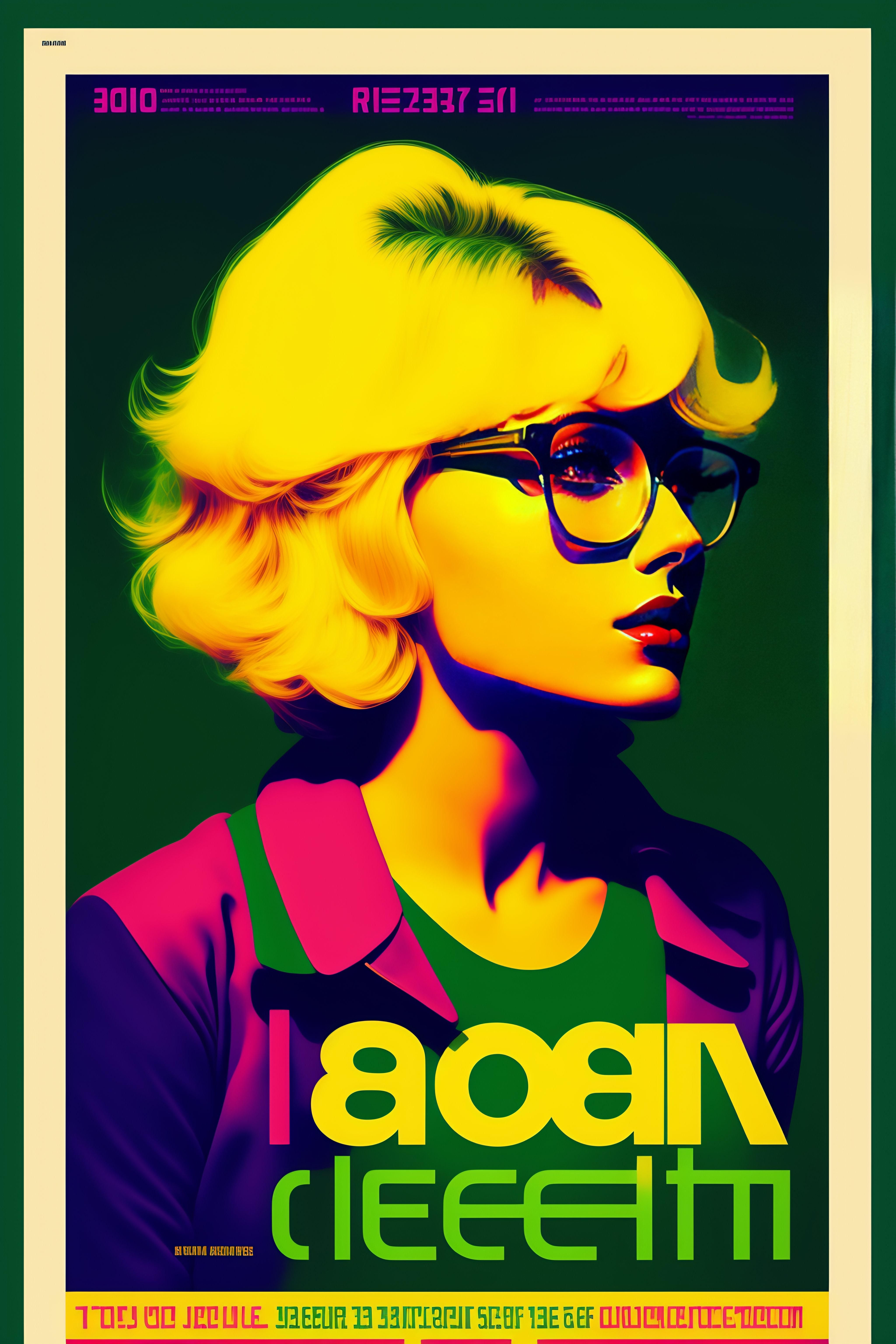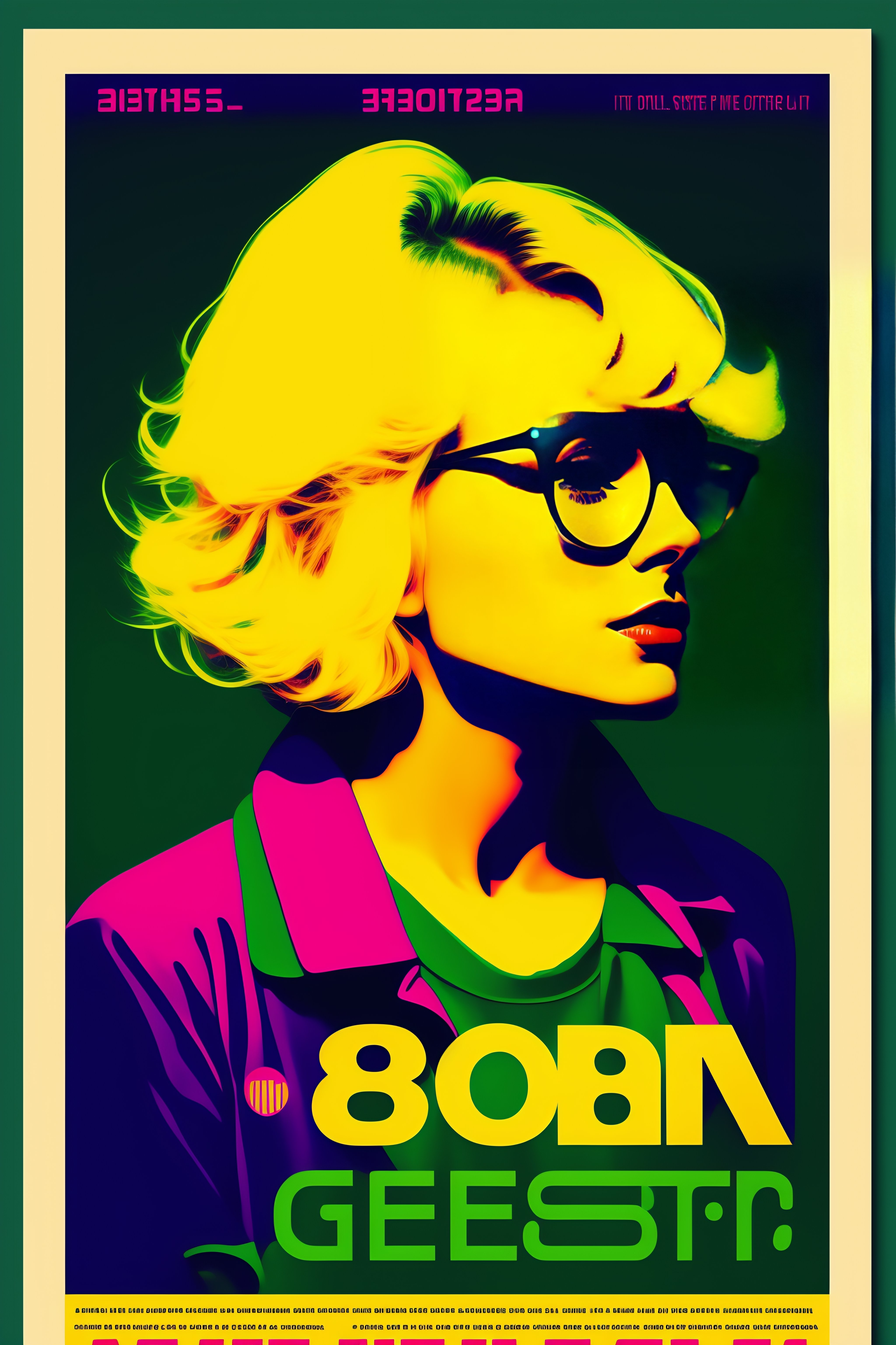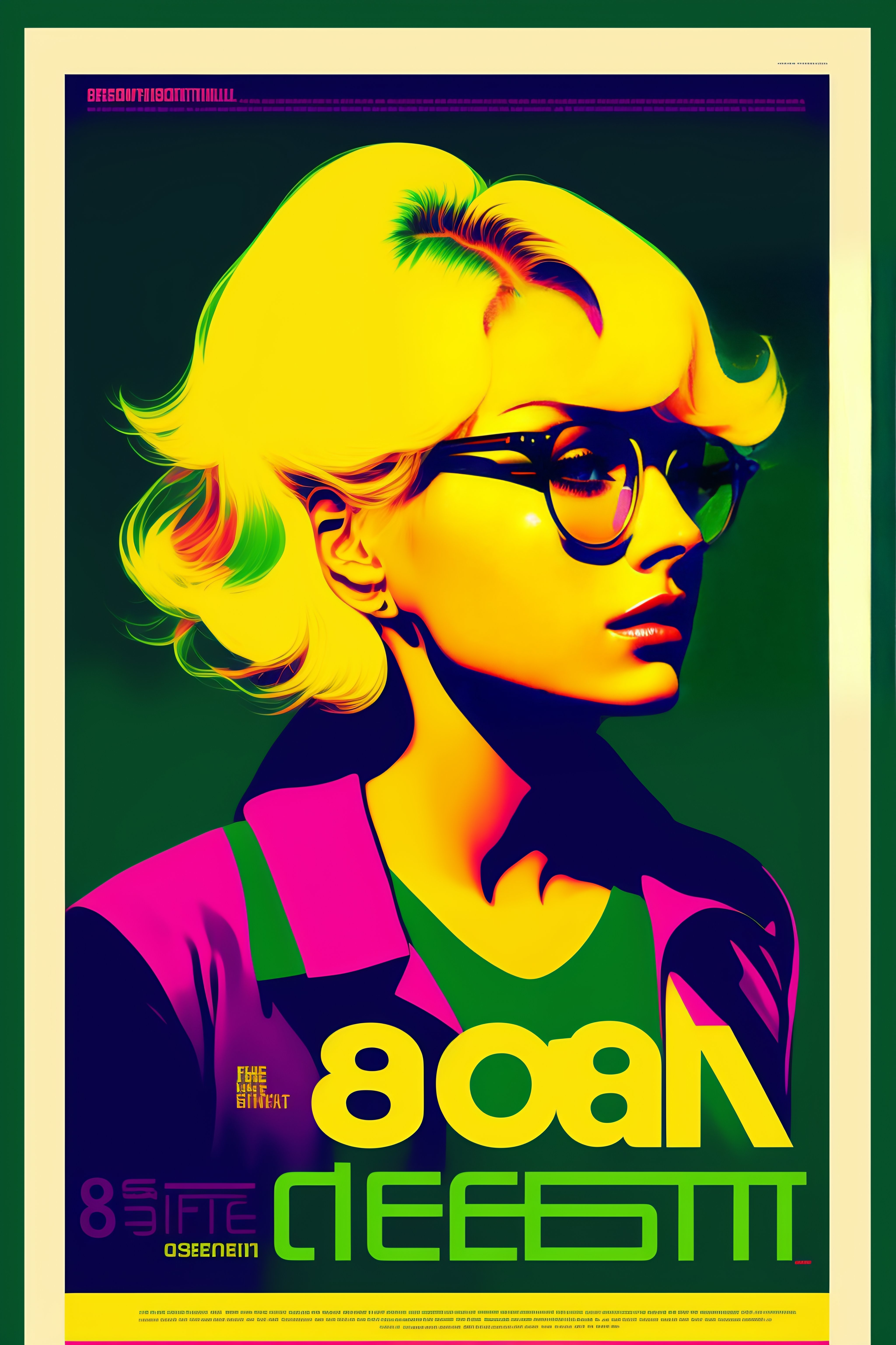 Retro poster, full page, from the 80s, for a software development company, hipster developers, blond, ping, green, yellow