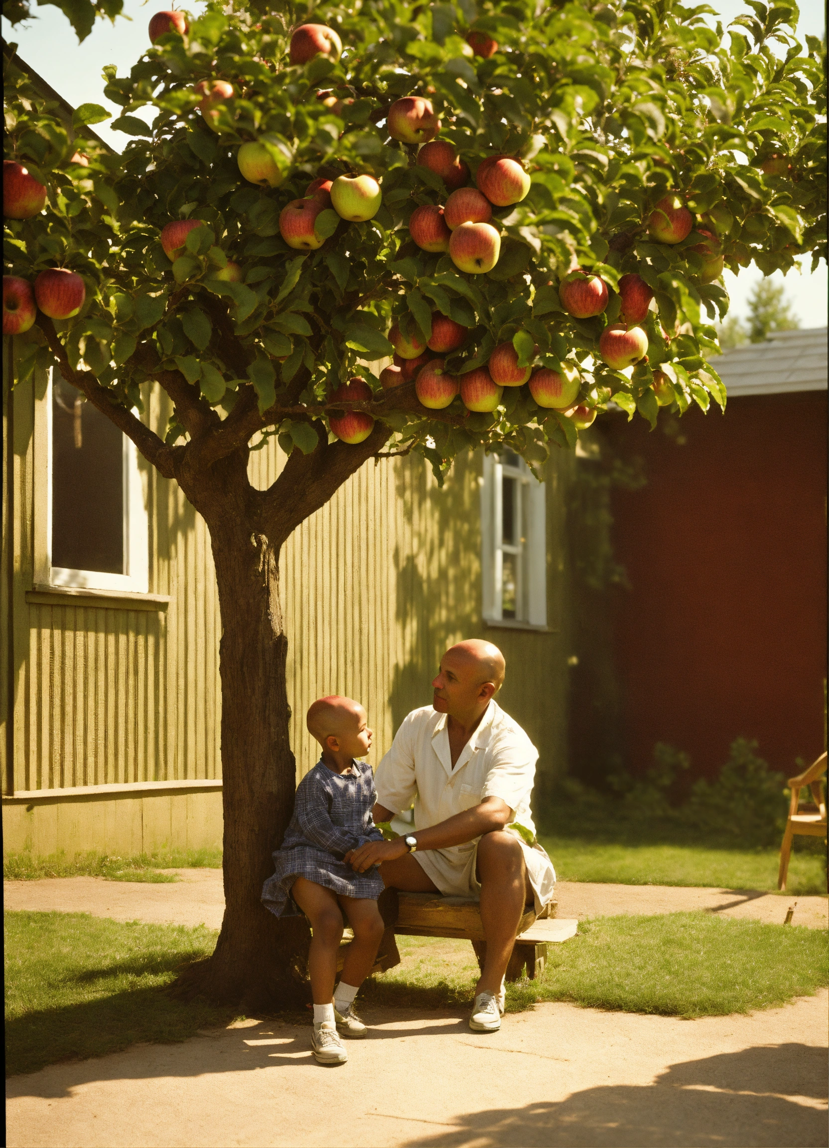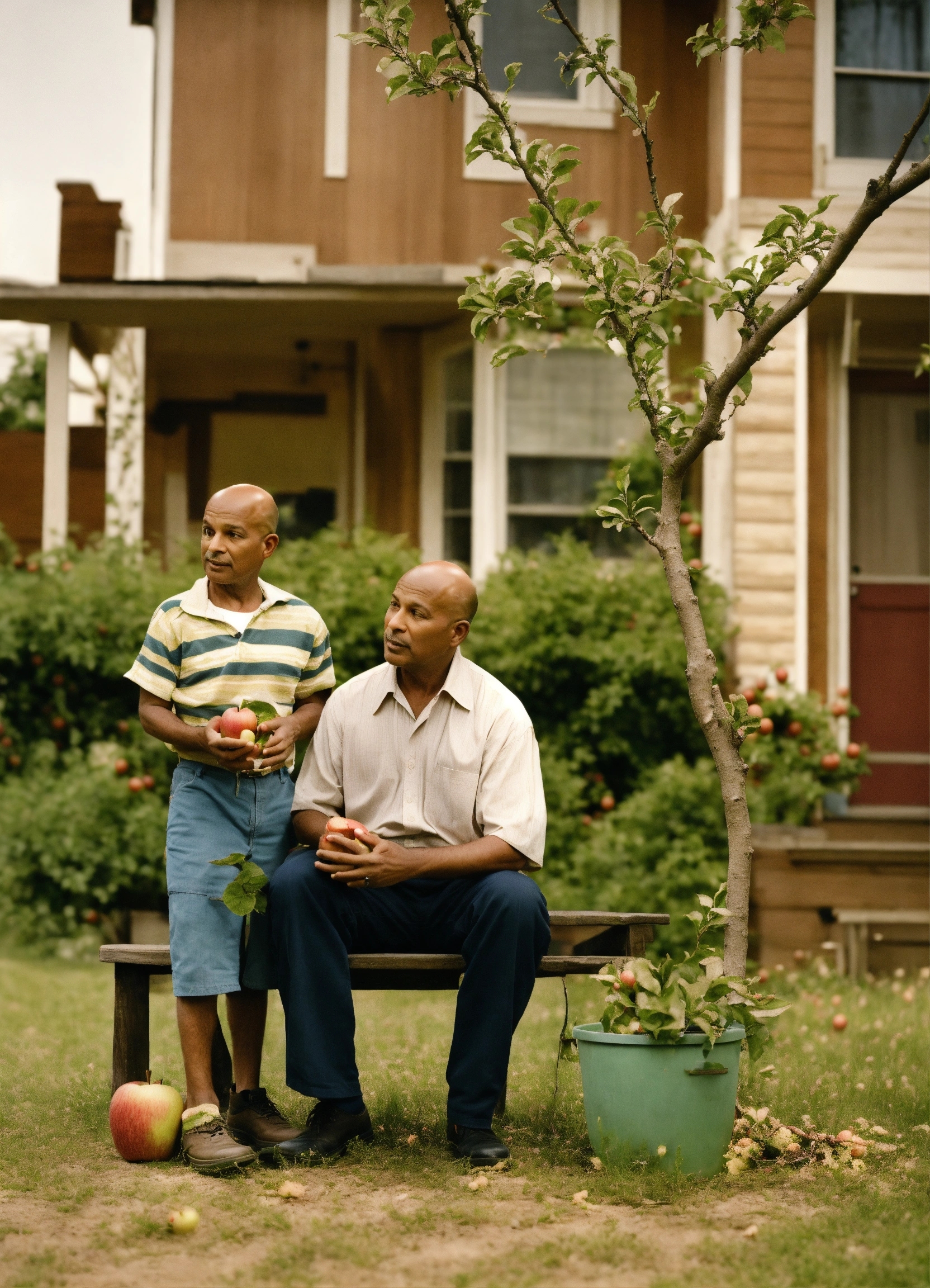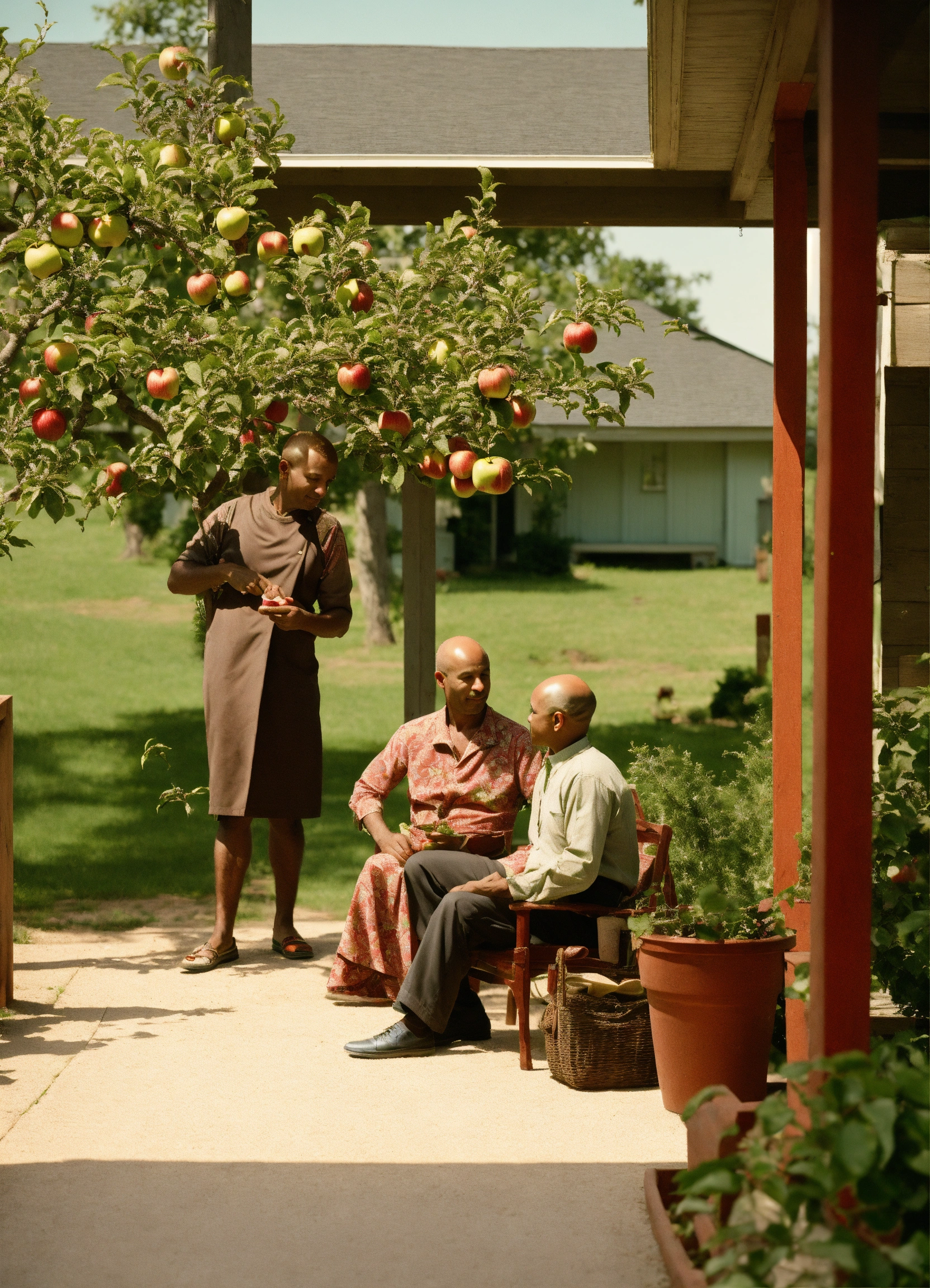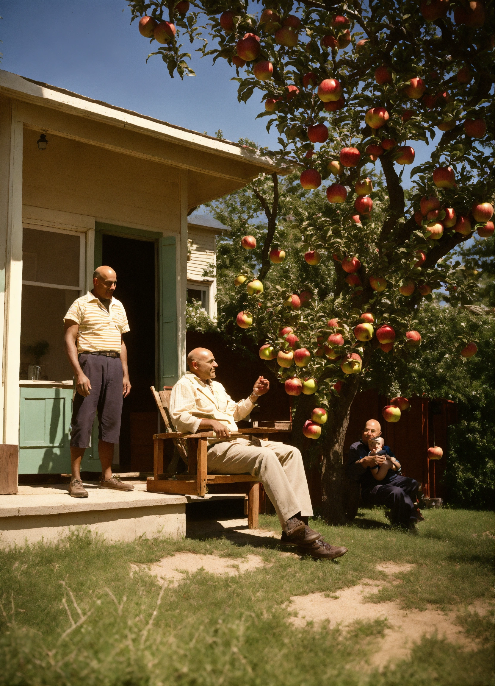 Setting 1960s backyard and porch of an urban home. in the foreground a medium-skinned, bald, 55-year-old woman is seated on the porch, and she is holding a brown-skinned five-year-old boy. in the background a medium-skinned, bald, 55-year-old man under an apple tree. a medium-skinned, bald, 55-year-old man under an apple tree. men are having a conversation by themselves. a well-grown apple tree, possibly discussing it. technical specifications steps 20 sampler dpm++ 2m karras cfg scale 18 desired output size 1024x960 pixels