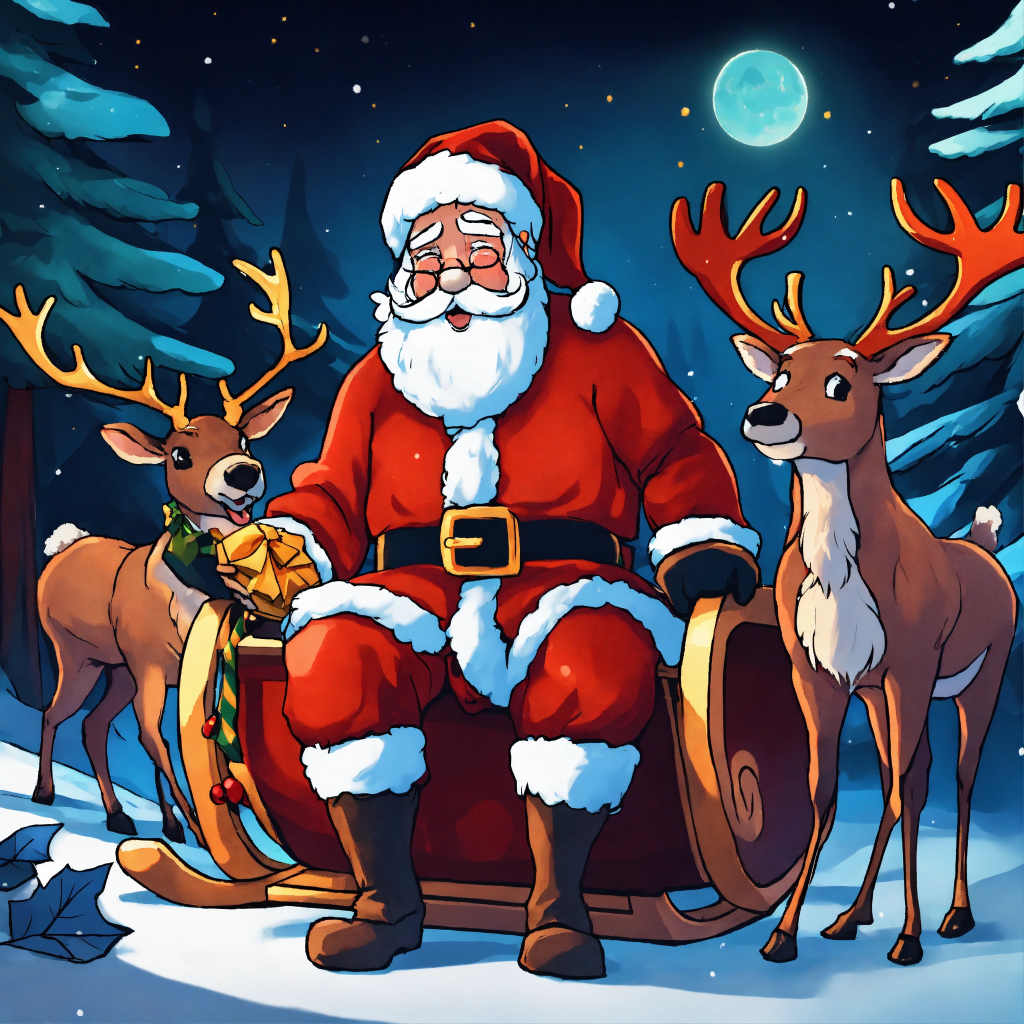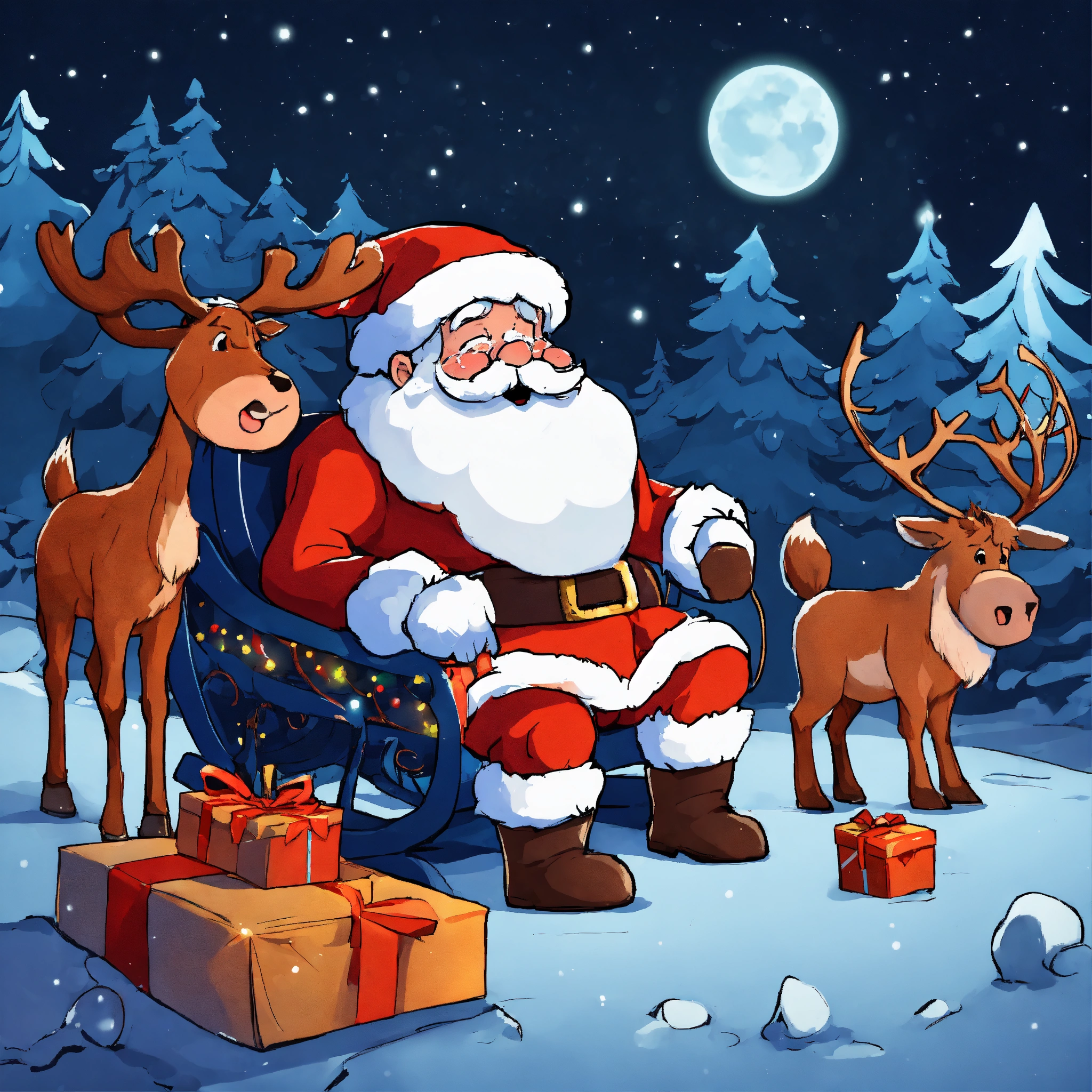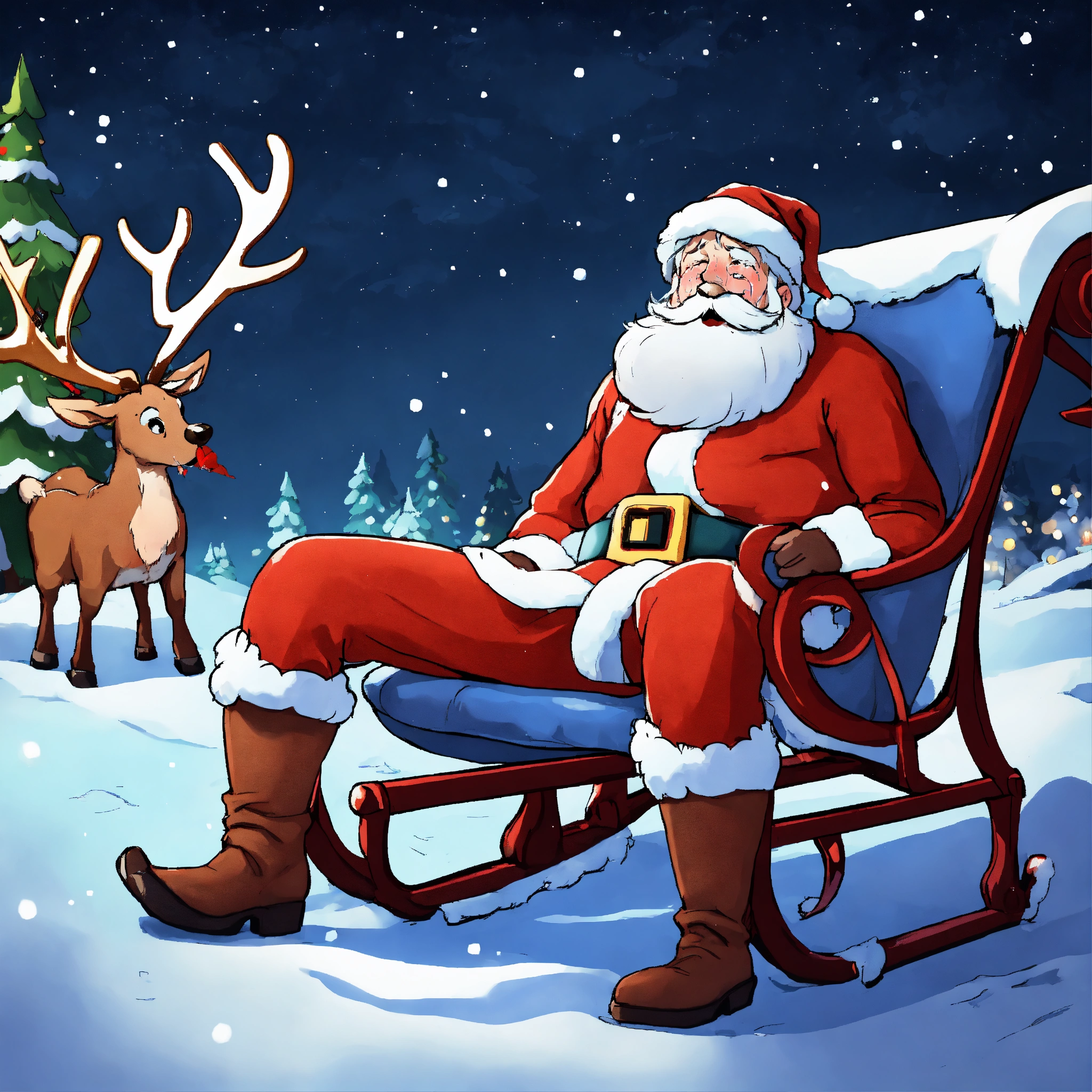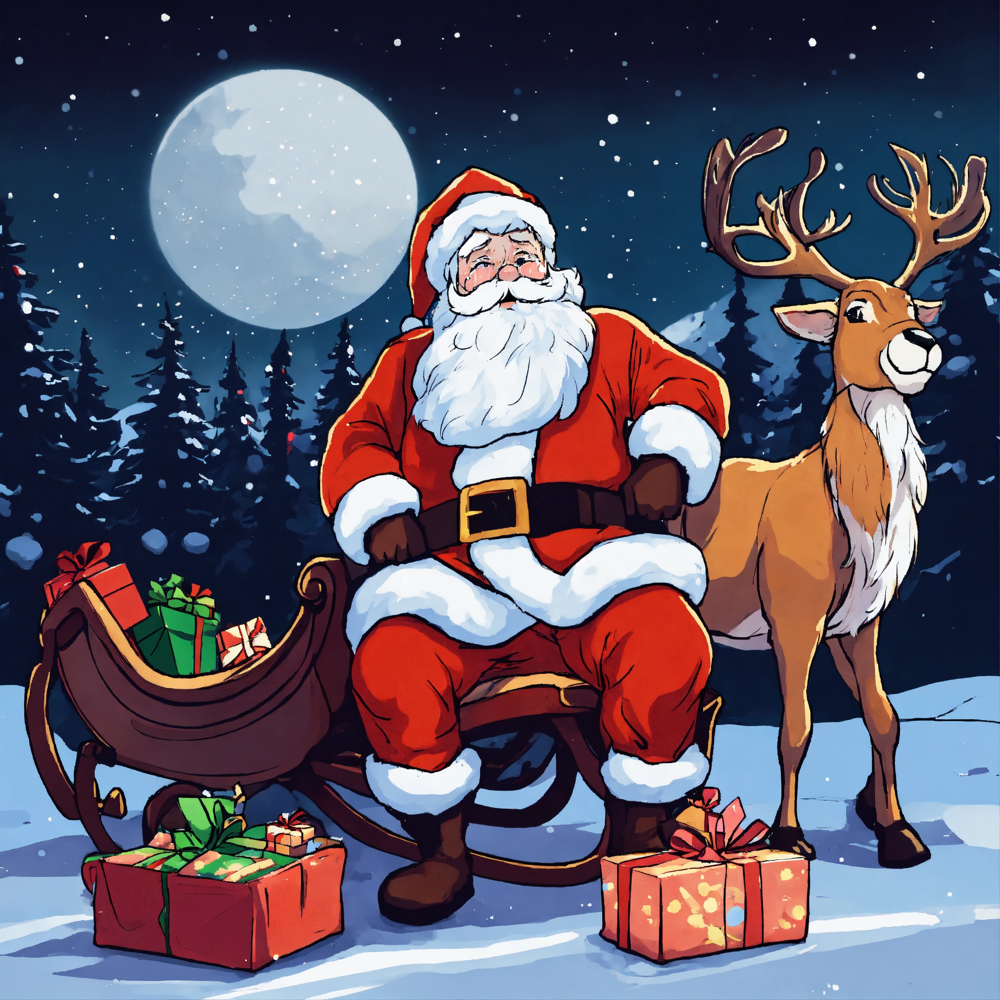 Santa claus crying in the snowy forest in the night, in front of his sleigh full of gifts, and his reindeer sick and sad, lying down