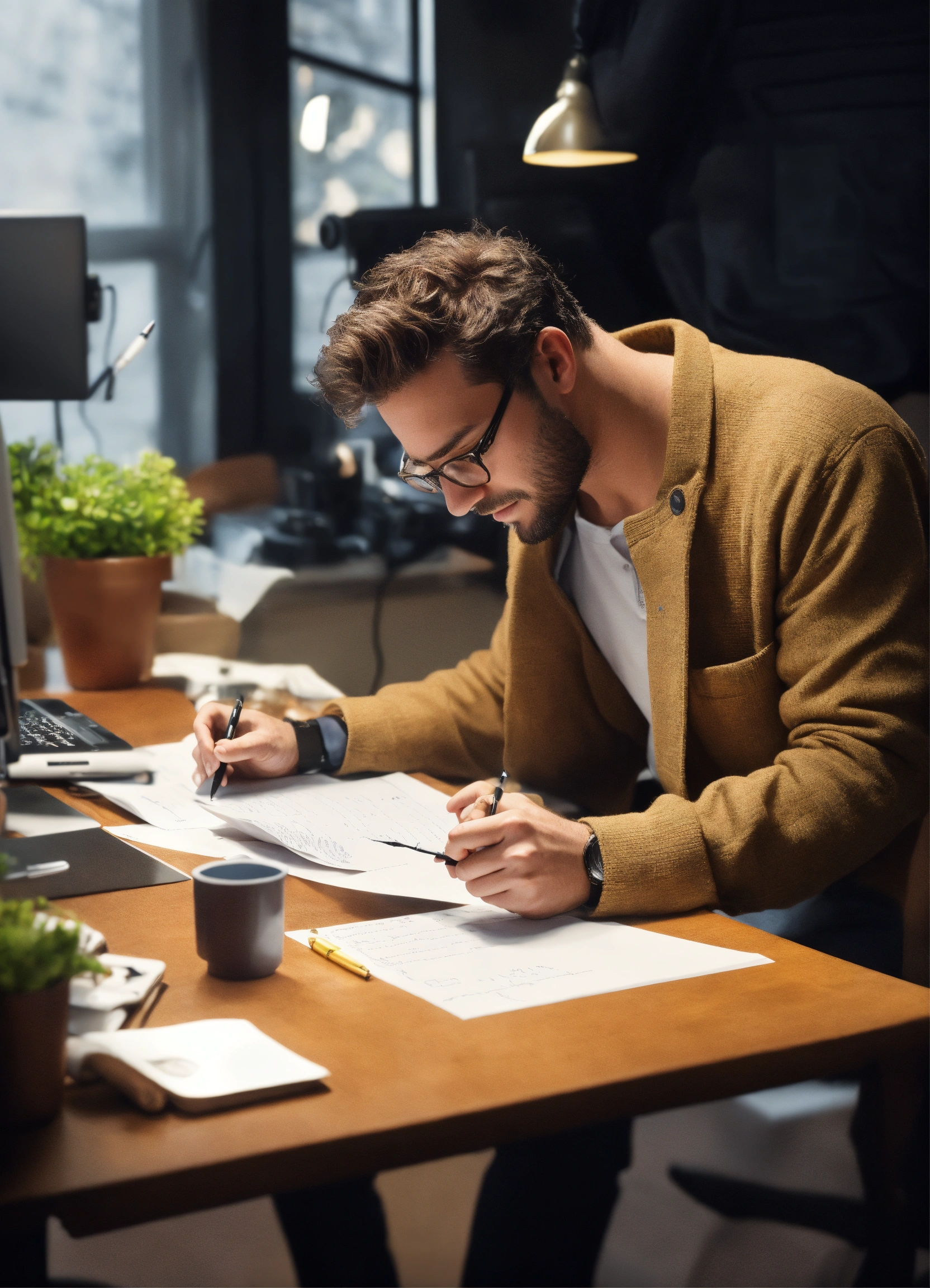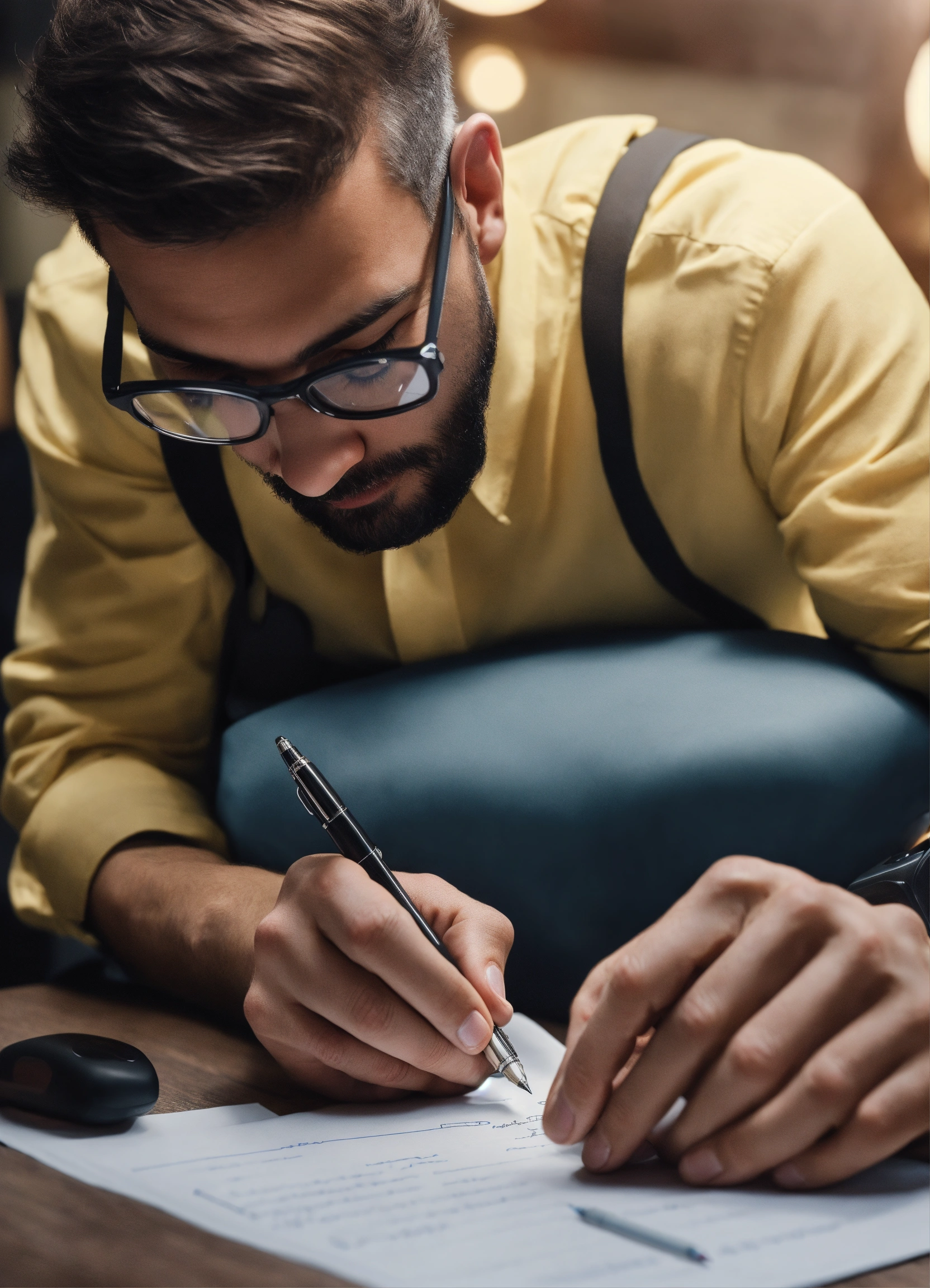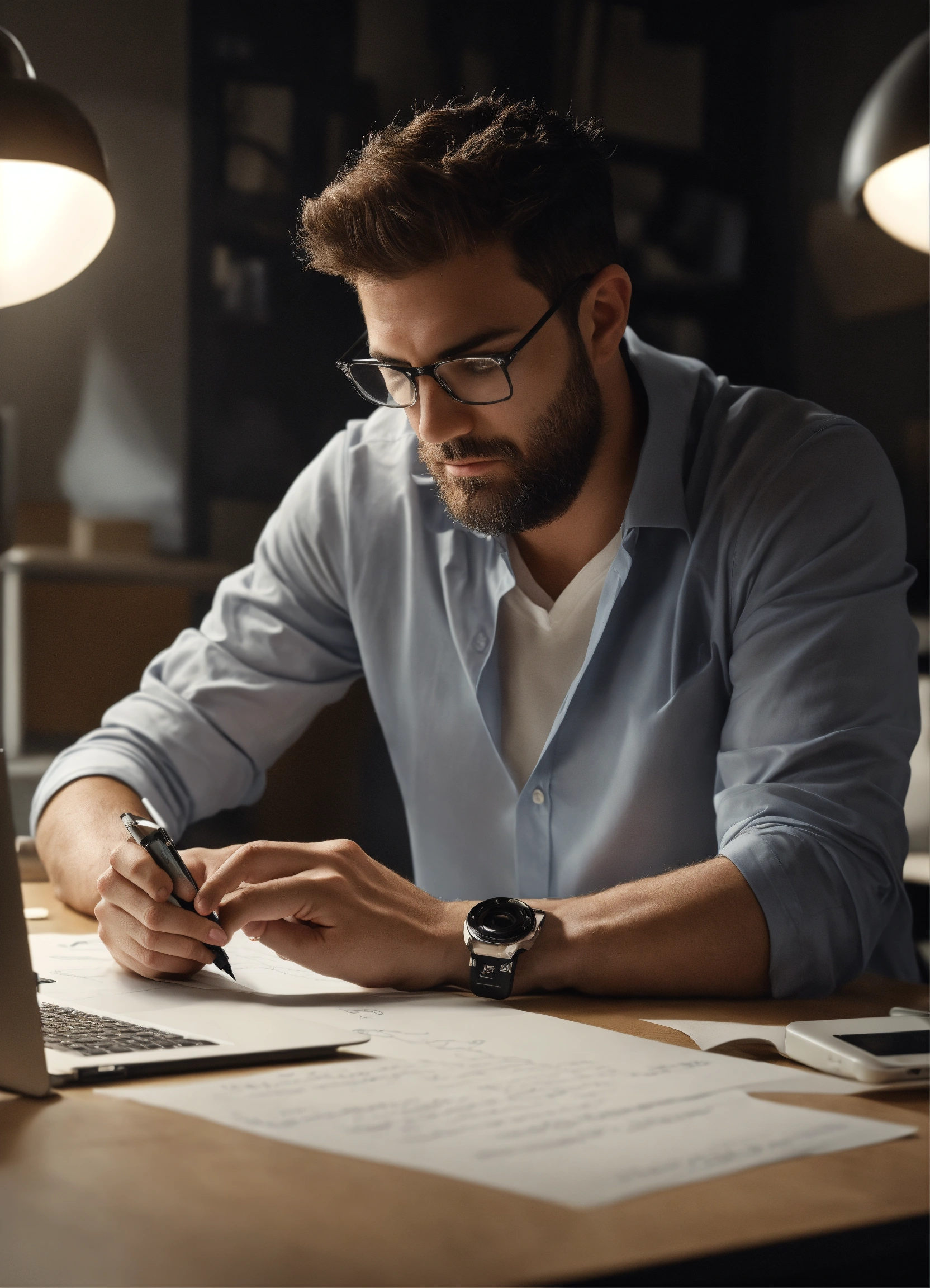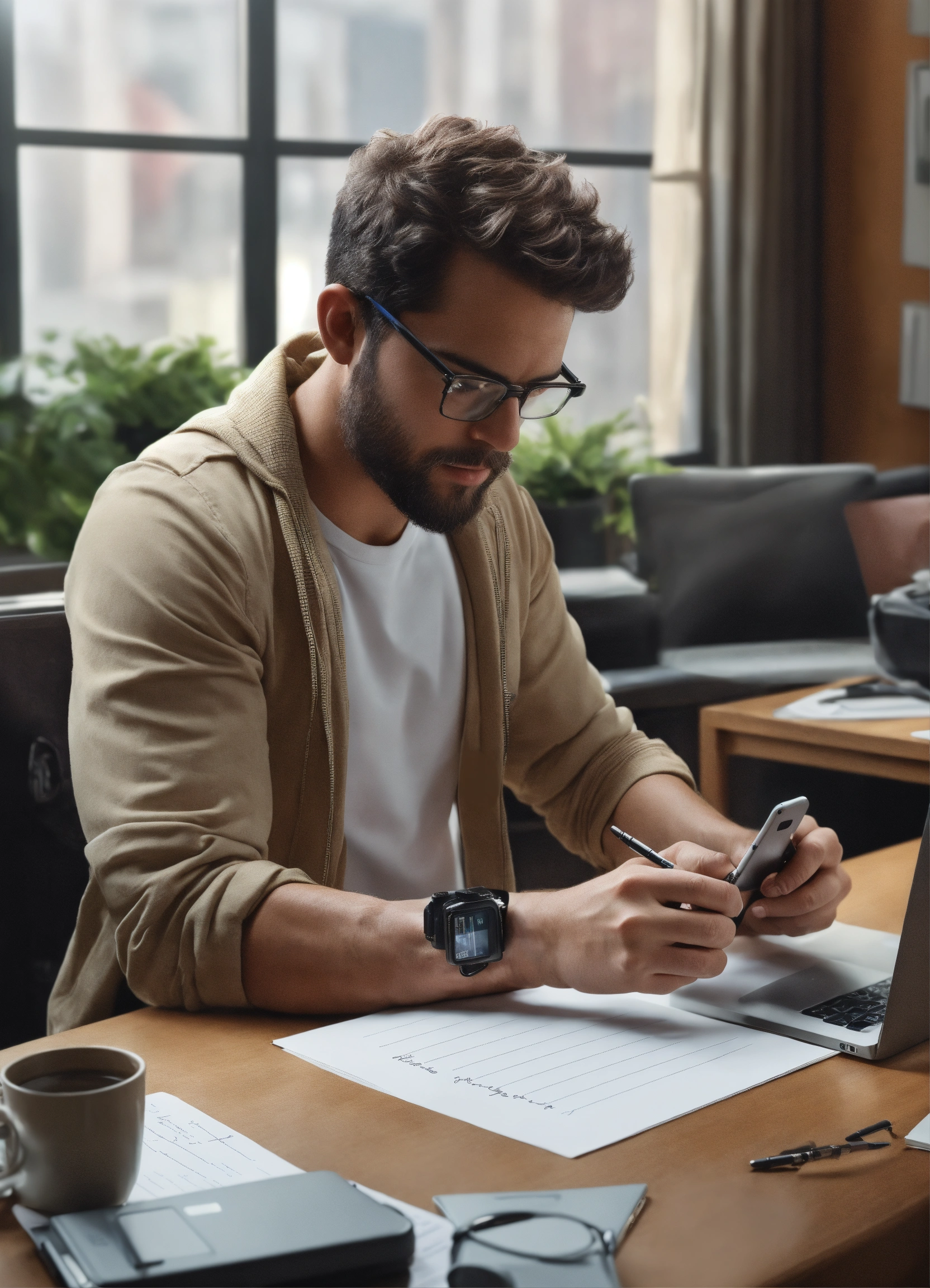 Create a hyper-realistic, 4k, lifelike digital image that show a man with four arms one hand typing in a computer, other with a camera taking pictures, other writing in a sheet of paper with a pen and another arm holding a cellphone, showing how busy one can be.