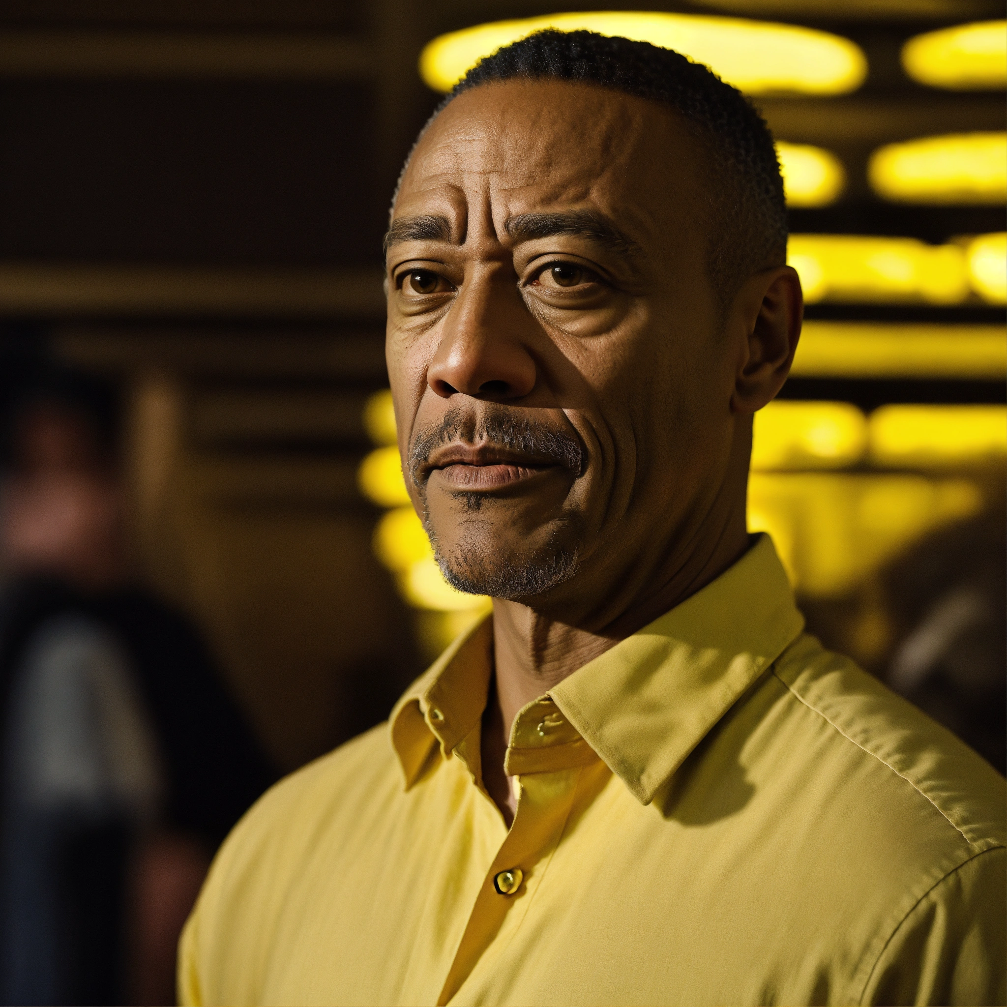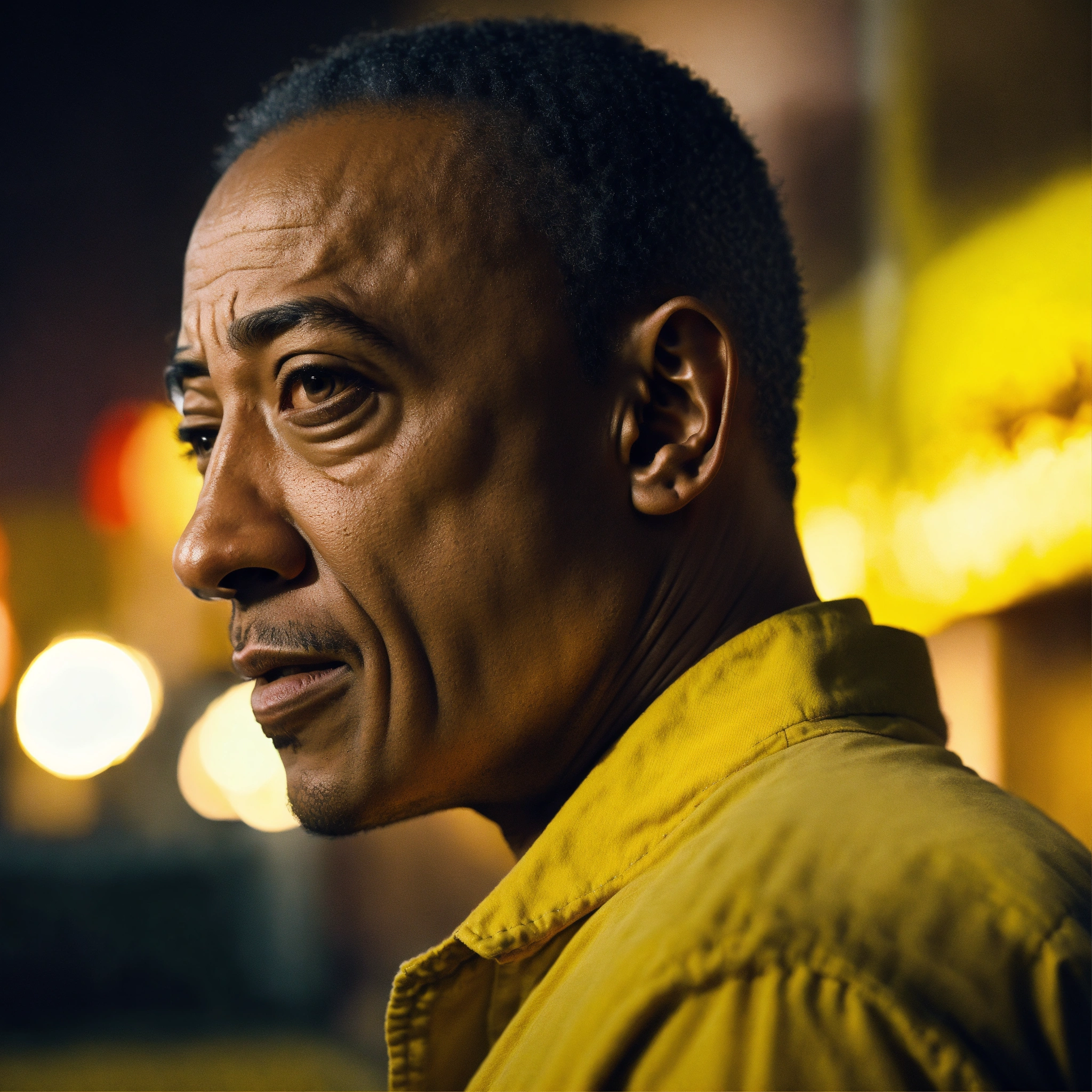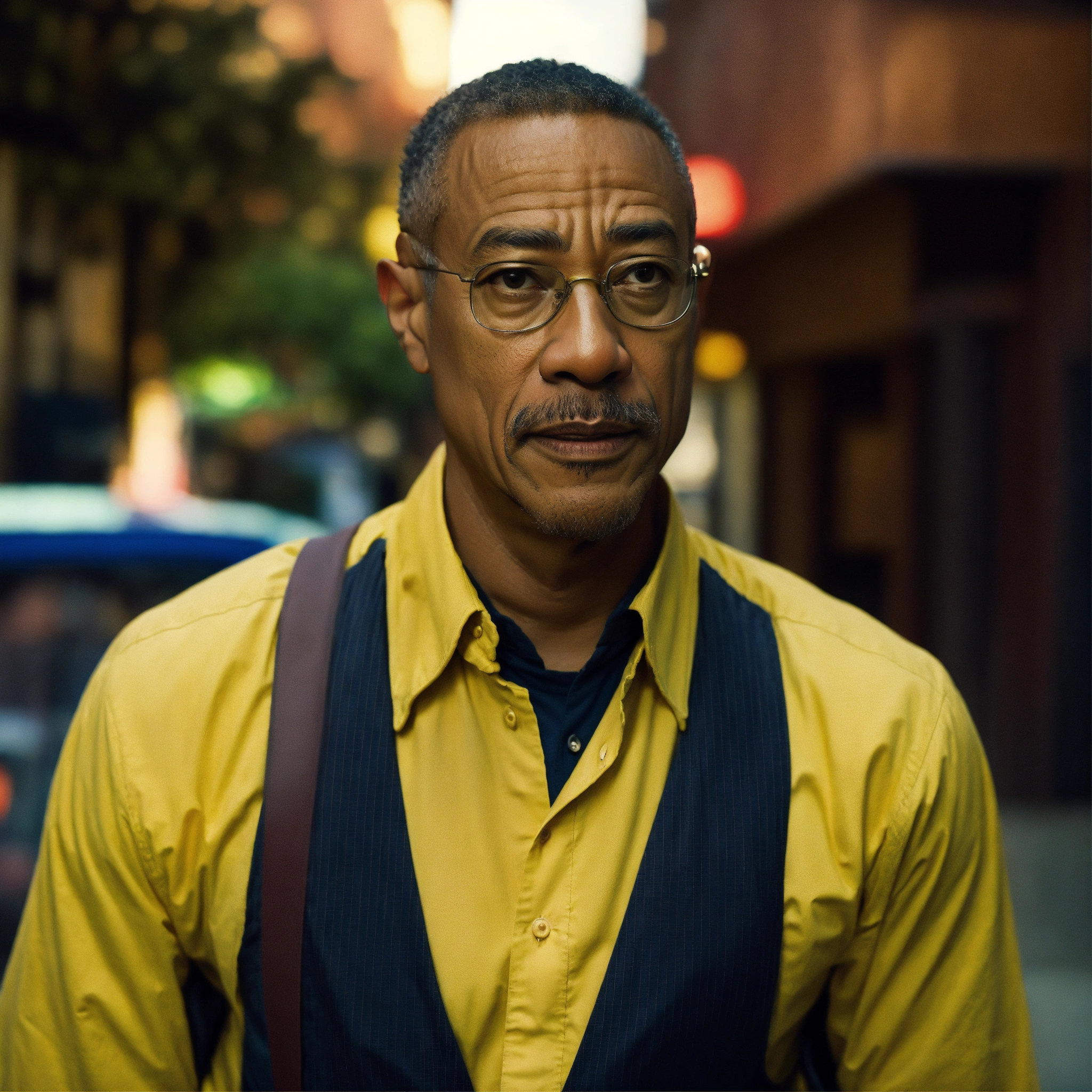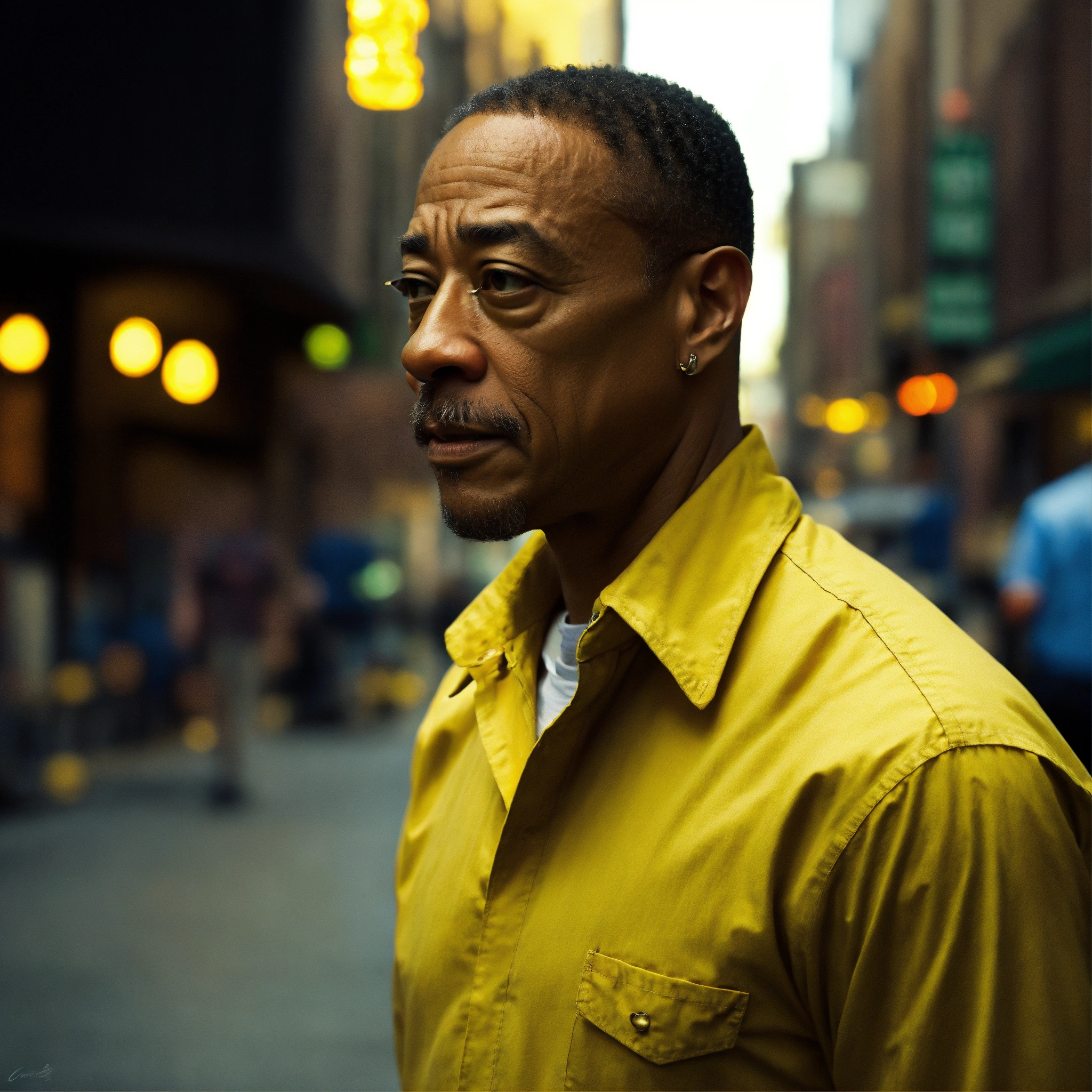 Giancarlo esposito, gus fring, impressionism, moody, breaking bad, bustling city, yellow shirt, profile picture, no beard, shaved