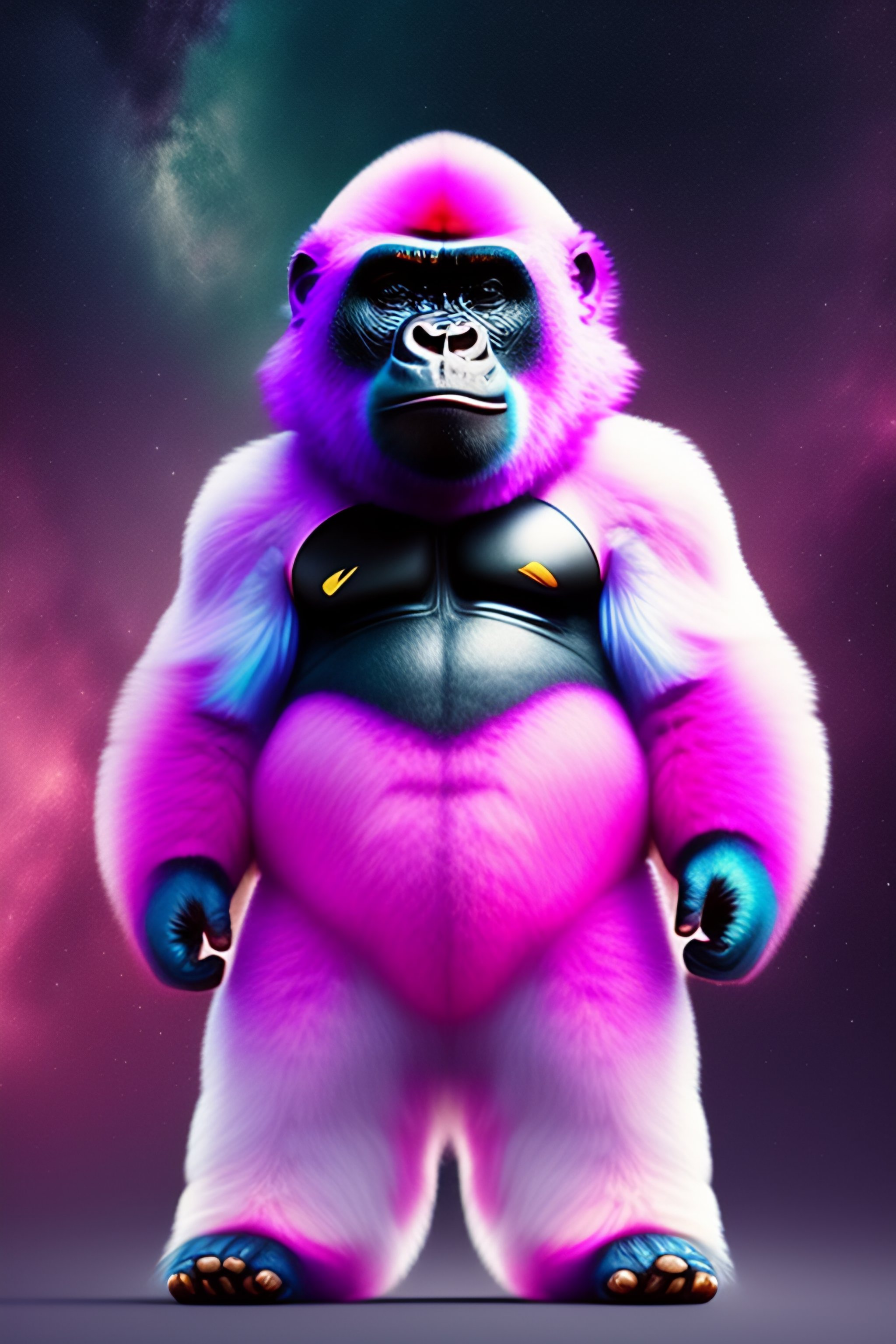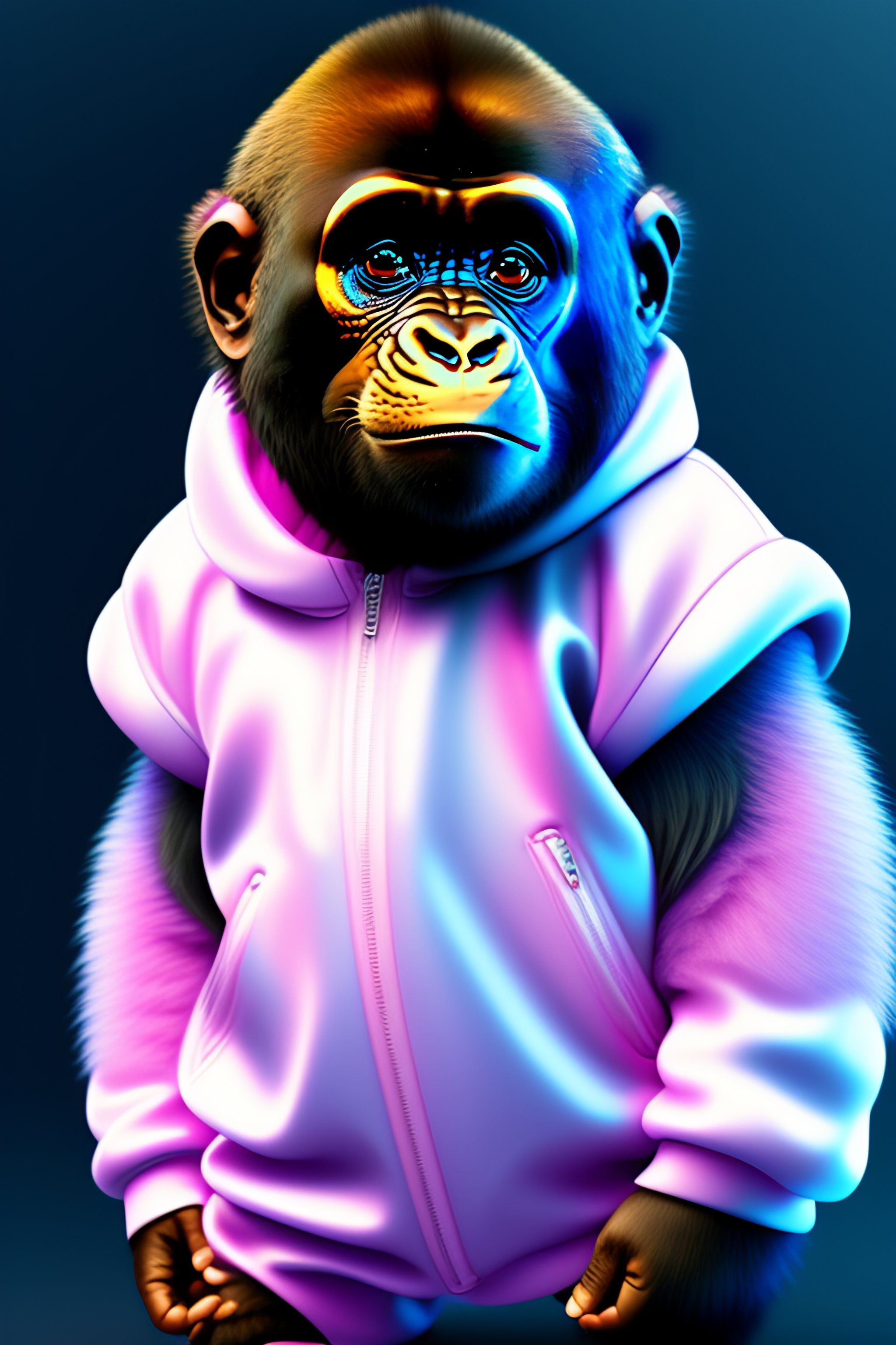 Mix of a cute handsome baby gorilla wearing futuristic pastel clothing