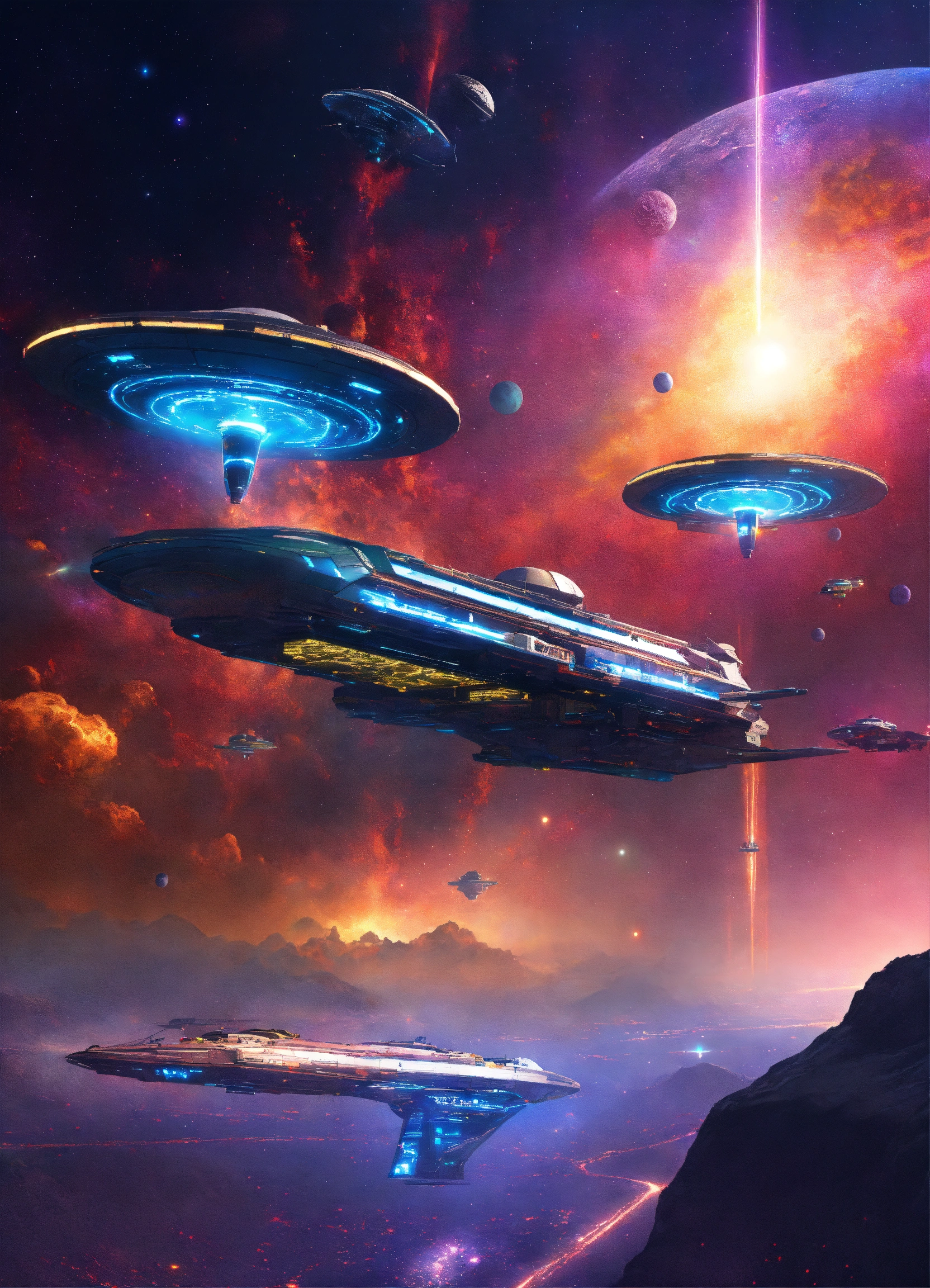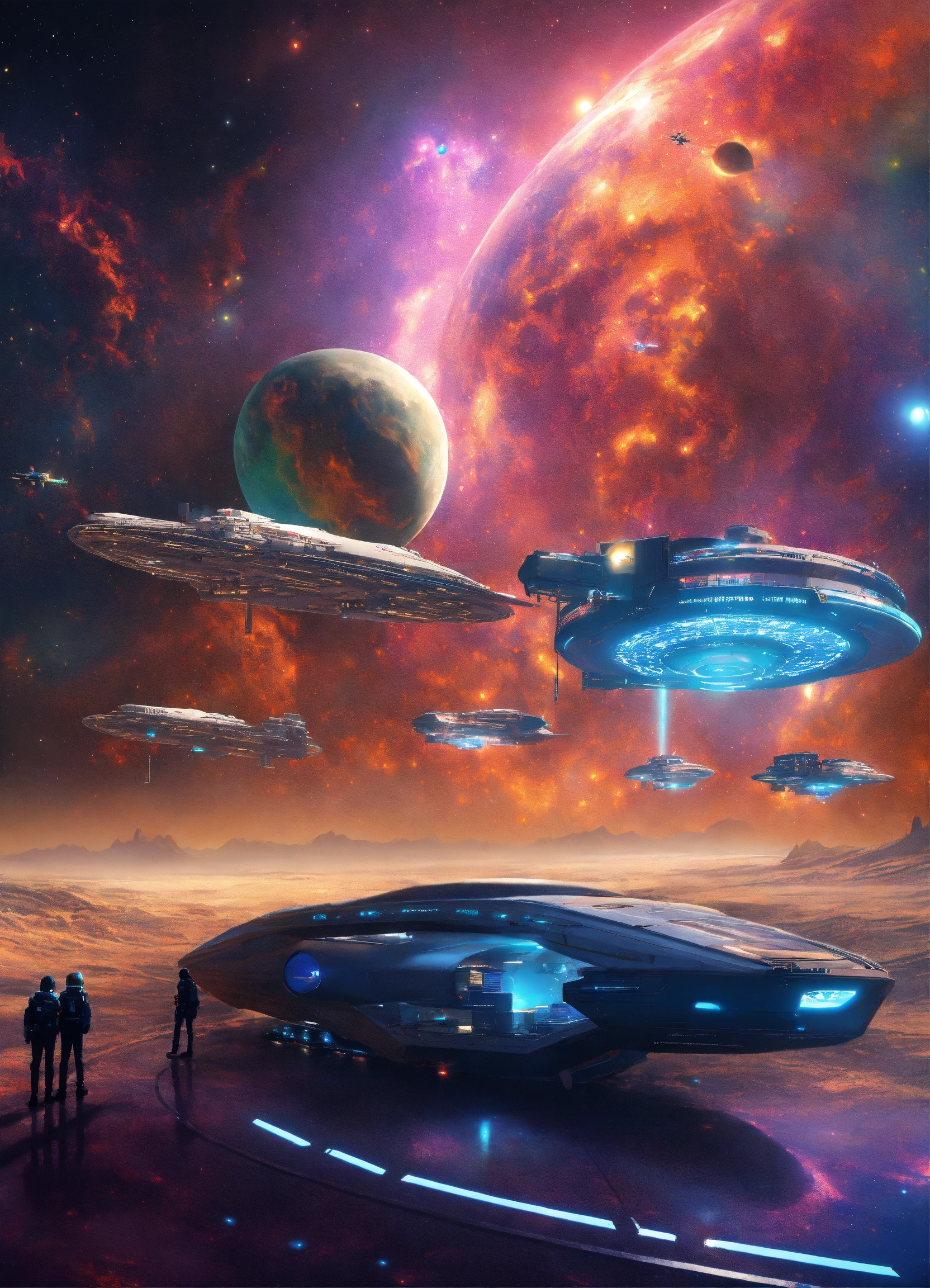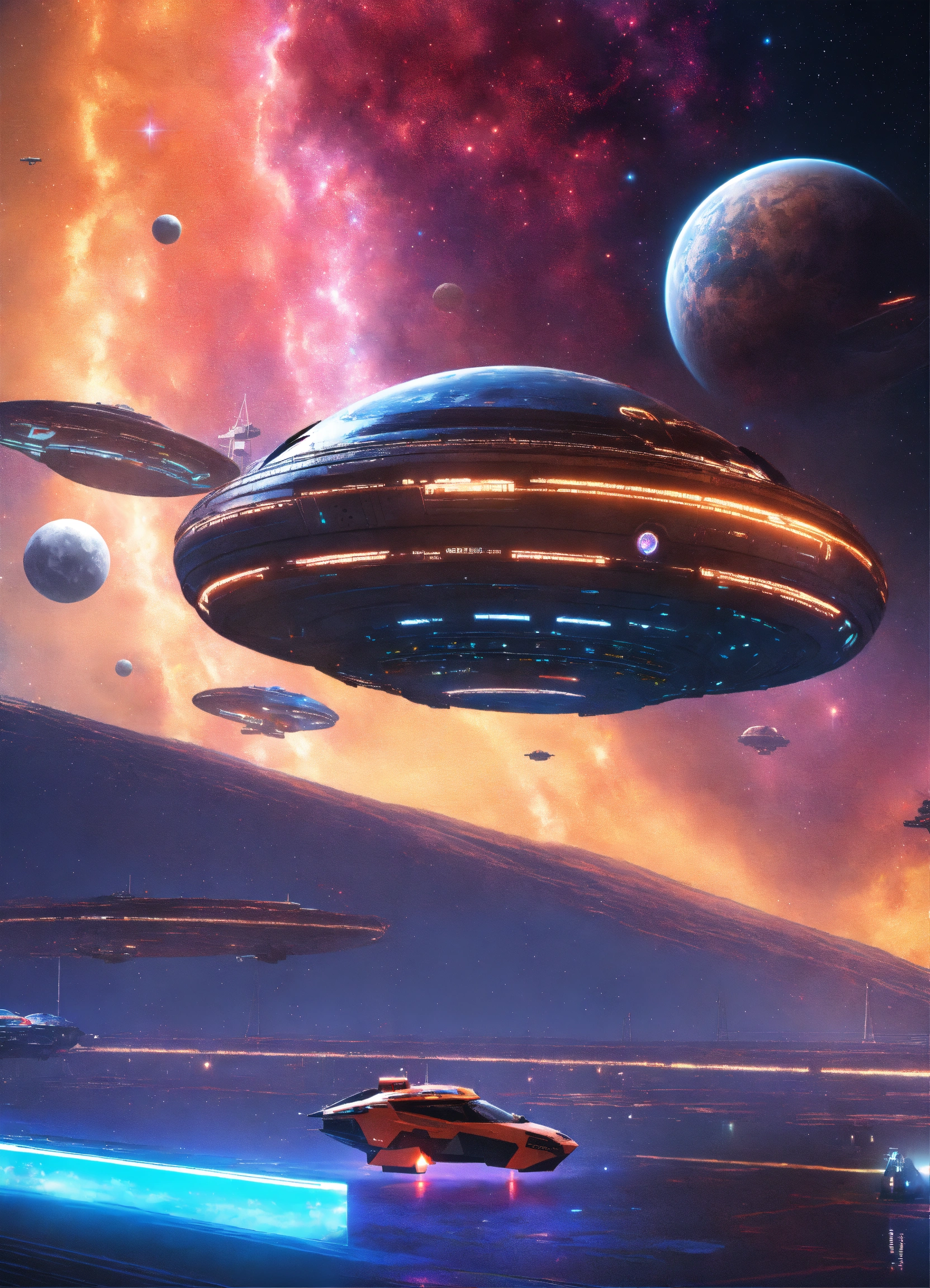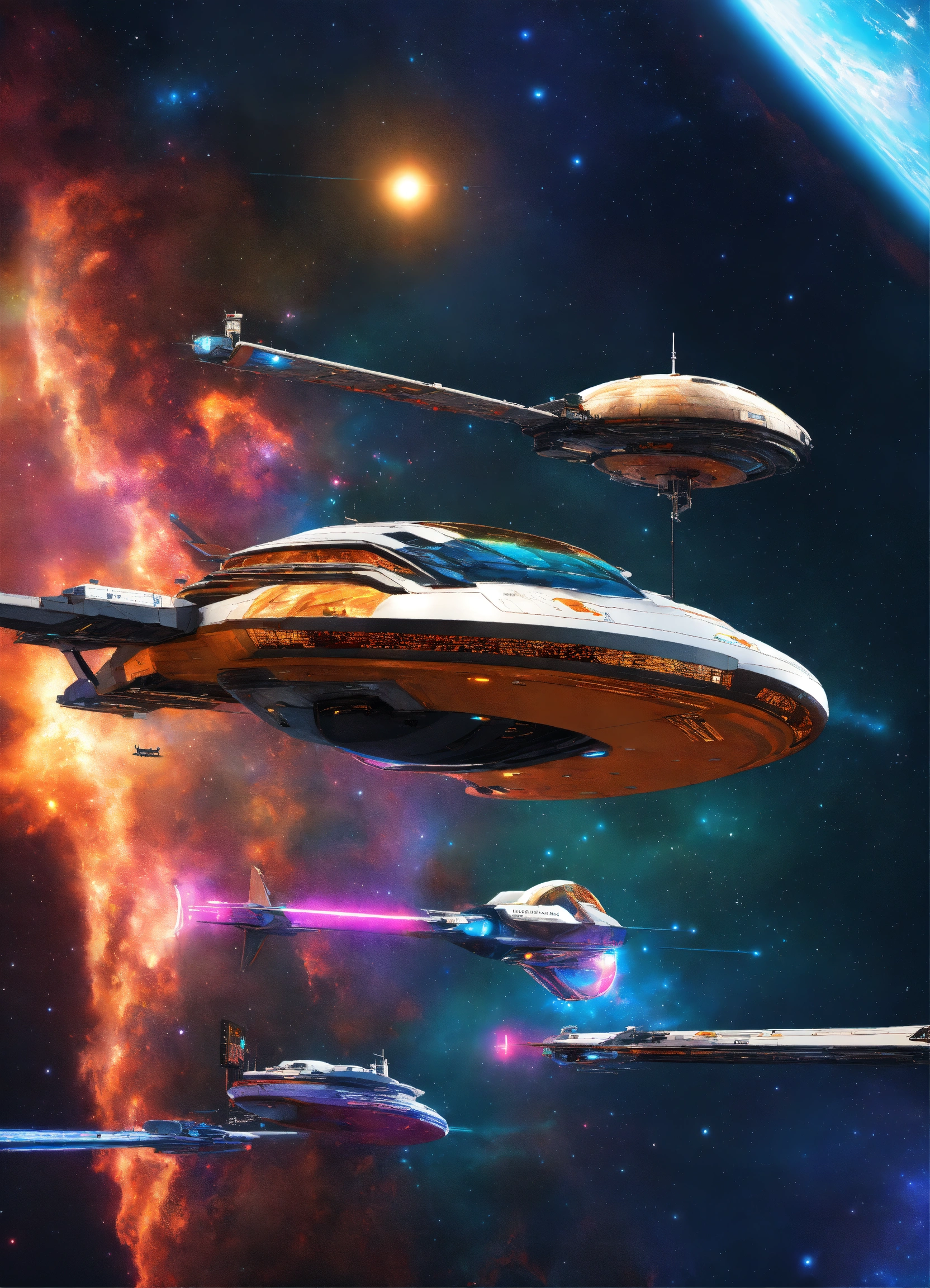 5 sporty space yachts docked on a space port through a colorful star nebula, 9k, futuristic, realistic, sci-fi