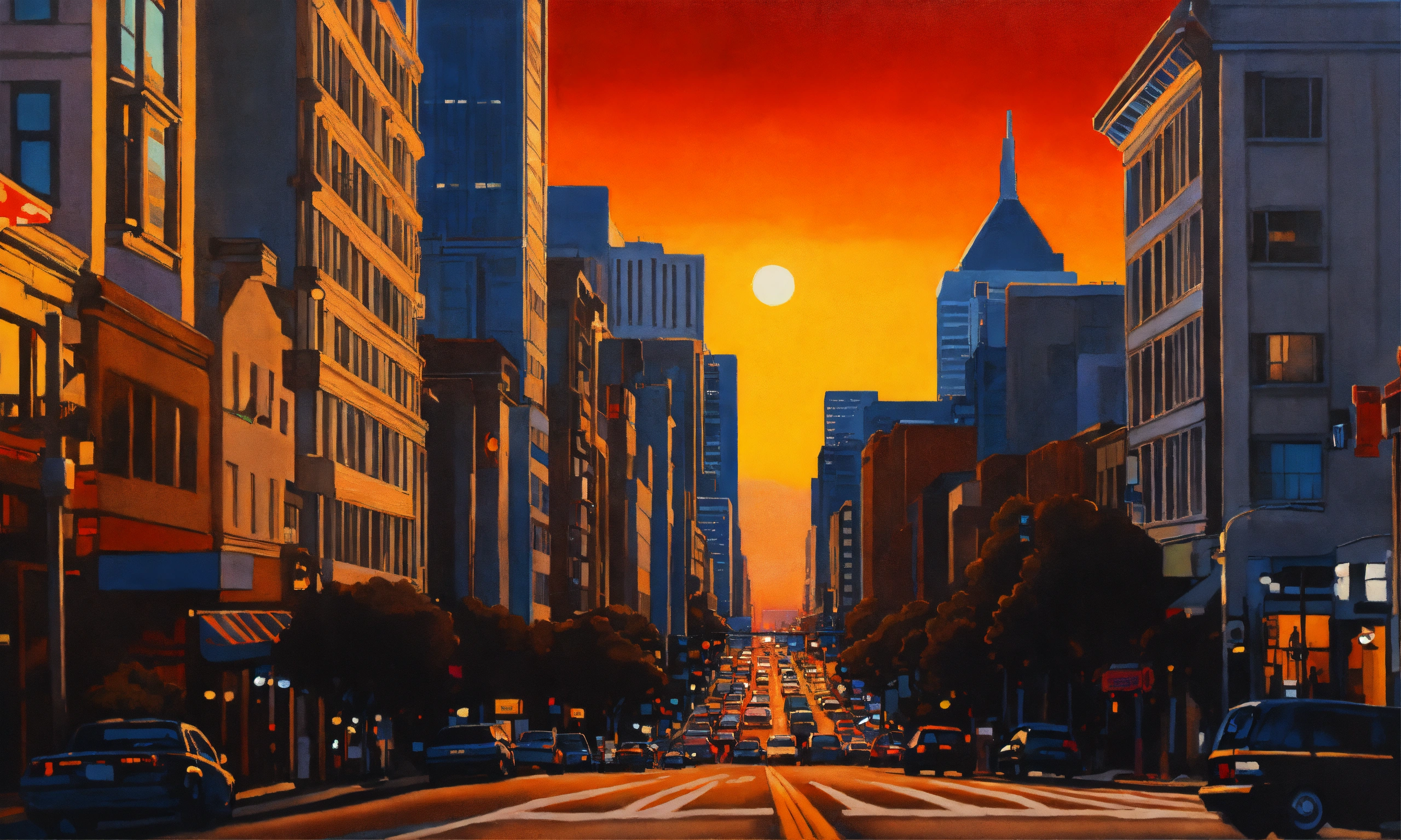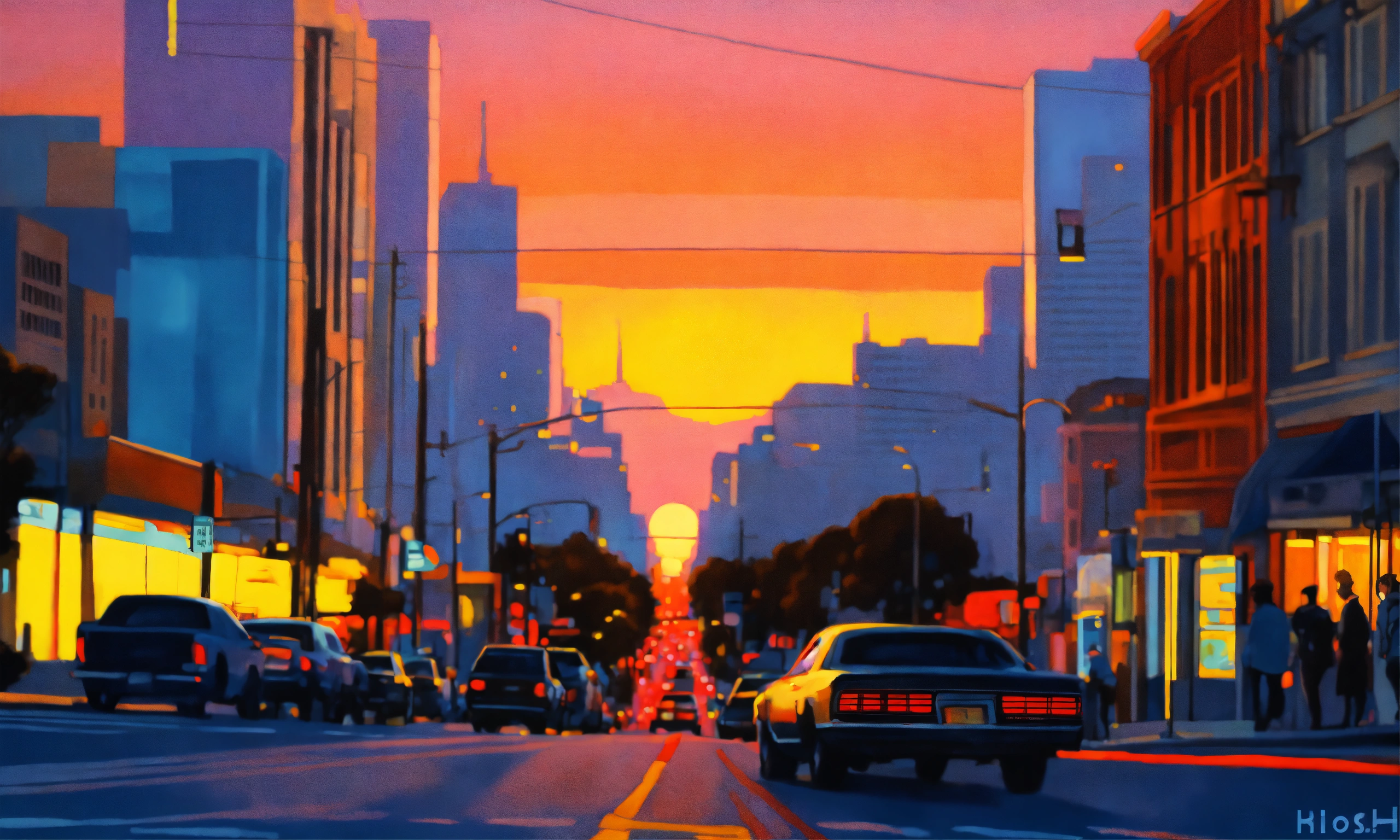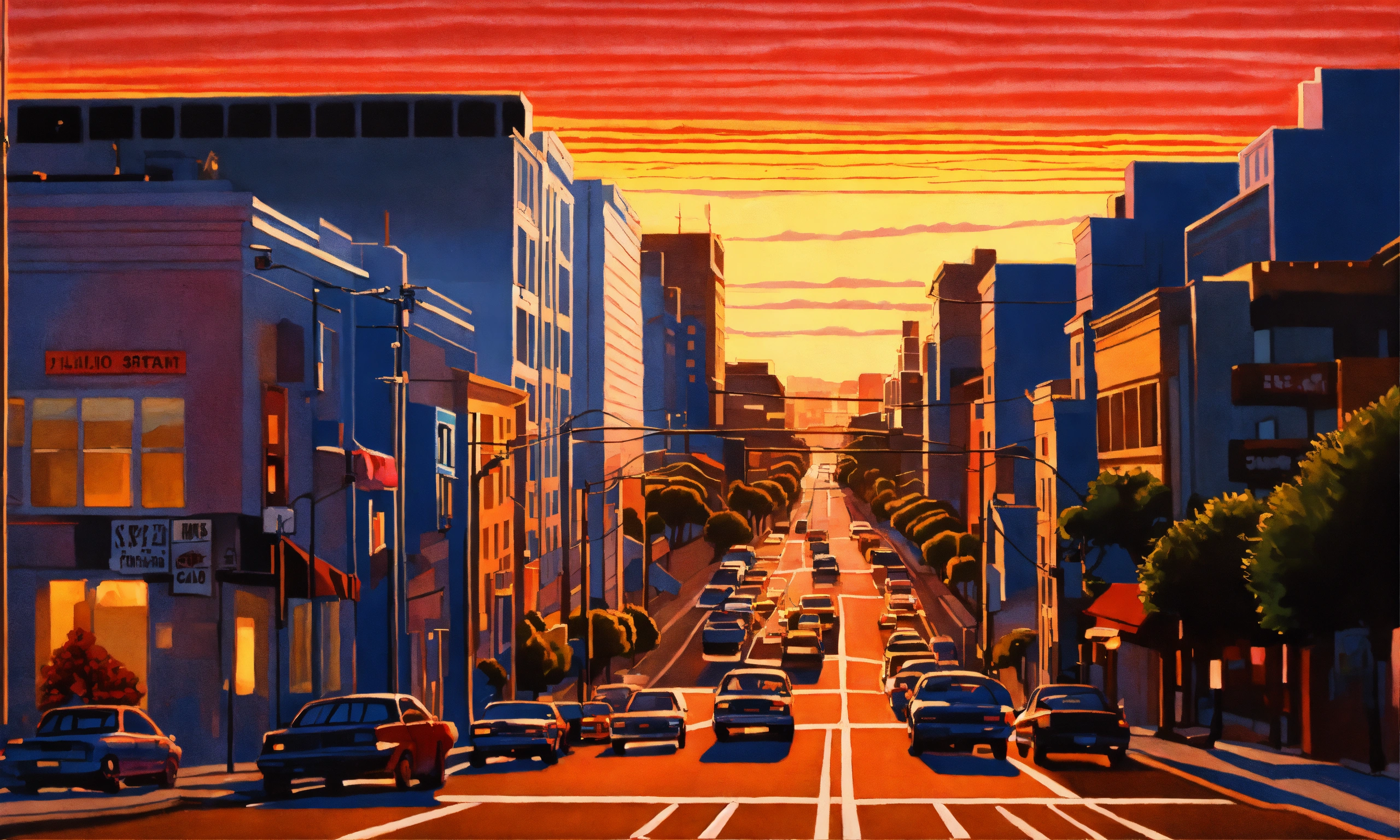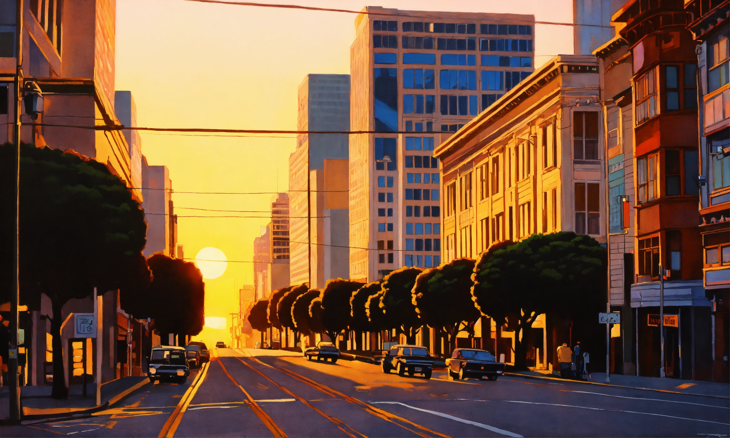 San francisco downtown sunset, california street view, hiroshi nagai art style, air brushed, acrylic painting, lofi artwork