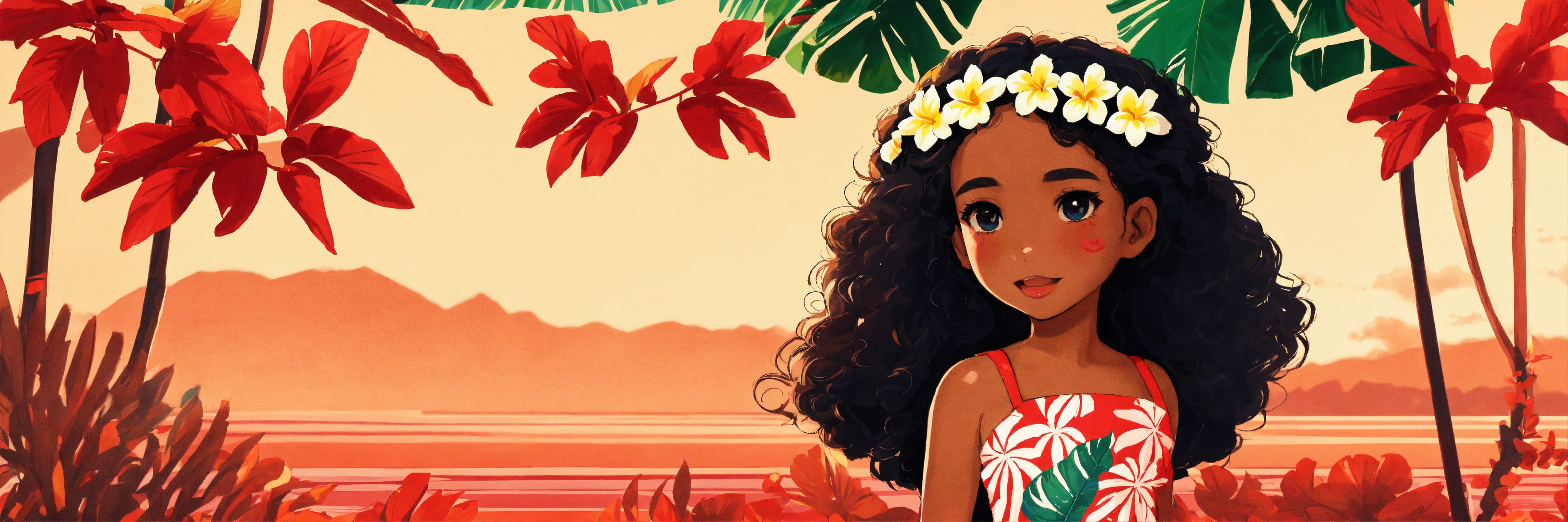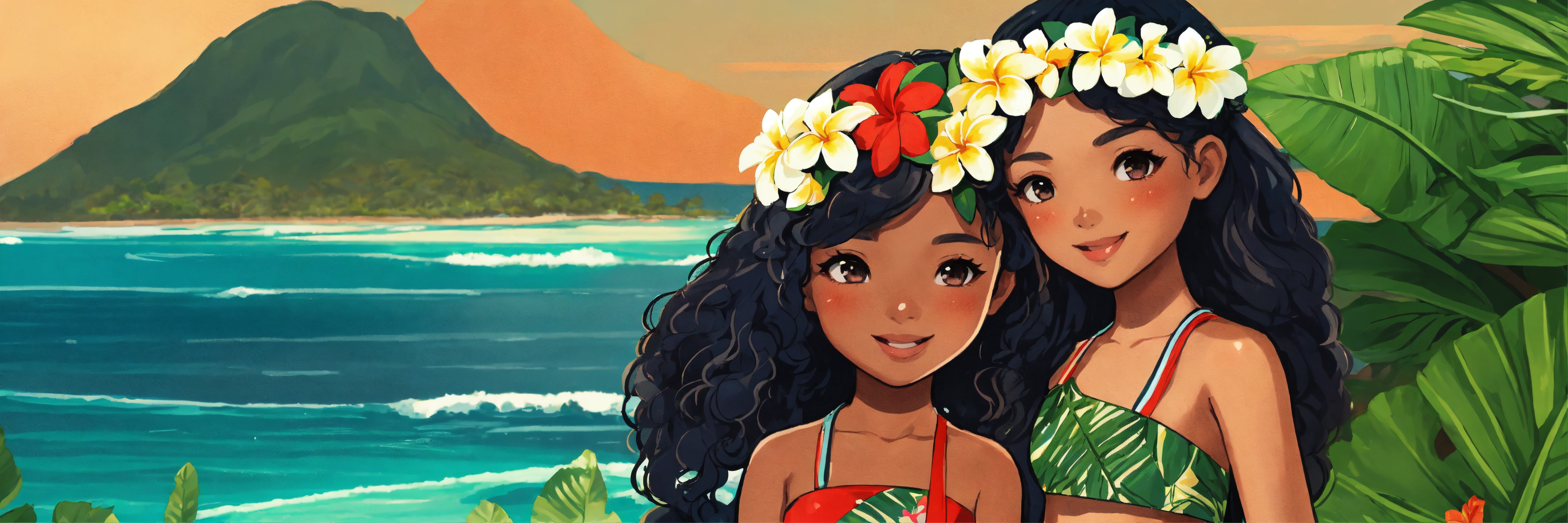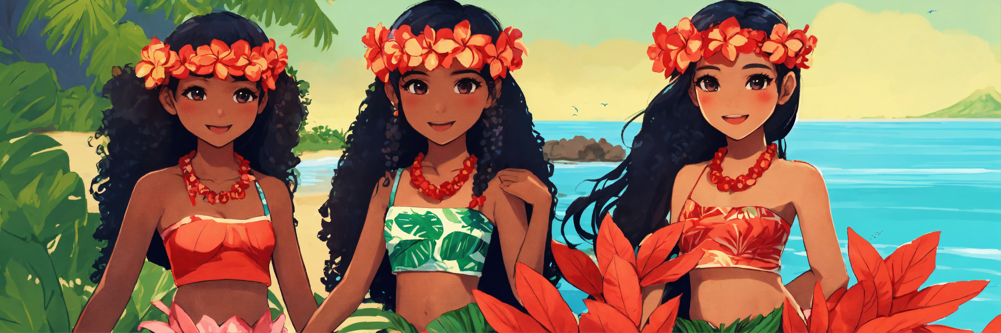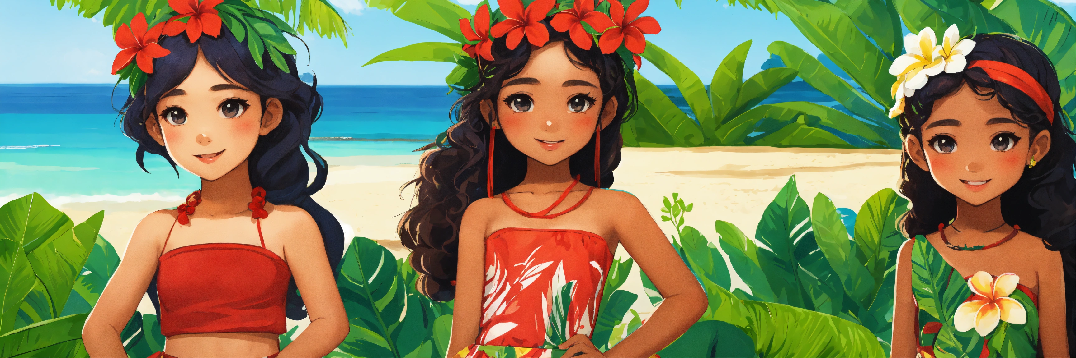 Illustration of three girls, little girls wearing a plumeria headdress on their head, red tube tops and leaf skirts, they are wearing a skirt made of leaves, a mischievous look, the background is hawaii sea, black hair, 4k, 8k, asian beauty, moani, die-cut sticker