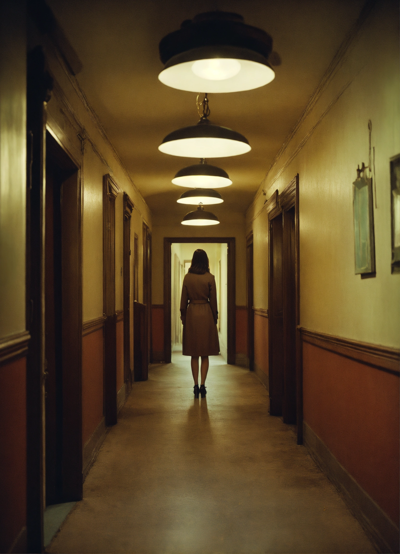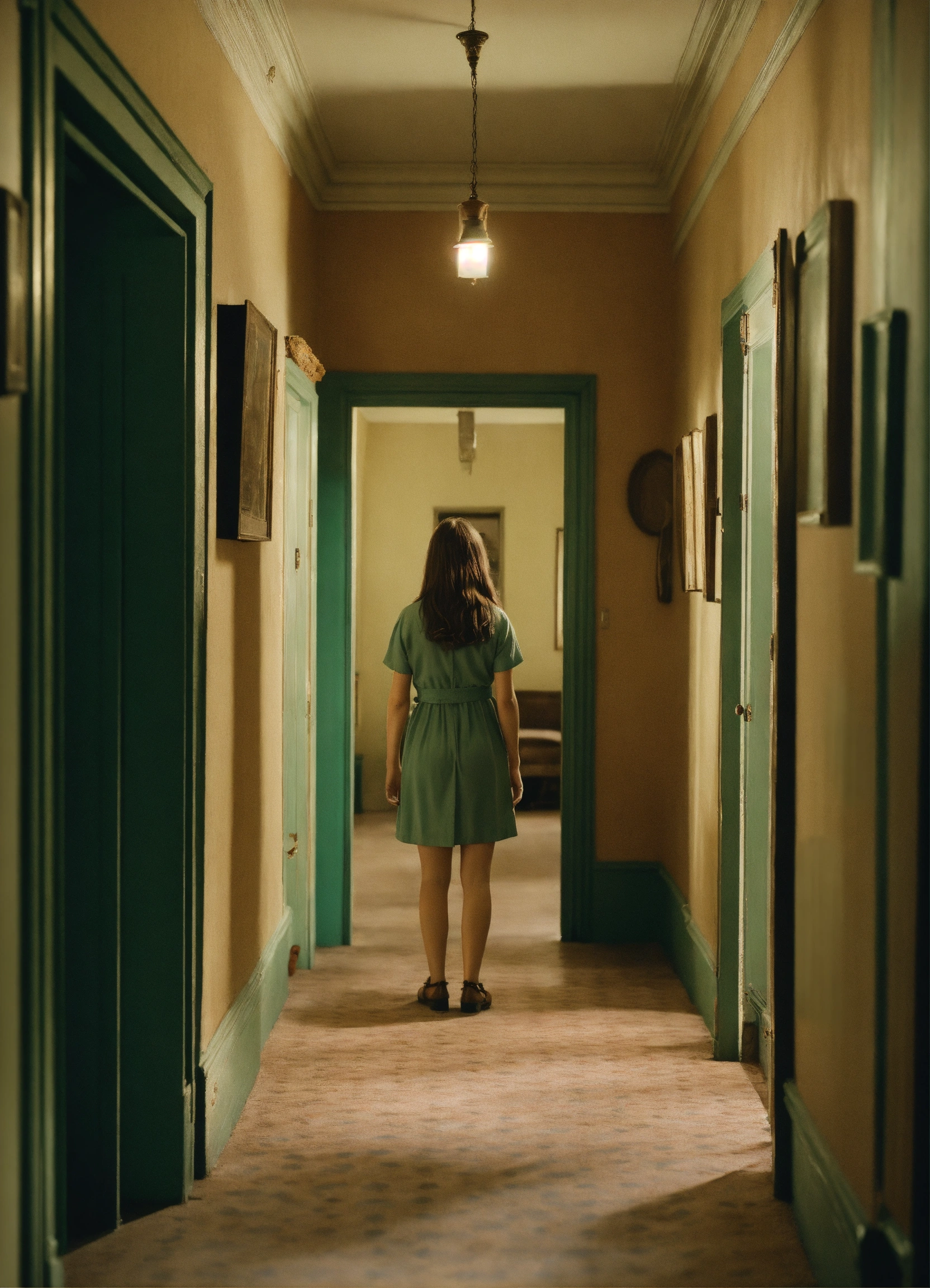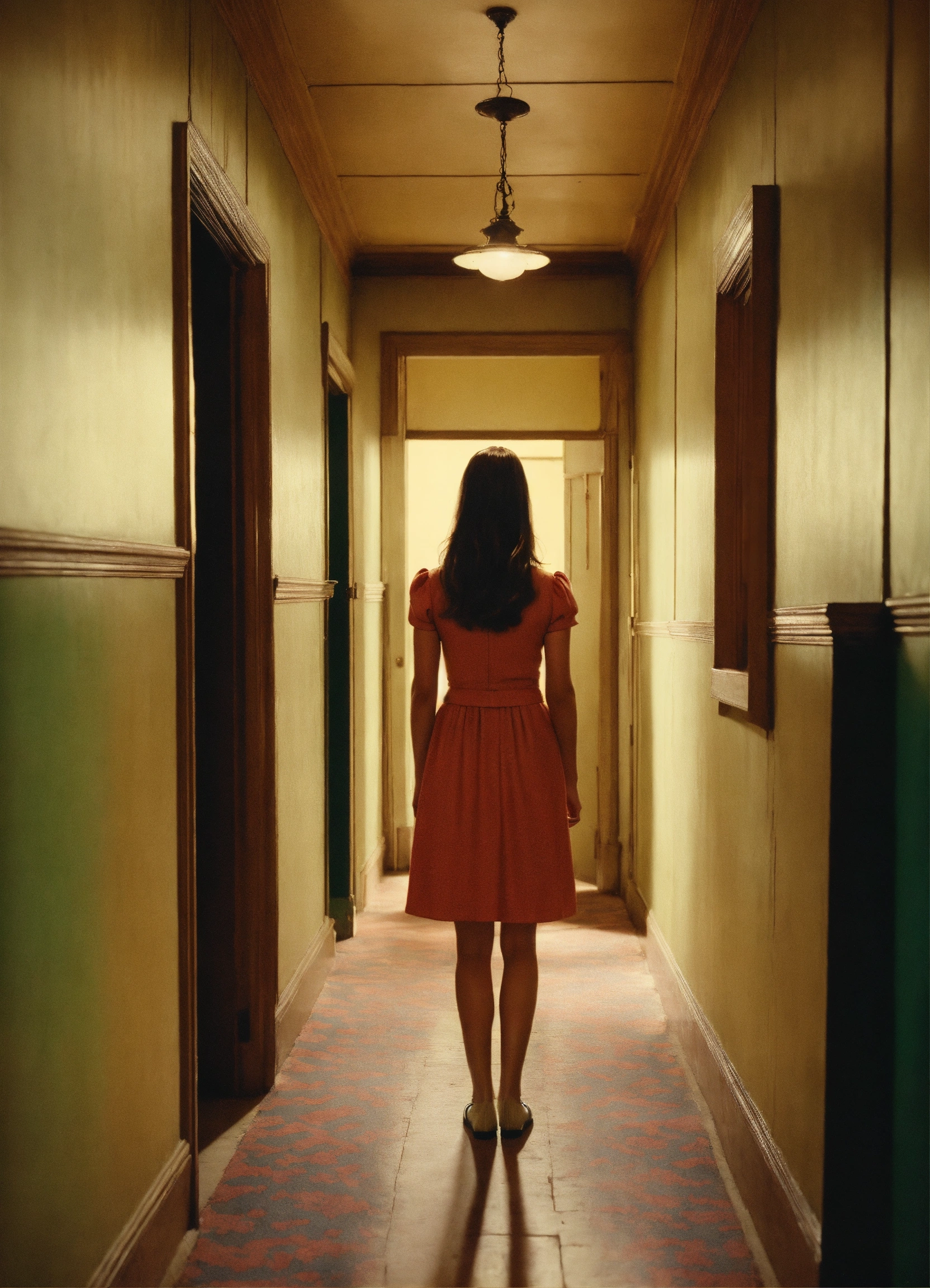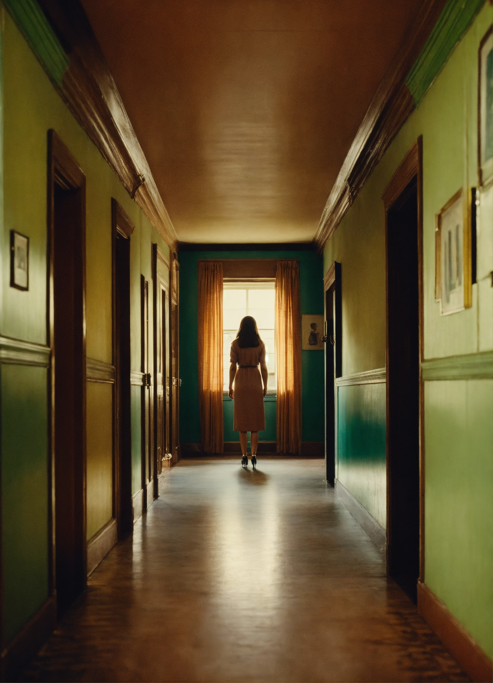 A vintage photograph of a creepy hallway with a woman with long brown hair standing, rear view, wes anderson colour grading, gregory crewdson composition