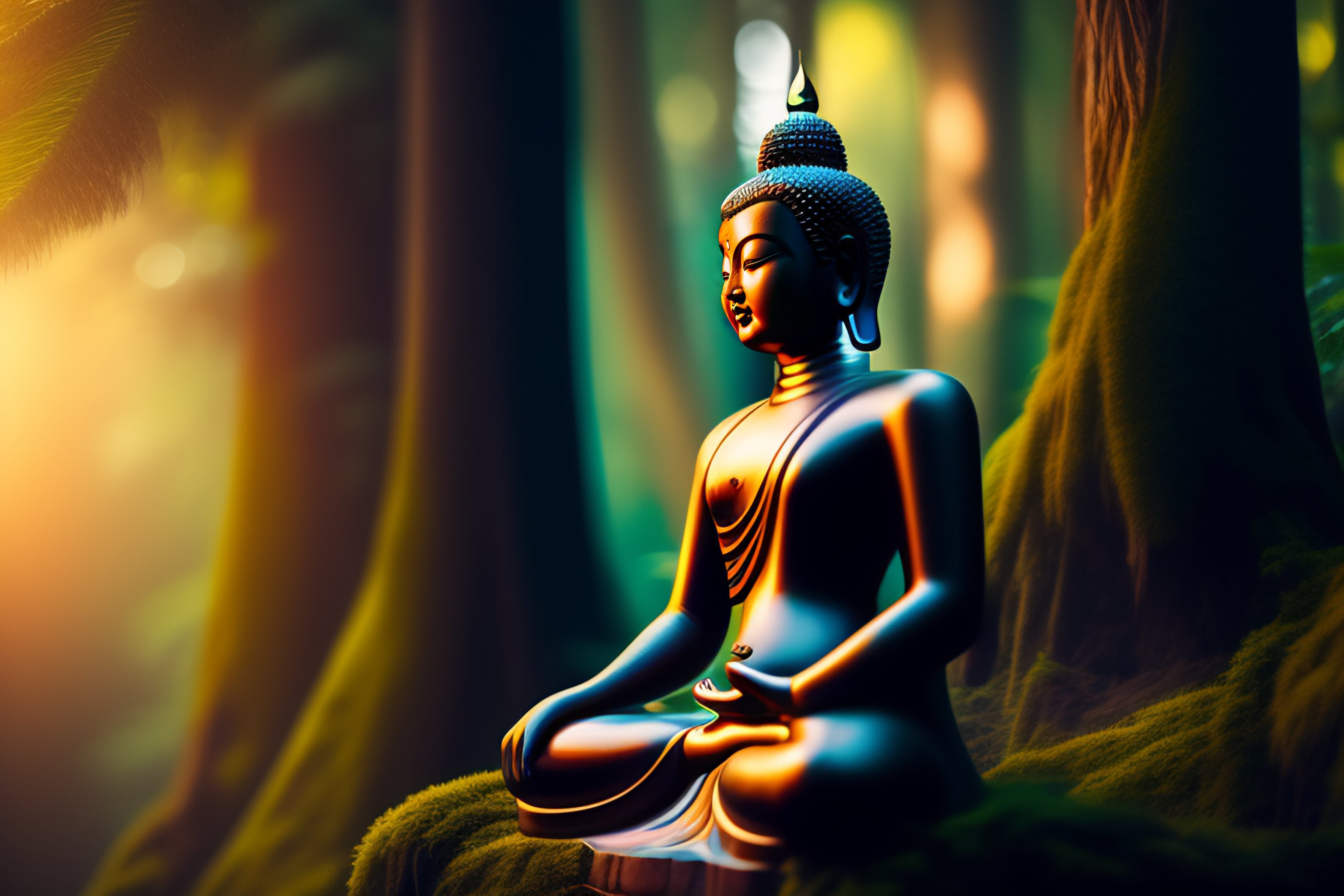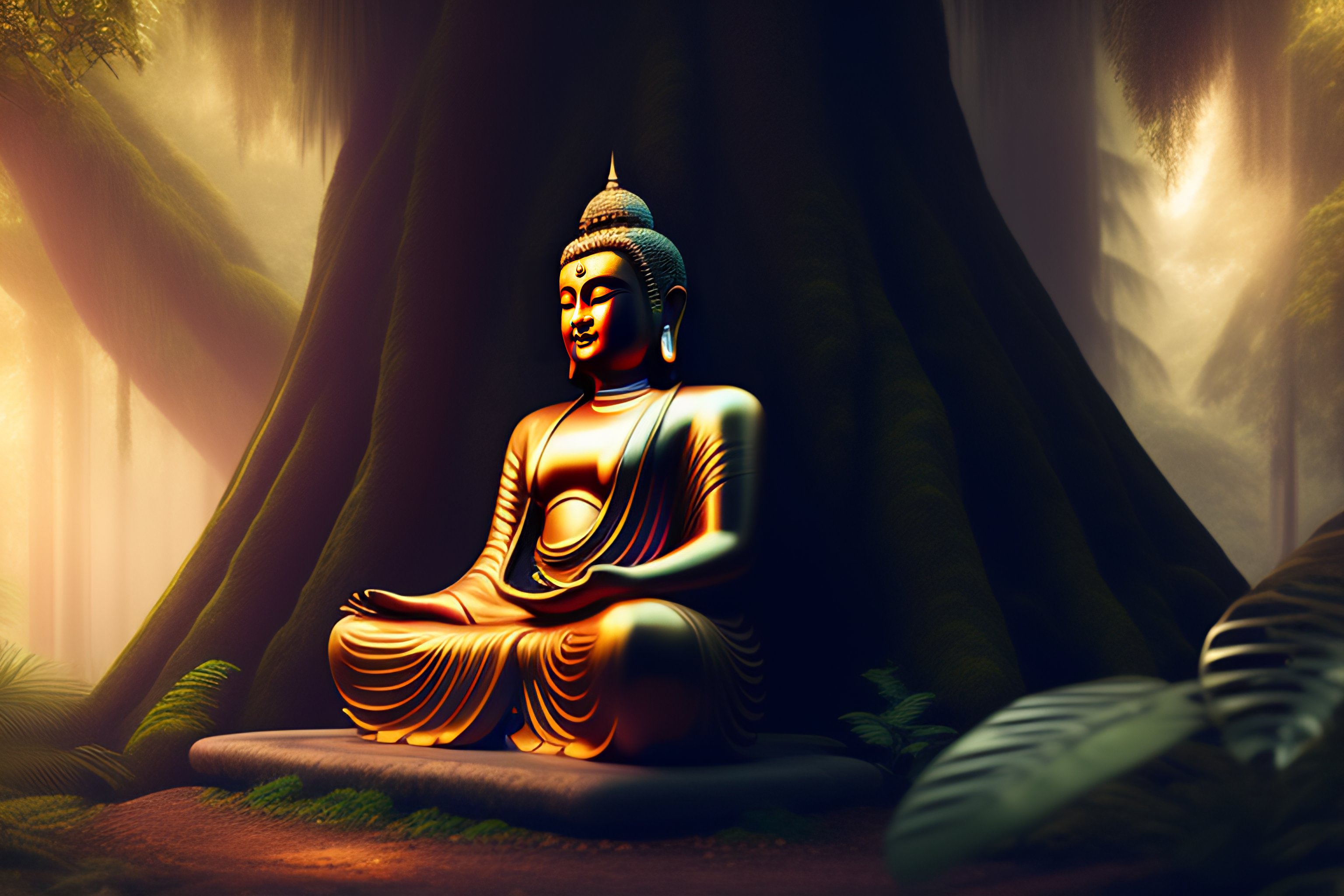 Friendly human-like buddha meditating in a tropical forest, soft lighting, 8k, peaceful, ultra detail