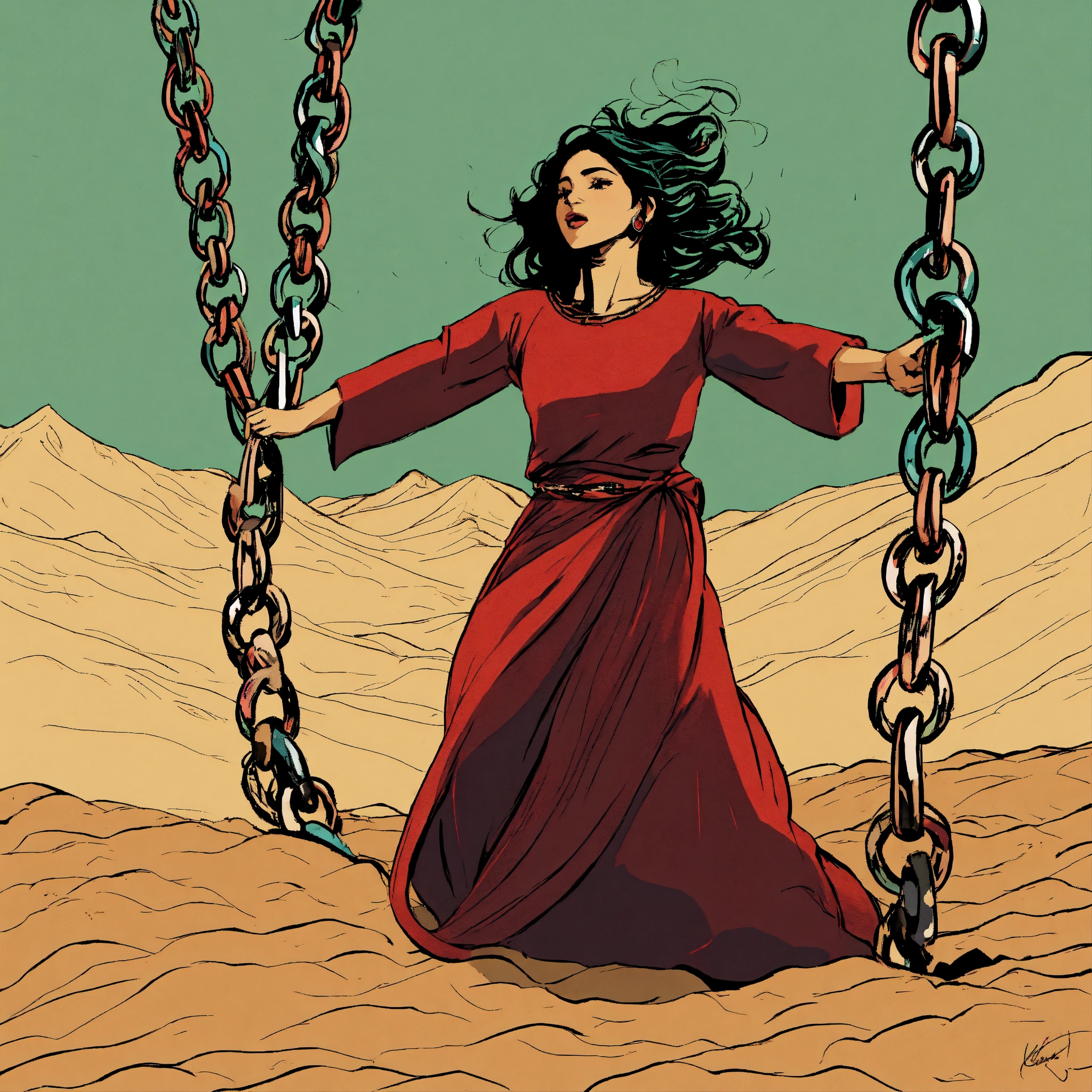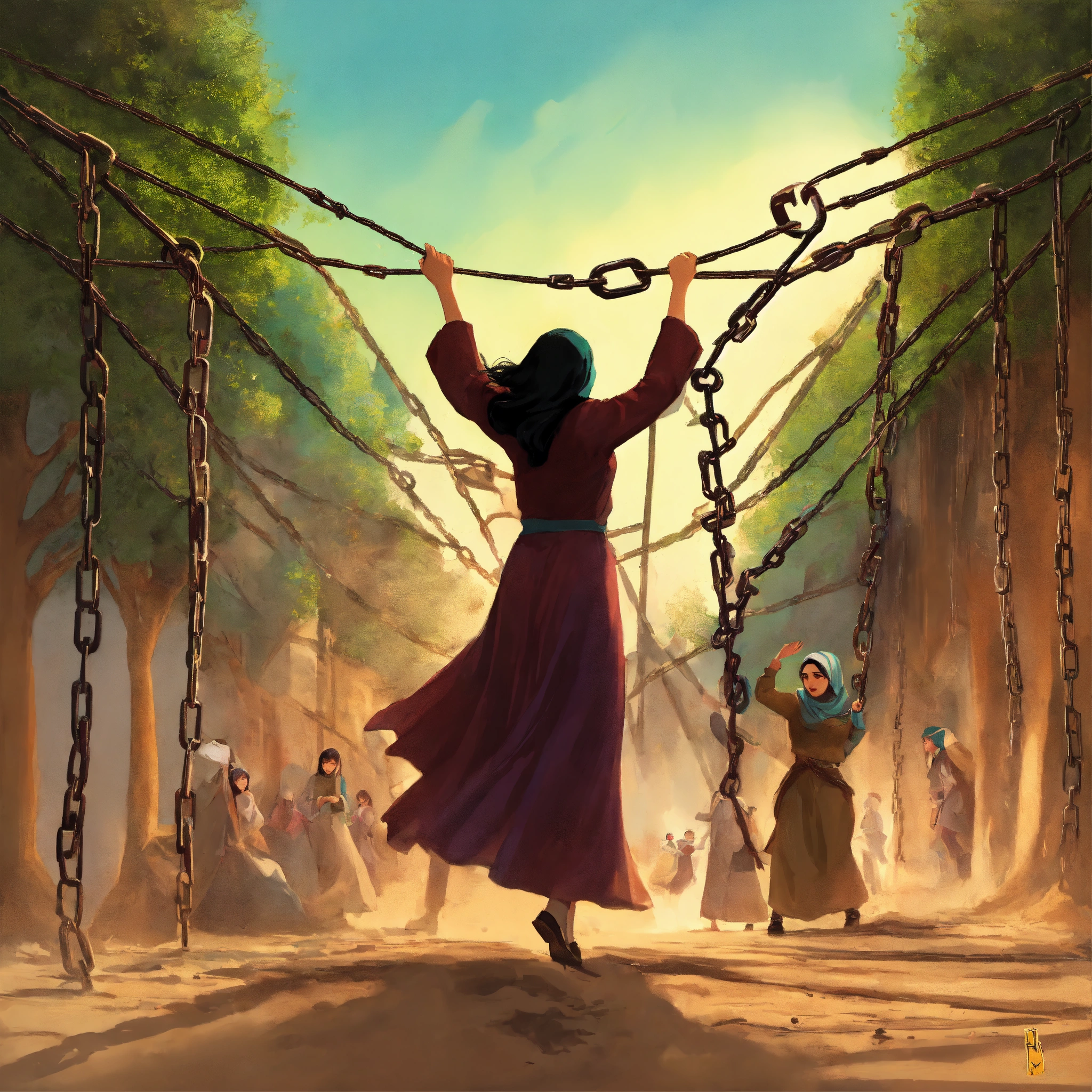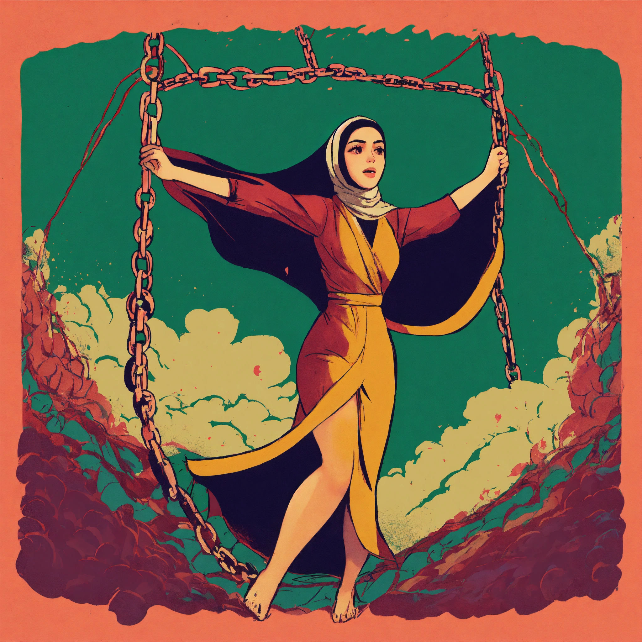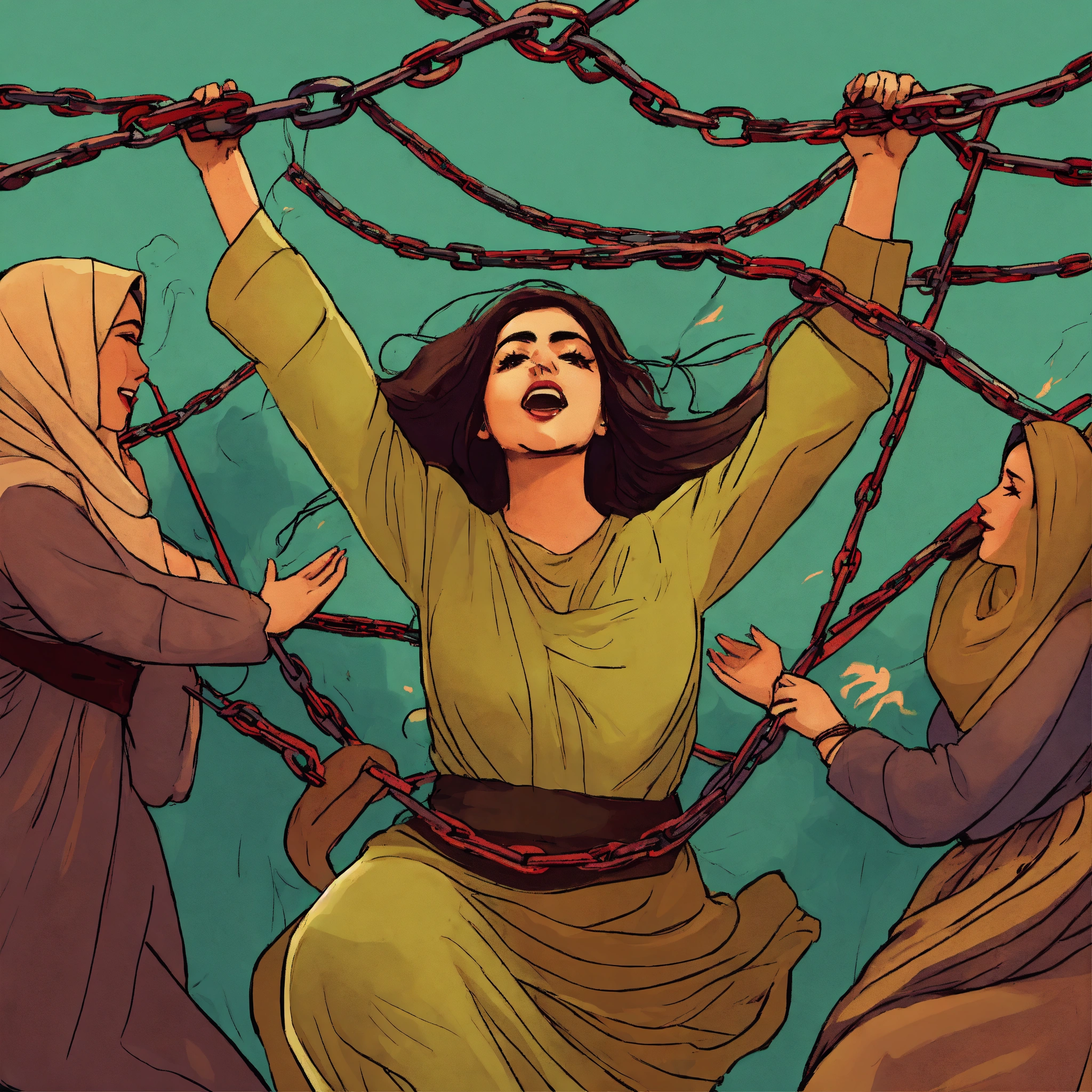 An illustration depicting iranian women breaking free from chains, symbolizing their liberation, iranian government is evil, tale, freedom for women