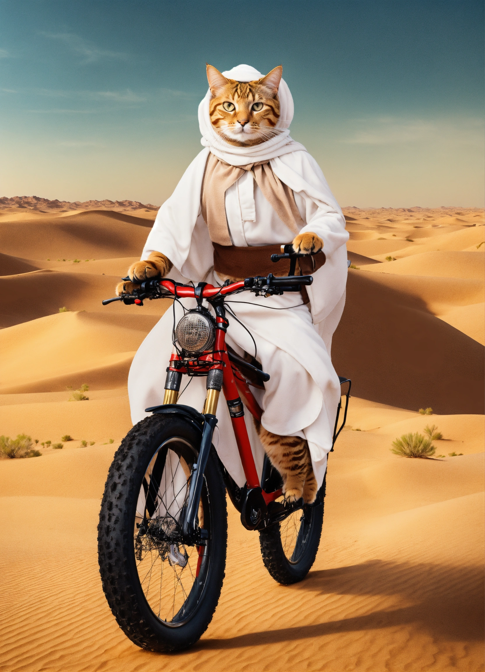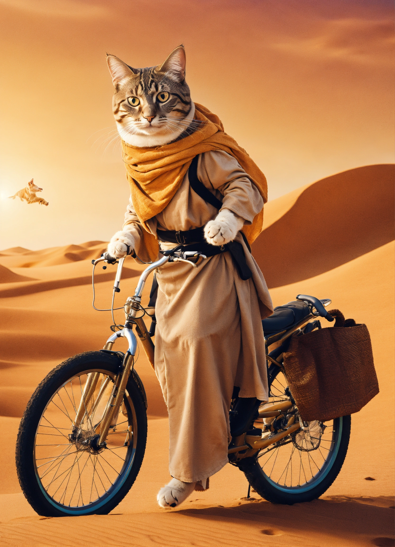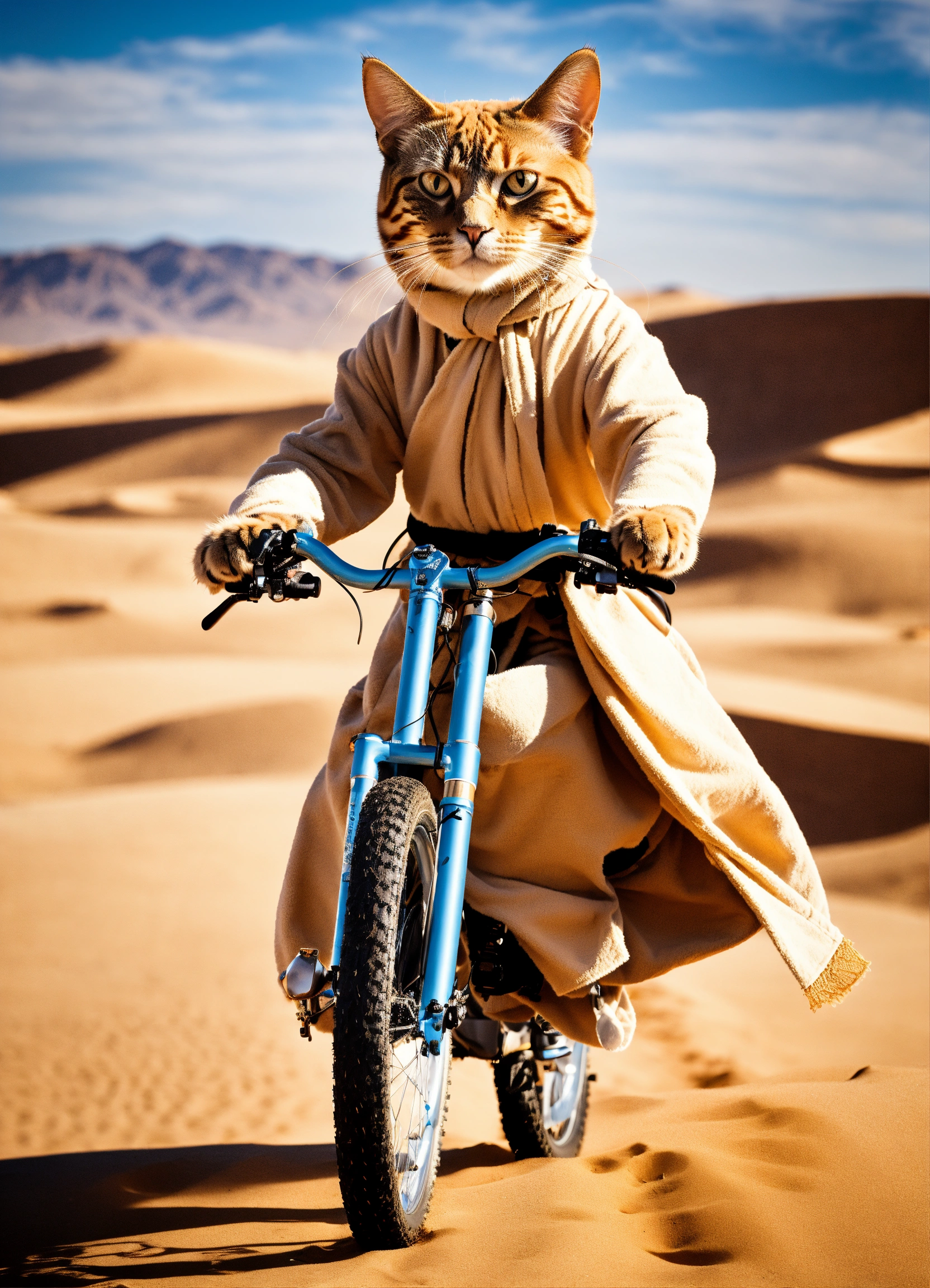 Create an image of a cat biking through a desert with a desert explorer costume. the cat is dressed as lawrence of arabia, complete with a robe and a headscarf.