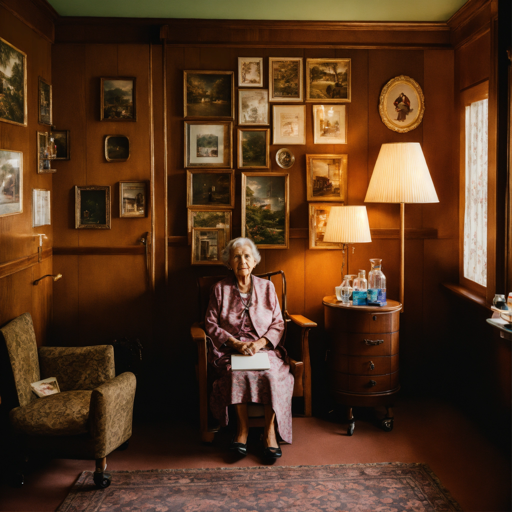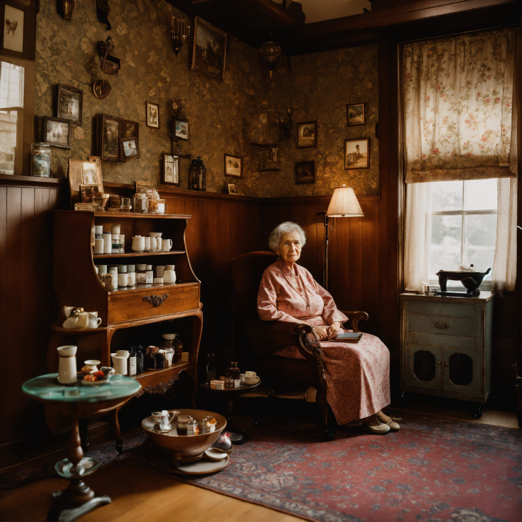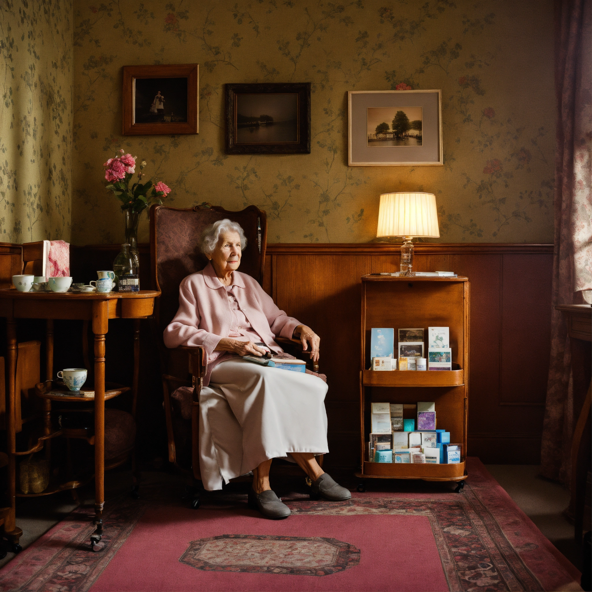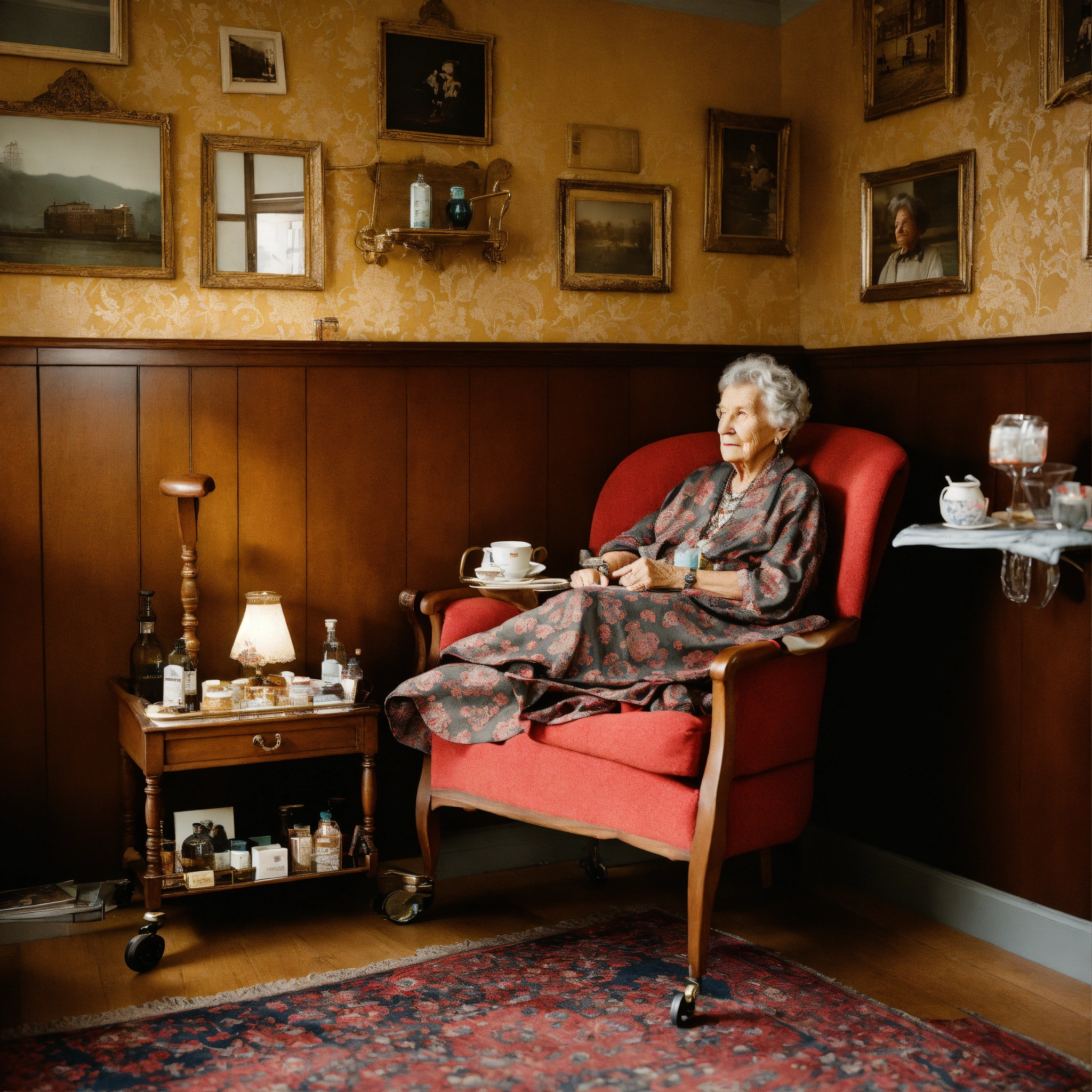A photograph of an elderly woman sitting in an armchair with a trolley next to it with medications on top, behind the chair and slightly to the right is a wooden wall unit with photo albums on the lower level and a glass cabinet containing special cups on saucers, damask wallpaper, in the dank style of gregory crewdson