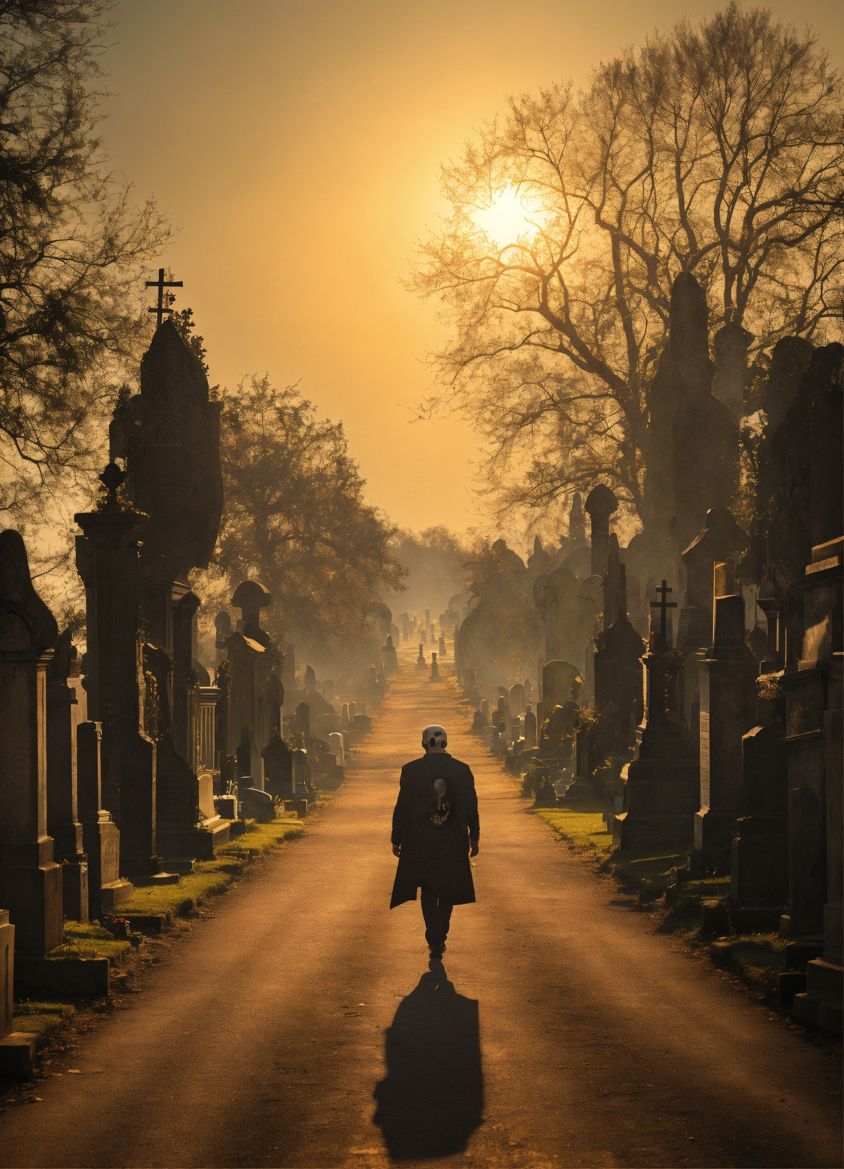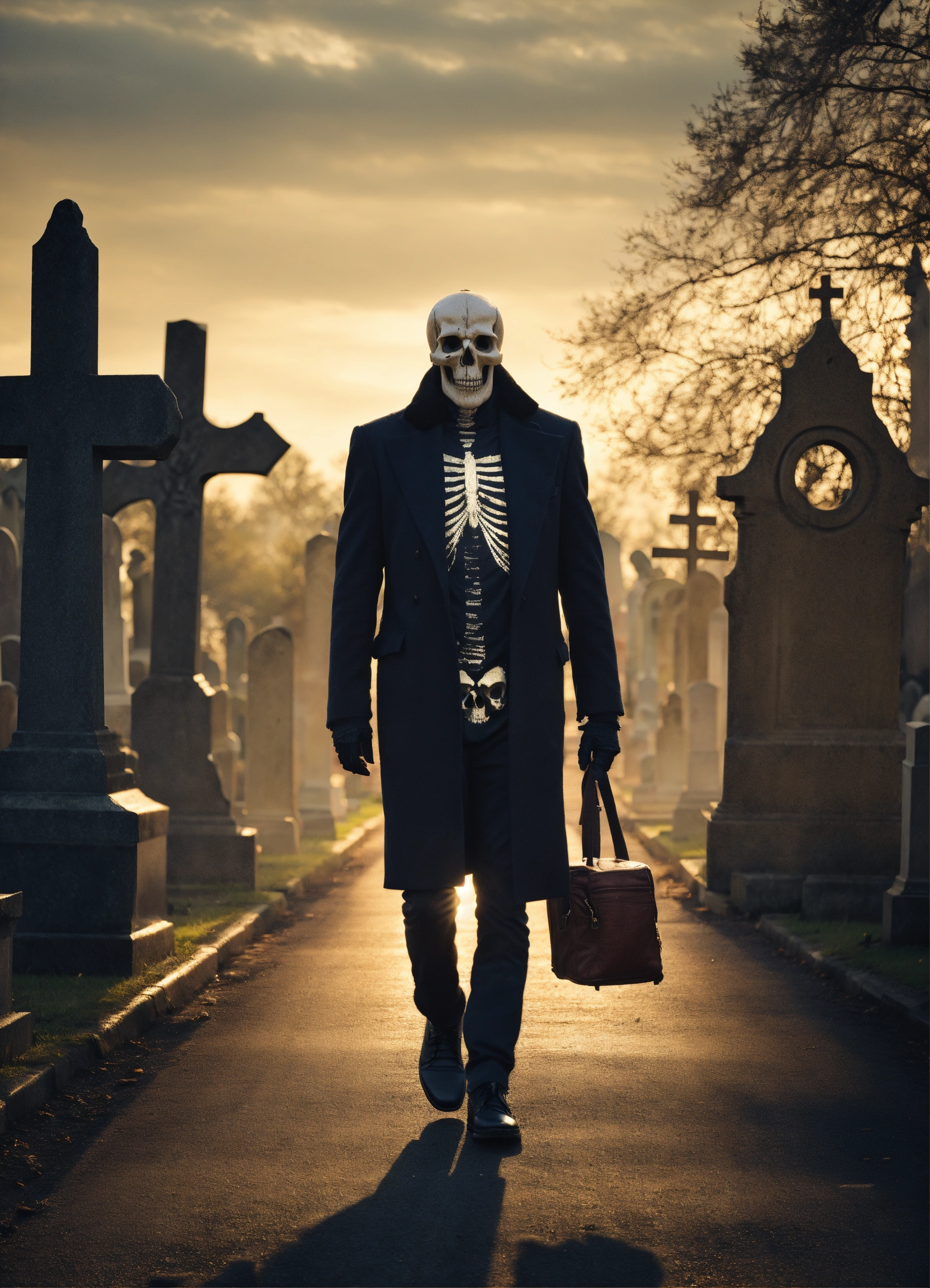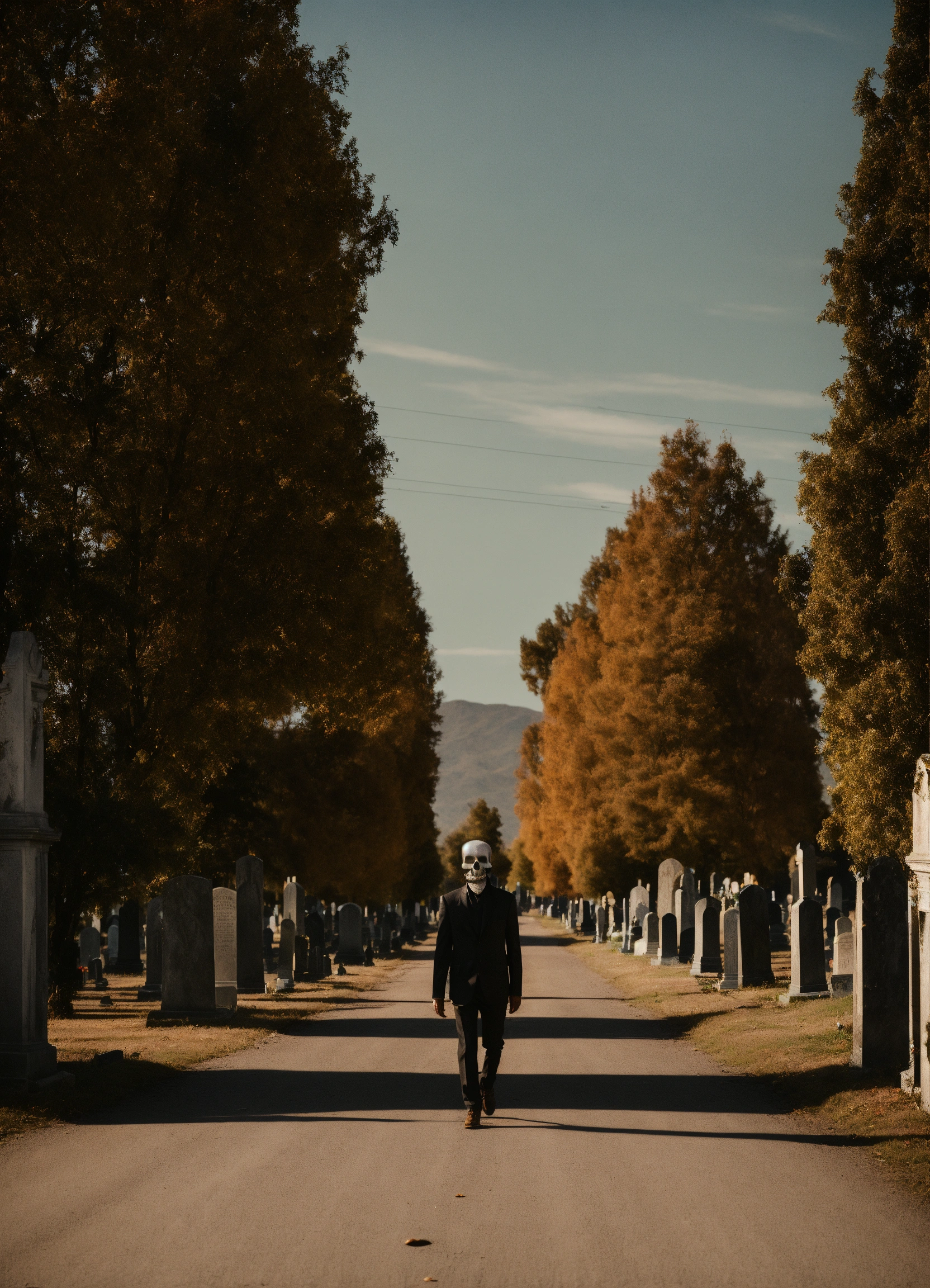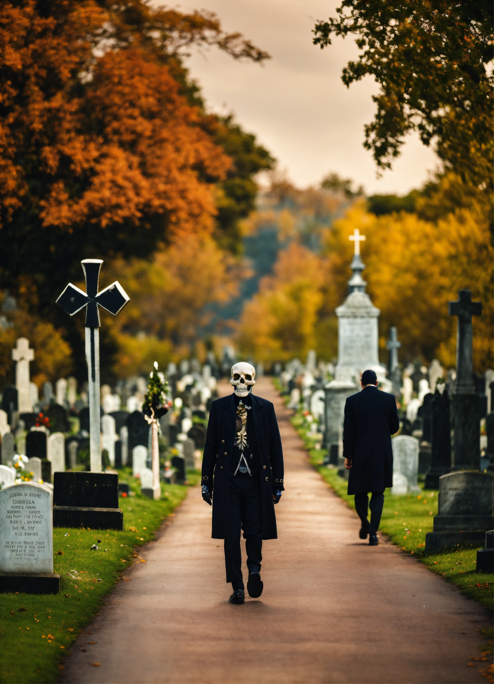 A skull man walking on a road in the cemetery