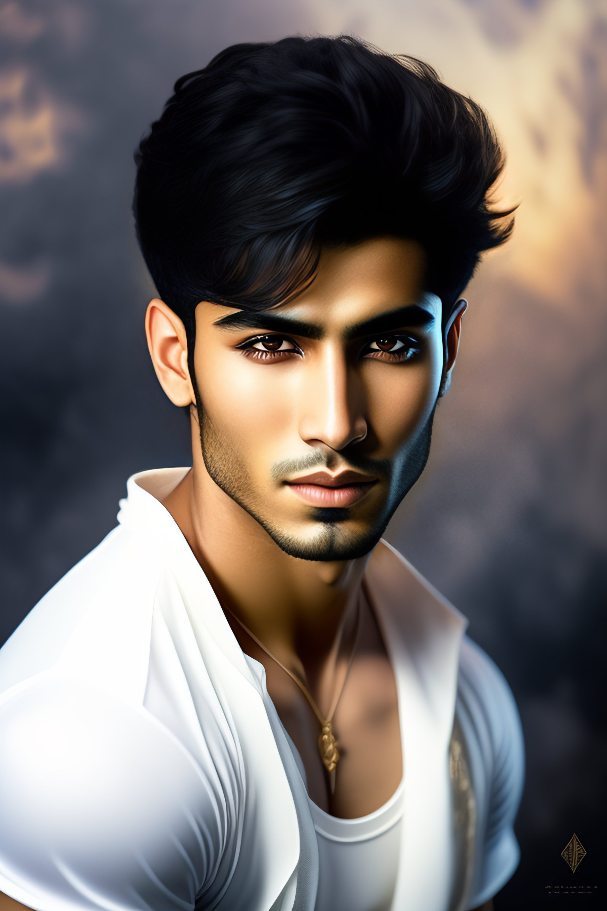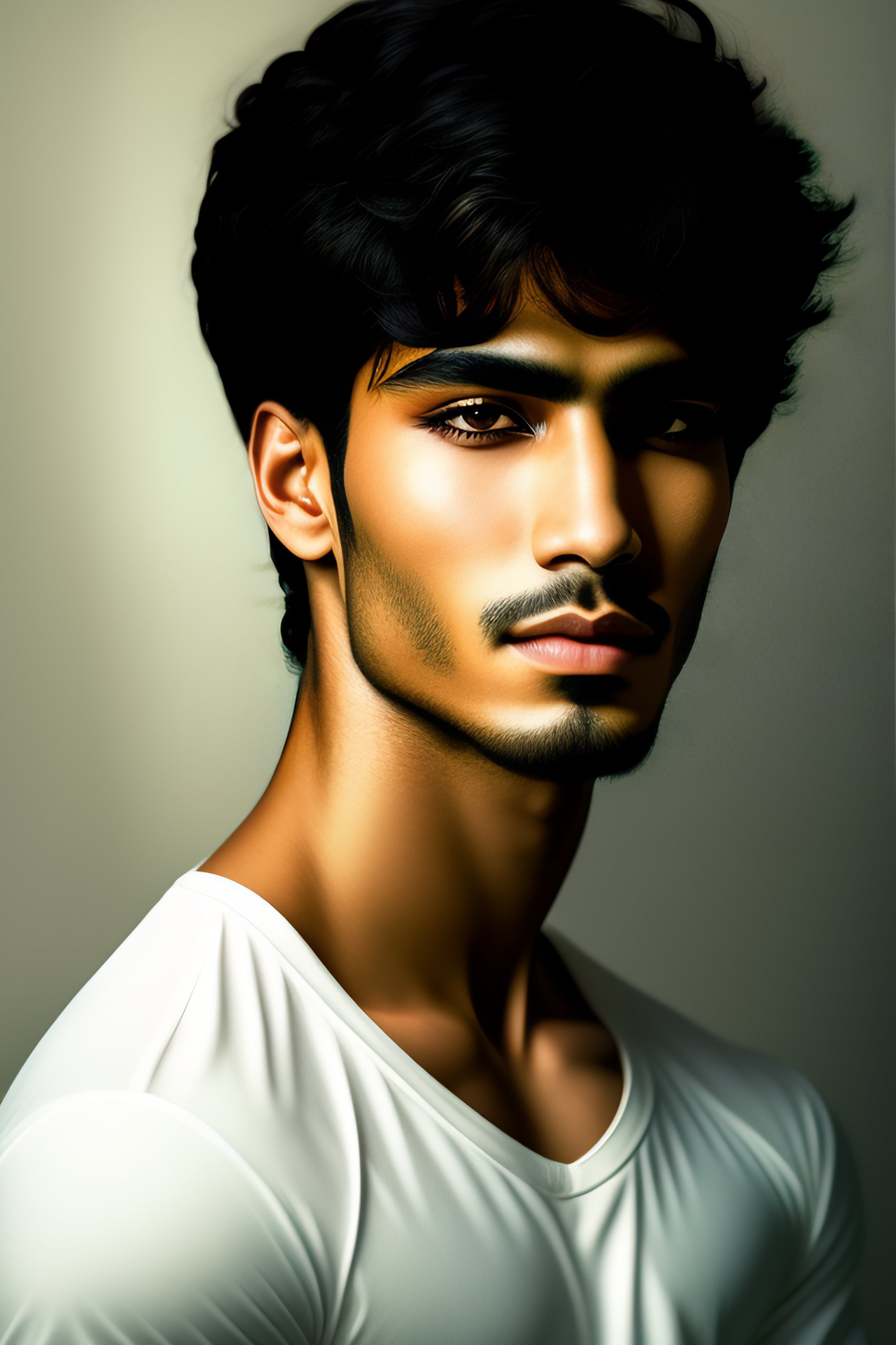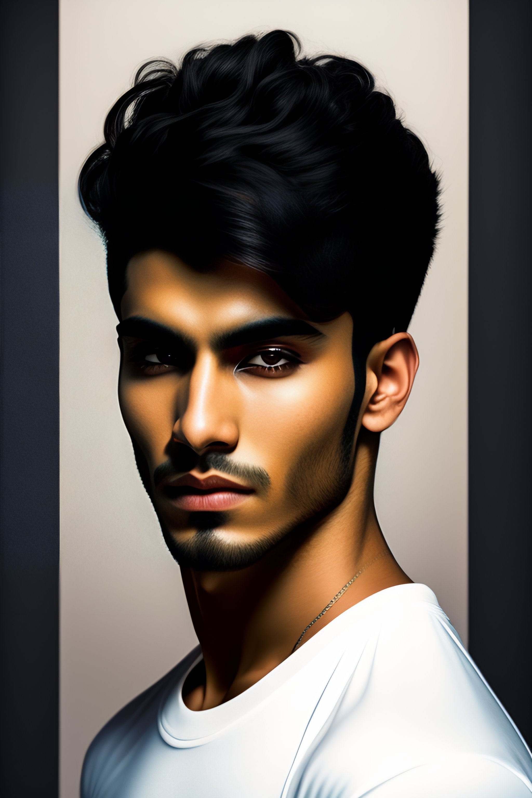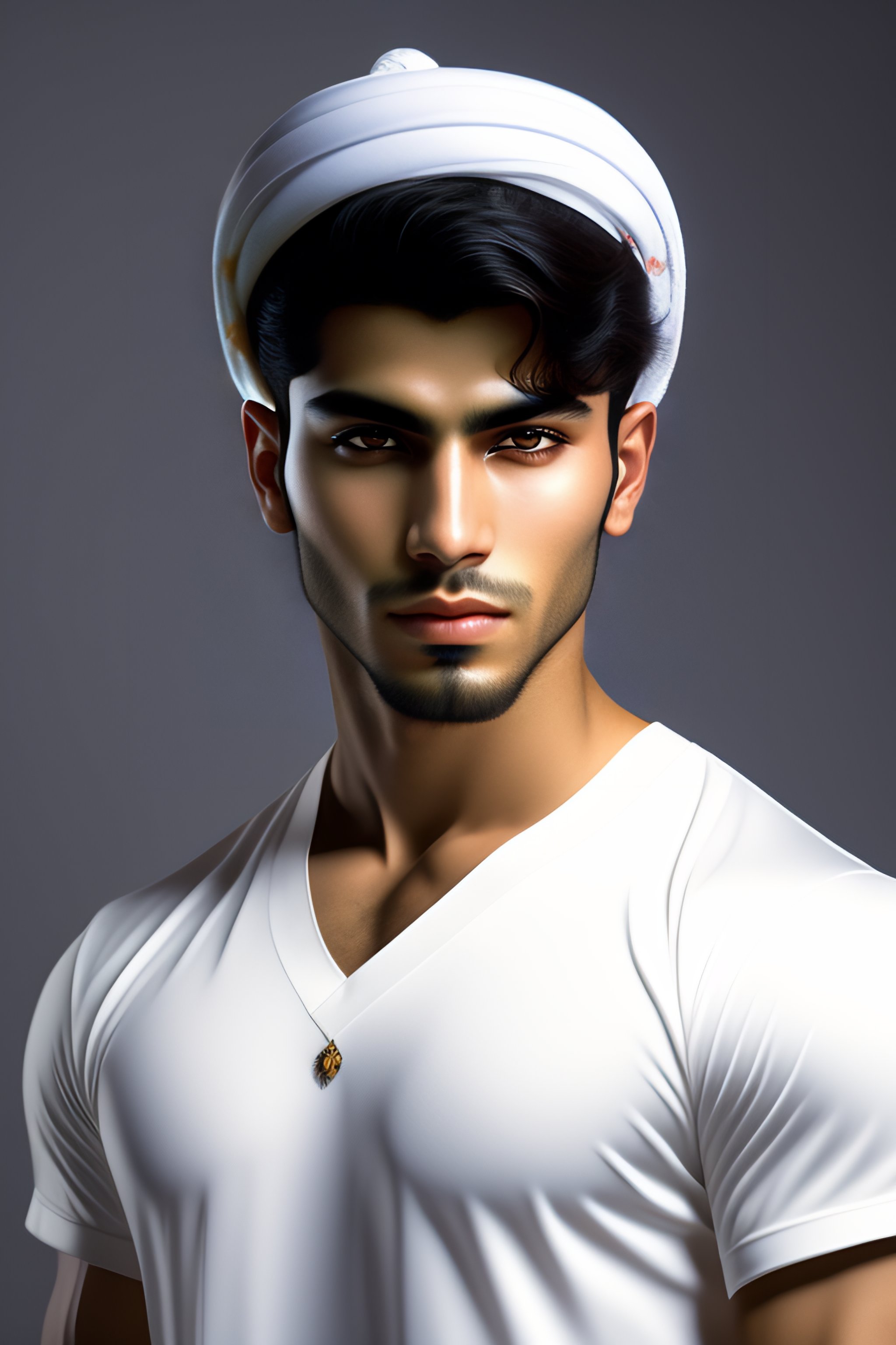 Beautiful medium shot portrait of a young arabic man inspired by ayami kojima with short hair dressed with a white t - shirt looking into the camera from three - quarters, white background white bank studio light, art by yoshitaka amano, alfons mucha, final fantasy, high quality, 8 k