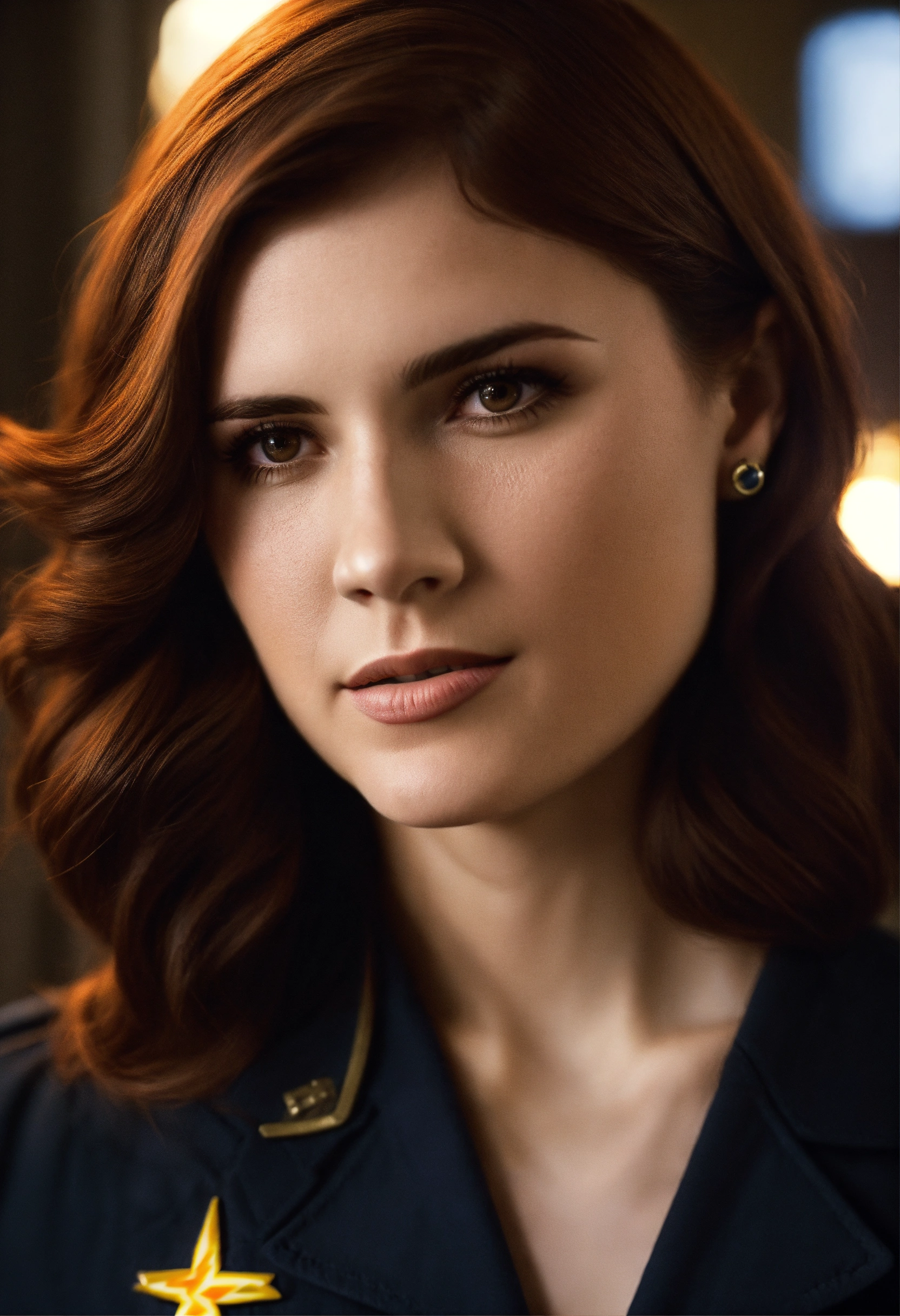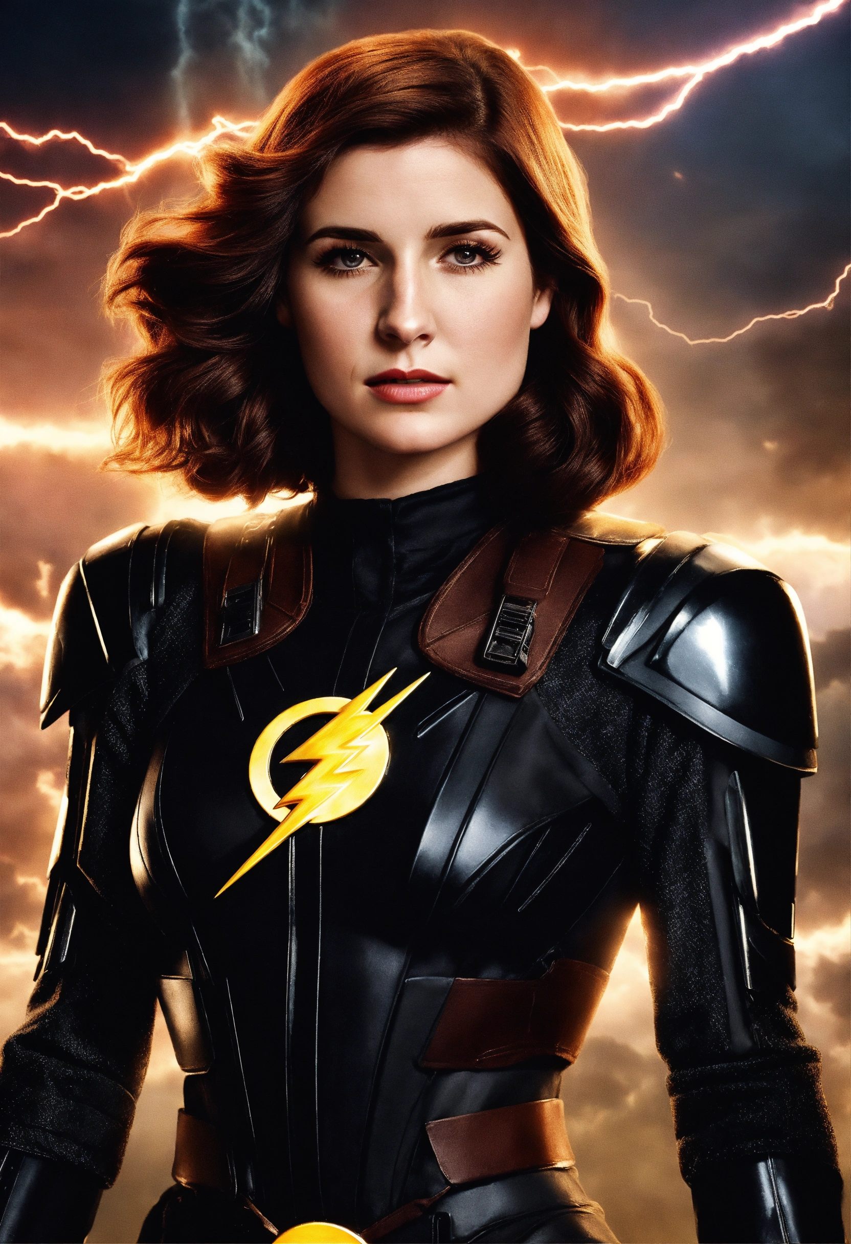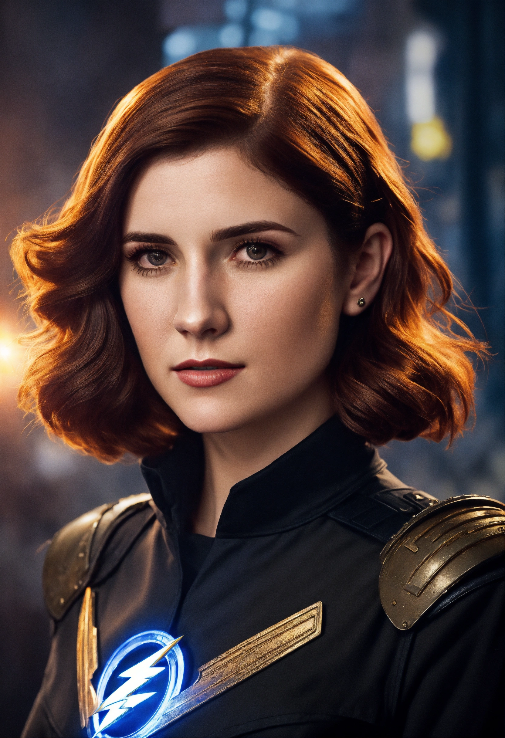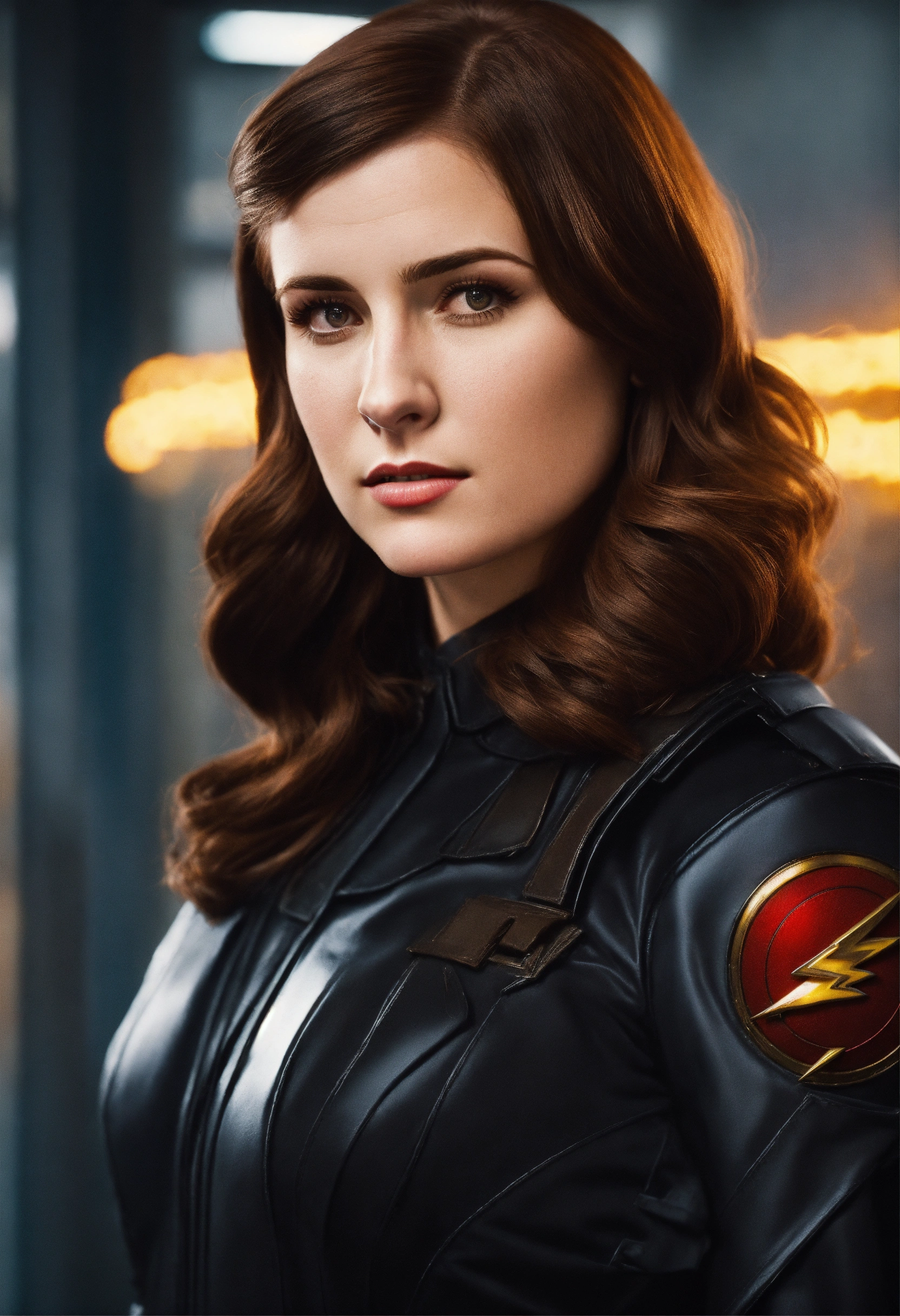 Aya cash with dark brown hair in a 1940s hair style, she is wearing a black uniform reminiscent of wwii germany but with futuristic hardened sci-fi battle armor, the flash's lightning bolt symbol is on her chest