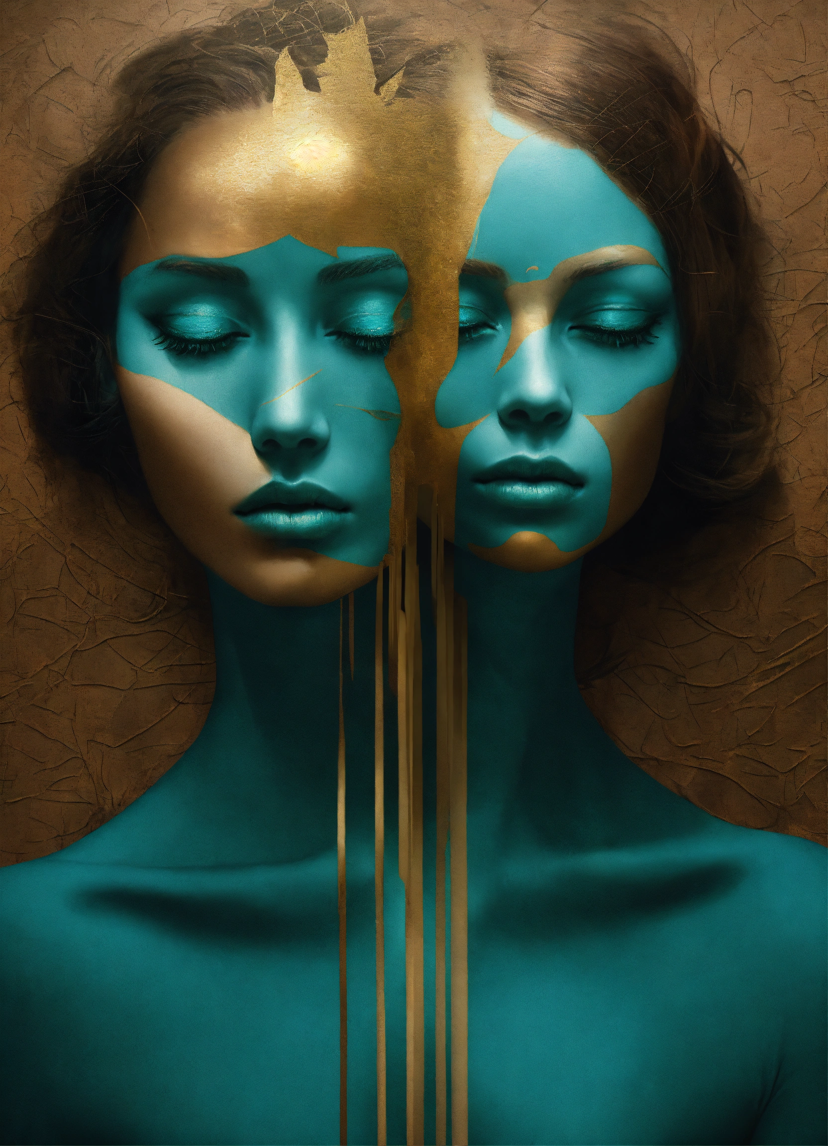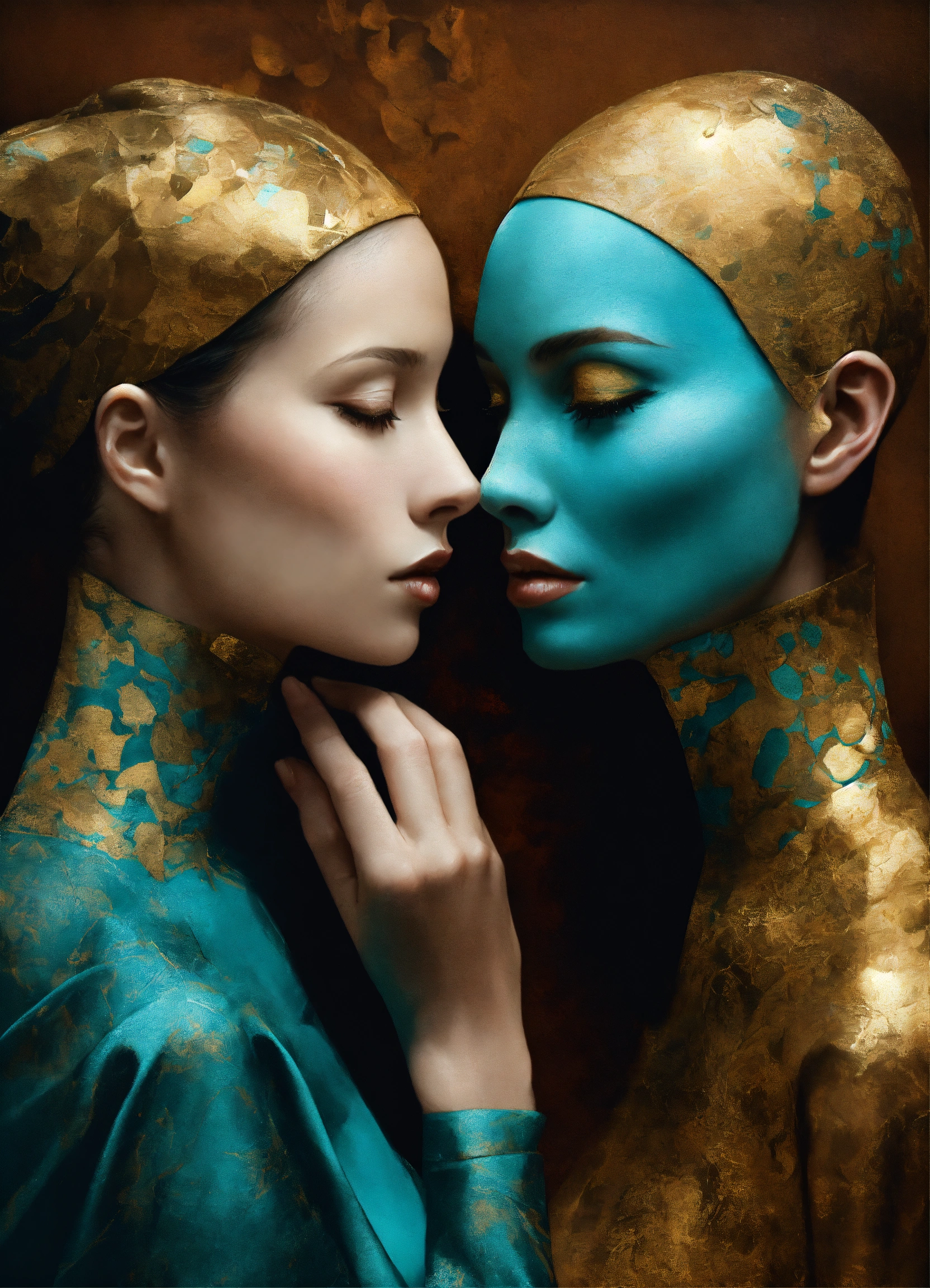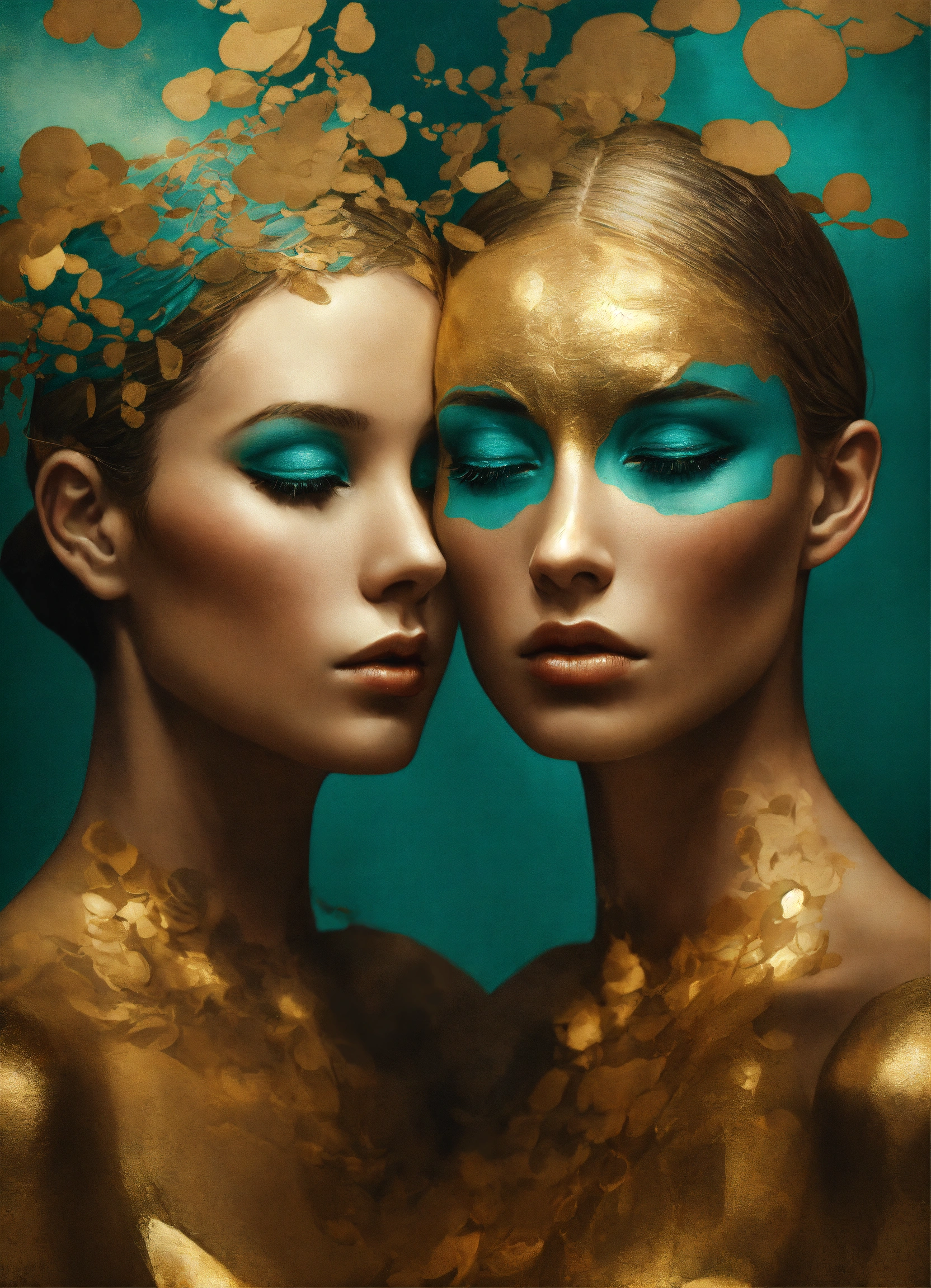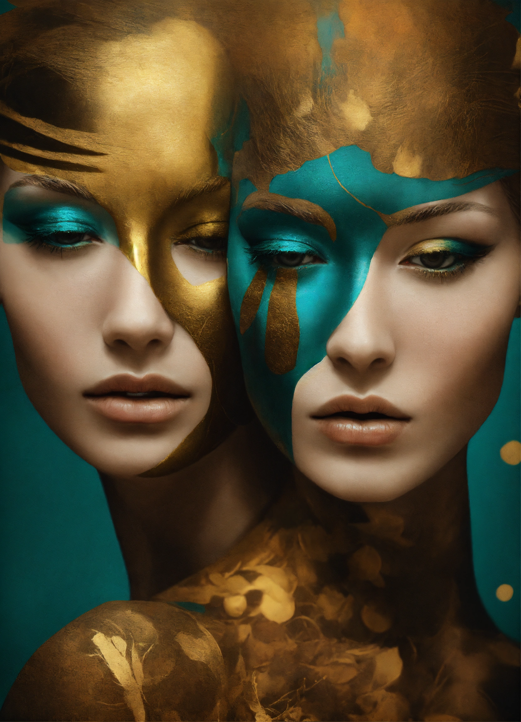 Two women are painting faces on a brown background with calligraphy, in the style of igor morski, teal and gold, straight photography, daria endresen, abstract versus figurative art, multilayered, man ray