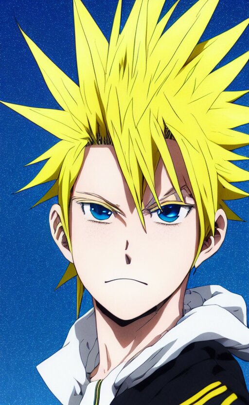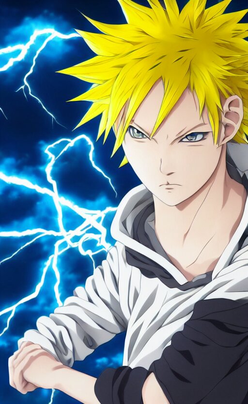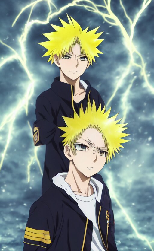 Anime key visual of a young boy with spikey yellow hair and lightning powers, portrait, white background, illustrated by kohei horikoshi, high quality face, detailed eyes, big eyes, official media, 8k, anime, detailed, hd, trending on artstation, illustrated by makoto raiku