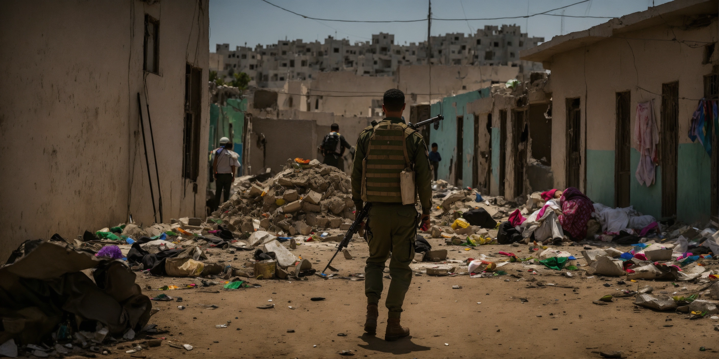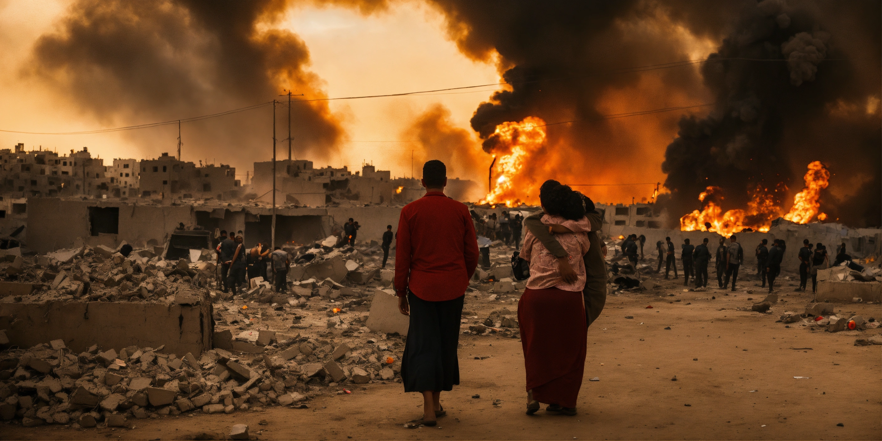 Create a poignant and emotionally charged image that captures the devastation of the gaza-israel conflict on lgbtq individuals in palestine. due to the attacks, they are sharing firsthand experiences. "they shot him. my heart ached. everyone consoled me for the tragedy of a friend. they did not know that i lost myself. that bullet took both of us. they said that you are a martyr, that you are in damnation. i will come to you, my devastation. wherever you are, damnation, or wherever, i will come to you." in the portrait, include faces to humanize those in need of assistance. incorporate symbolic imagery to convey the messages and emotions shared on platforms like 'queering the map' as a result of the ongoing violence. incorporate visual elements that convey the profound devastation, resilience, and the urgent need for global attention to such conflicts. make it look like a cinematic sober scene tooked with films. we need to empathize with their cause.