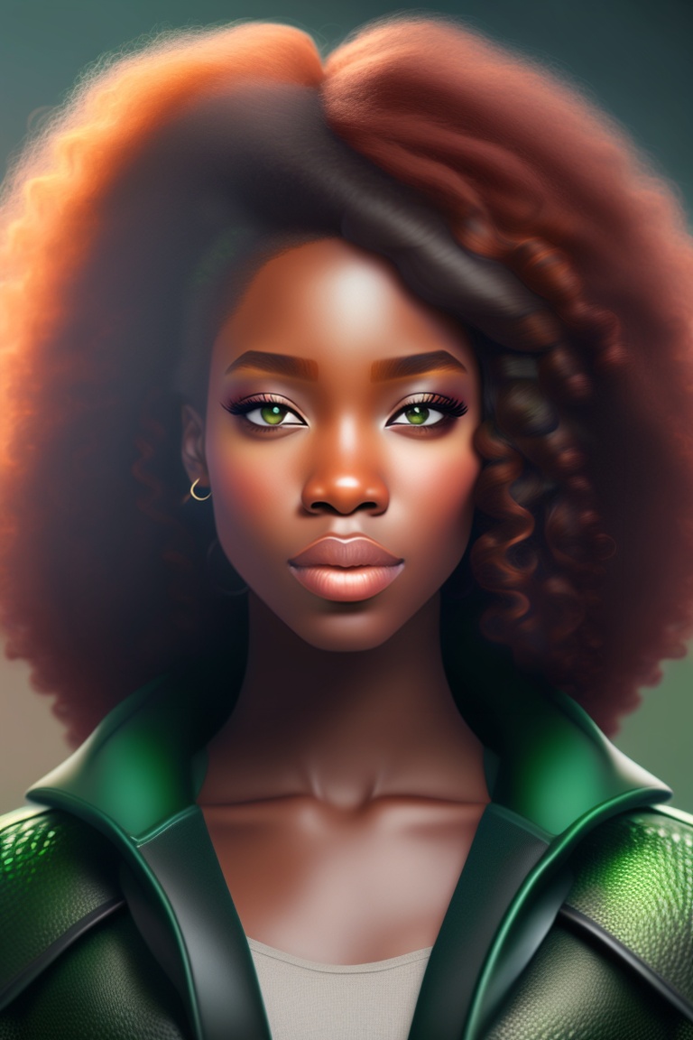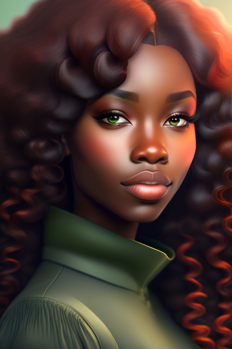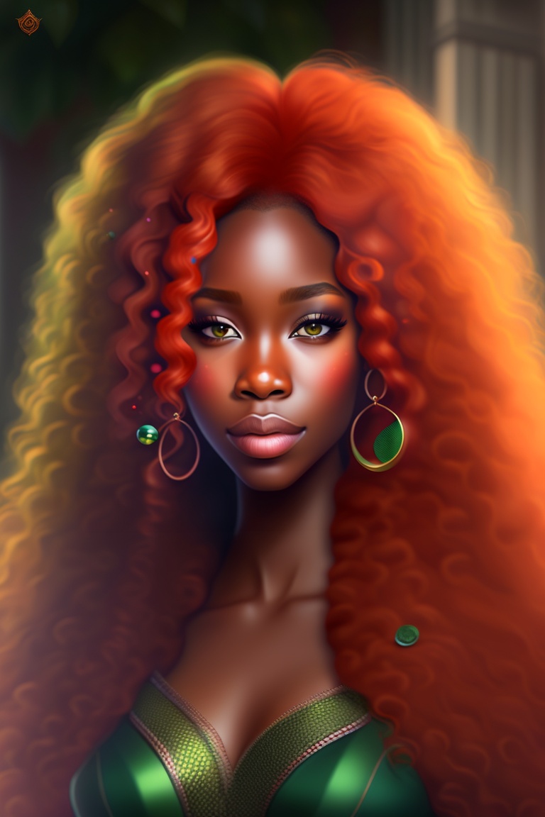 Woman with black skin, long puffy curly red hair, full green eyes, button nose, big lips and big eyes