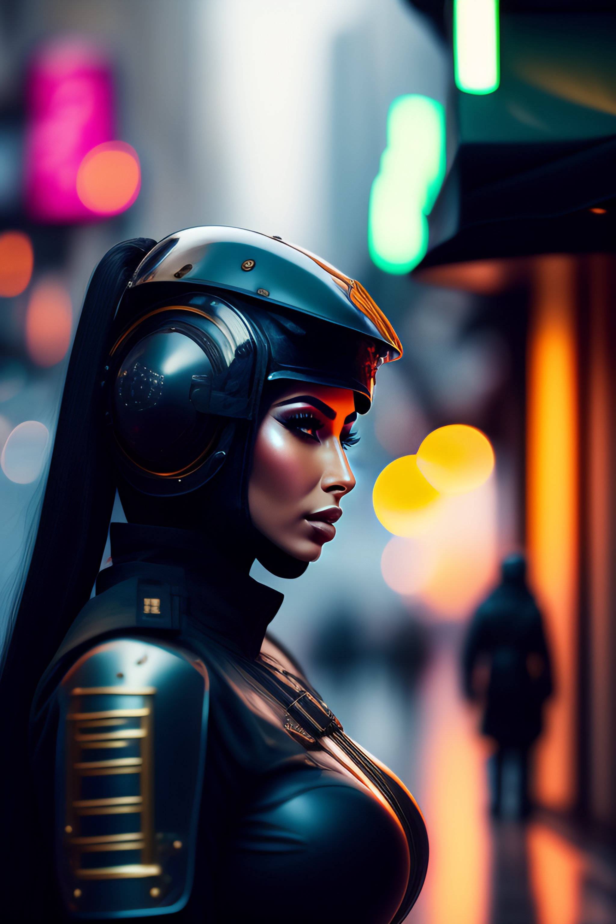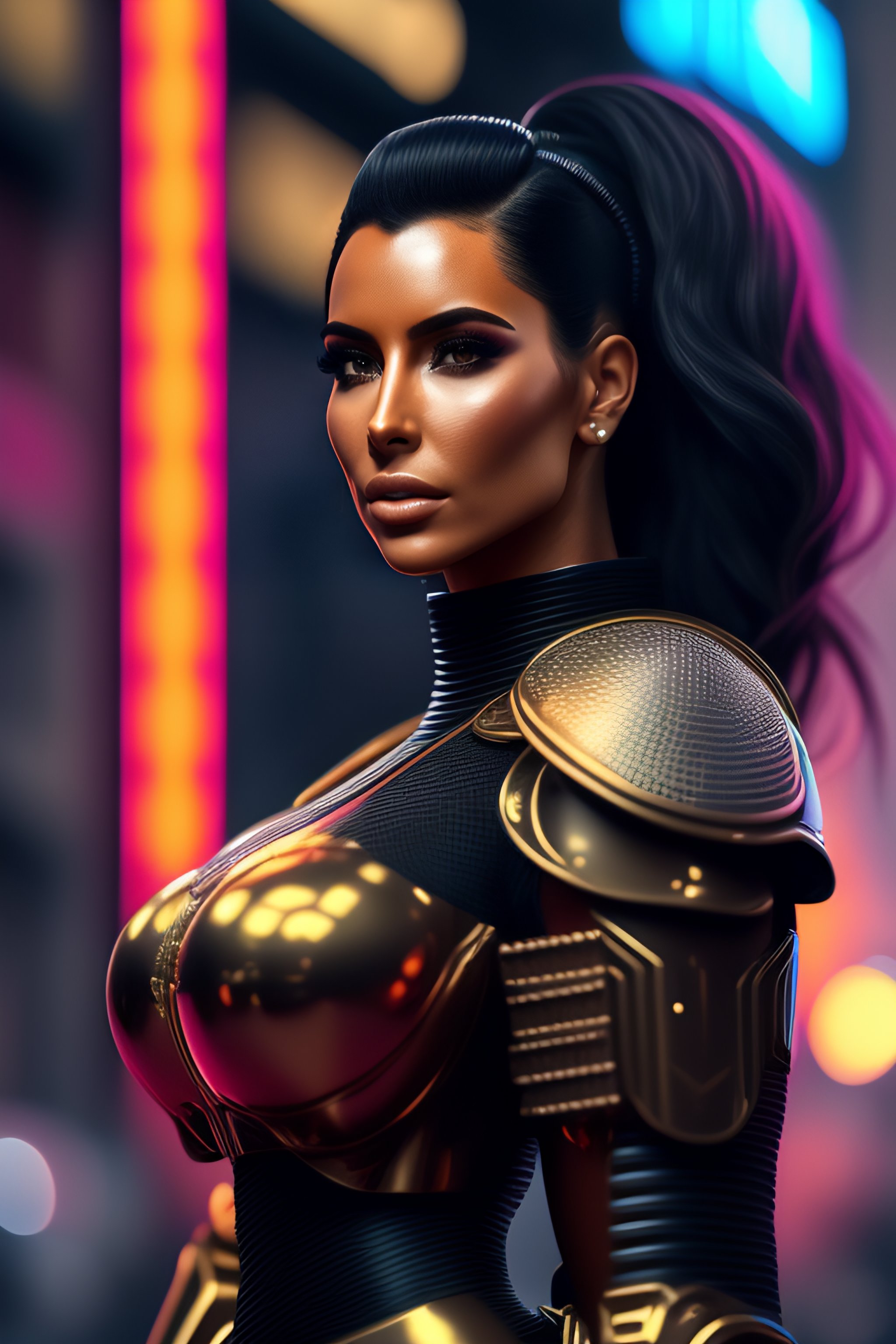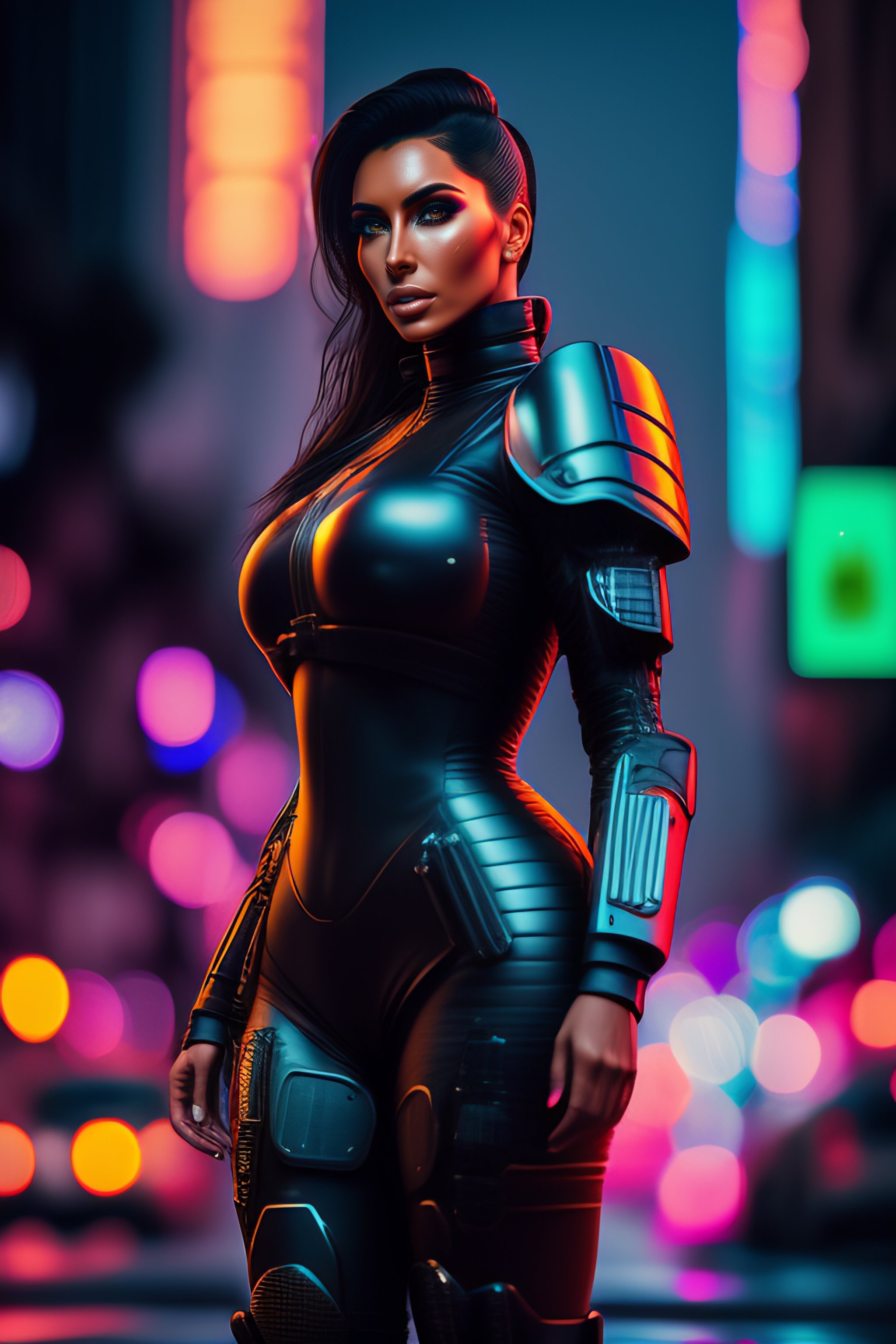 Female kim kardashian robot solder, tactical armor, rifle, neon, movie still, cyberpunk, photo realism, ultra detailed, city, rain, future