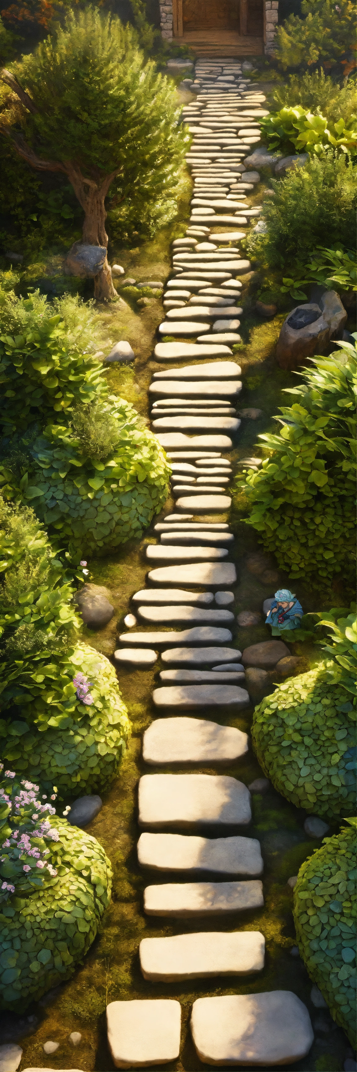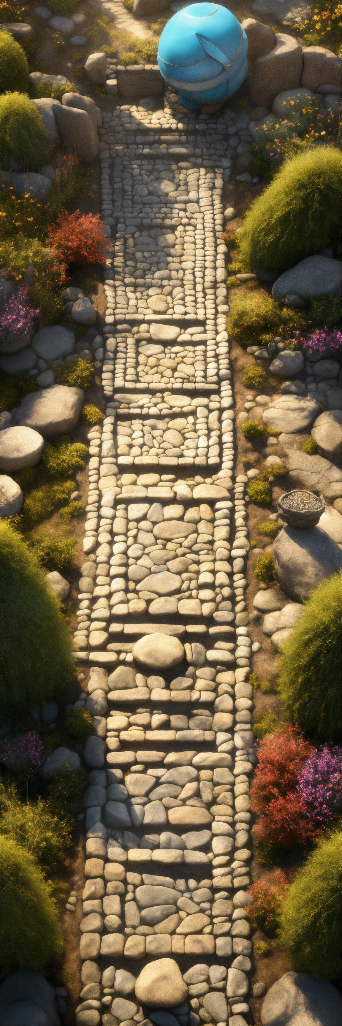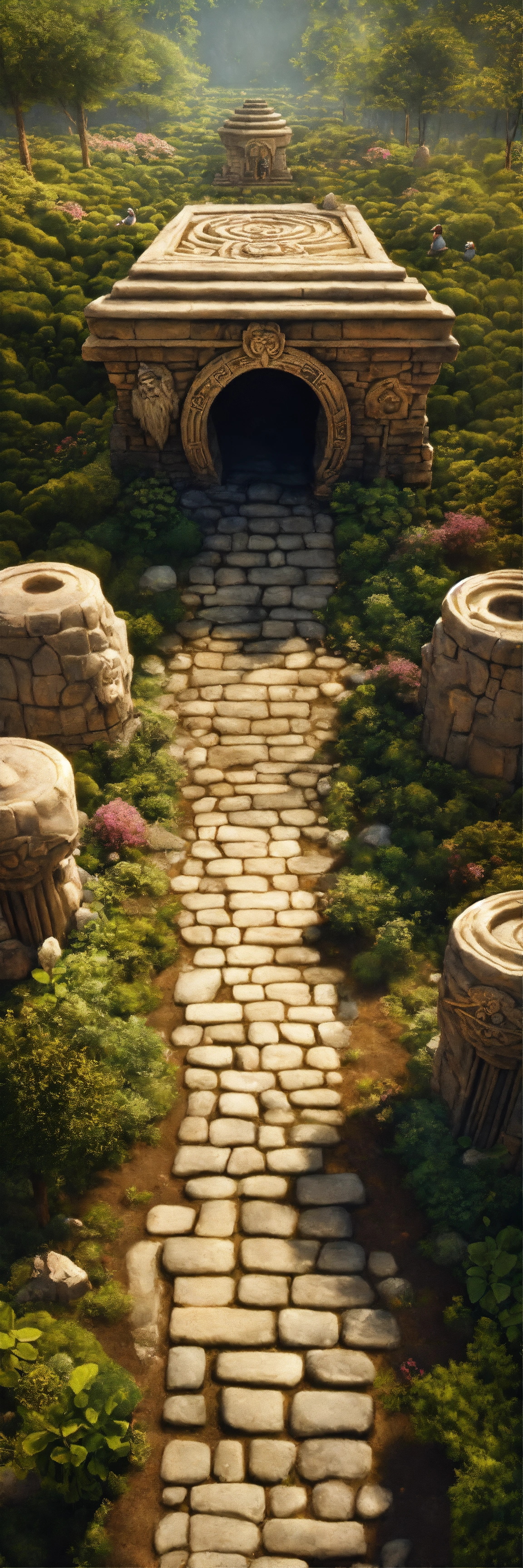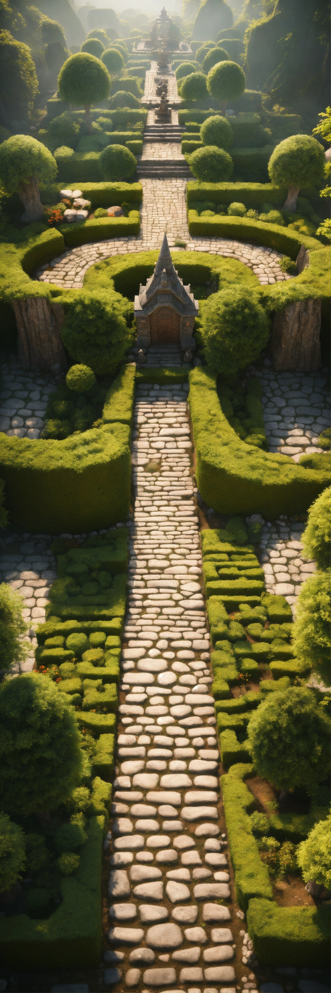 Birds eye view of an ancient spiritual gnome inspired stone pathway rock garden.sculptured . style of alex grey/brian froud/giger.totem sculptures. patterned stone winding pathway, labyrinth.courtyard.meditative.unreal engine