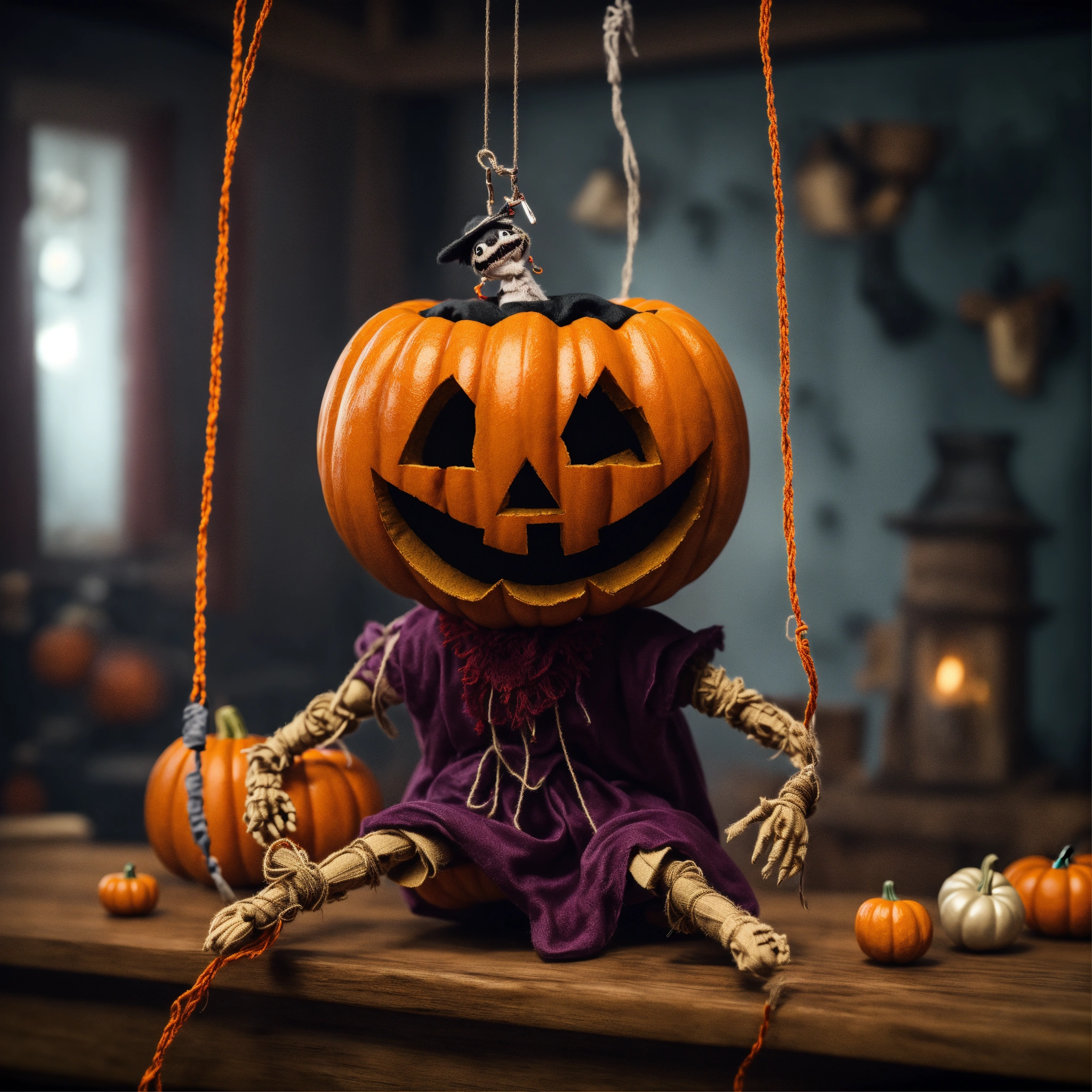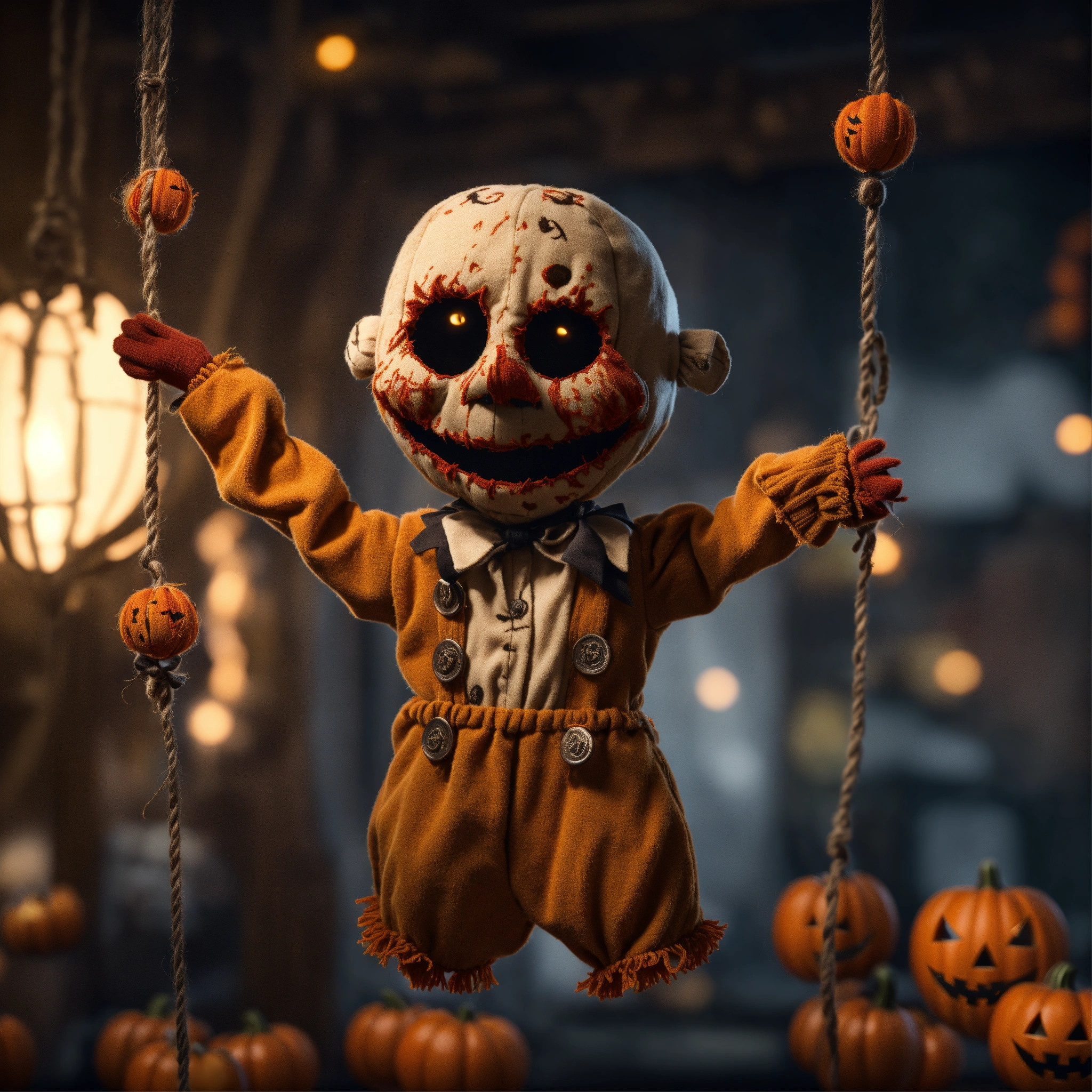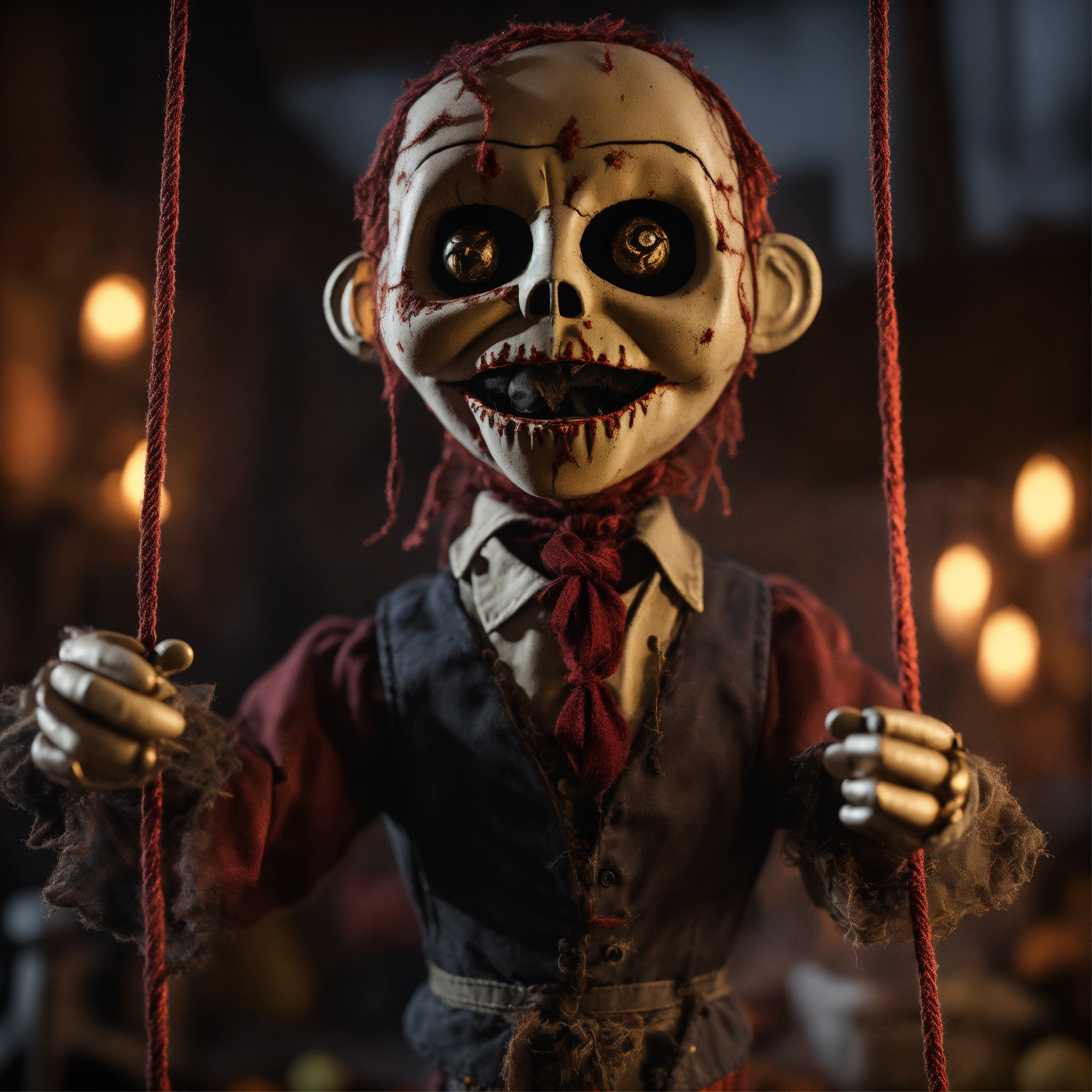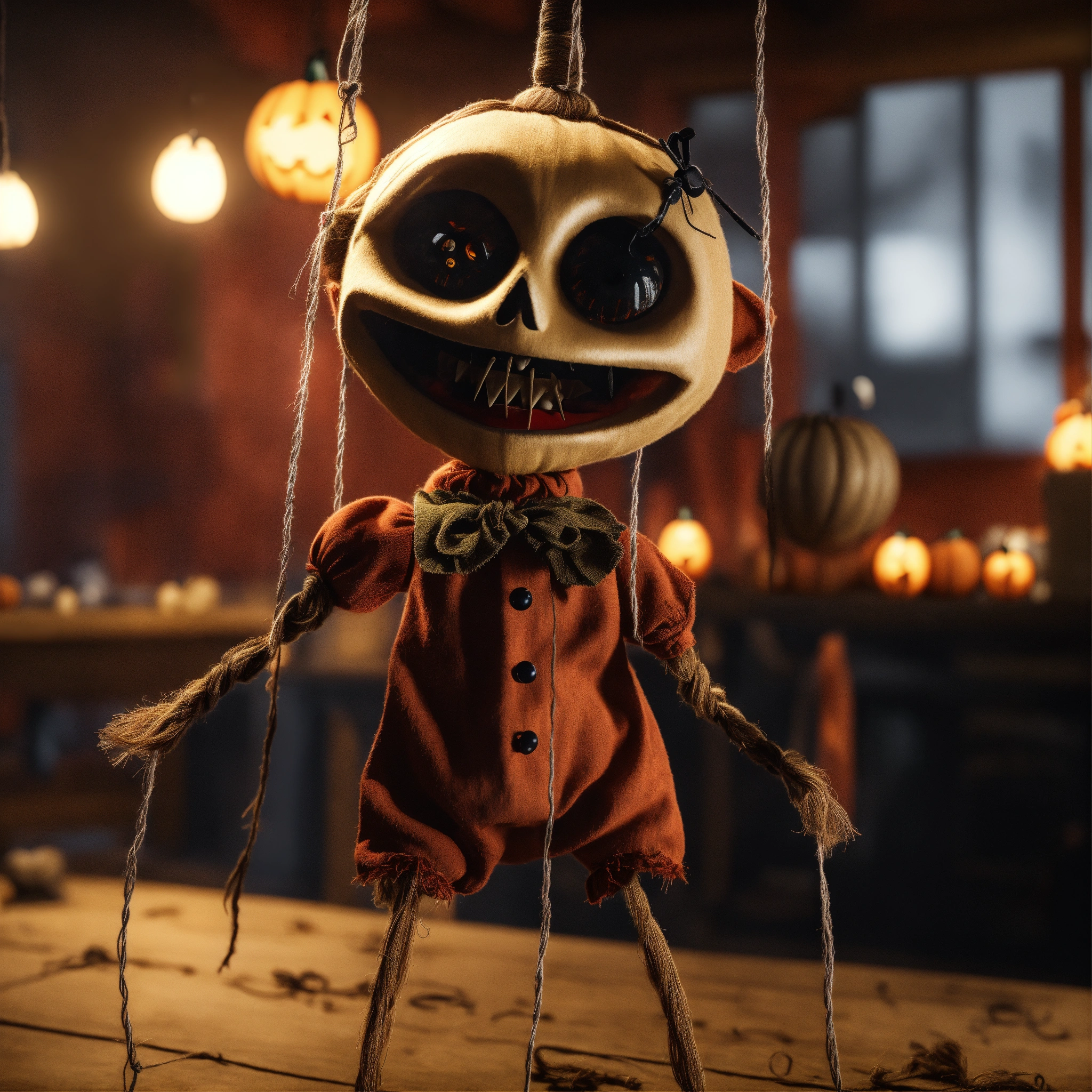 Scary puppet on a string, halloween, unreal engine render, 8k, extremely detailed, realistic photo, 4k realistic photo.