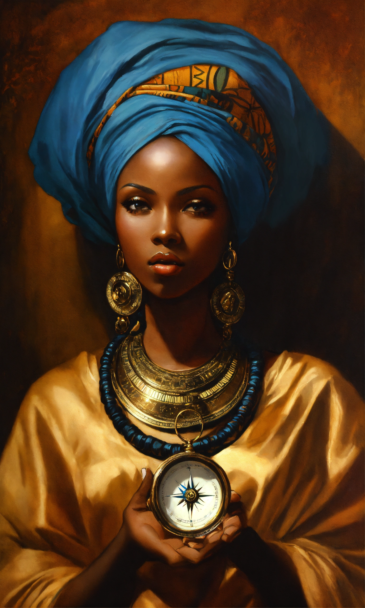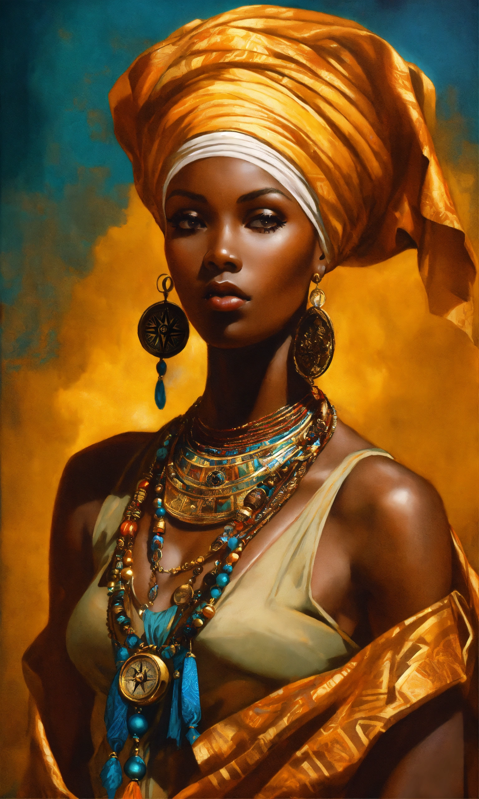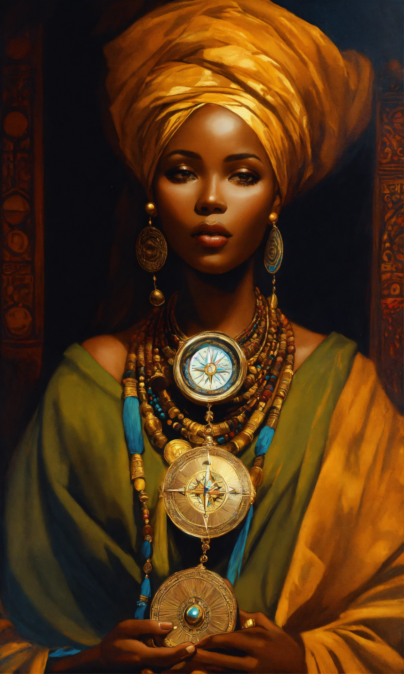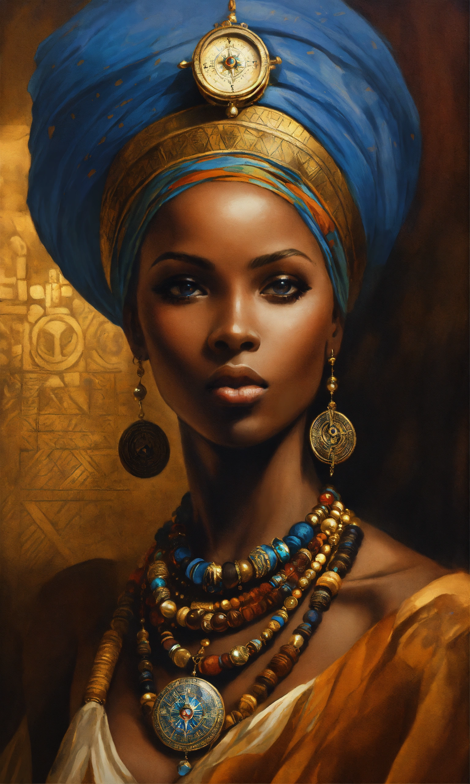 A woman in a turban holding a compass, somali woman, african woman, dark skin female goddess of love, beautiful portrait, gorgeous woman, black african princess, stunning african princess, a stunning portrait of a goddess, african arts, afrocentric mysticism, amazing art, kemetic, traditional beauty, african queen, stunning portrait, inspired by thomas blackshear