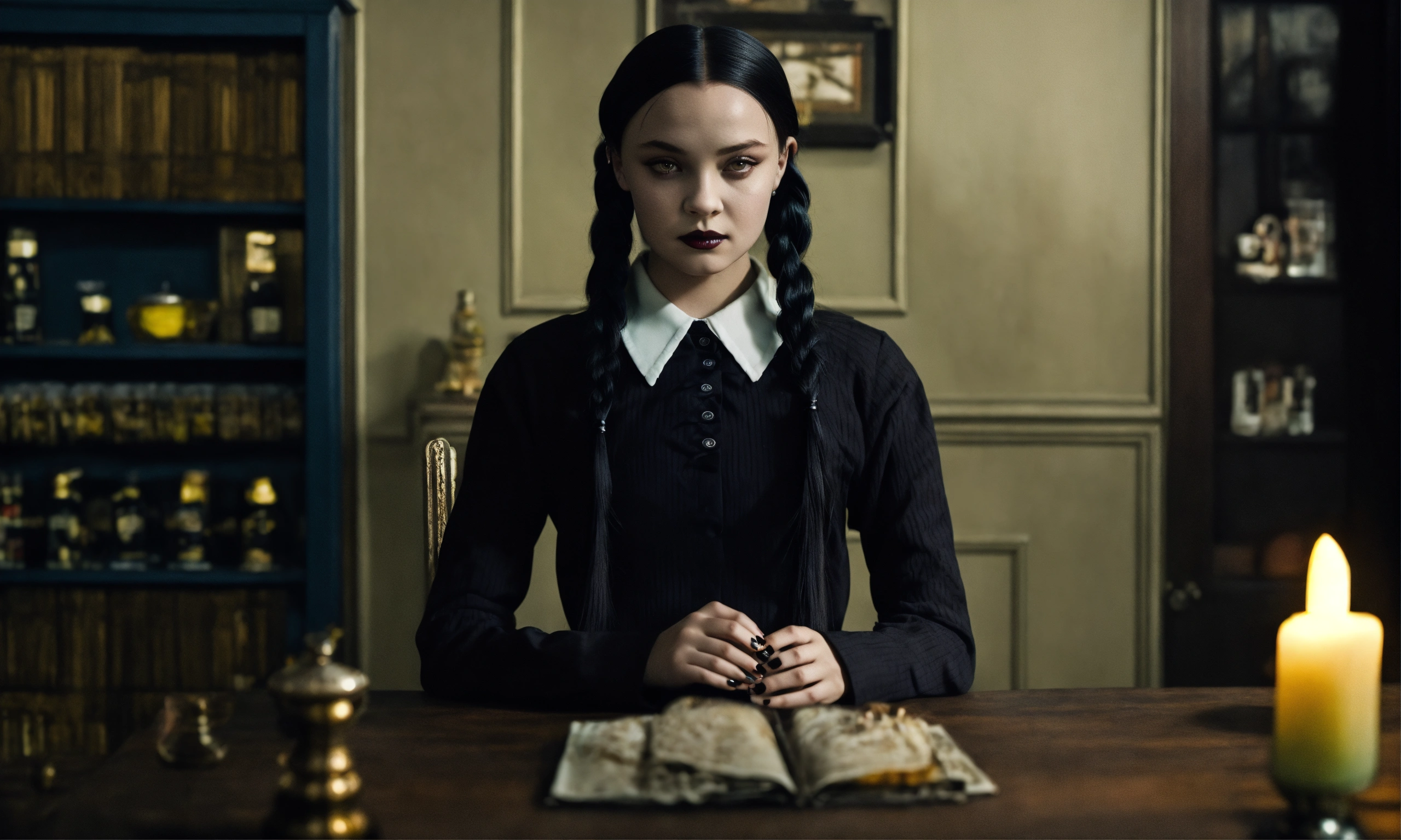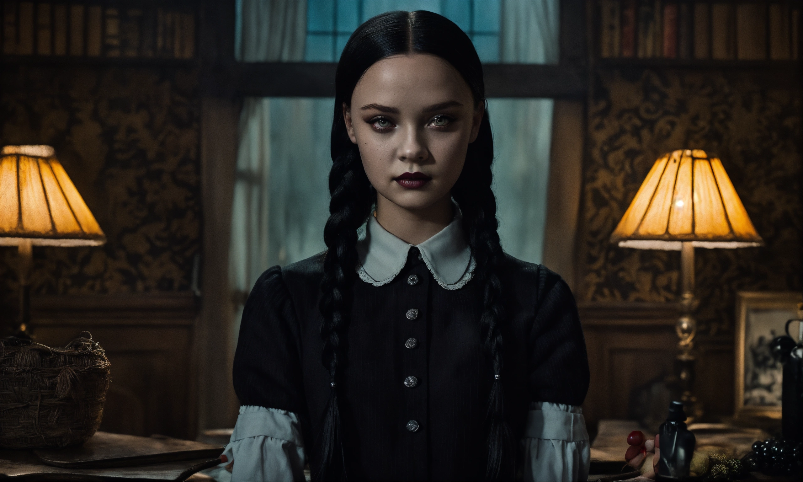 Wednesday addams from the series, black hair braided full growth, stay with tatoo, stay in home, color palette and overall composition of the image emphasize the dark and enigmatic atmosphere of the addams family. black eyes and nails, age 18, black pupils, full length