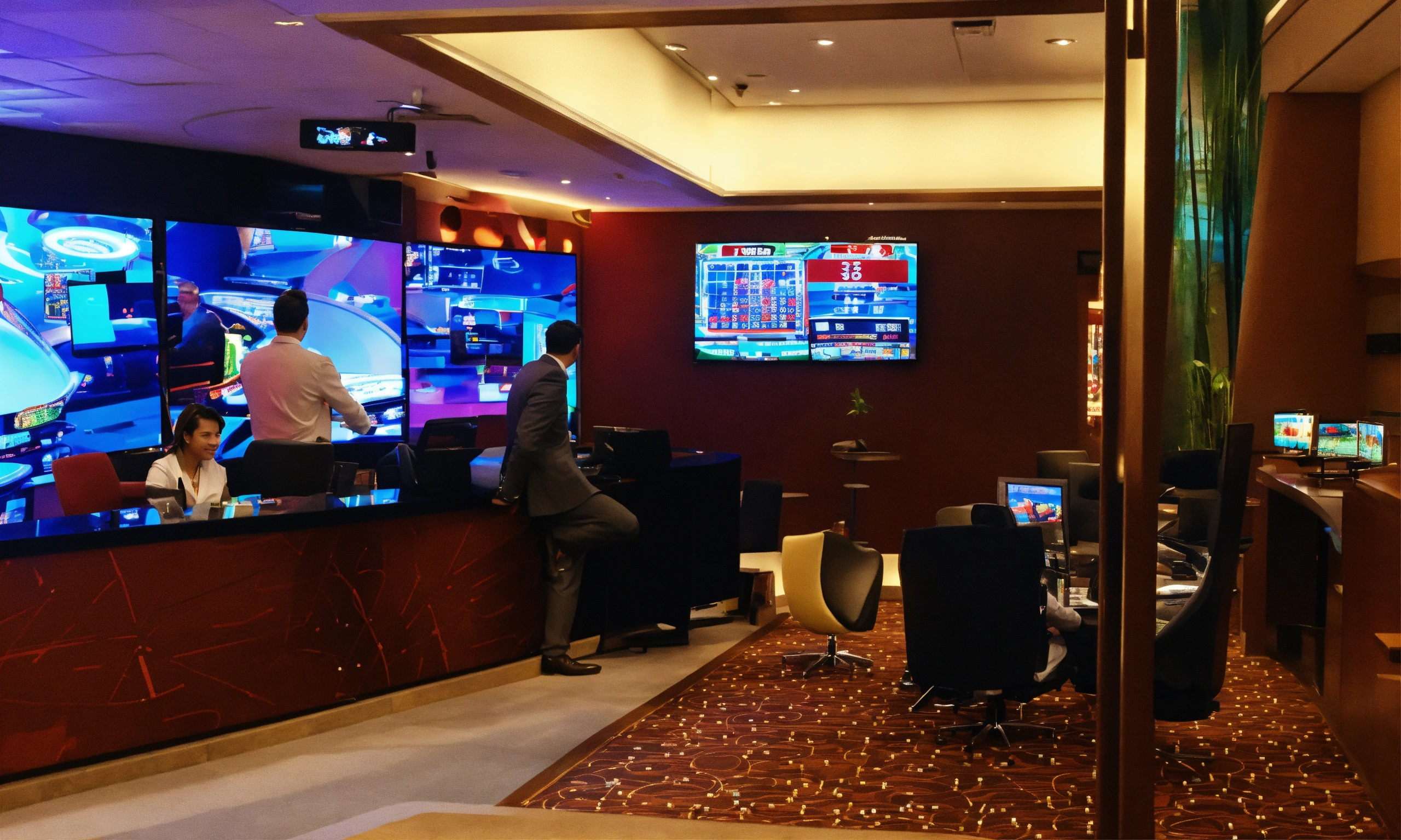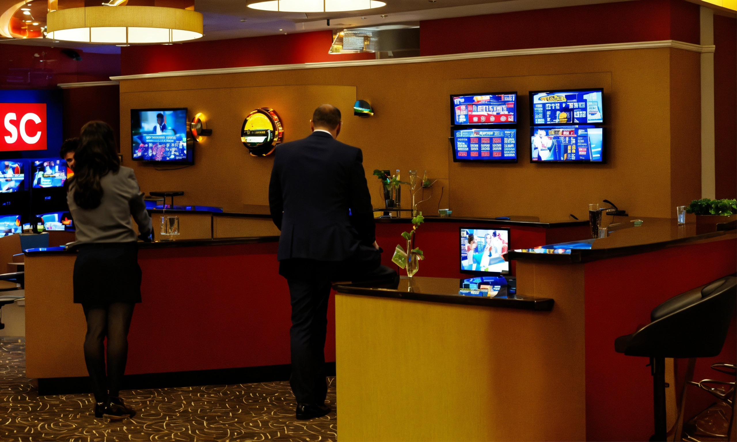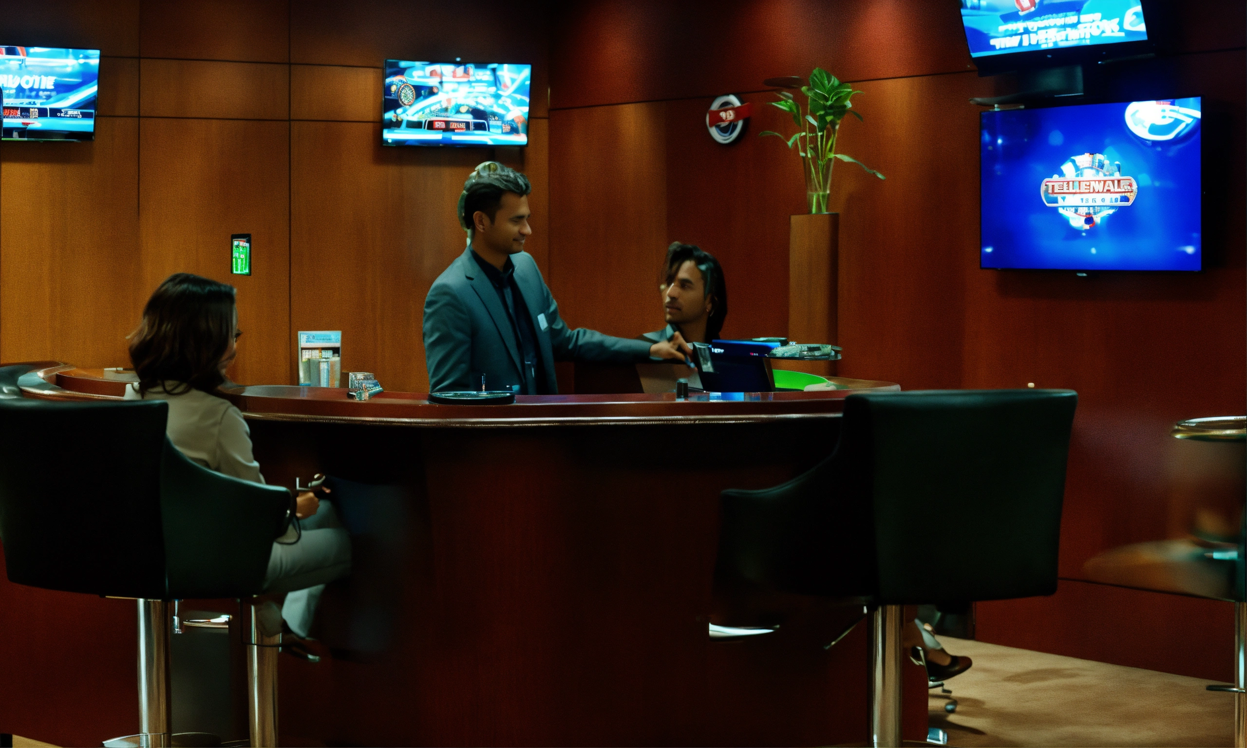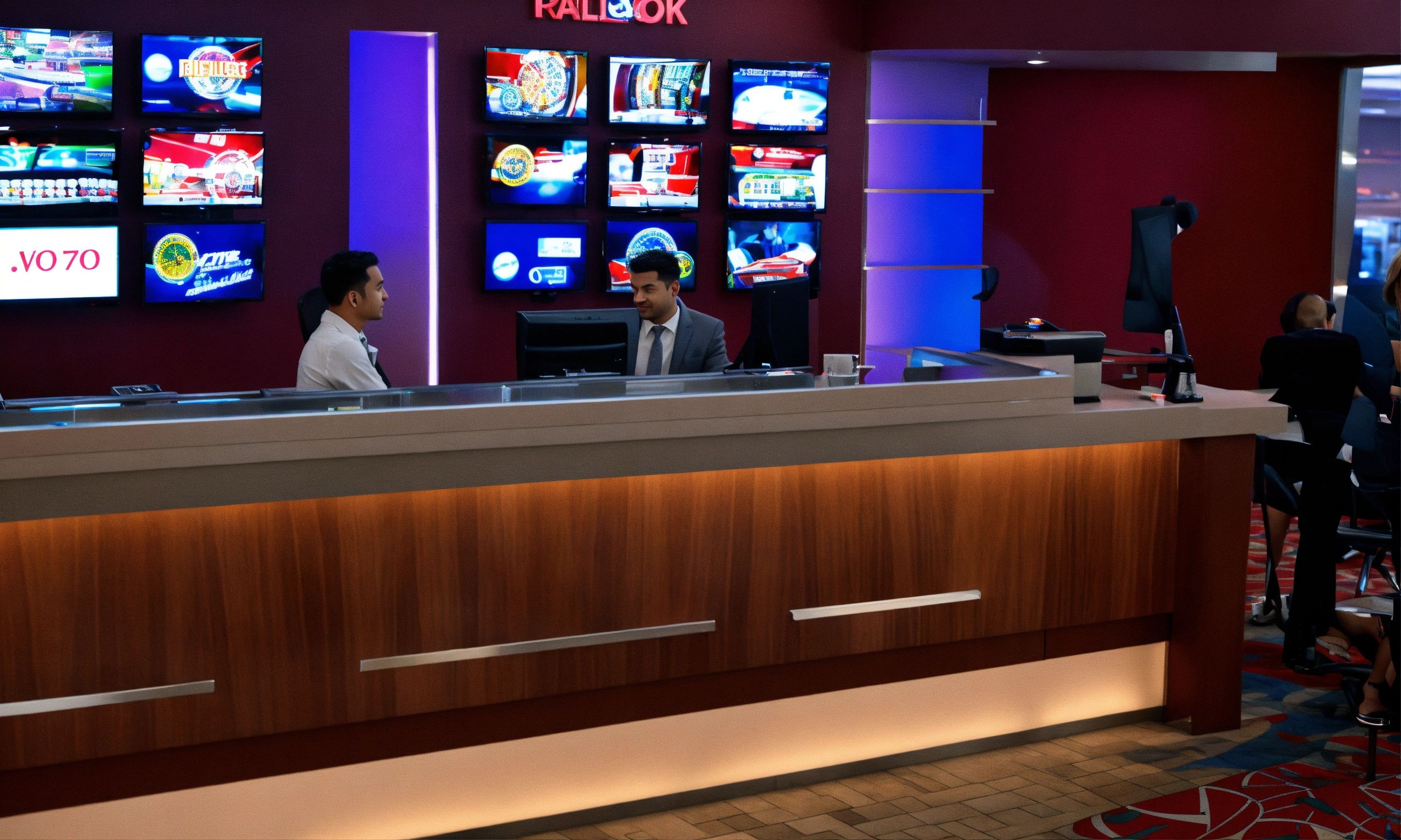 Photo in a betting company branch interior. a man sits behind a reception desk, looking relaxed. facing him is a female employee, both engaged in a conversation. in the background, three televisions are mounted on the wall, each displaying a spinning roulette wheel.