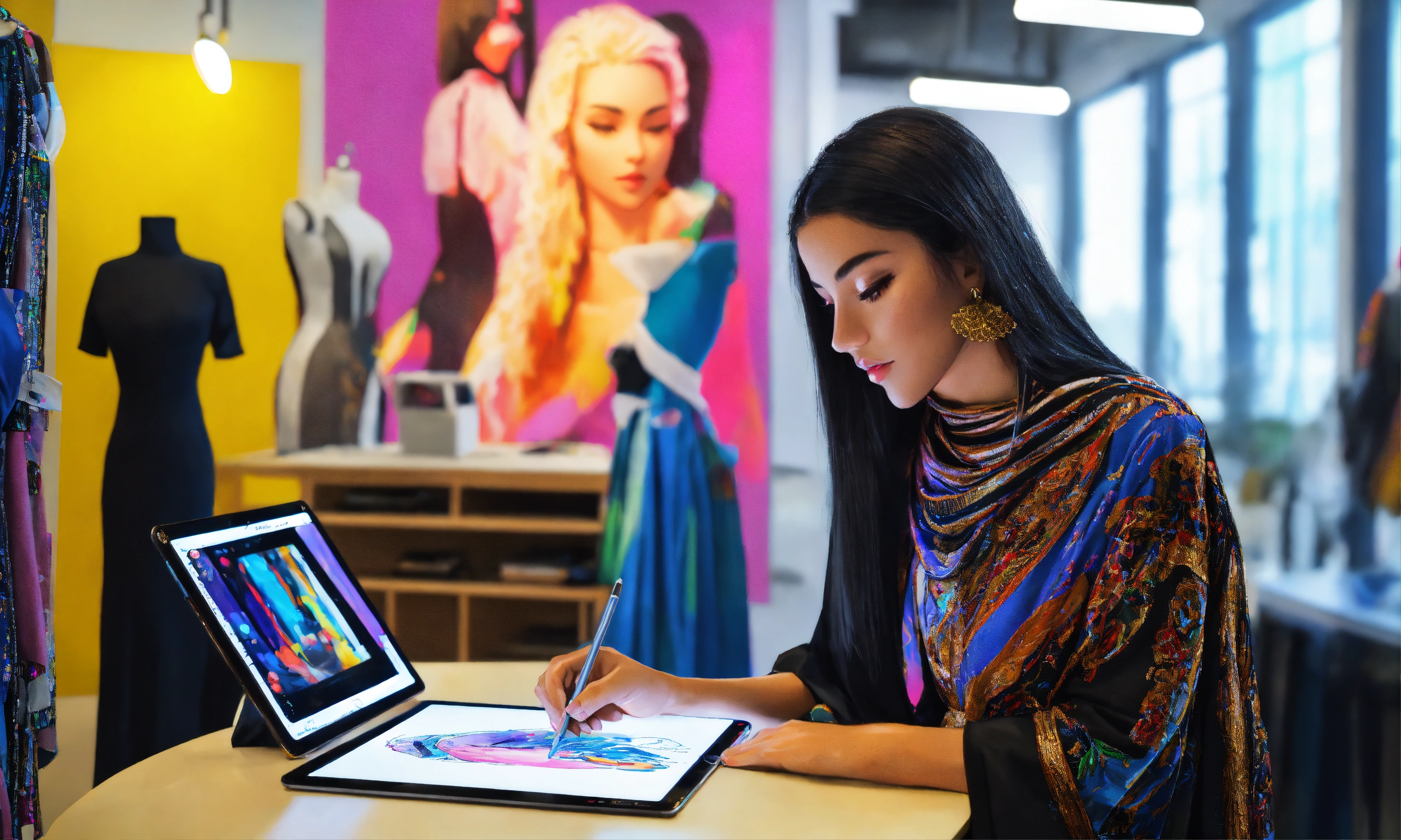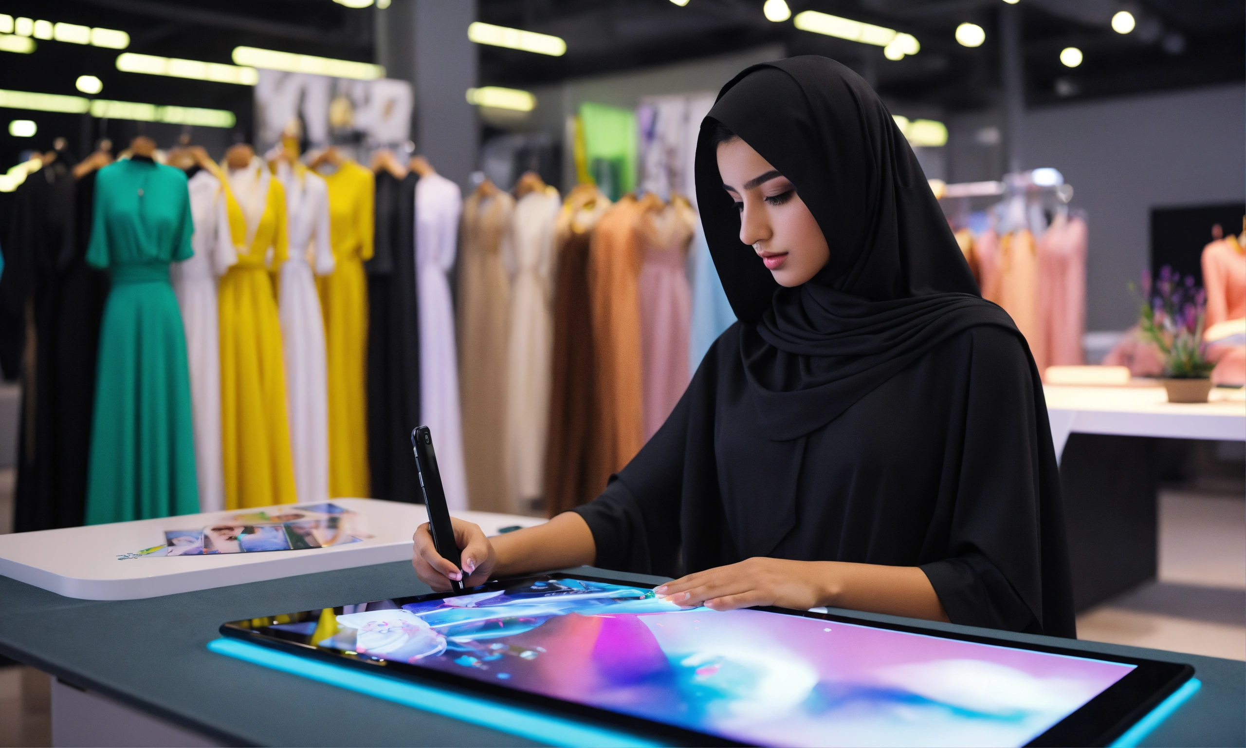 Saudi youth girl, fashion designer, drawing on tablet, design shop, augmented reality, technology, desk, computer, mannequin, colorful dresses, black costume, ultra modern, photo-realistic, 8k, high-definition