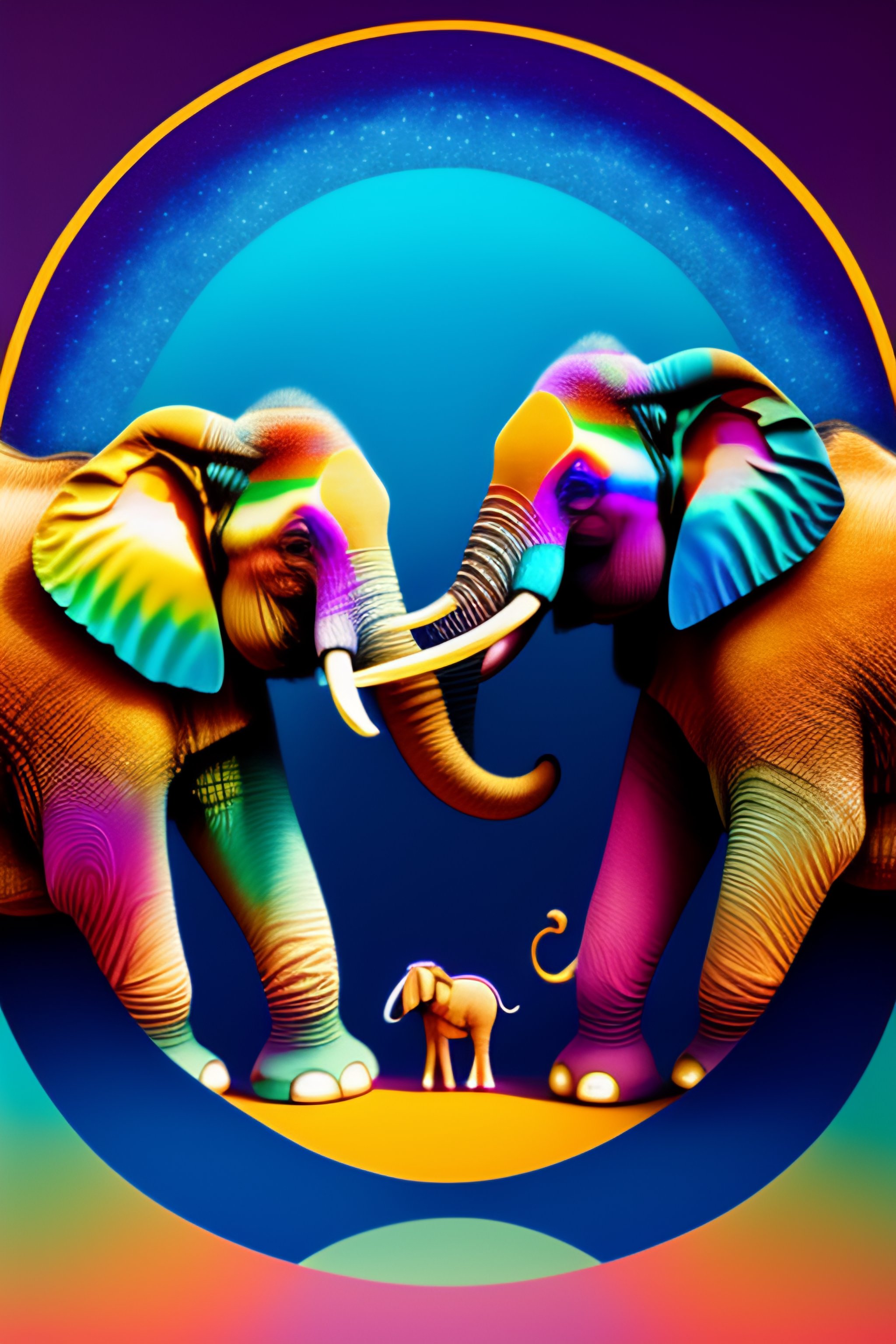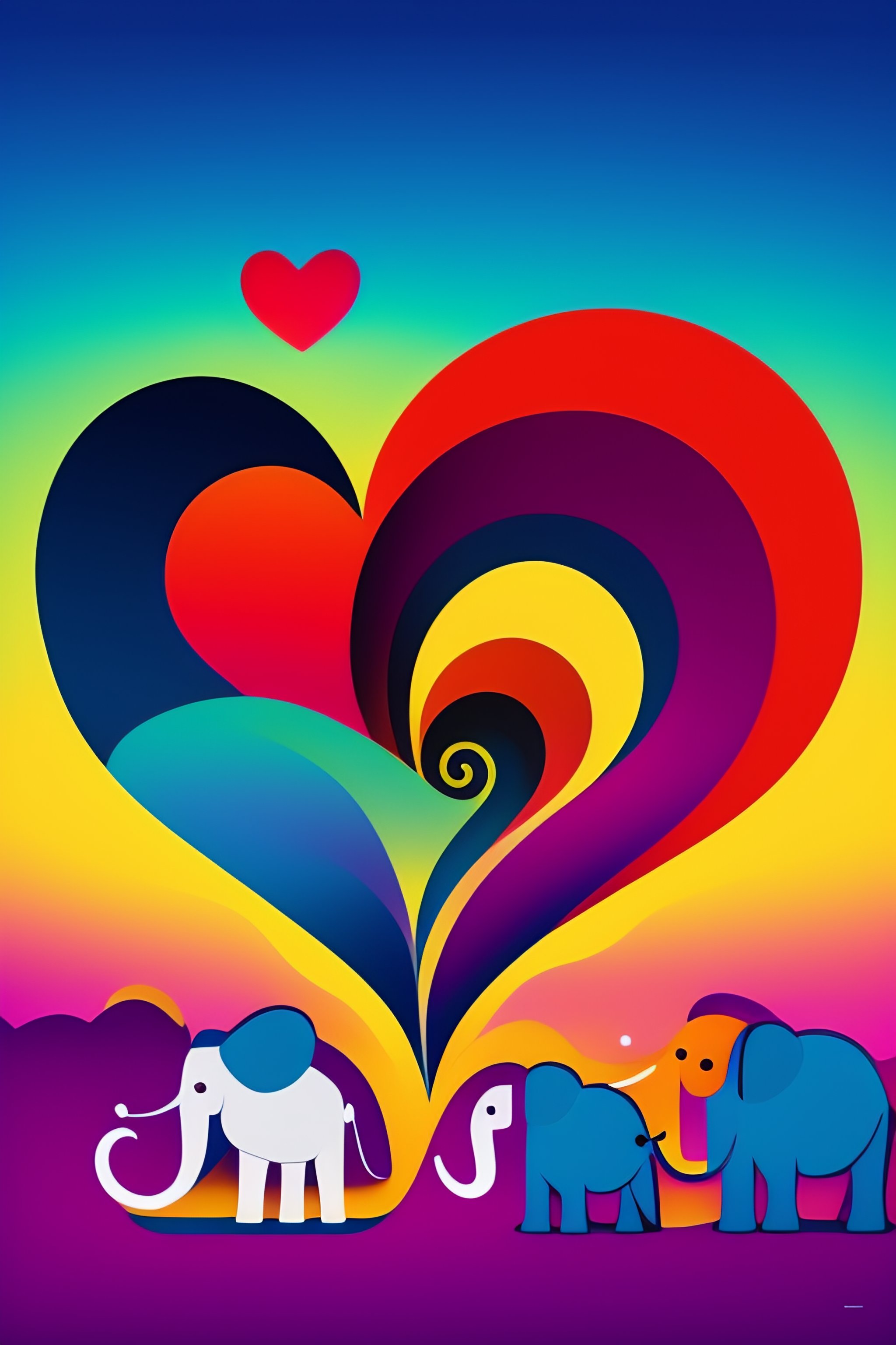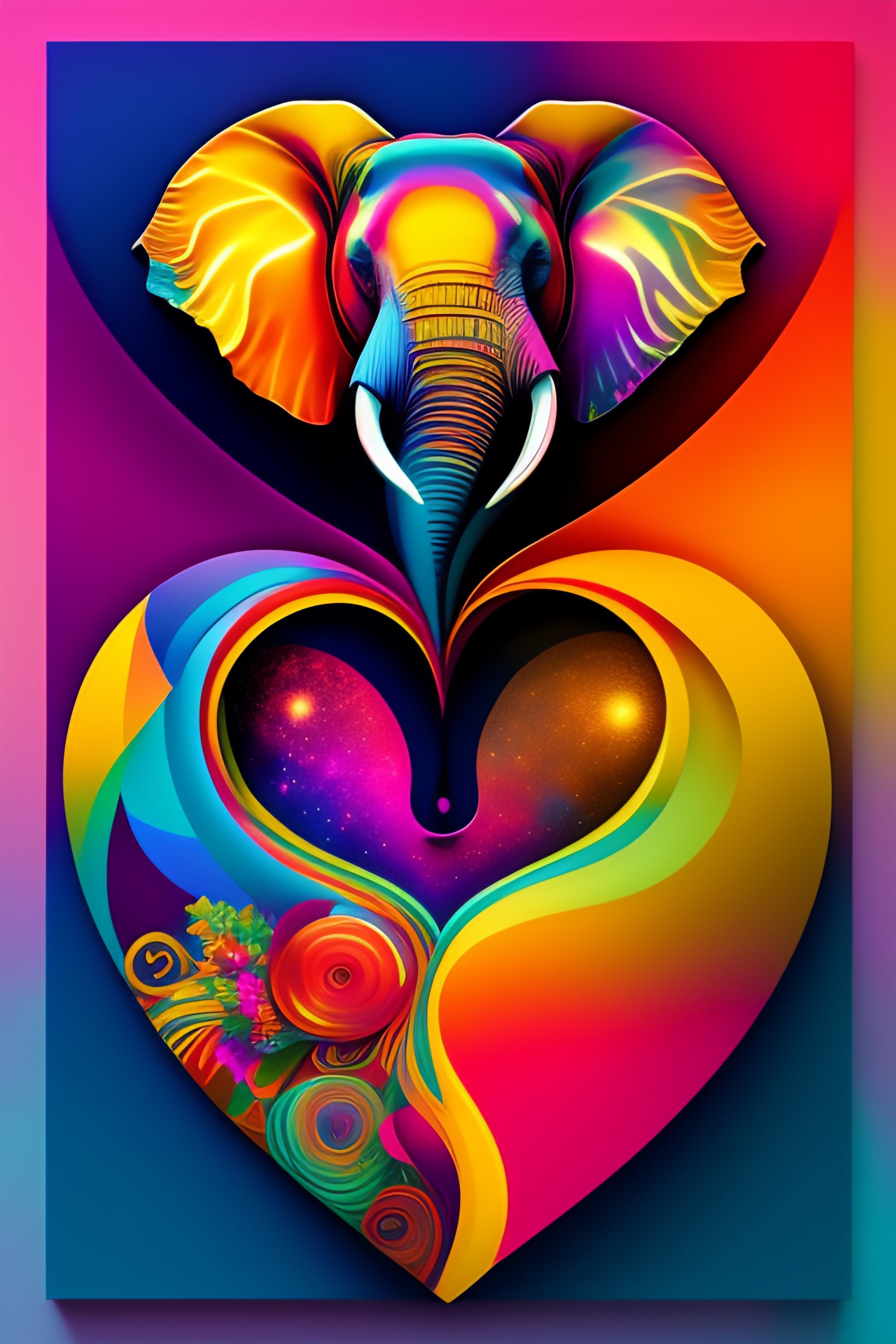 Lovers, abstract two elephants, heart mandala, floral sculpture, colorful, portal, love, picasso, heartbreak in outer space