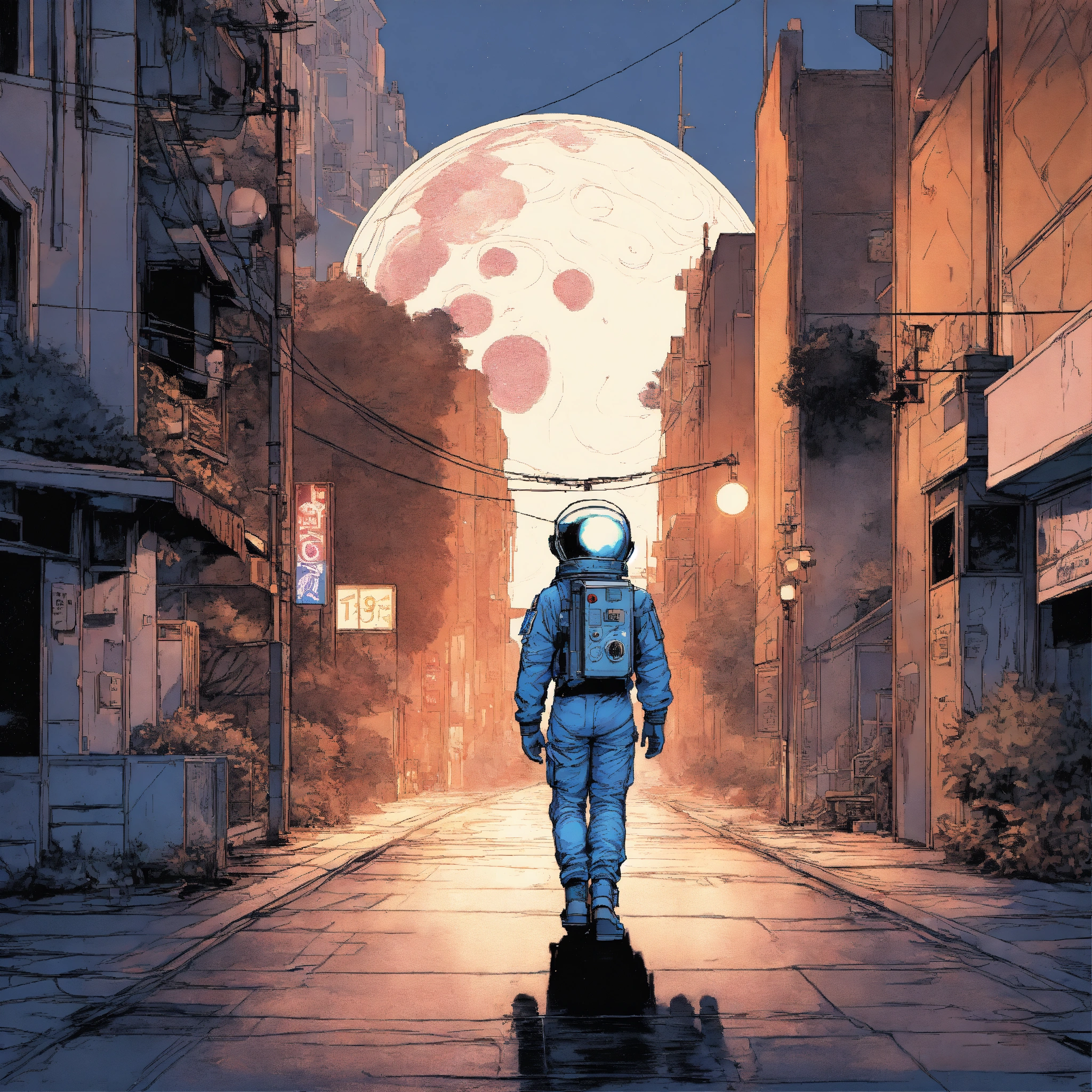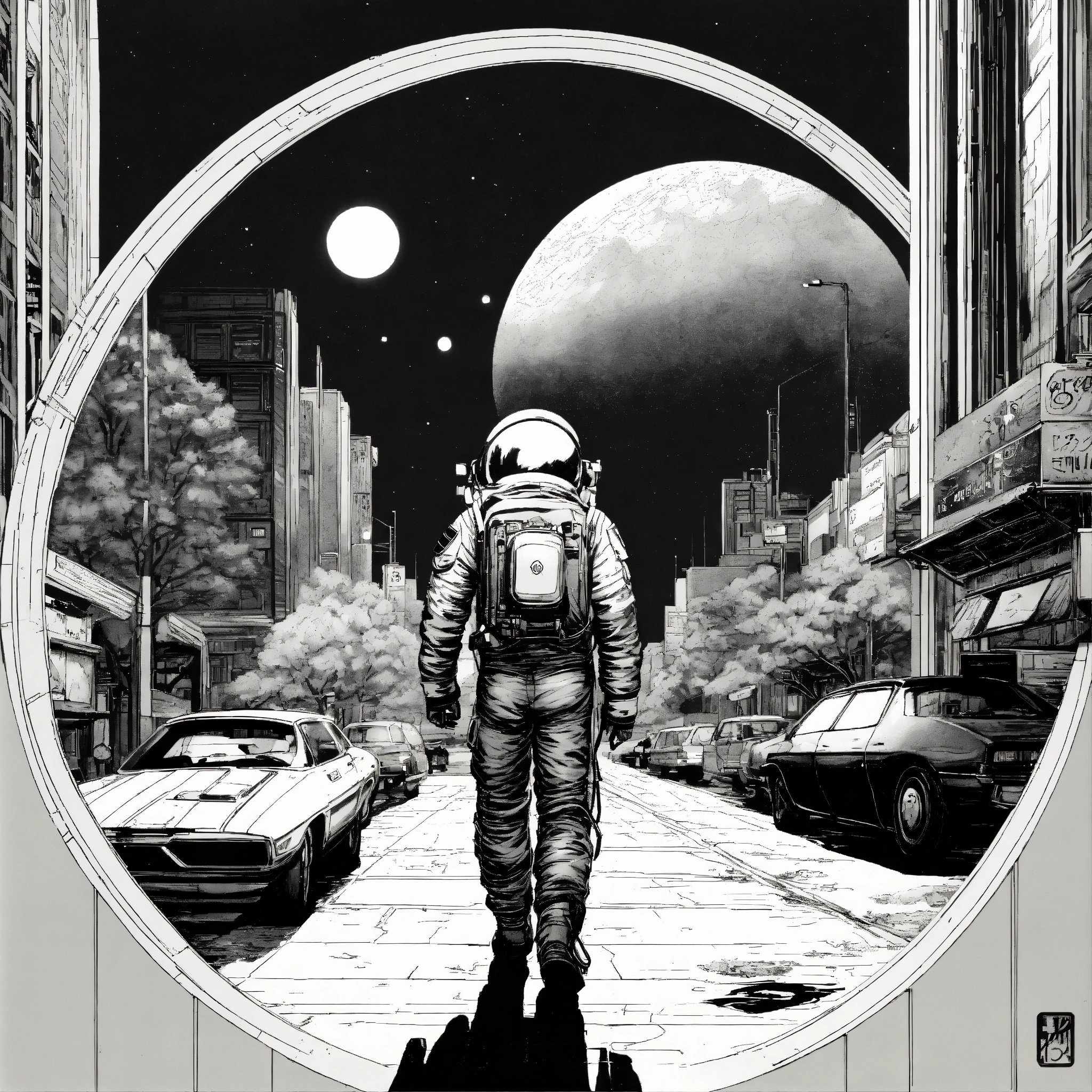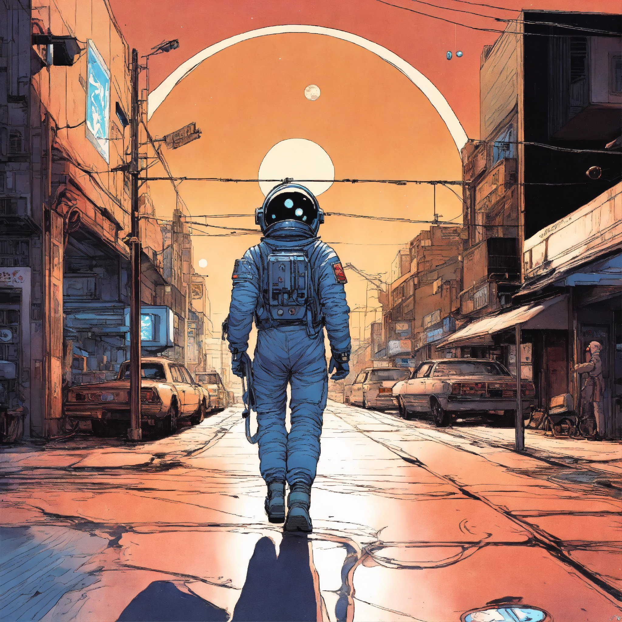 Vintage 90's anime style. a lonely astronaut walking down the street; by hajime sorayama, greg tocchini, virgil finlay, sci-fi. line art. environmental arcade art. simple circle logo