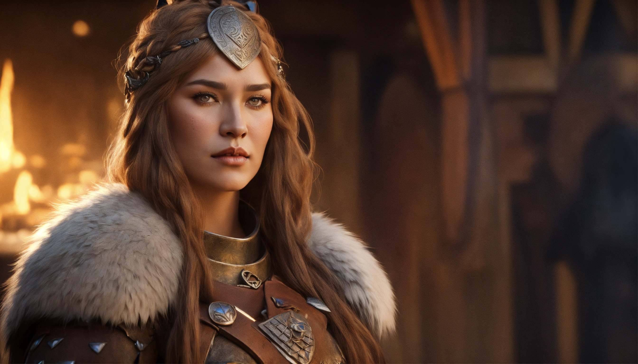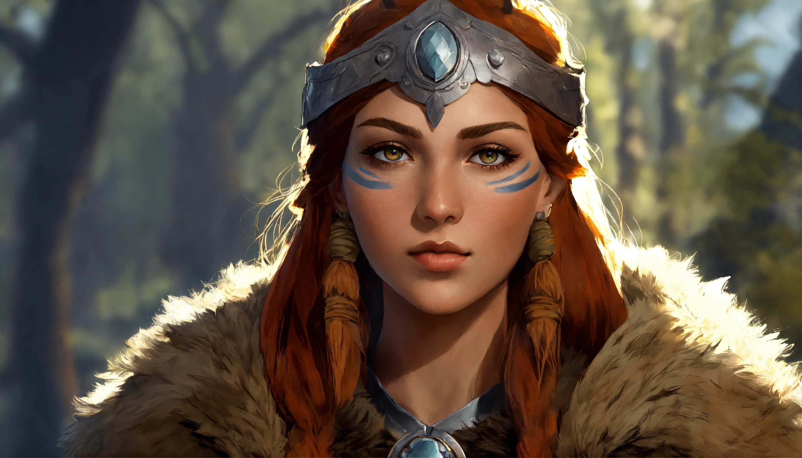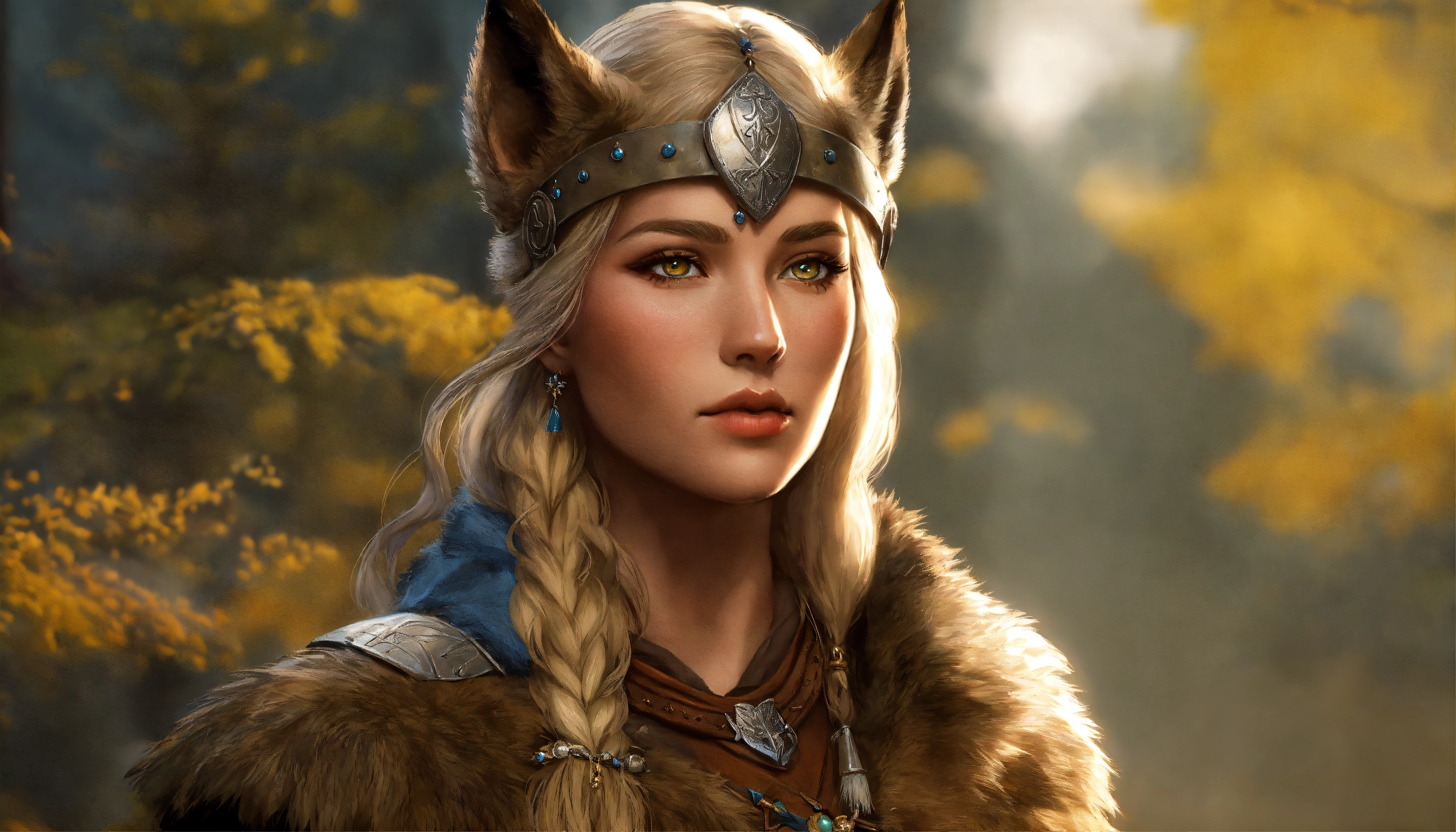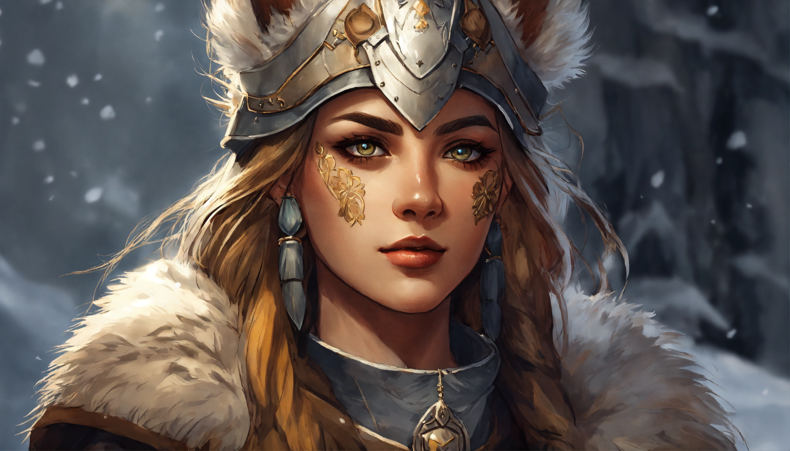Germanic shaman woman with a rounded nose and pear-shaped head. muted greyish bow lips and a wolf paw over her left cheek. she has beautiful hazel eyes and wears bearskin armor with a clawed gauntlet on her right hand. d&d, fantasy