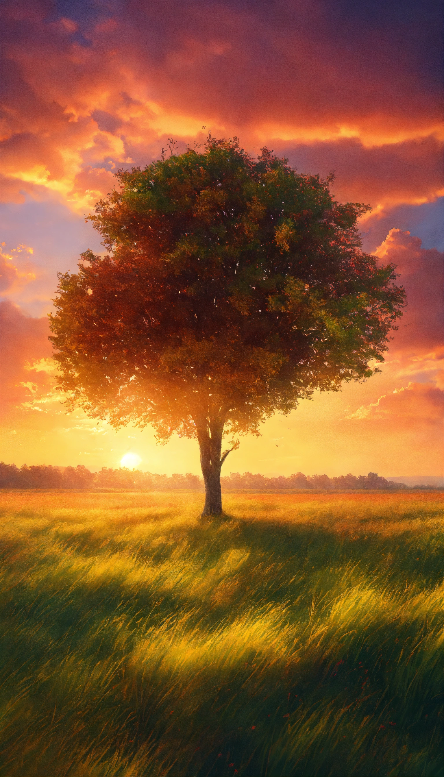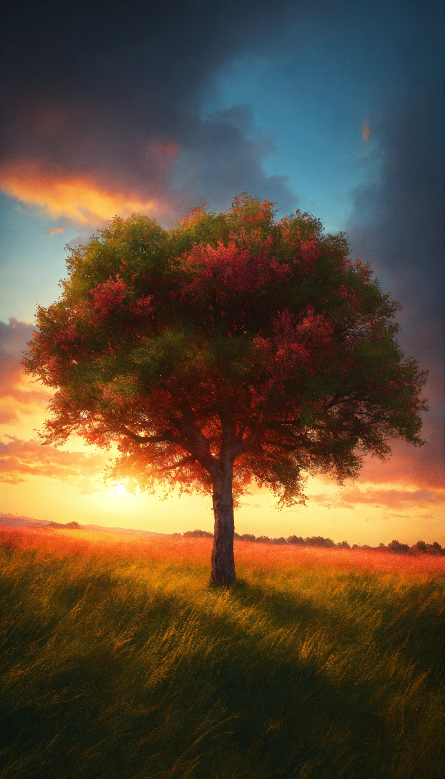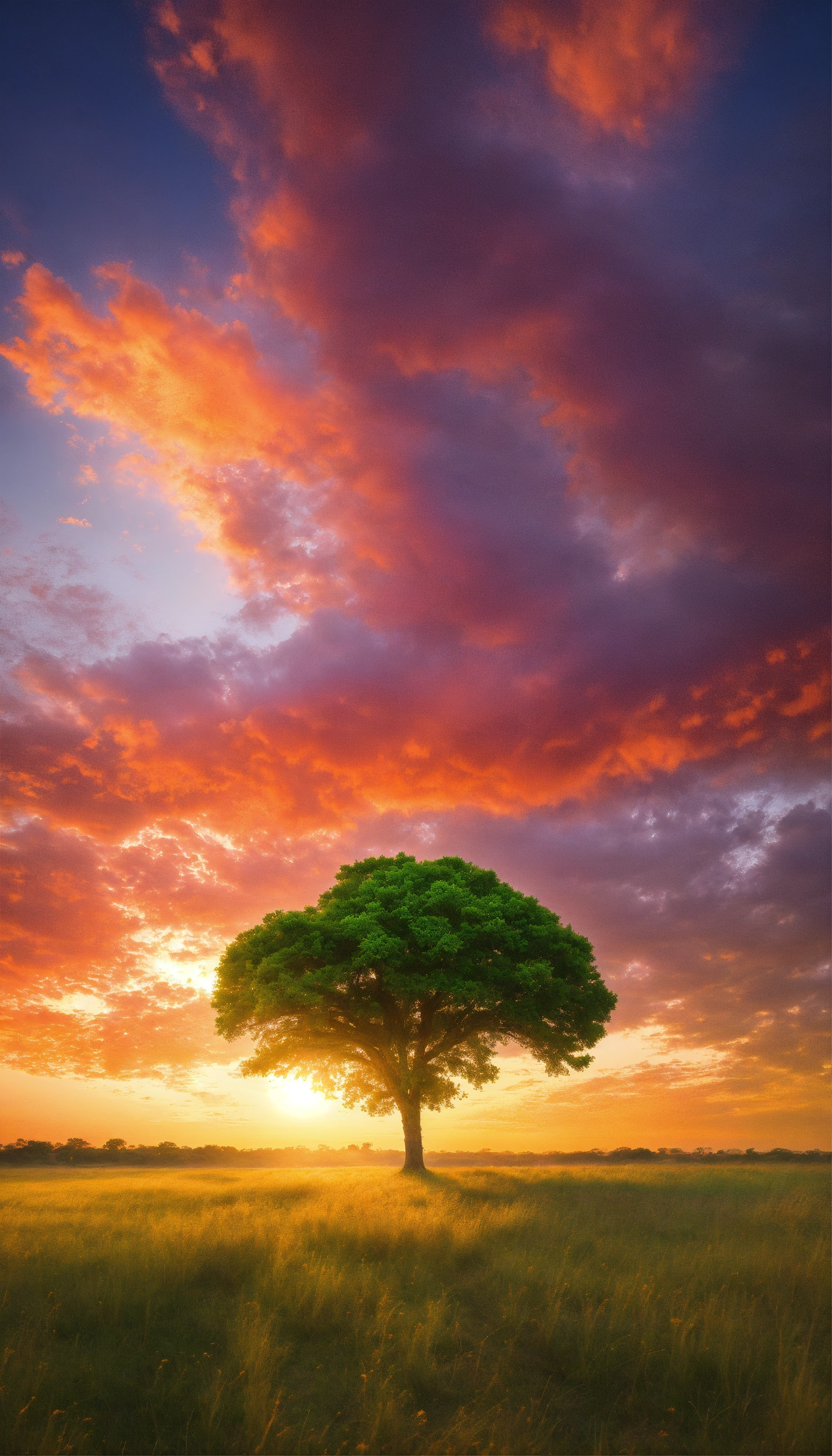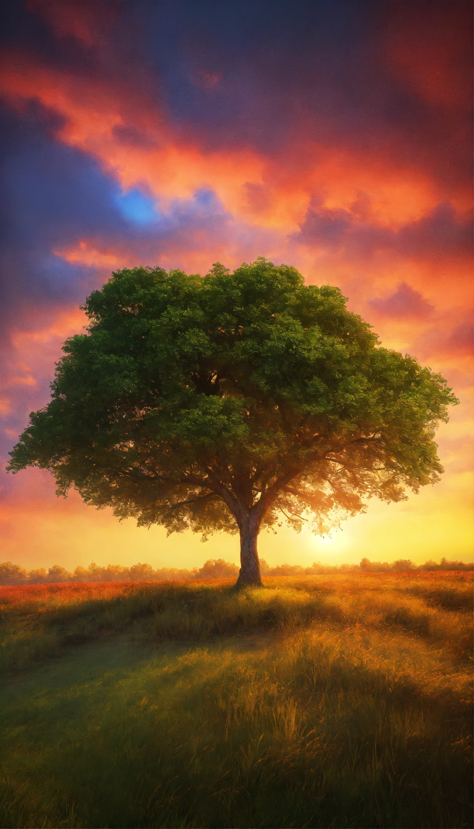 Wide angle shot of a single tree growing under a clouded sky during a sunset surrounded by grass, vibrant, colorful gradient splash, hd, 4k, high-quality, highly detailed, photorealistic, raw, high quality, dynamic lighting, sharp focus, ultra realistic, masterpiece
