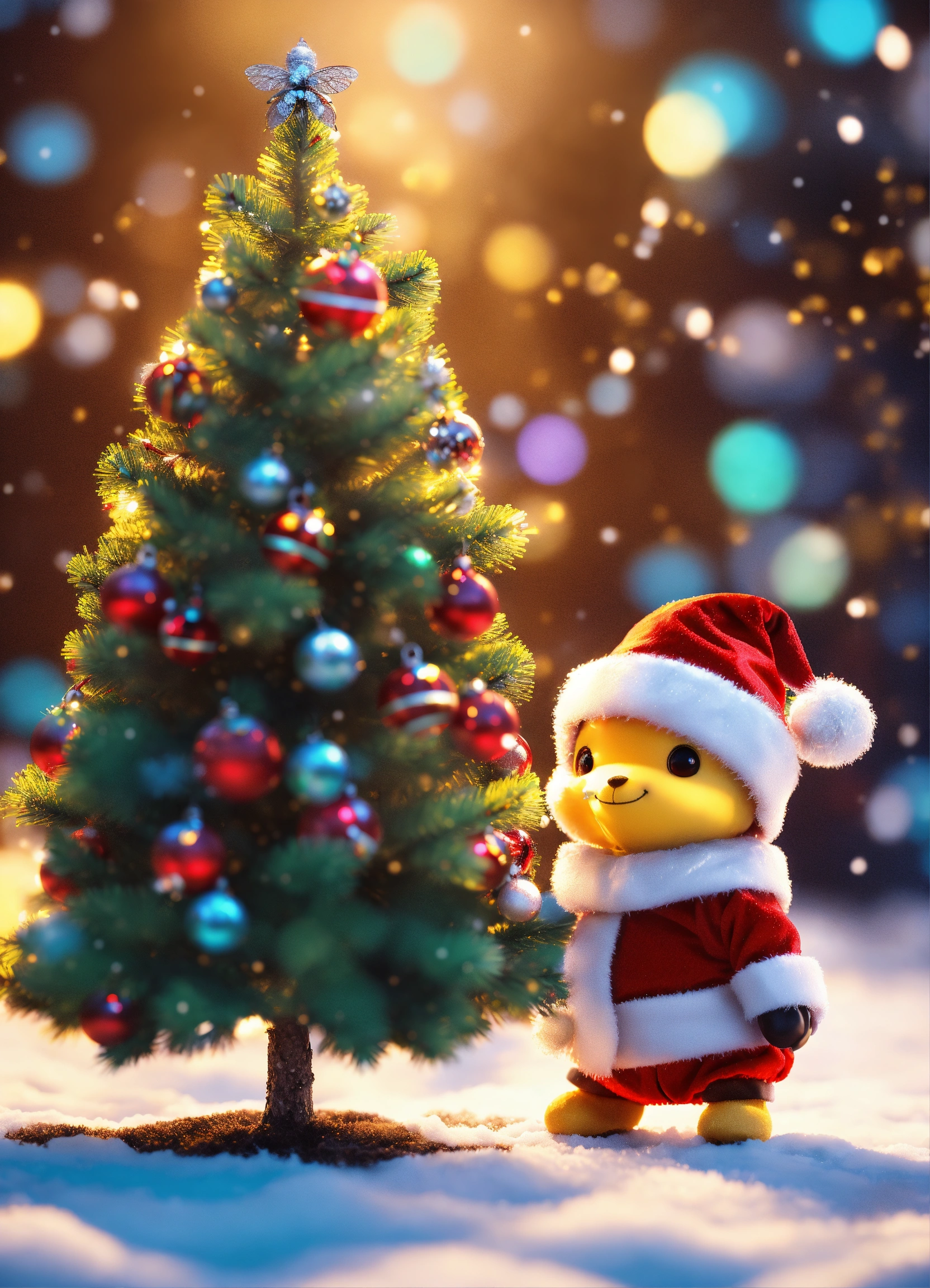 4d photographic image of two full body images of super cute little chibi bees wearing red santa hats, realistic, buzzing around a snowy-covered christmas tree with presents underneath, vivid colors octane render trending on artstation, artistic photography, photorealistic concept art, soft natural volumetric cinematic perfect light, uhd