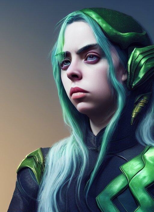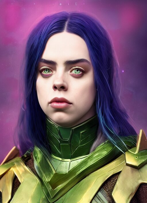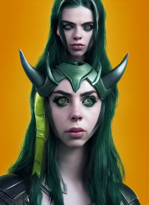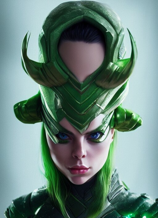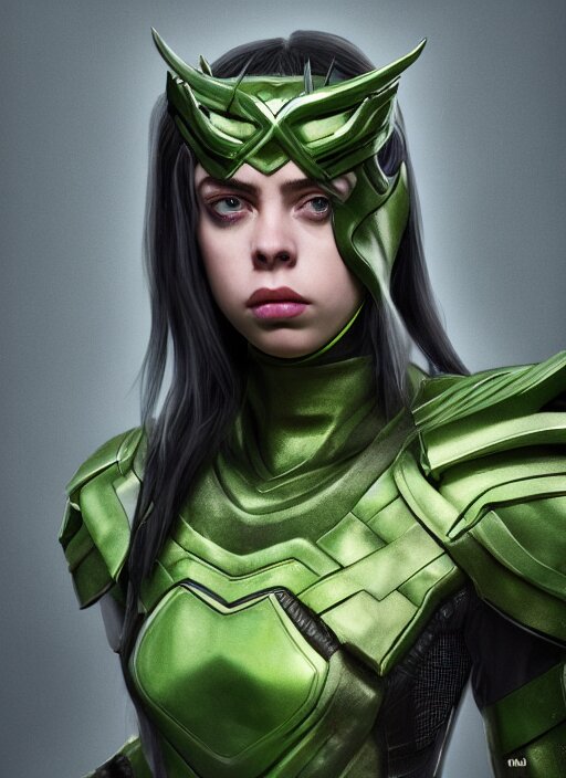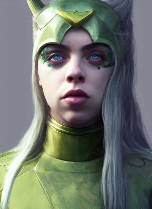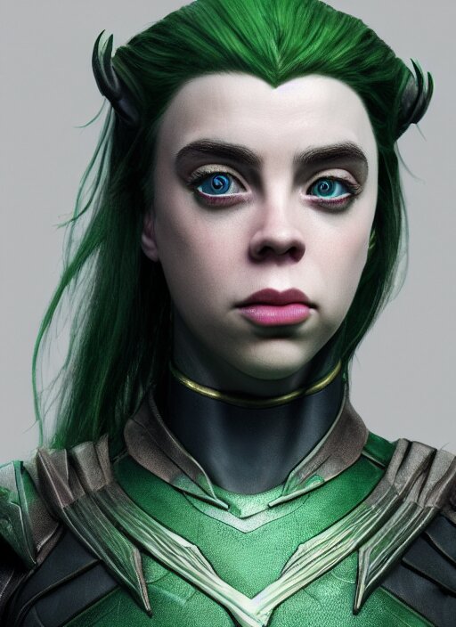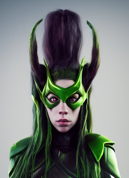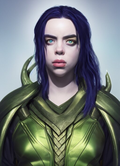 Billie eilish as female loki by nixeu, ian sprigger, wlop, sakimichan, trending on artstation, hyper realistic, smooth octane render, aesthetic