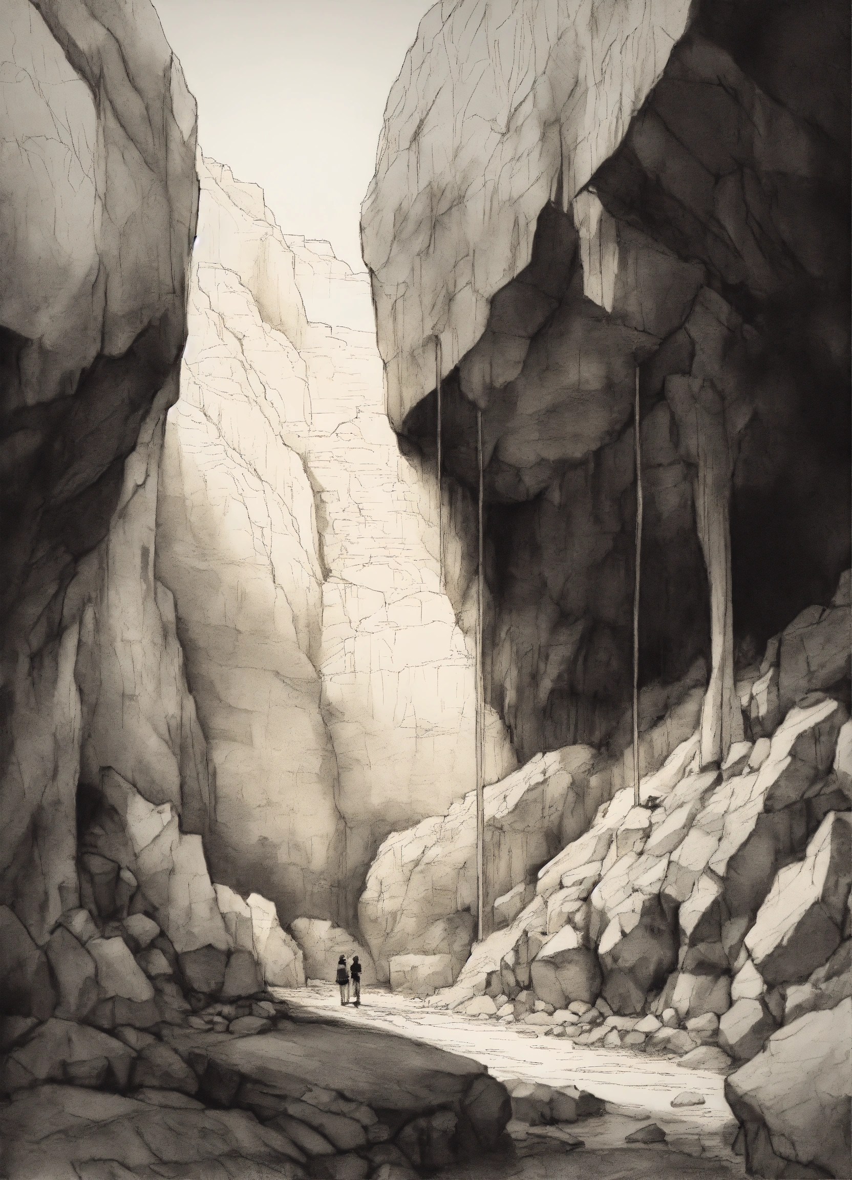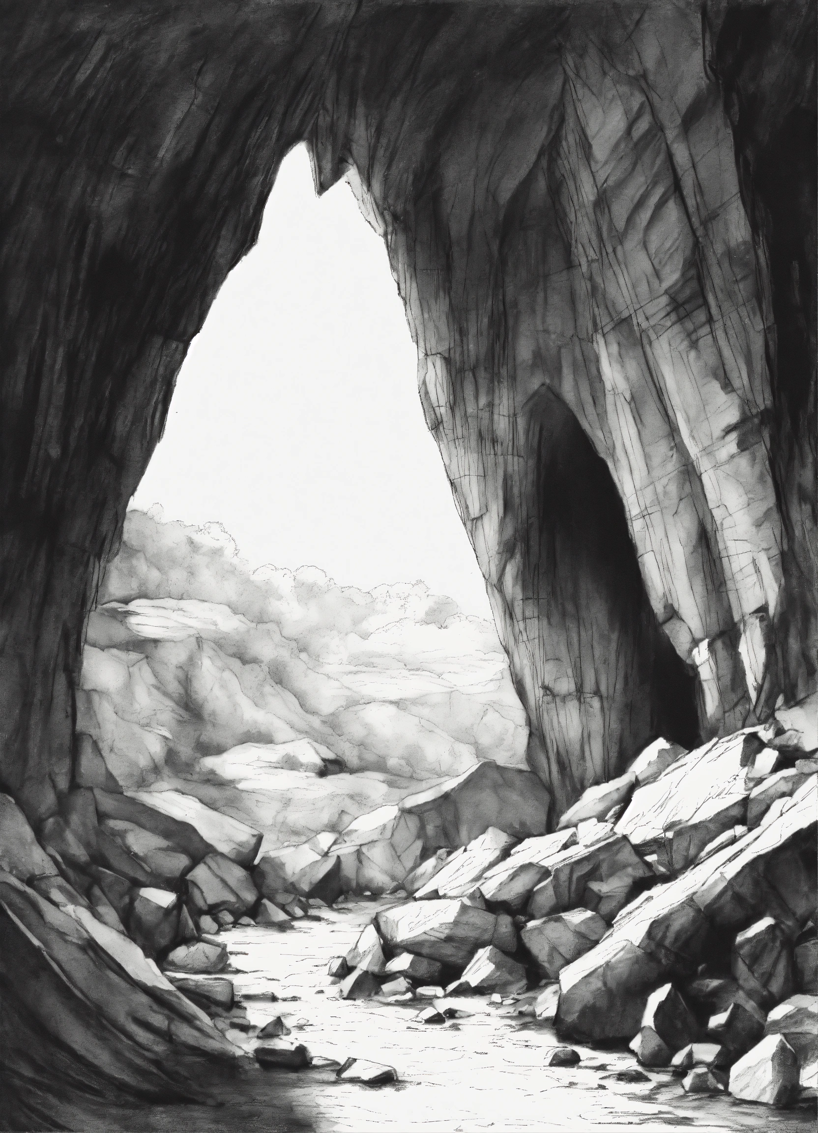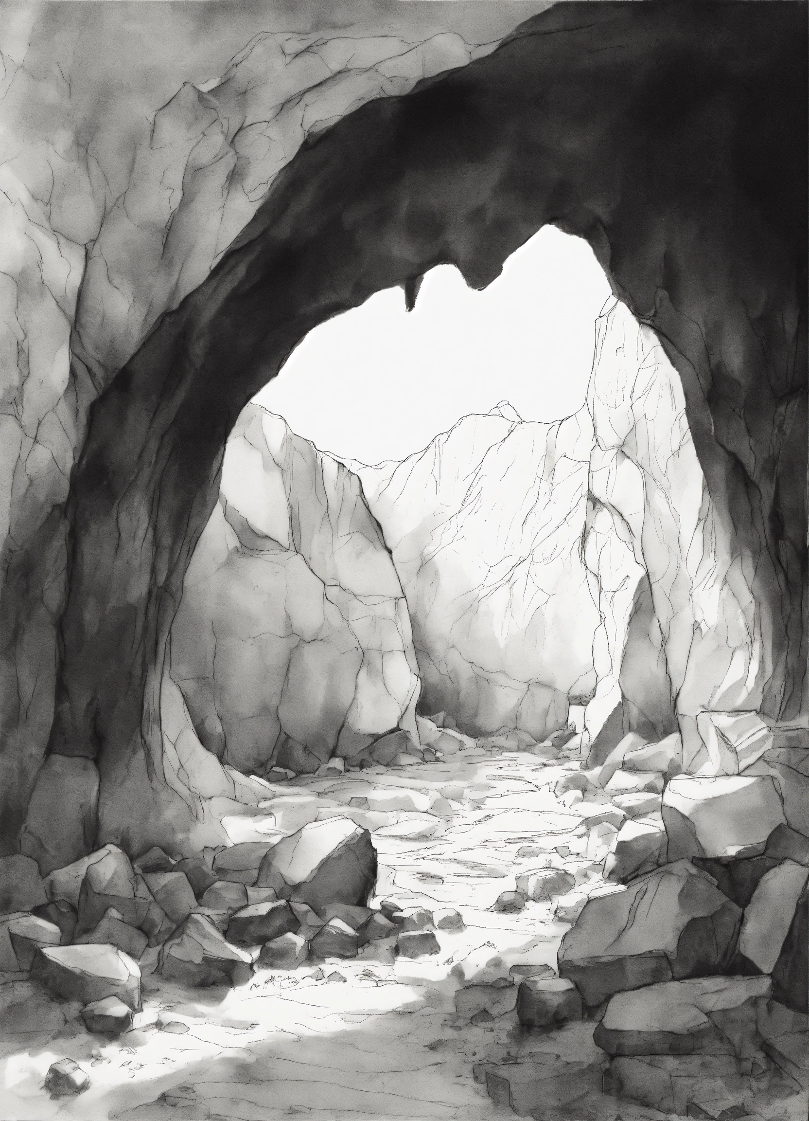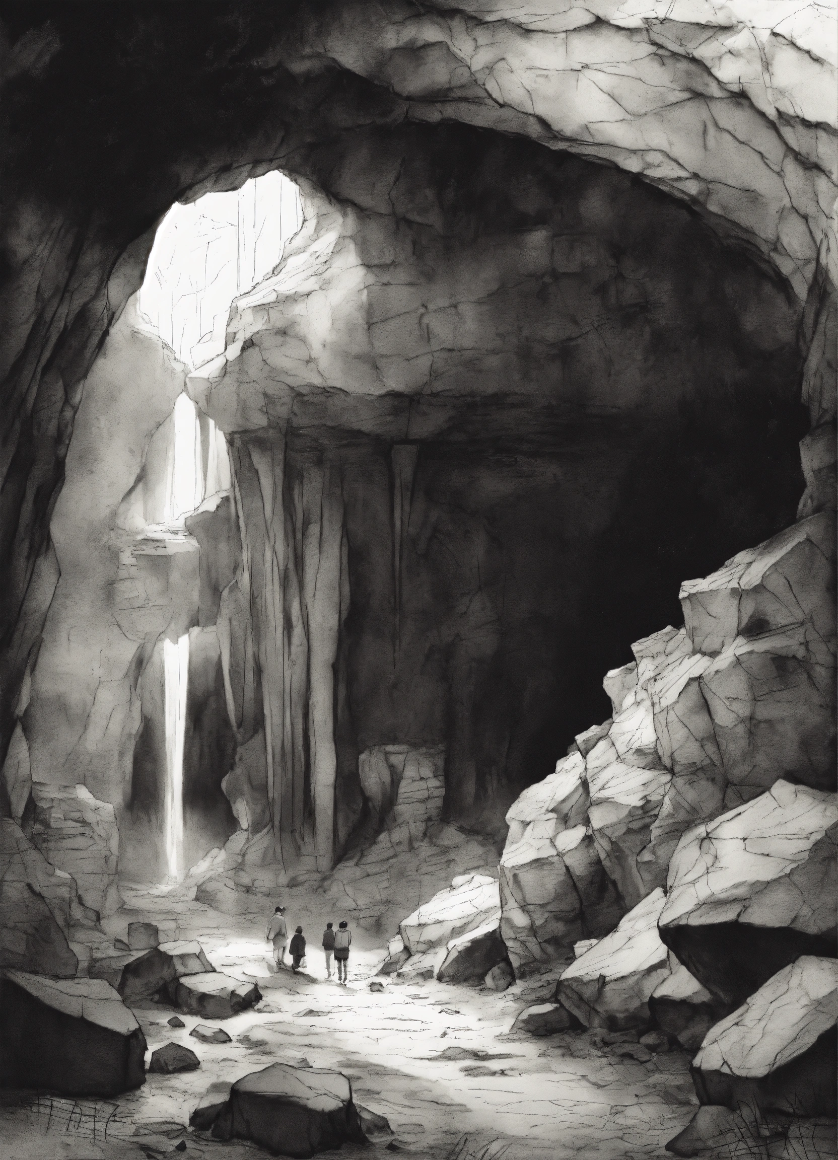 A black and white sketch of a cave wit hcracks