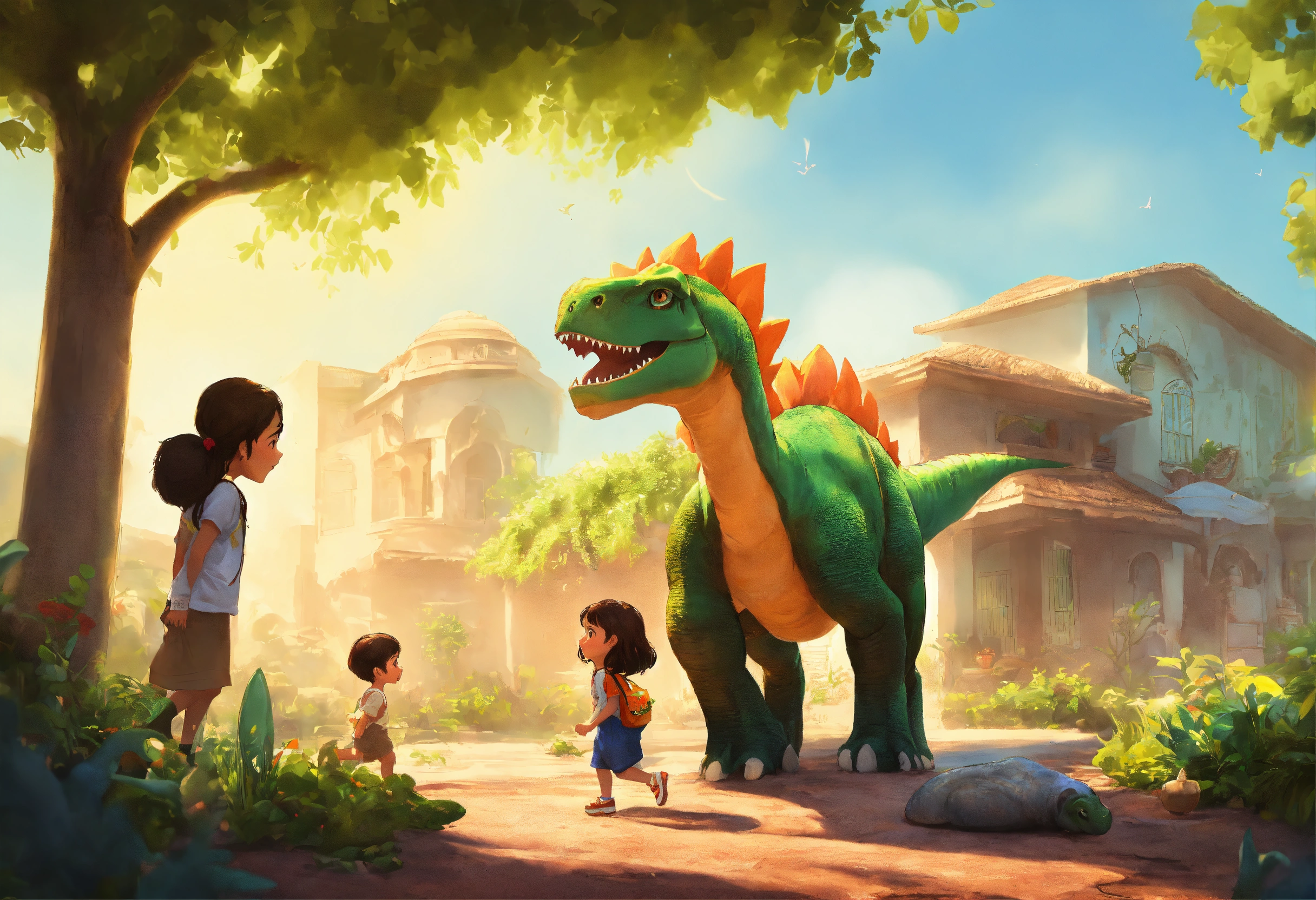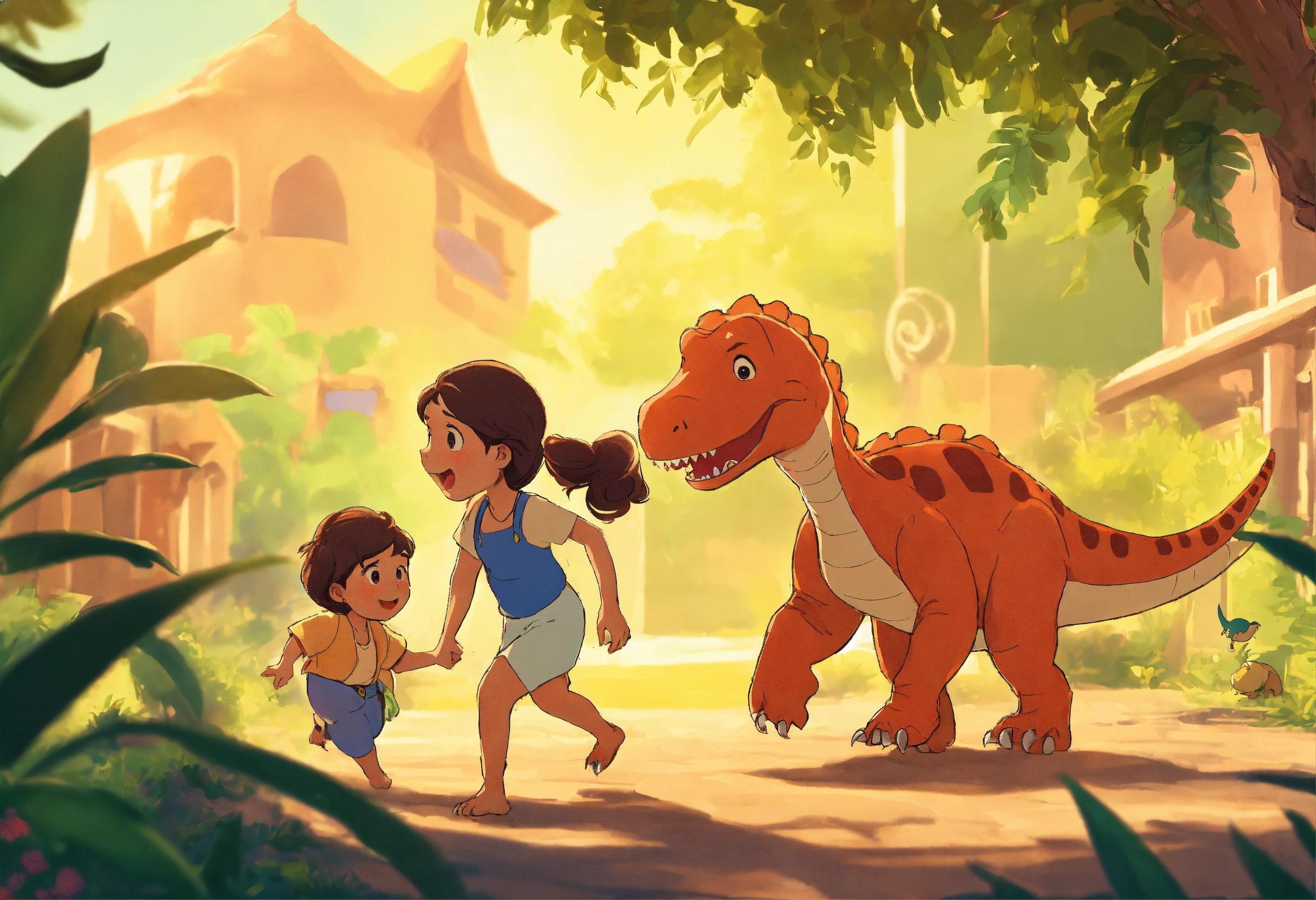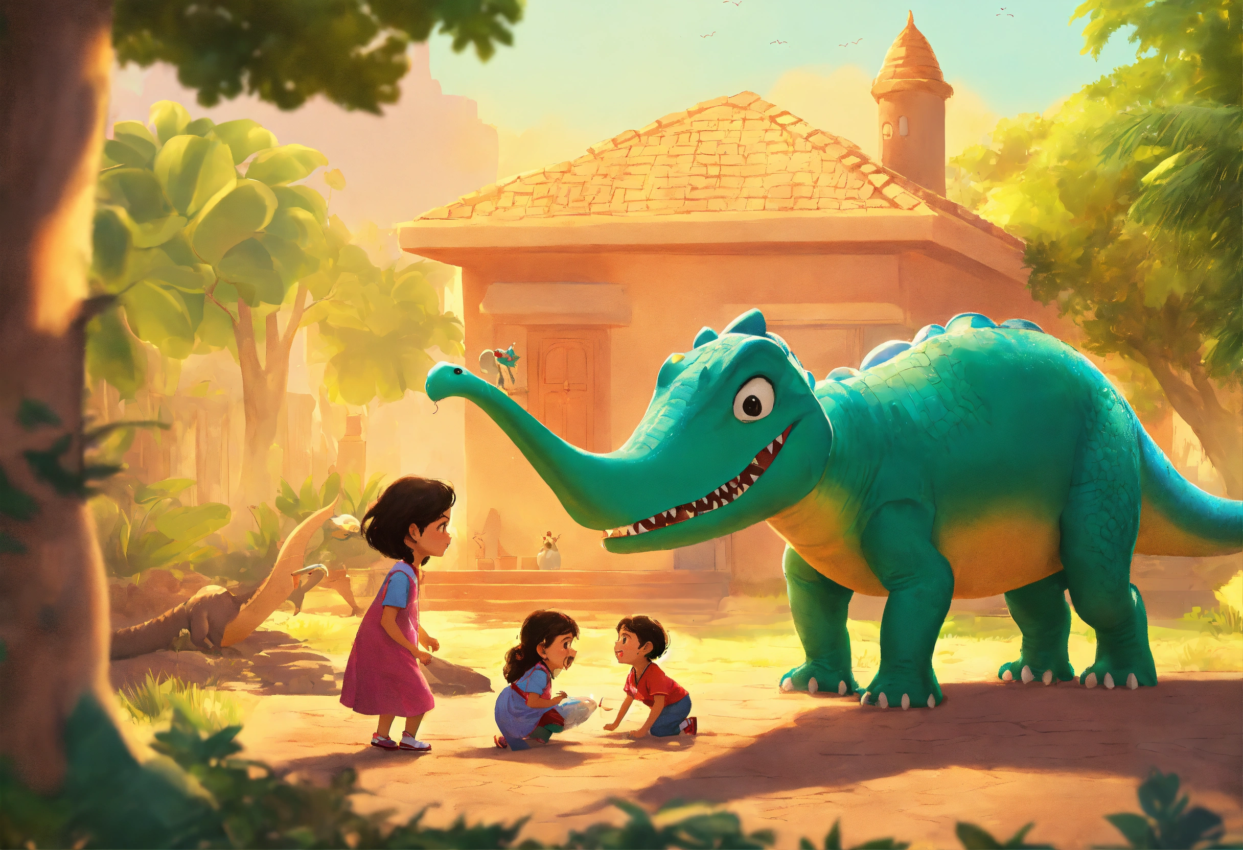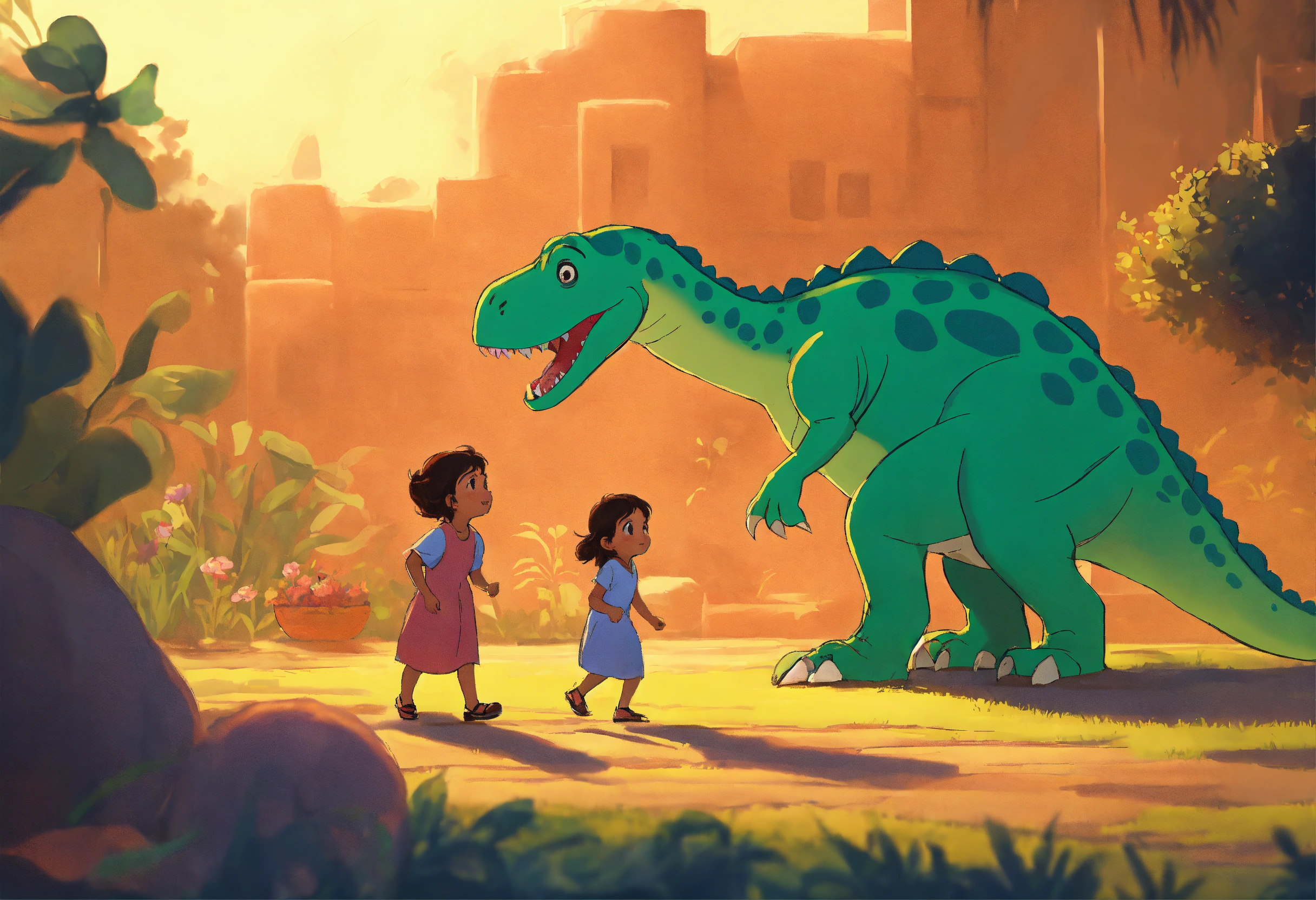 Scene 1 a sunny day in jeddah once upon a time, in a sunny city called jeddah, there lived two sisters, neel and halat. they were both 6 years old and loved to play in their grandmother's garden. their mother, roon, and their grandmother, atoota, were busy inside the house. neel and halat were running around the garden. the sky was clear, and the sun was shining brightly. scene 3 the brave rescue neel and halat quickly ran to their mother and grandmother and told them about the weak dinosaur. everyone rushed outside to see the dinosaur for themselves. the dinosaur was too weak to move and needed help. the family decided to work together to save the dinosaur. they found a big, sturdy tree branch and, with the help of their strong mom and grandmother, managed to push it towards the dinosaur. the dinosaur took a big gulp of water and seemed to feel better. pixar style