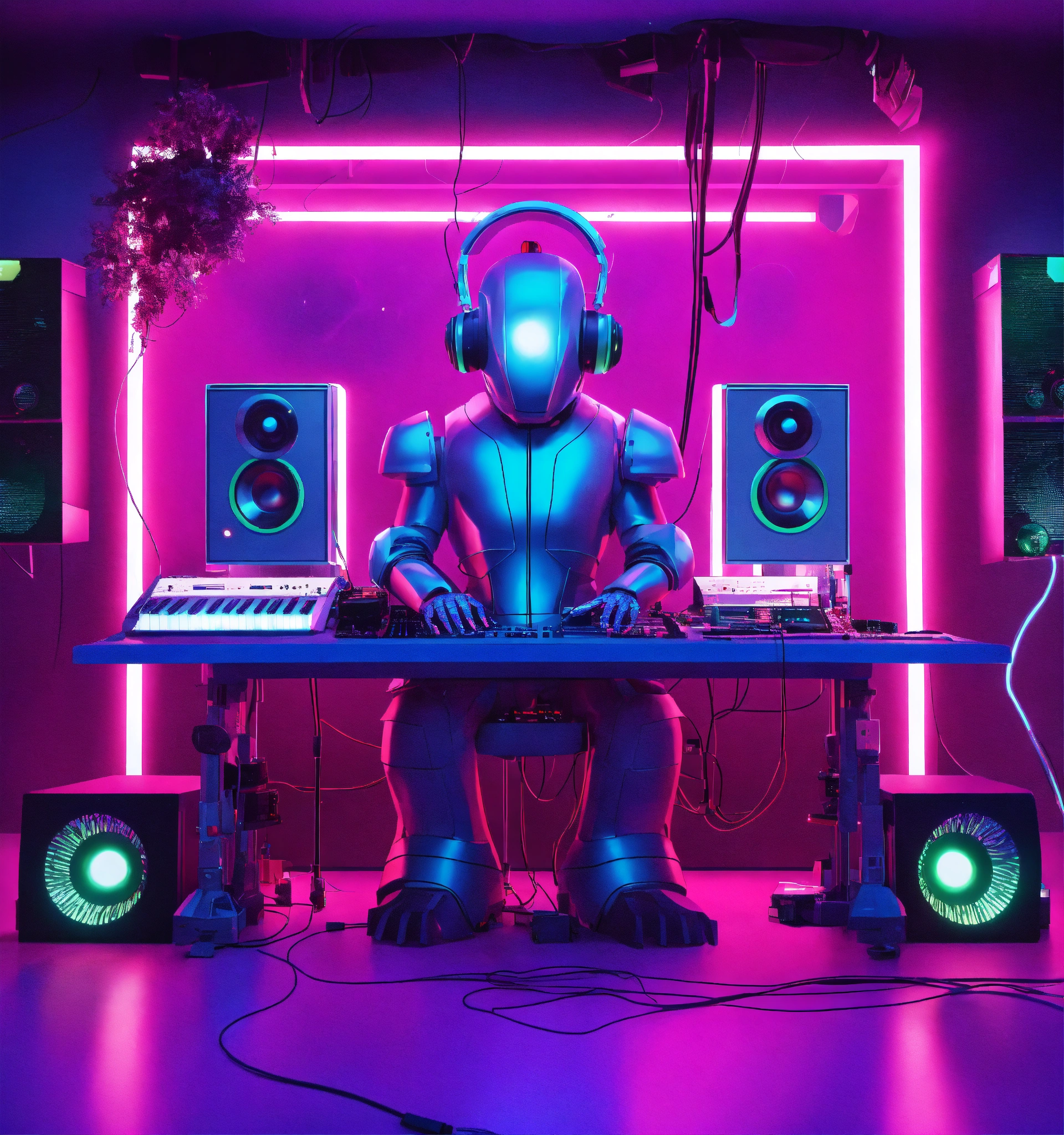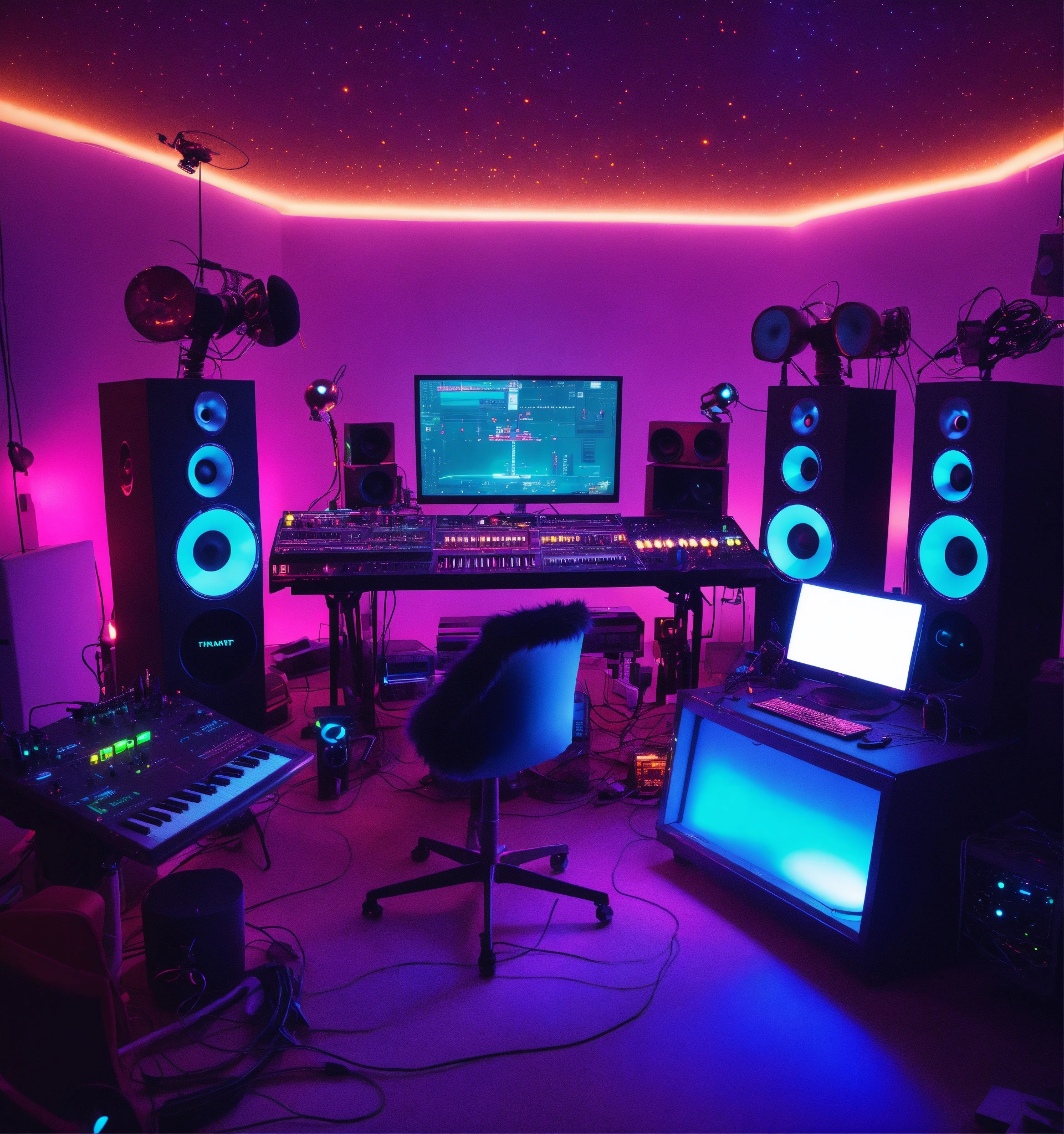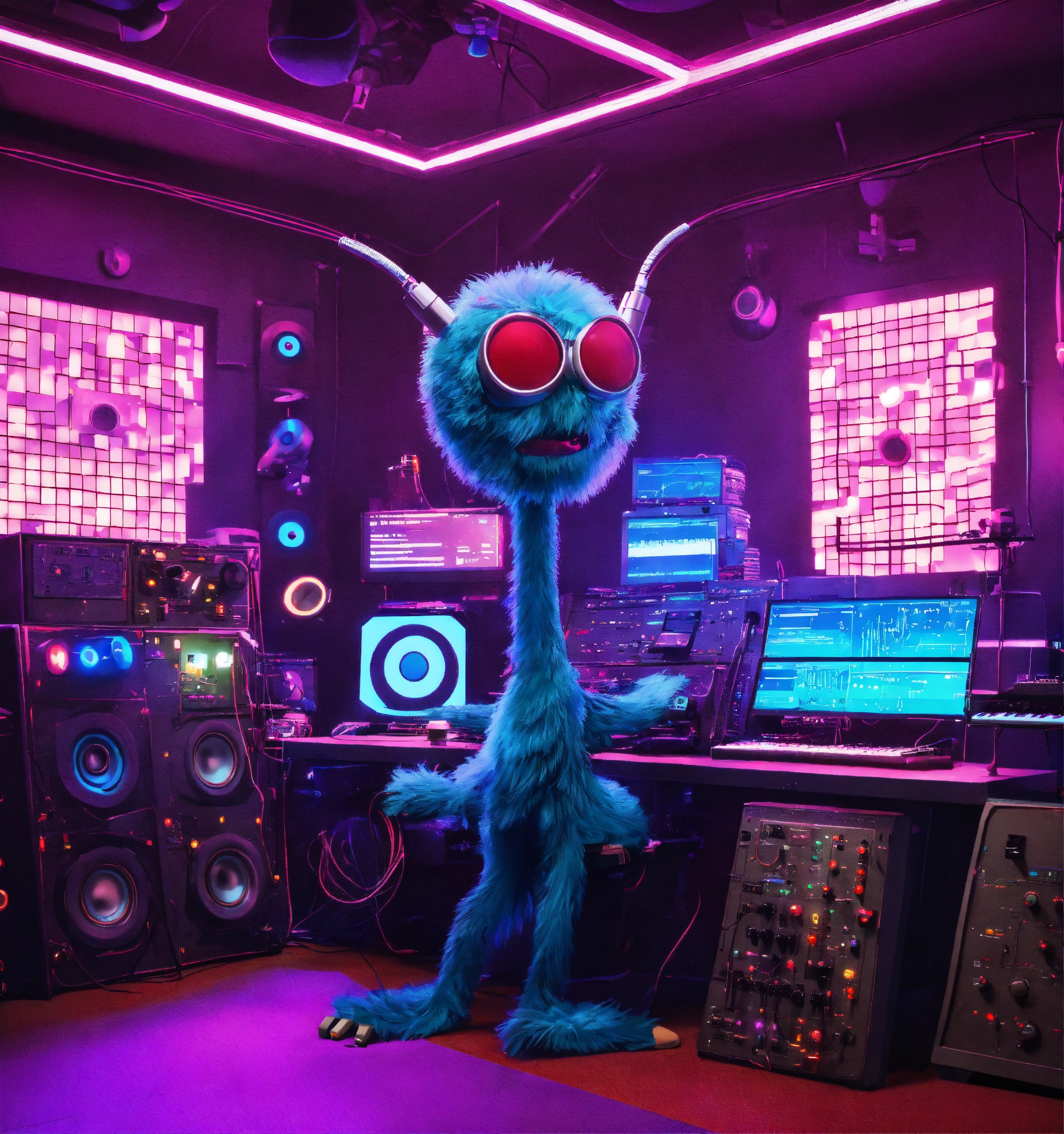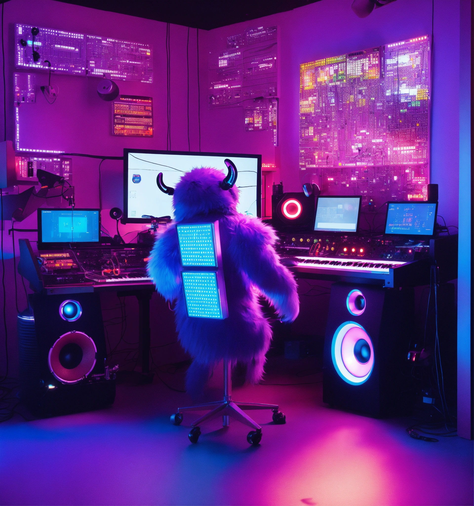 Zoom out on the full body of a big, fun loving, hairy, tall, violet fur, monster cartoon character wearing futuristic earphones with antenna, sitting at an alien analog synth ans musical workstation with high tech controls, knobs, and lighted buttons in a studio, hands on controls. there is a boxy silver square friendly robot hovering next to him, pixar, realistic, giant tron illuminated speakers. the room is a mess of wires and cables, fantasy, 3d