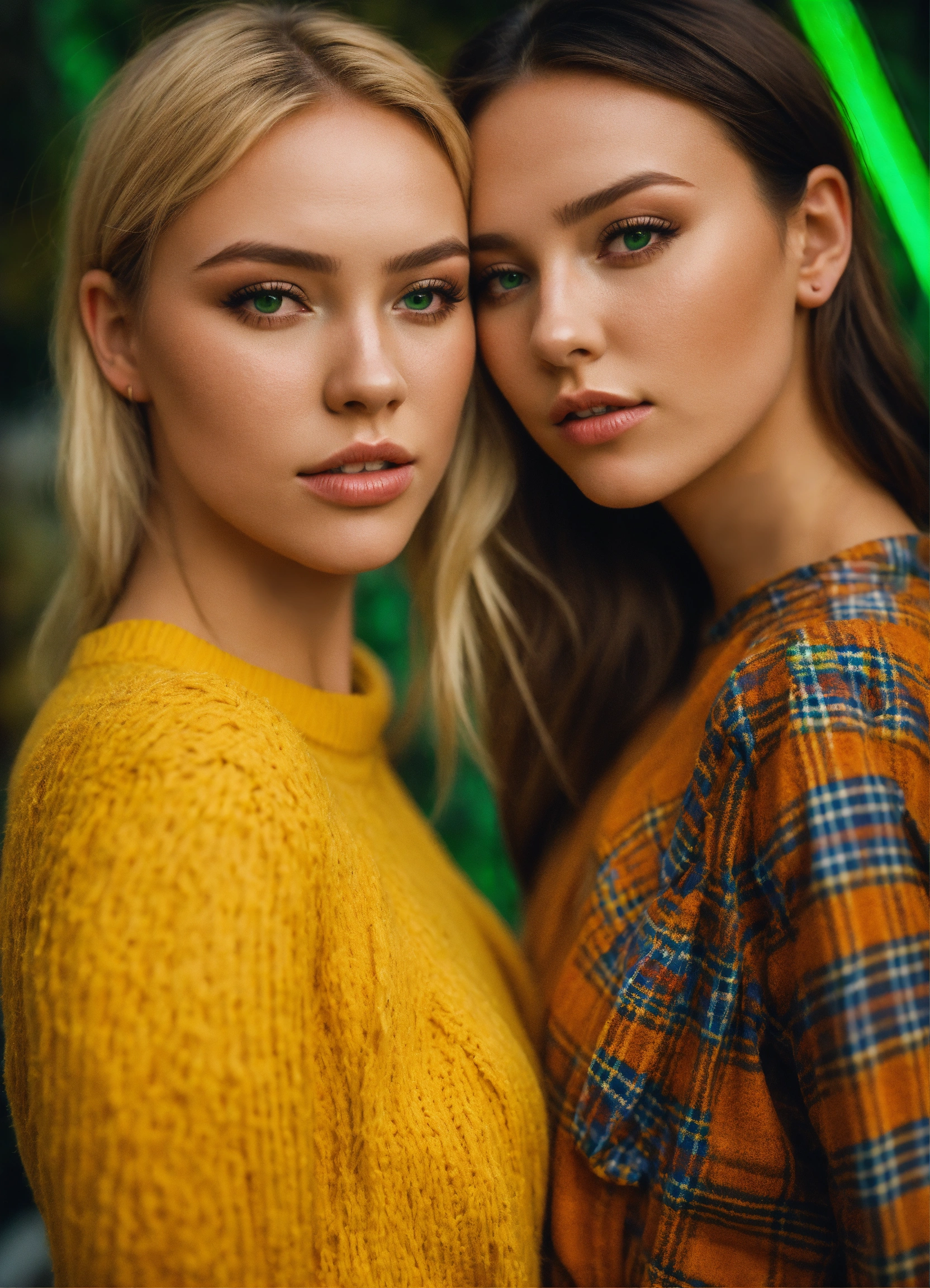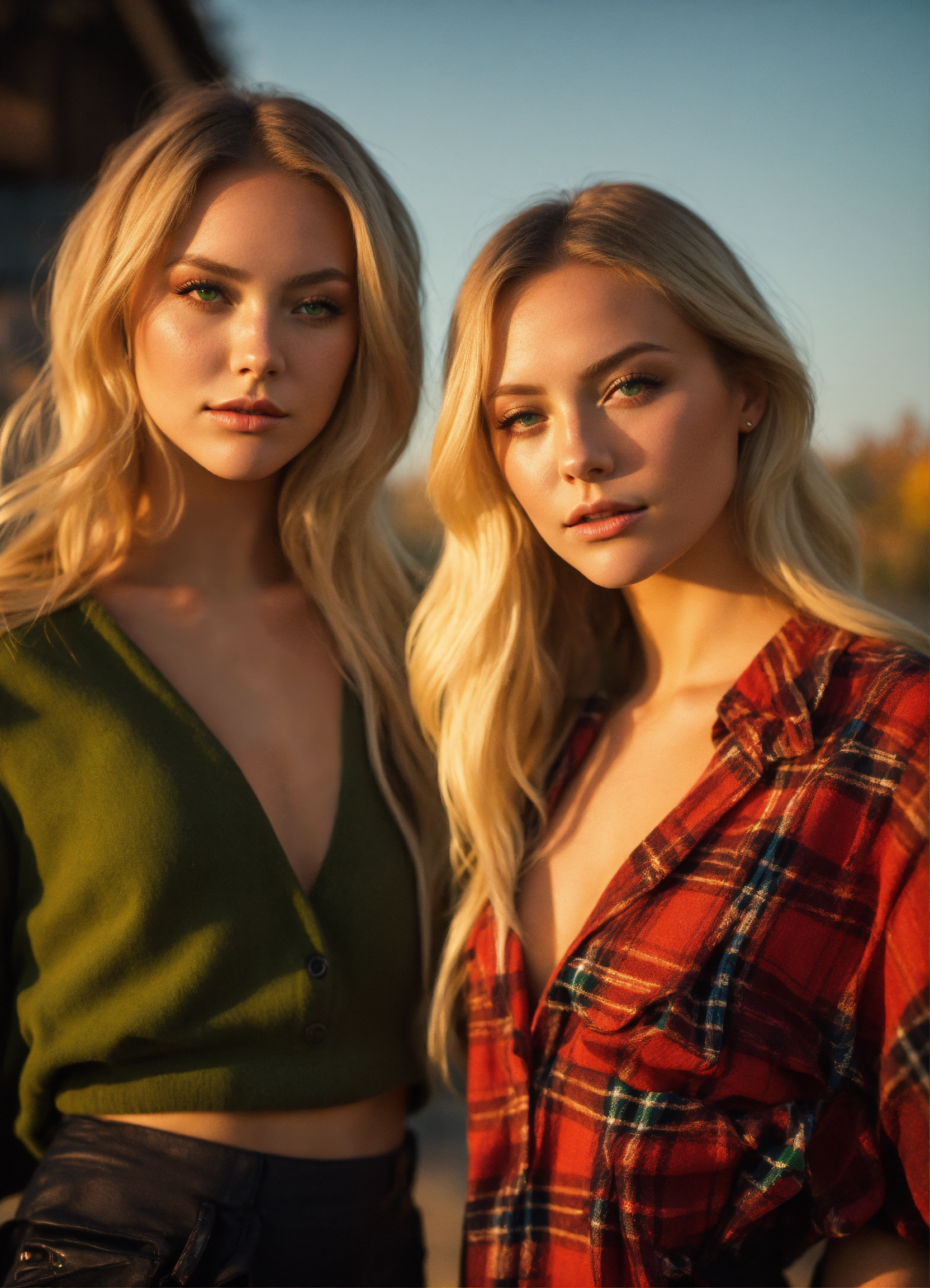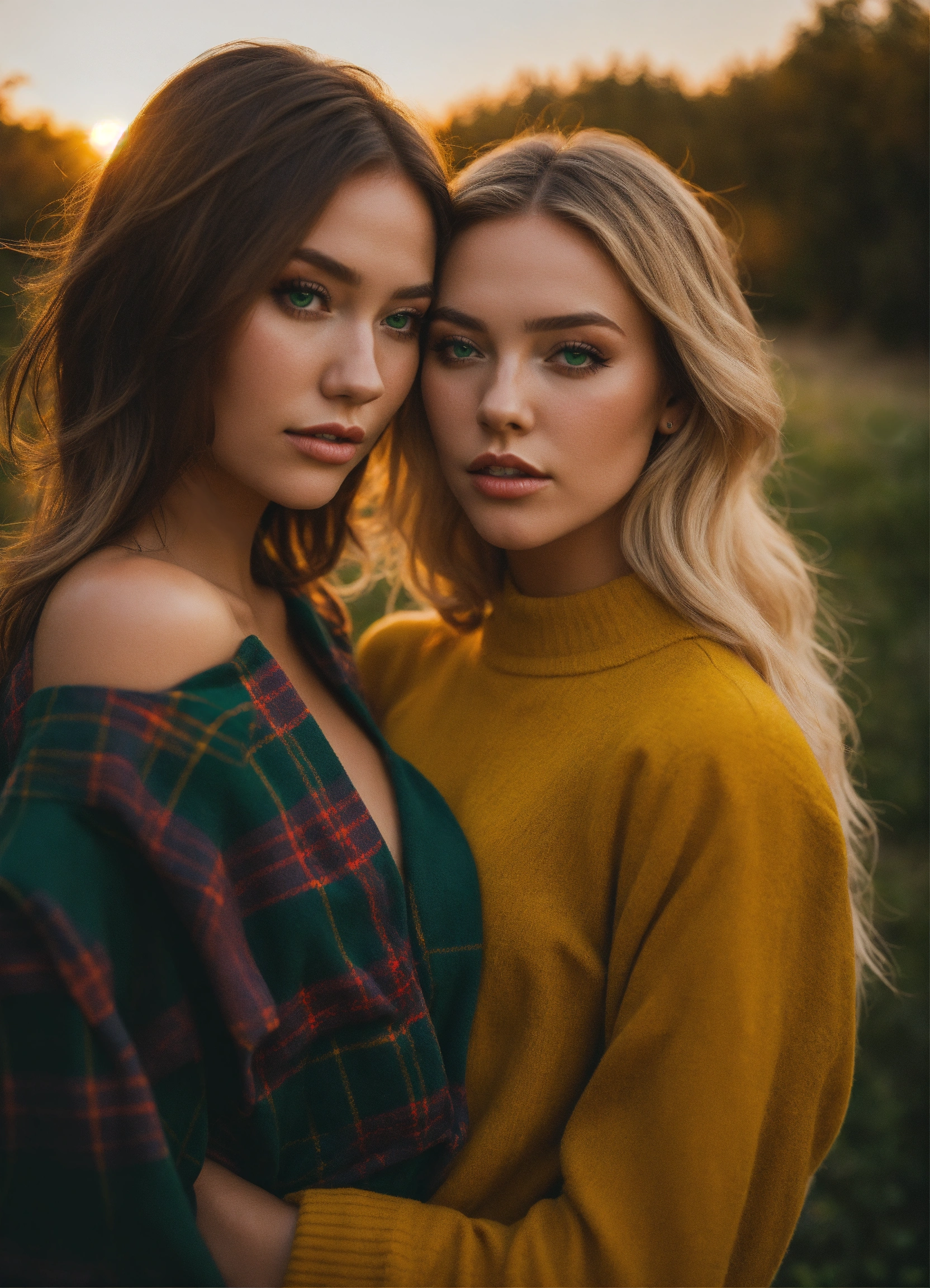 Two models blonde woman <1st<model>(ksenia(effy-stonem)kahnovich> hugging brunette woman <2nd<model>(amber(maika-monroe)heard>, (((wearing heavy makeup))), blonde pawg touching brunette pawg, (sunrays, outside, golden hour), yellow vs green tartan-micro-mini-skirts both showing-midriffs, crop-knit, autumn aesthetic, swollen lips, lip-fillers, raw photo, full sharp, detailed face (high detailed skin1.2), 8k uhd, dslr, soft lighting, high quality, film grain, fujifilm xt3