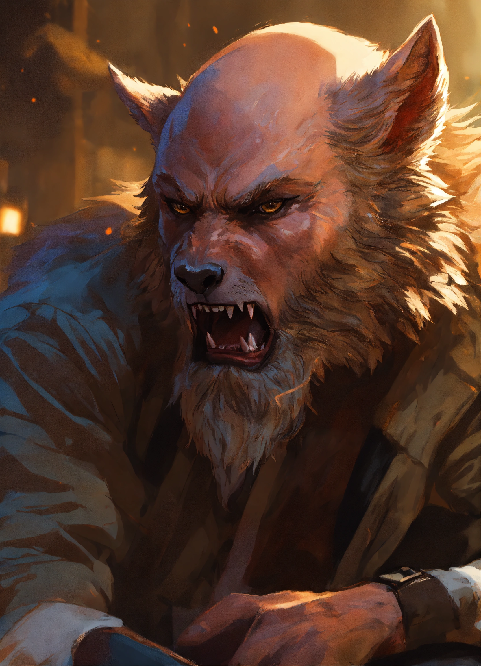 A young bald man with beard werewolf in a mid-transformation state, capturing the moment between human and wolf forms