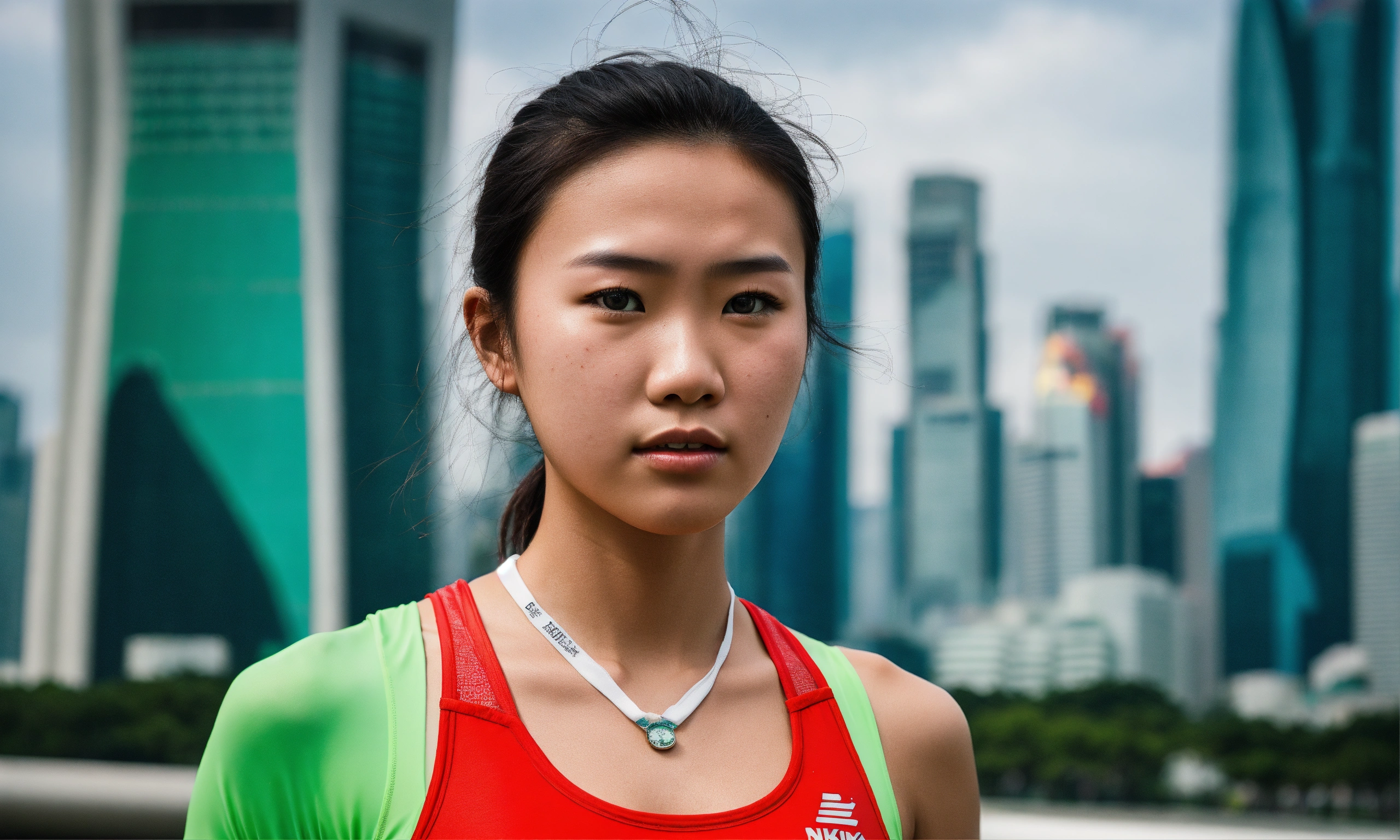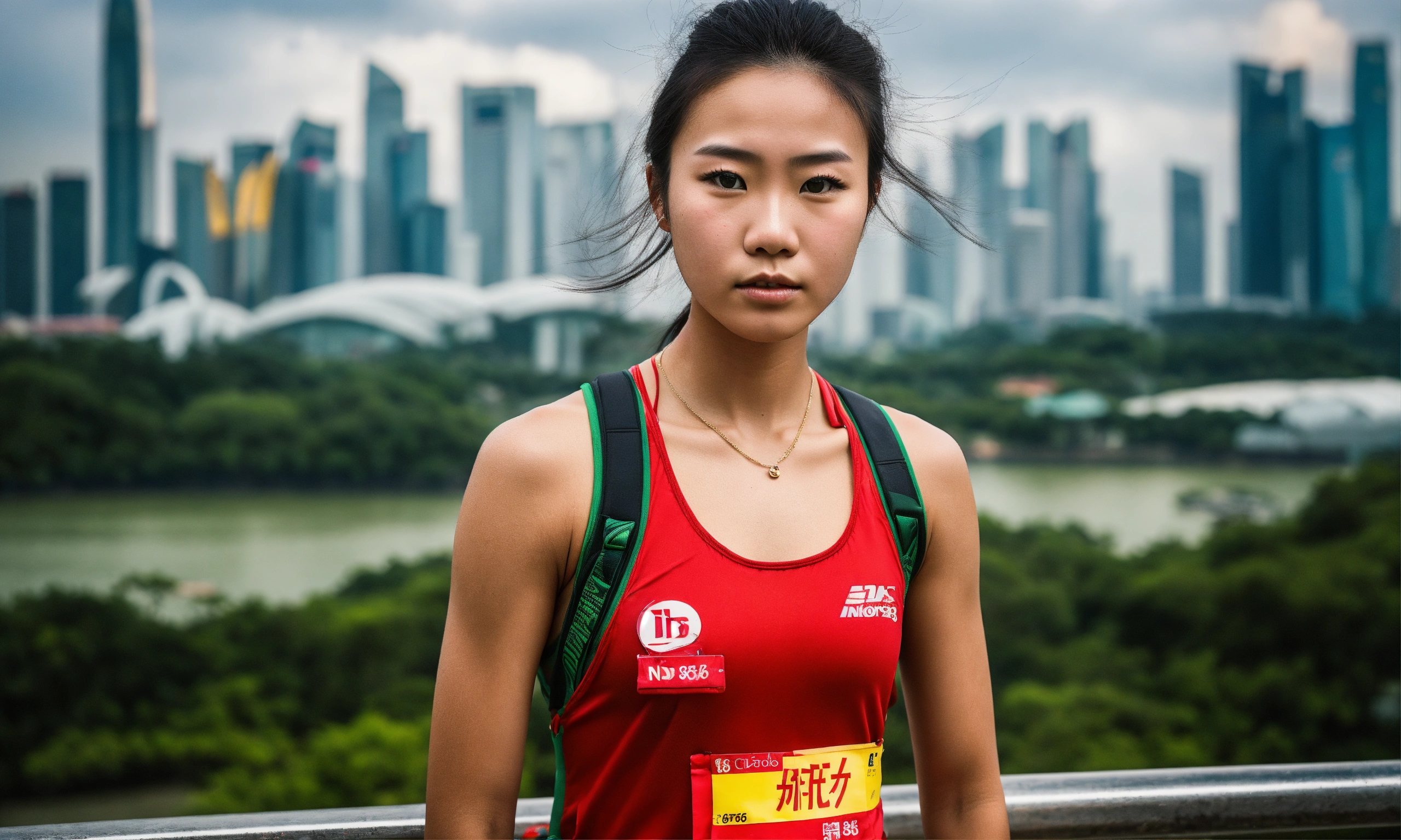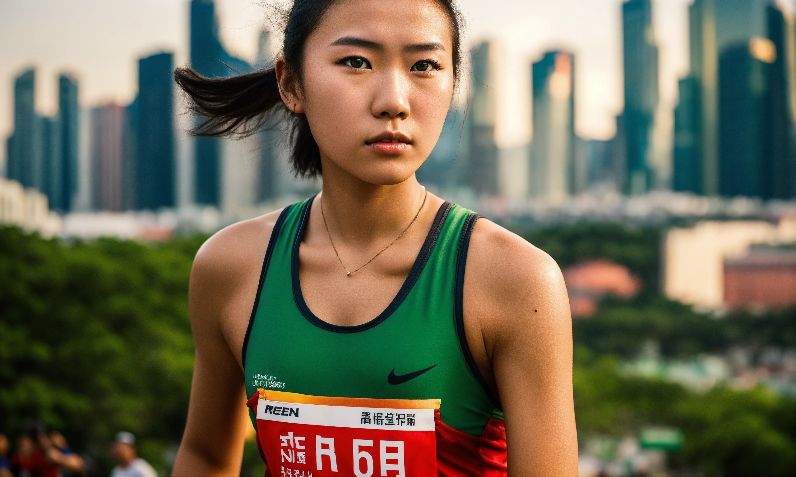 Mid-day at a world marathon event in singapore, ultra close-up frontal shot of an 18-year-old tanned and athletic chinese girl, plain red singlet, looks with unwavering determination, her eyes, locked onto the camera, radiate ambition, resilience, and a deep focus, with green and singapore cityscape in the backdrop, captured with a nikon d850, 85mm f/1.4 lens, the photograph is given a touch of watercolor rendering for added depth, making her the undeniable centerpiece of the image.