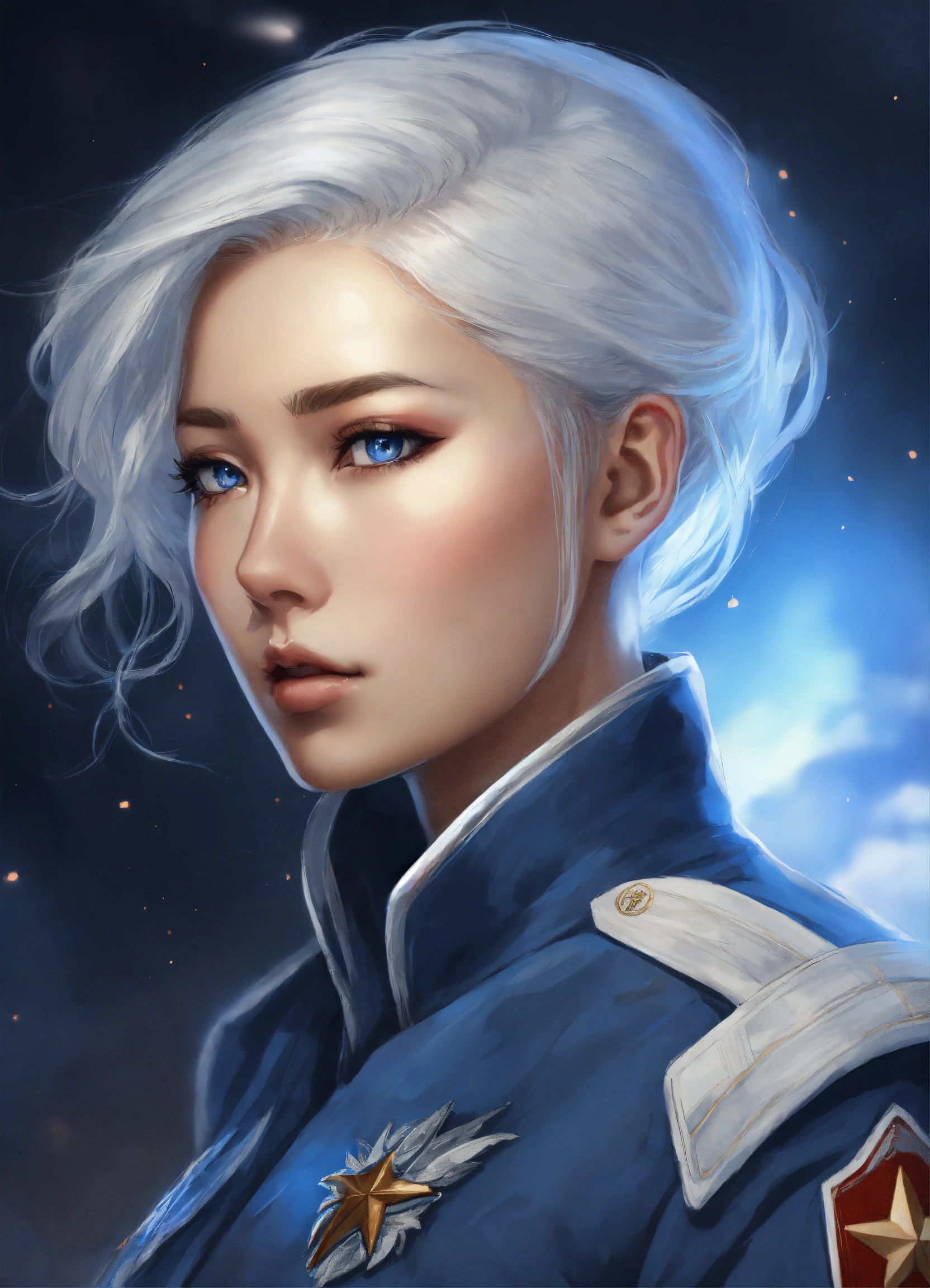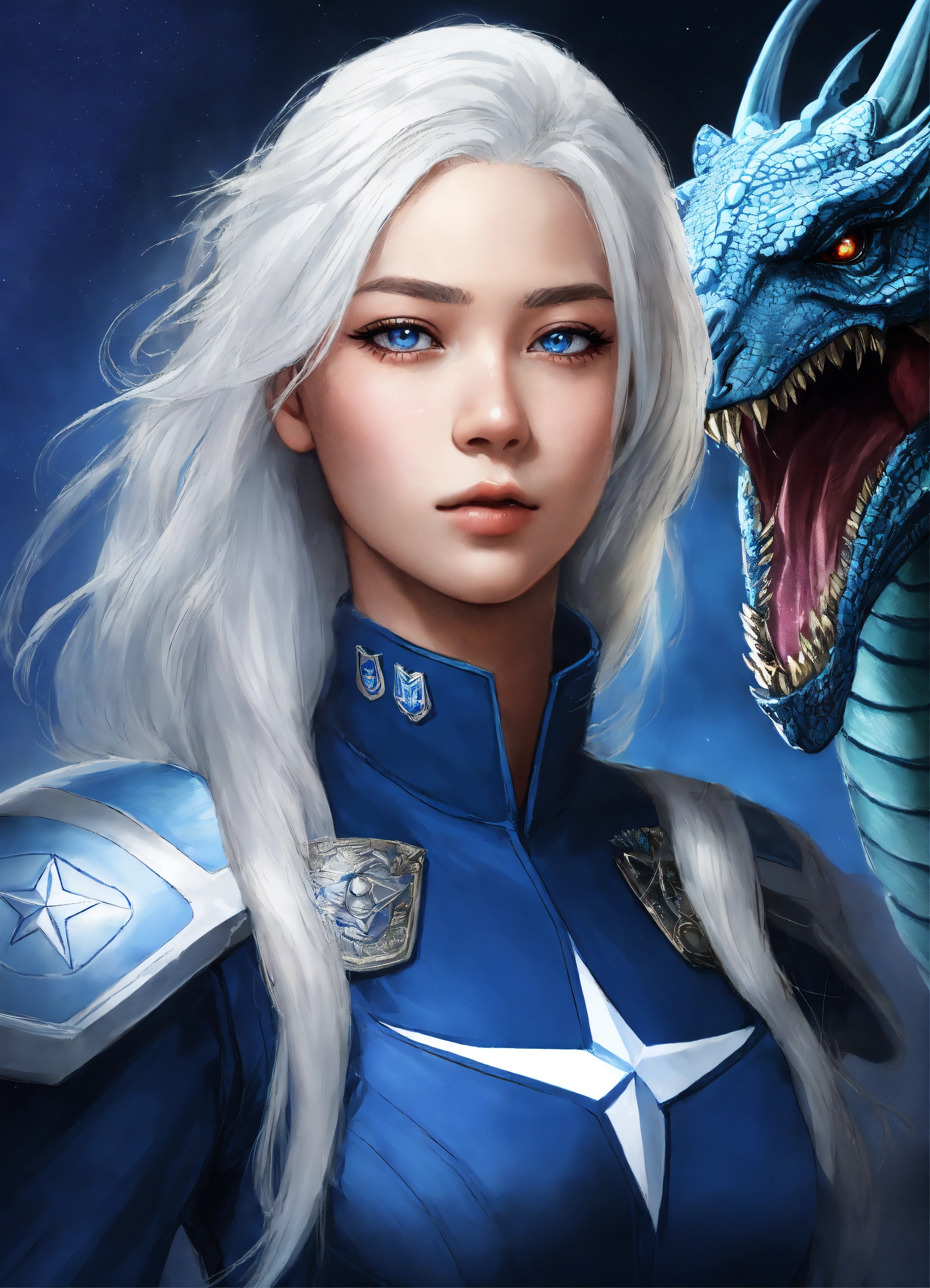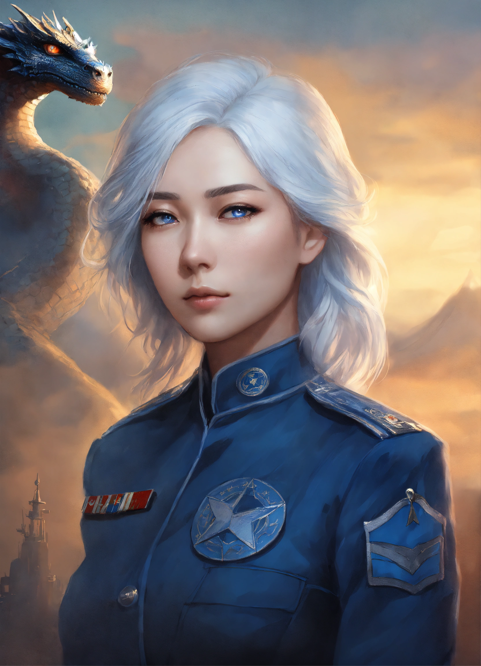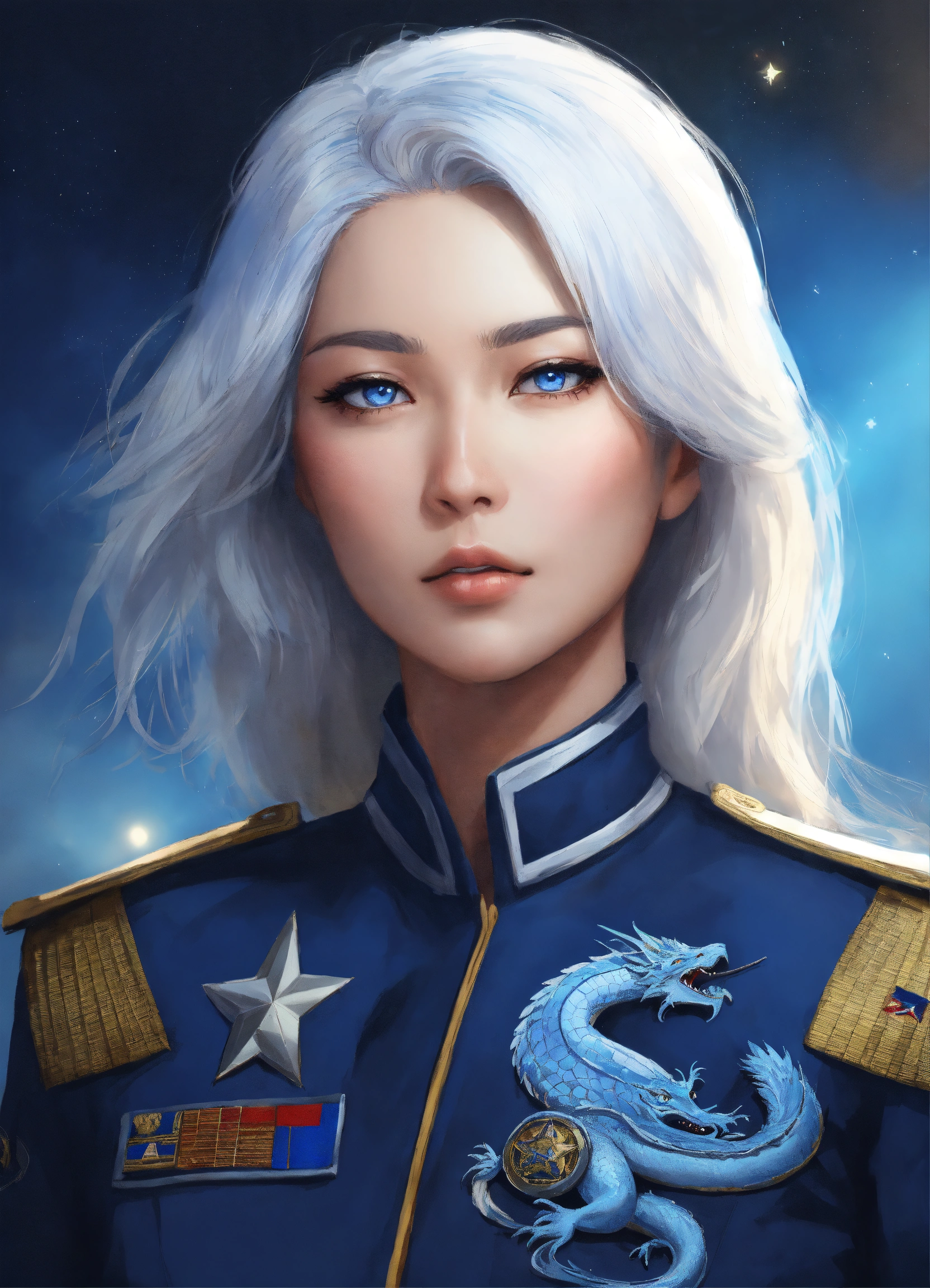 Realistic drawing illustration of a beautiful alien woman, with white hair, light blue asian eyes, wearing indigo blue star command military uniform, with insignia on her chest. serious and serene look. very beautiful. no make up. in the background, a transparent dragon.